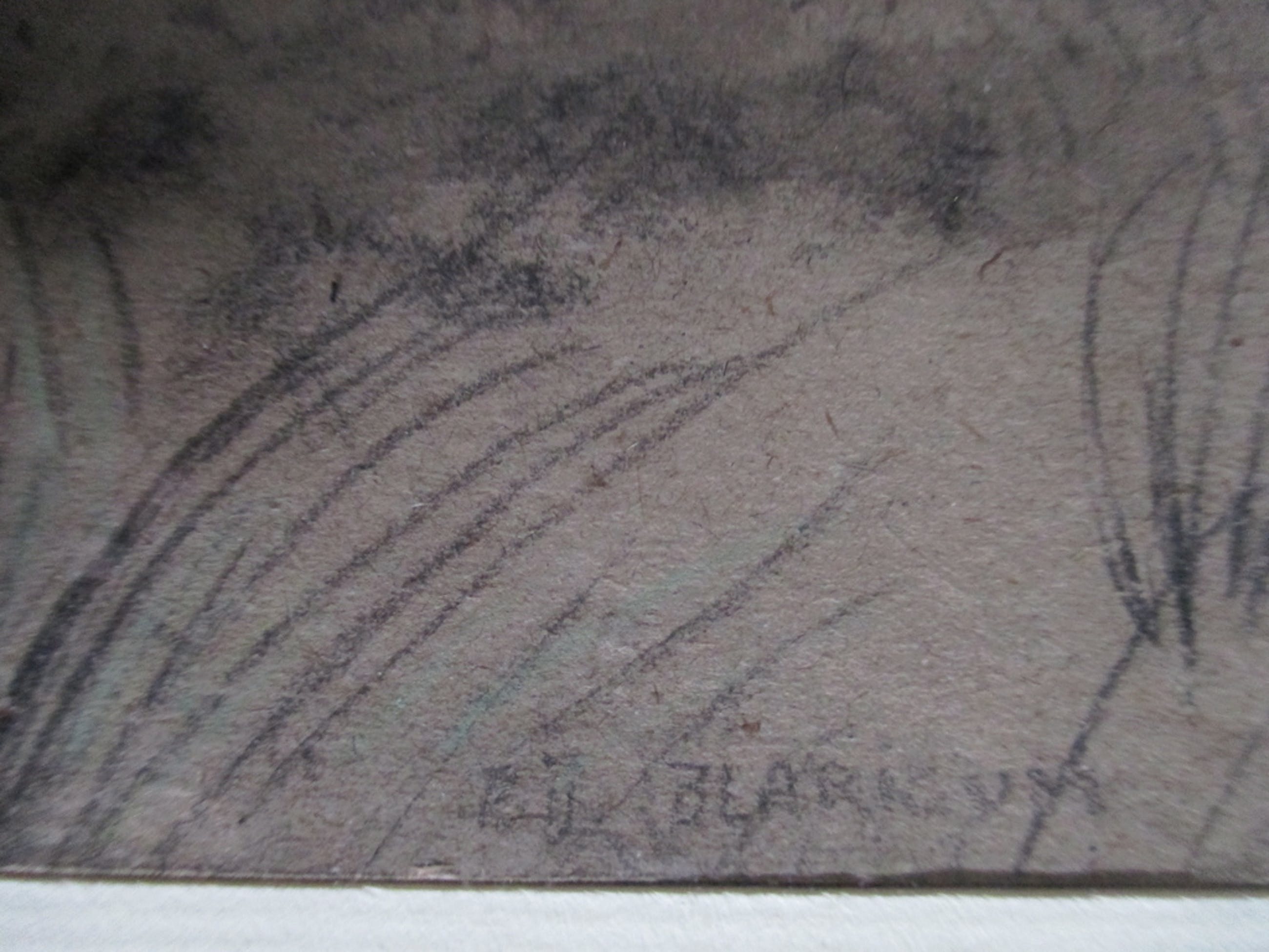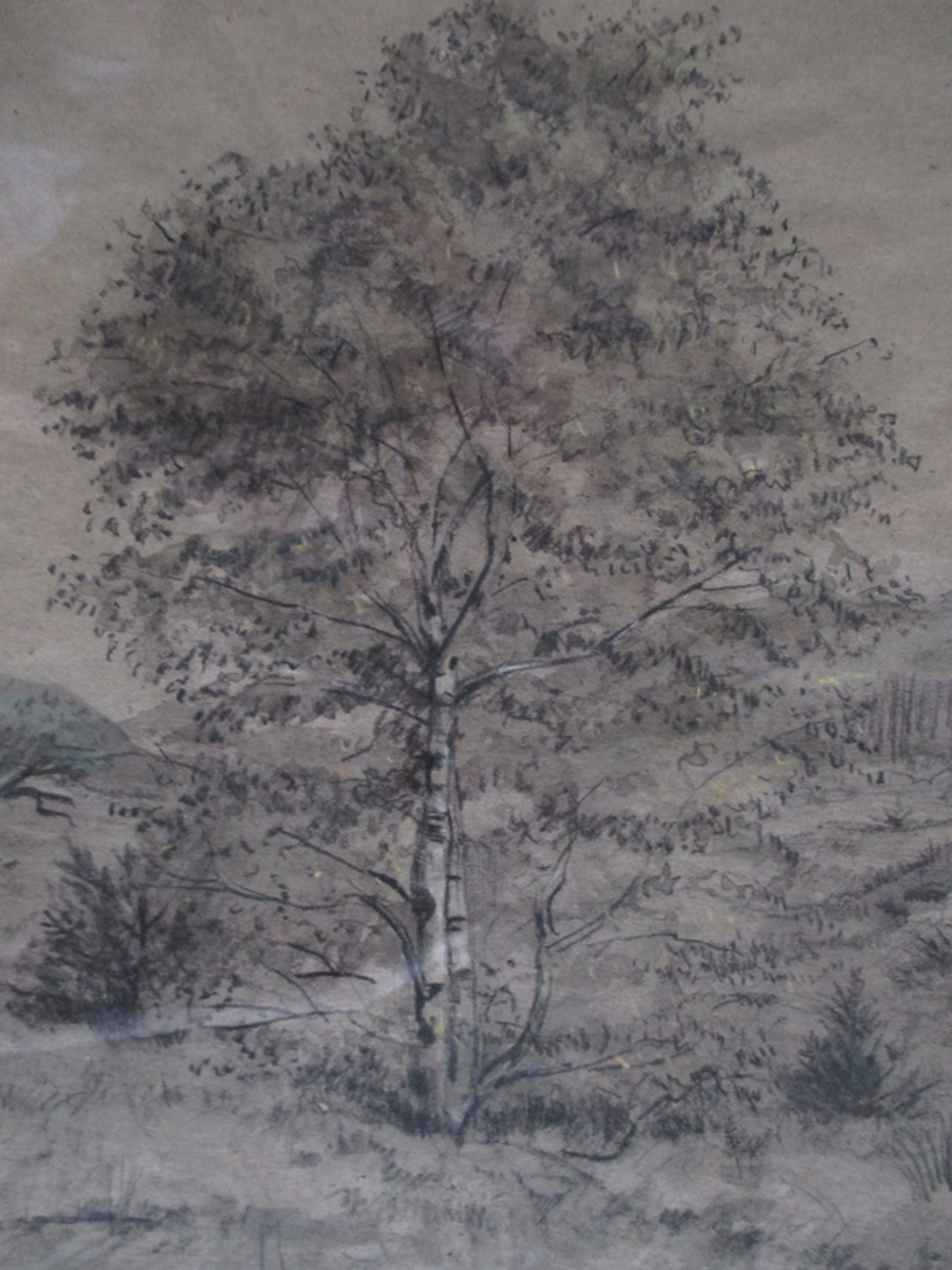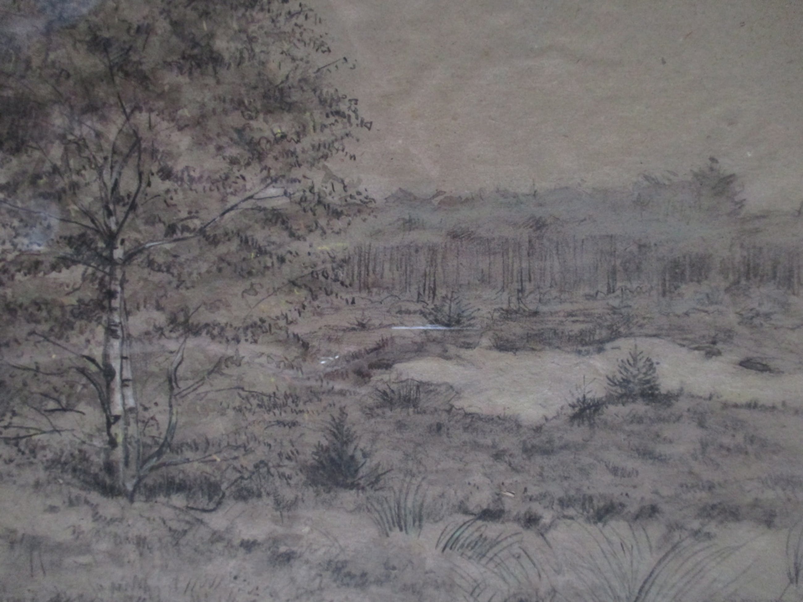 Tekening van W.A. Knip, gewassen pen, potlood, krijt, gehoogd met wit en gekleurd krijt. L.o gesigneerd in potlood, r.o getiteld "Bij Blaricum" in potlood. Ingelijst achter glas in eenvoudige houten lijst met gebruikssporen. Afm. lijst 47,5x33,5, beeld 38x27.
