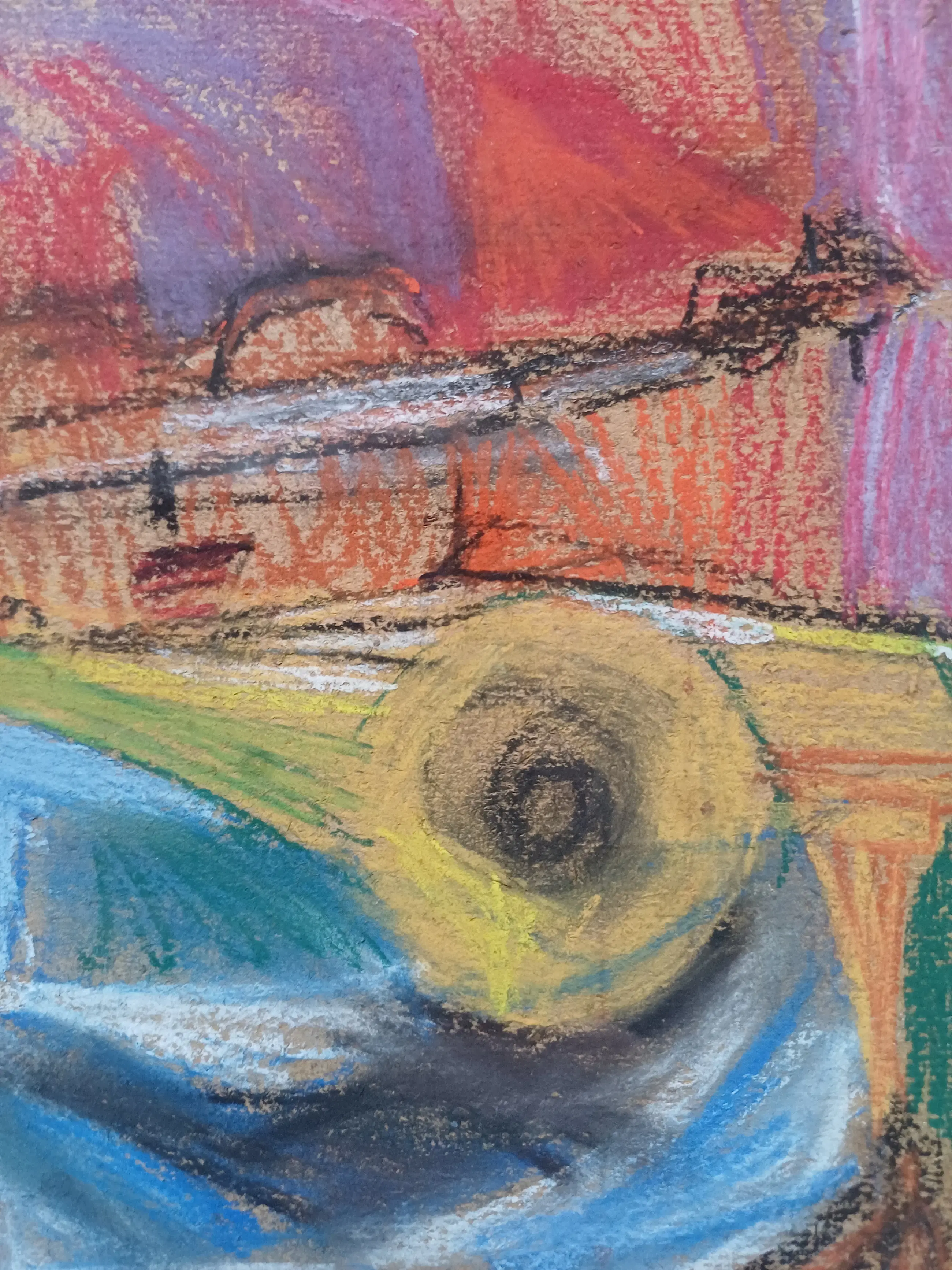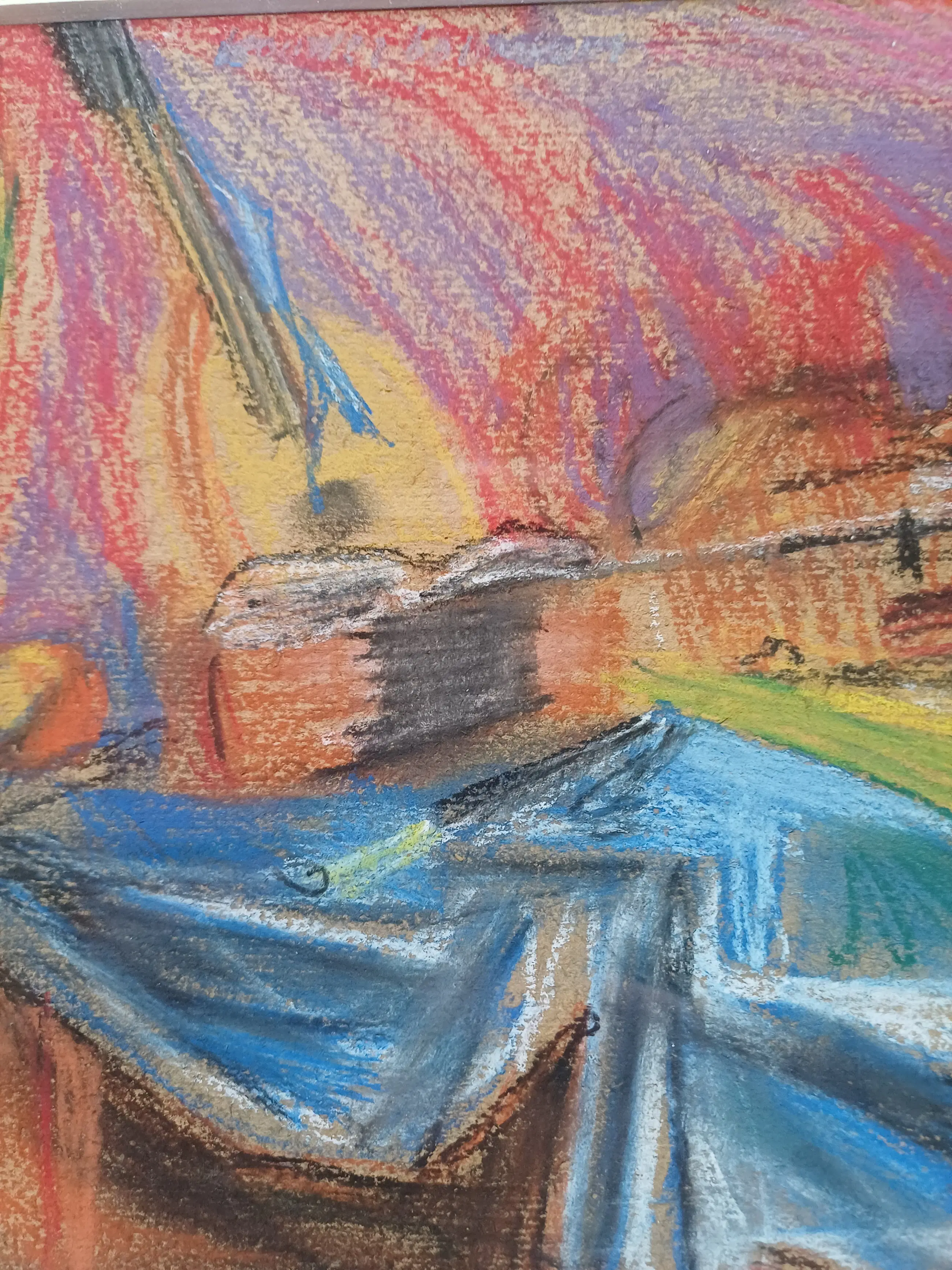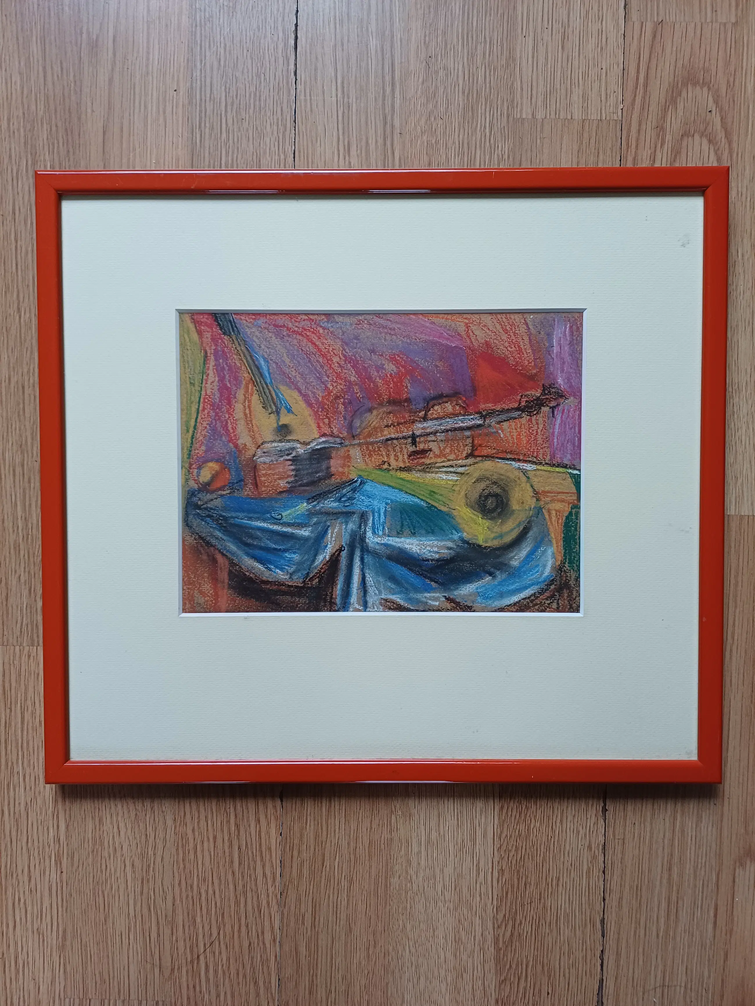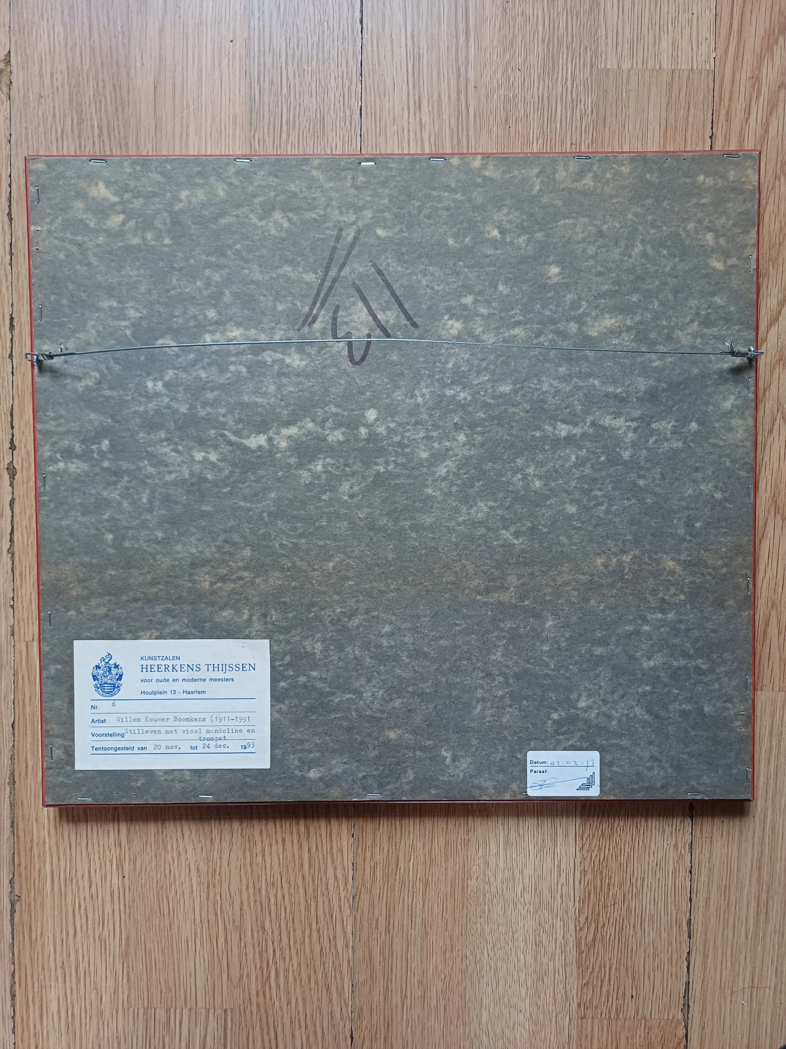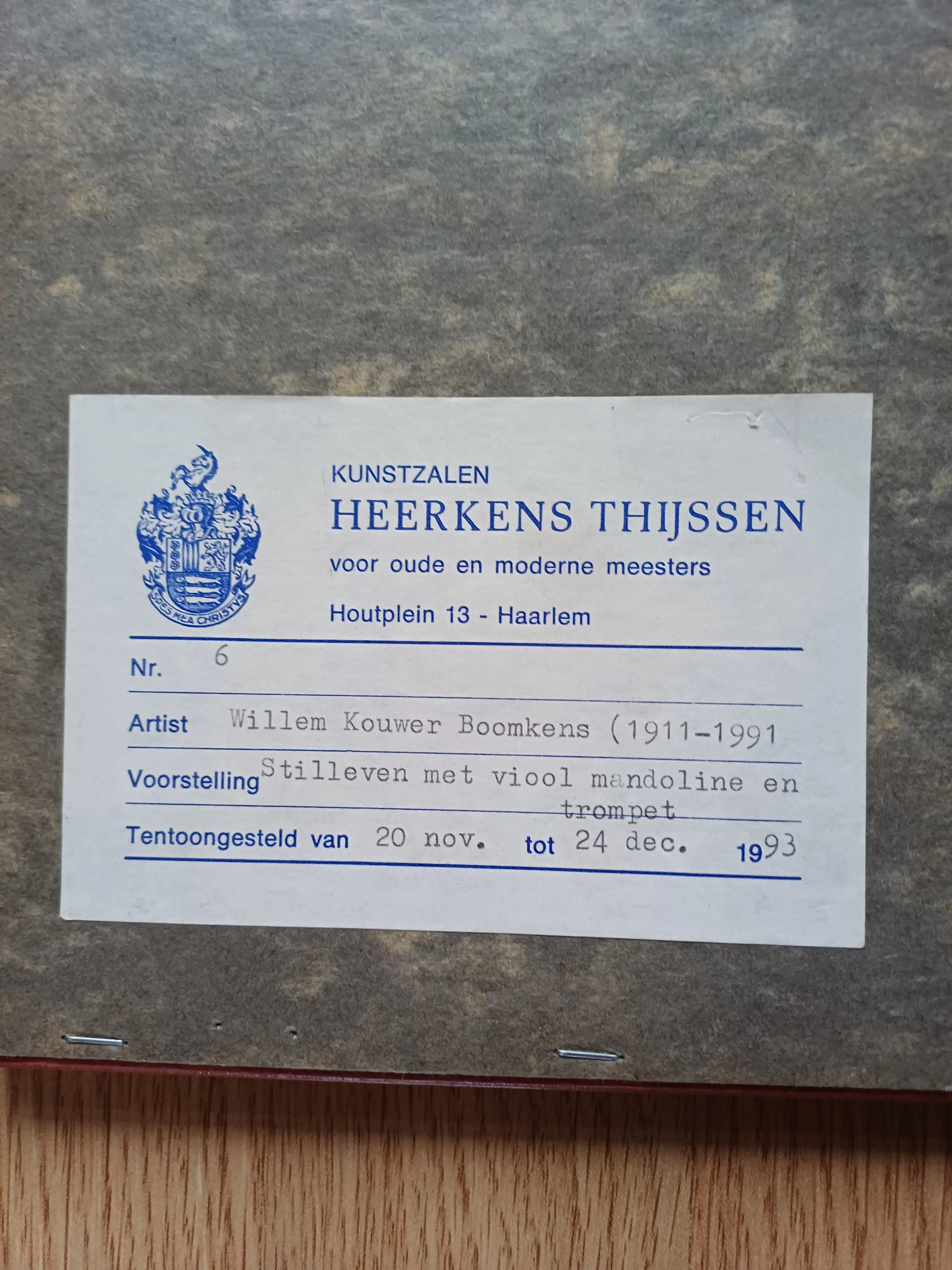 Een klein kleurrijk werk van de kunstenaar Willem Kouwer Boomkens, een stilleven met viool, mandoline en trompet. Het werk is tentoongesteld in 1993 bij de Kunstzalen van Heerkens Thijssen. Ingelijst in passe-partout achter glas.