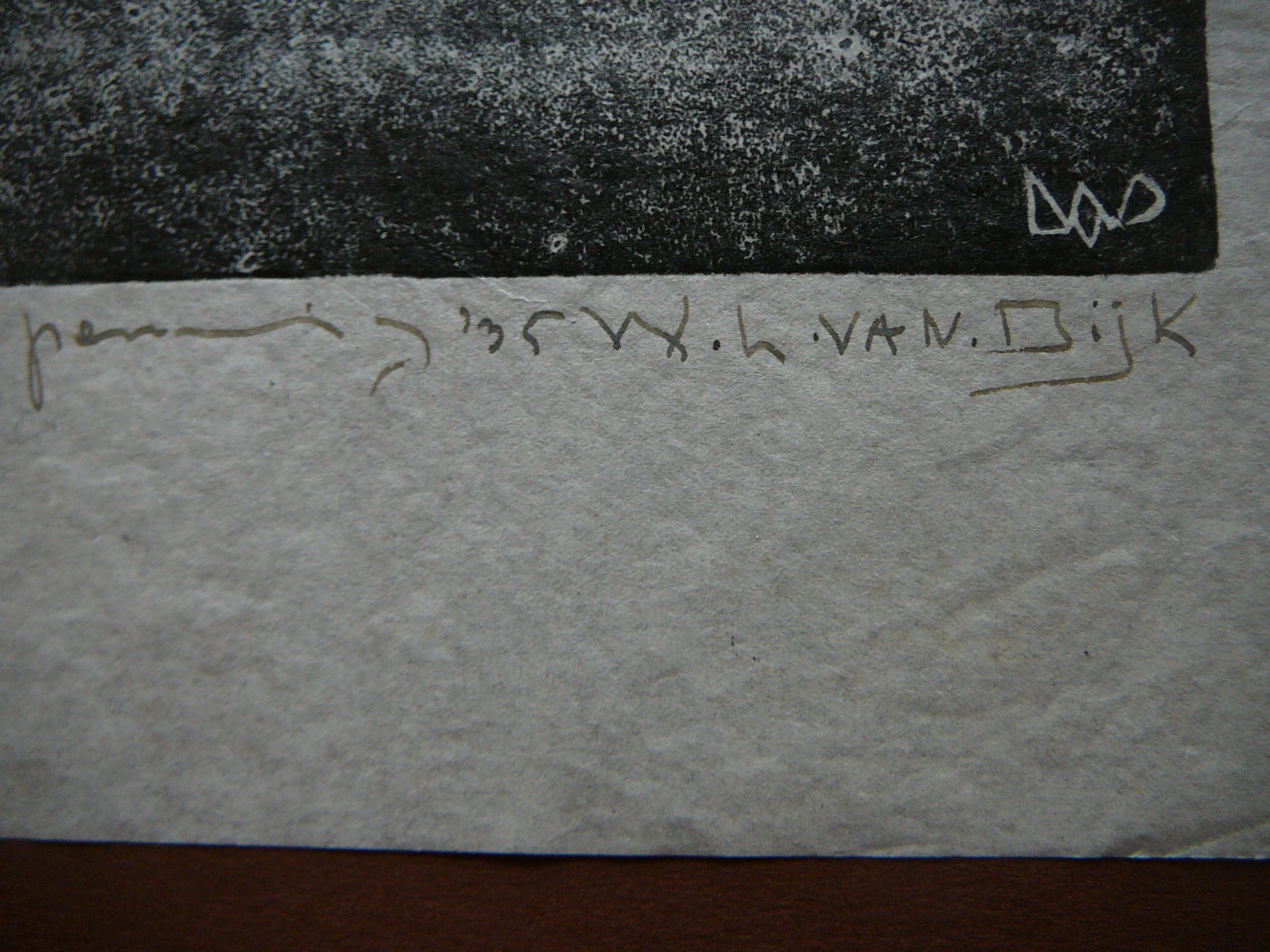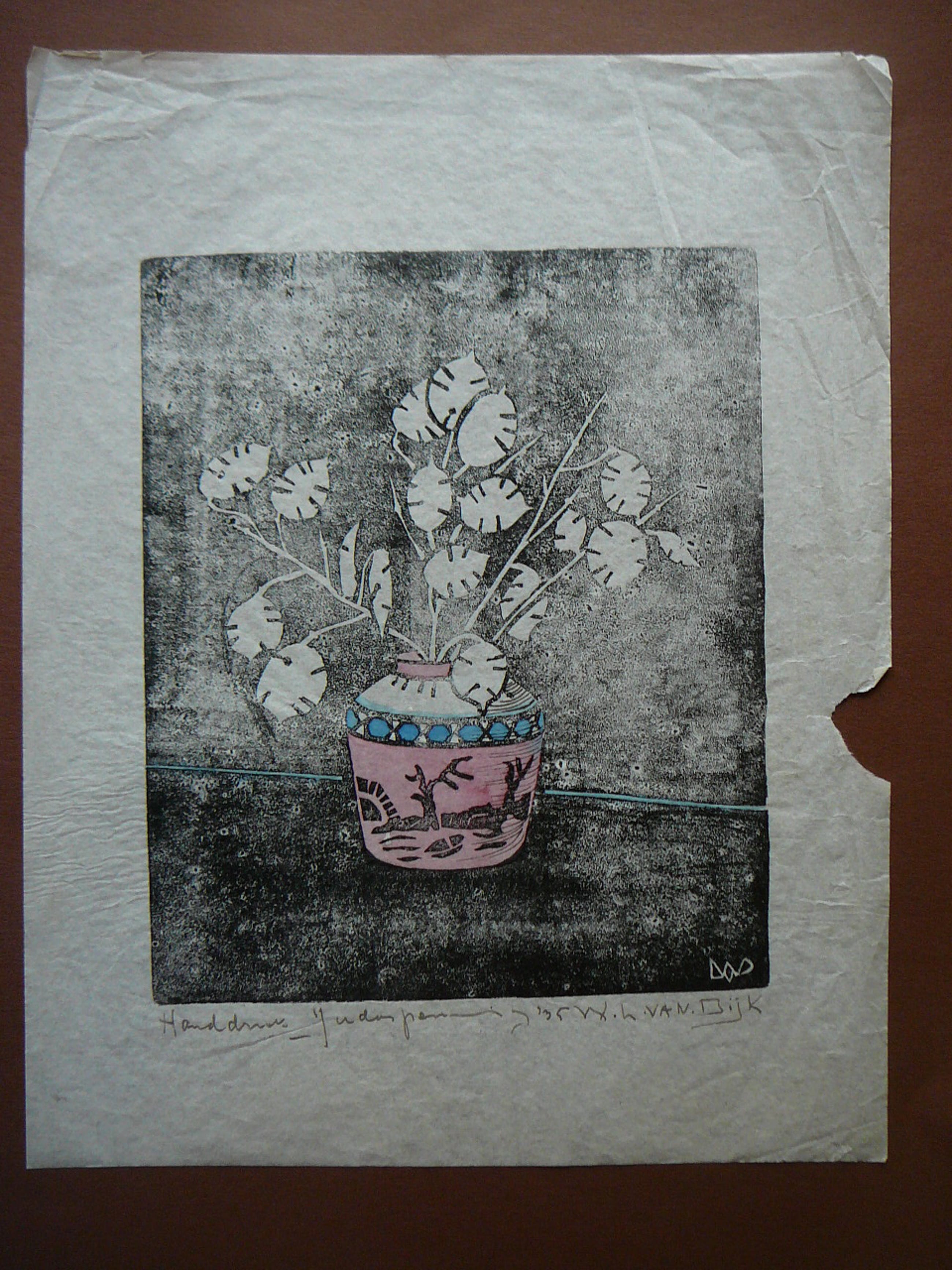 Houtsnede van een Judaspenning in een Chinese vaas door Willem Leenderd van Dijk ro gesigneerd in inkt Handdruk afm papier 29 x 22,5 cm