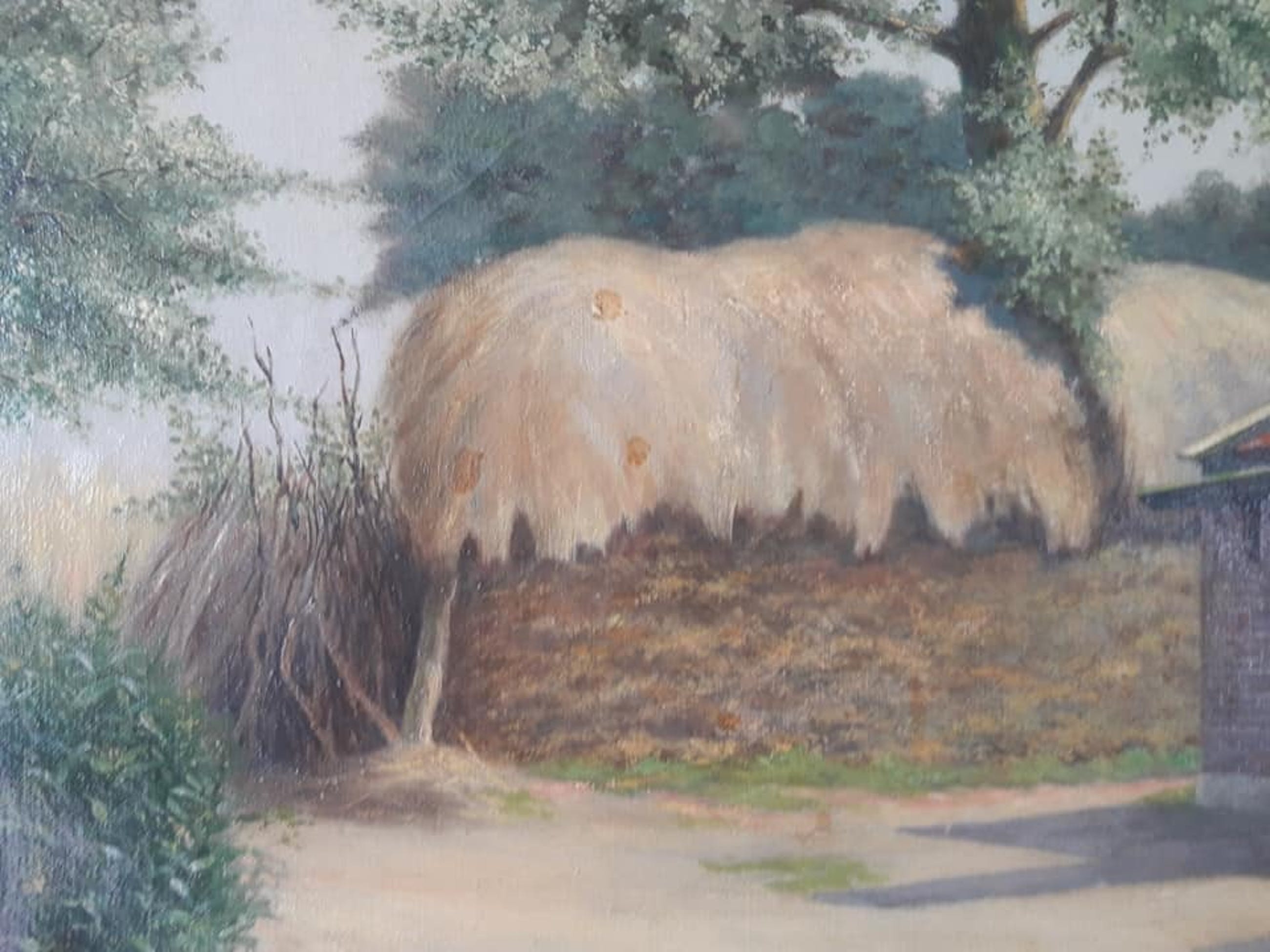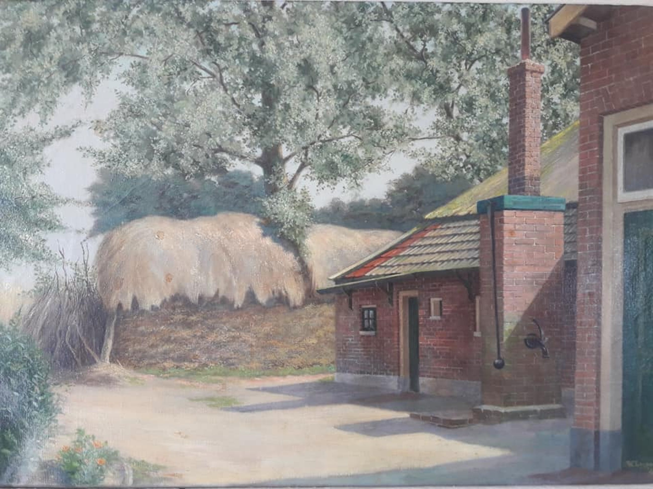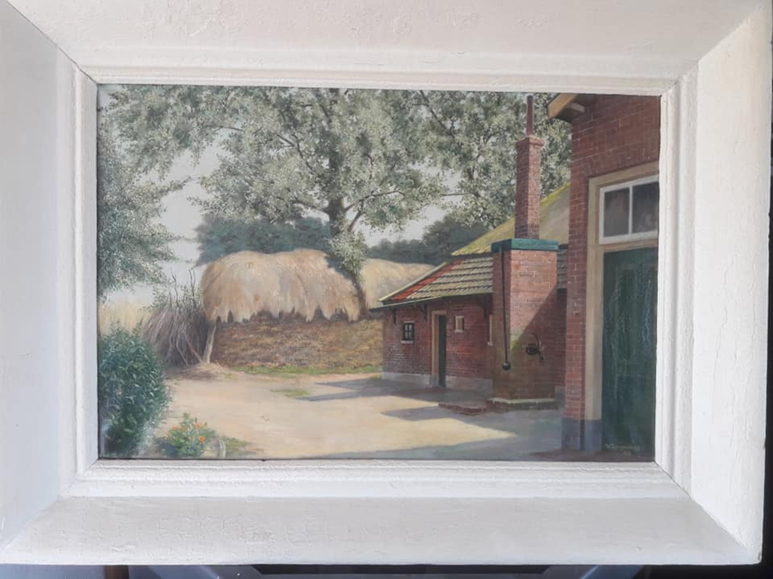Zeer gedetailleerd geschilderd werk van Willem Luynenburg, geboren in Wageningen in 1907 en overleden in Poortugaal in 1996. Hij was zowel schilder als aquarellist en zijn genres waren stillevens, portretten en landschappen. Zijn werkzame periode lag tussen 1922 en 1976. Dit schilderij is geschilderd in de 2e wereldoorlog in 1944. Let vooral op hoe de stenen van de boerderij zijn geschilderd. Heel levensecht. Lijkt haast wel een foto! Het werk verkeerd in een redelijk goede staat de lijst heeft wel een klein plekje, niet opvallend. (zie foto's) Het zal worden verzonden in een op maat gemaakte kist om beschadiging te voorkomen