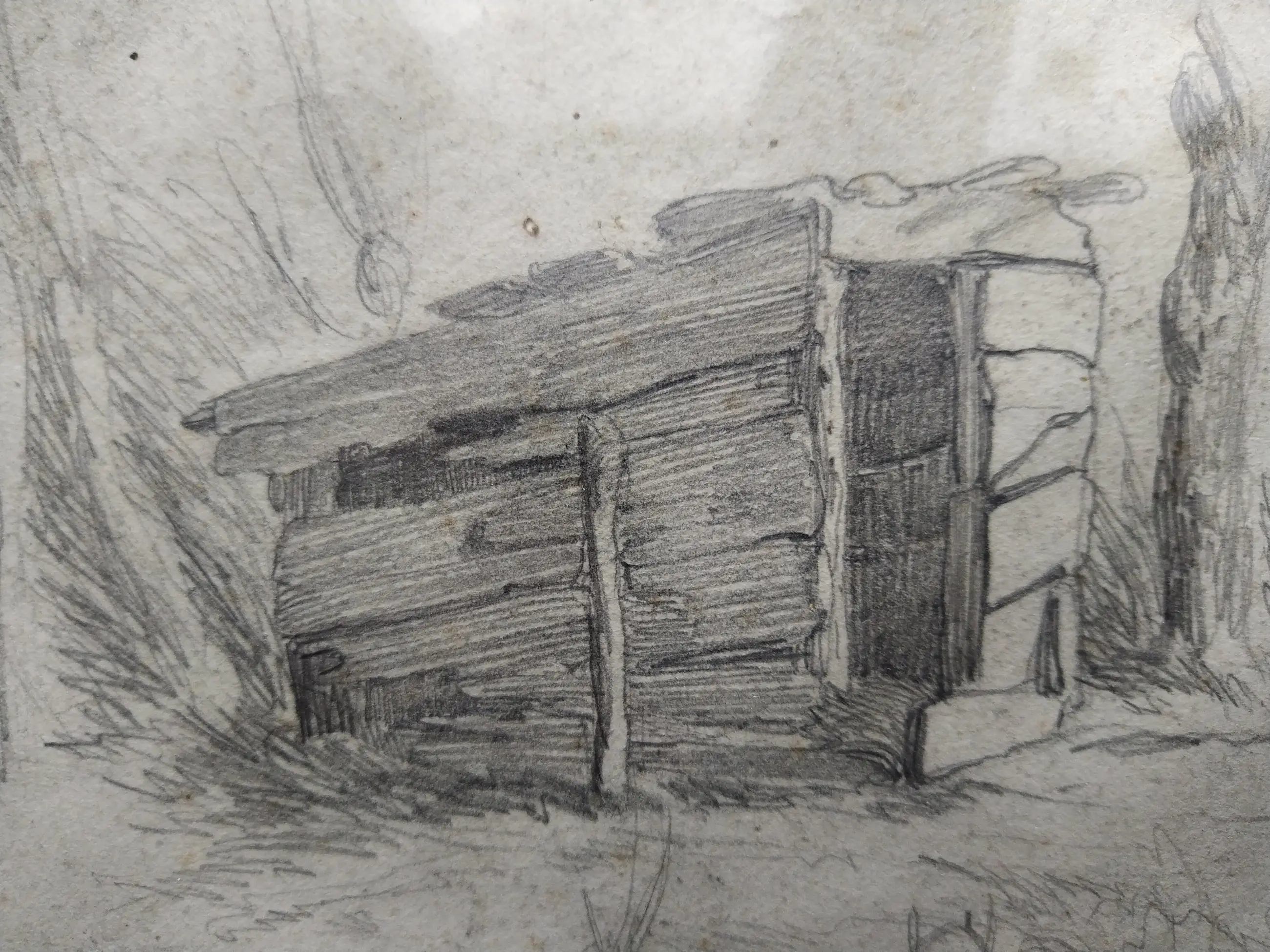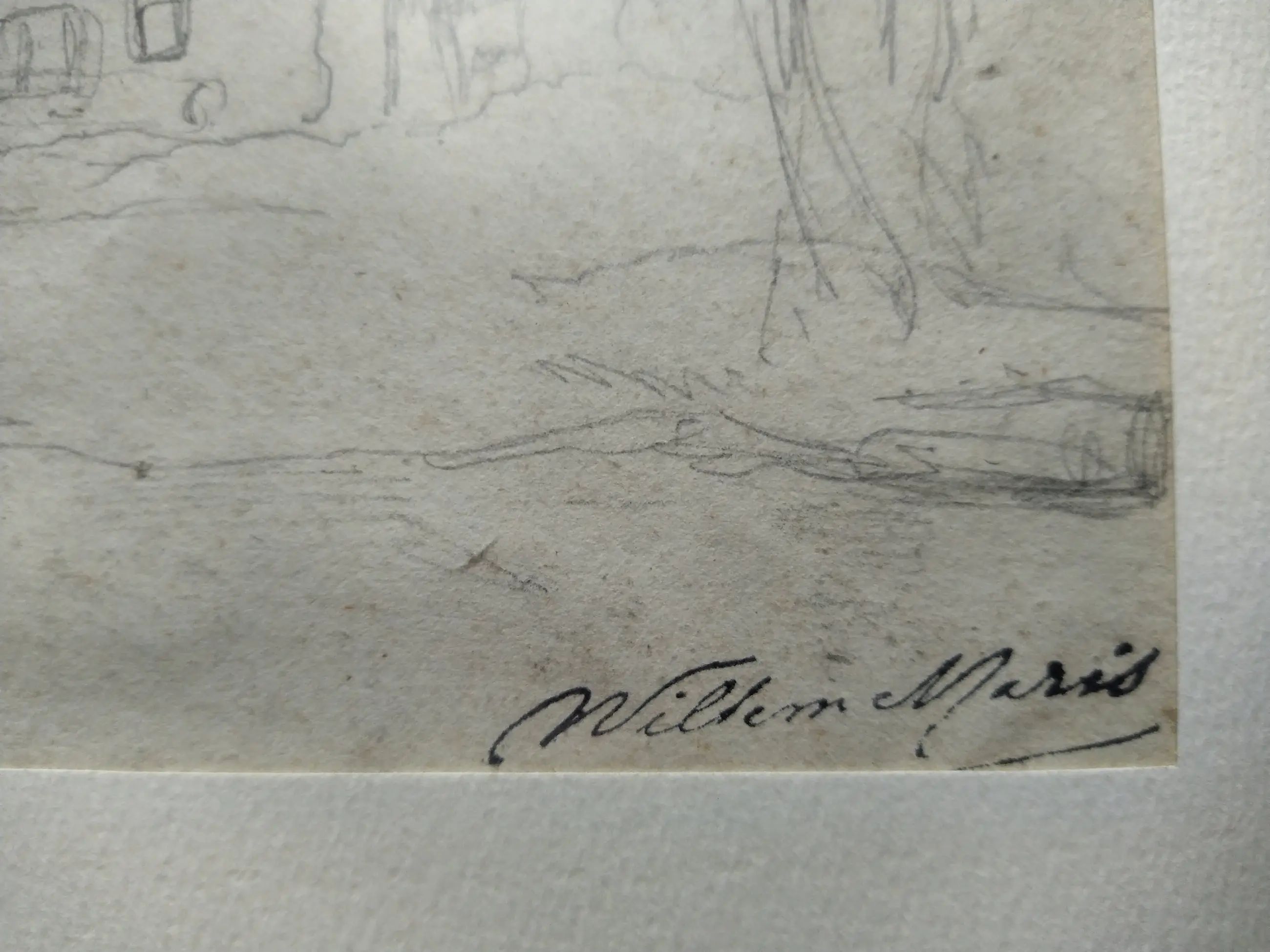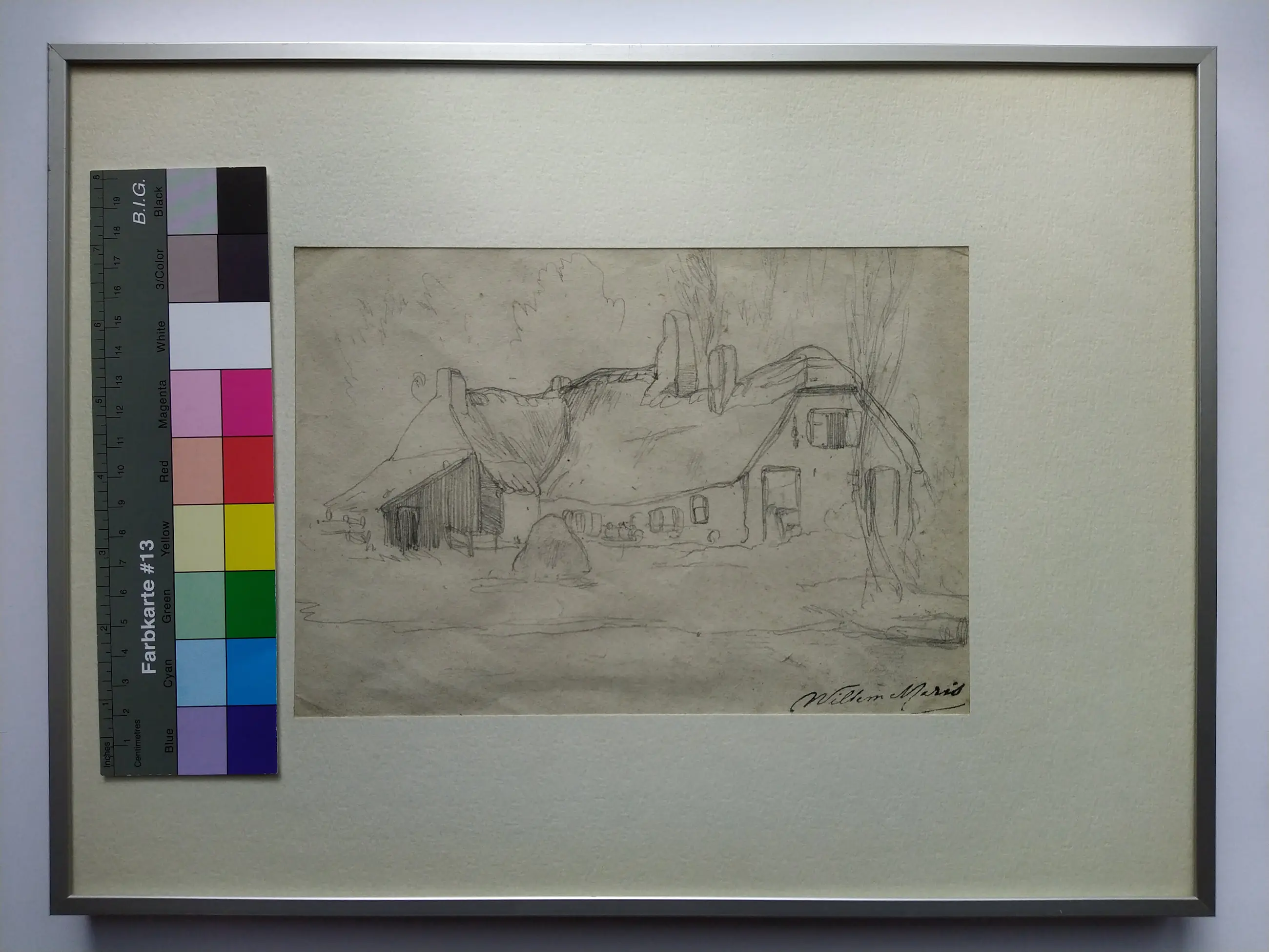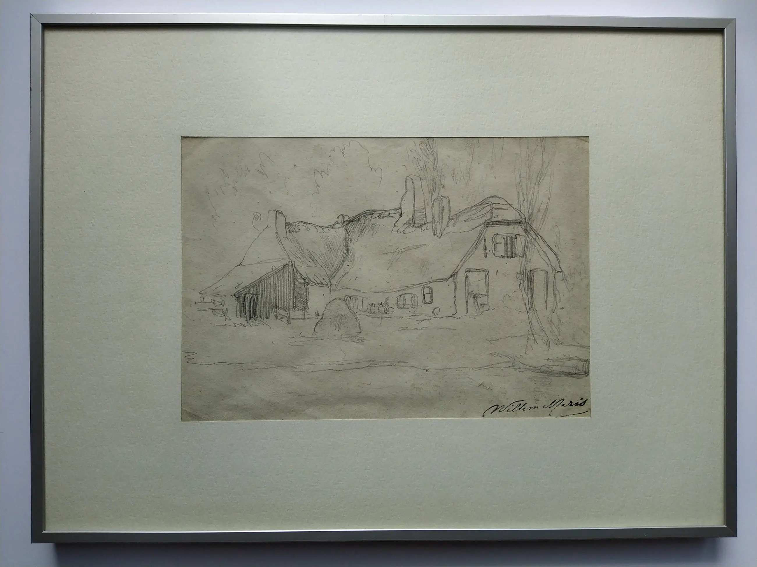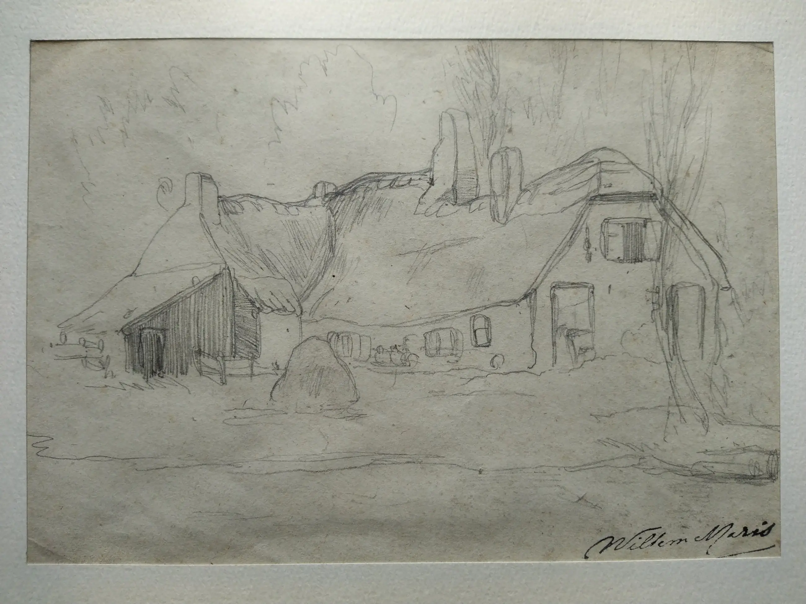 Een tekening van een boerderij met pen gesigneerd. Wat het ook bijzonder maakt, is dat op de achterkant een schets van een hondenhok staat. Daarom is dit werk ingelijst met aan beide kanten glas, zodat beide tekeningen goed te zien zijn. Rechtsonder met inkt gesigneerd.