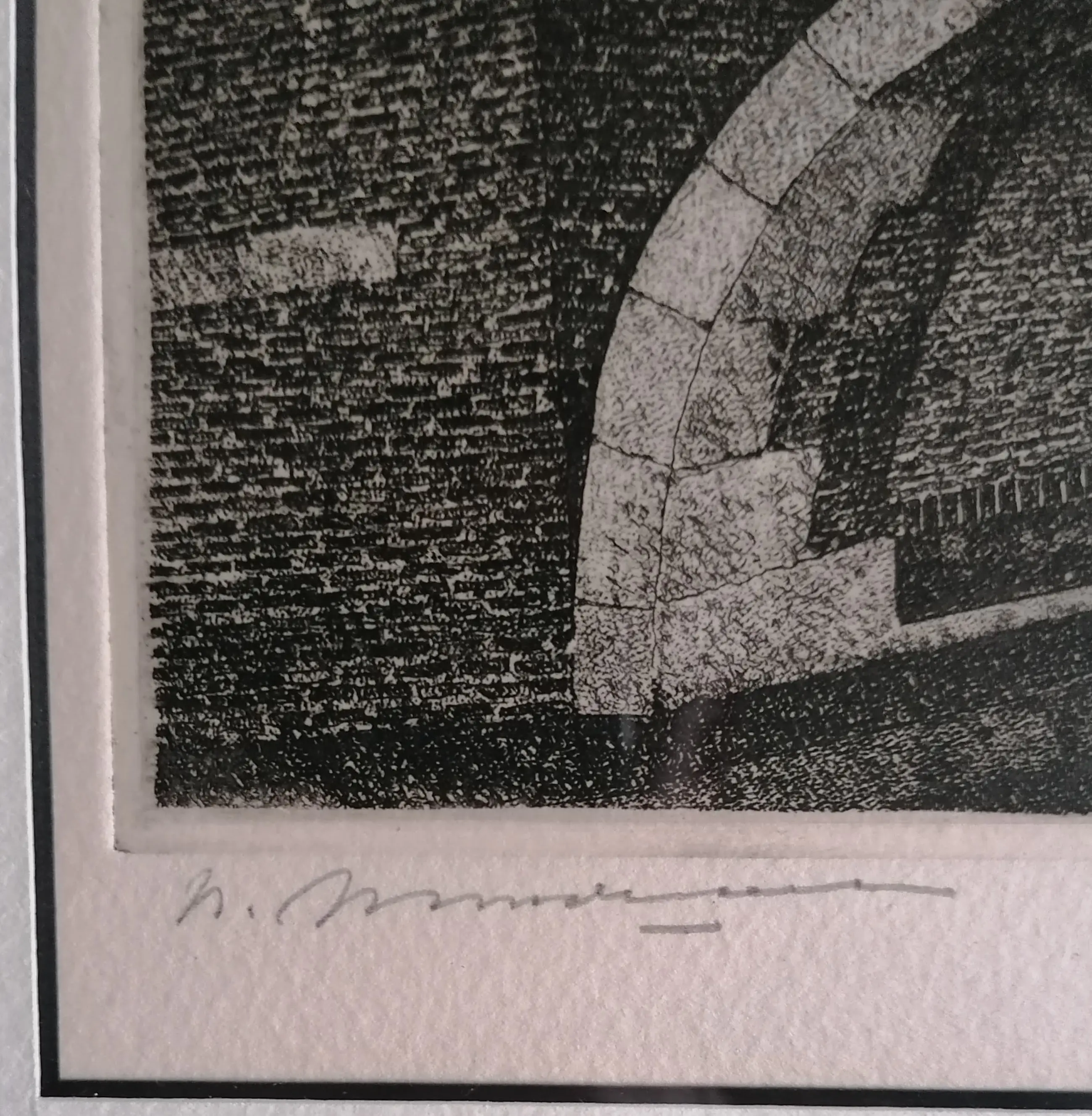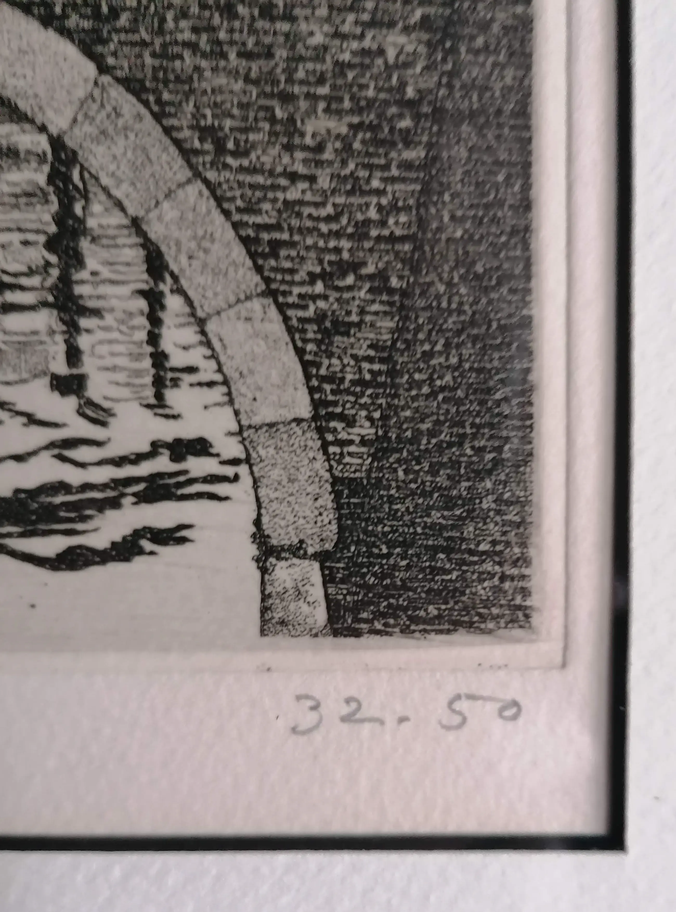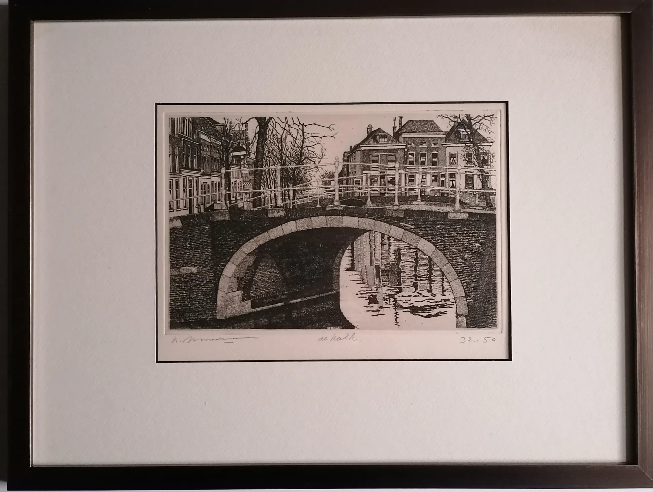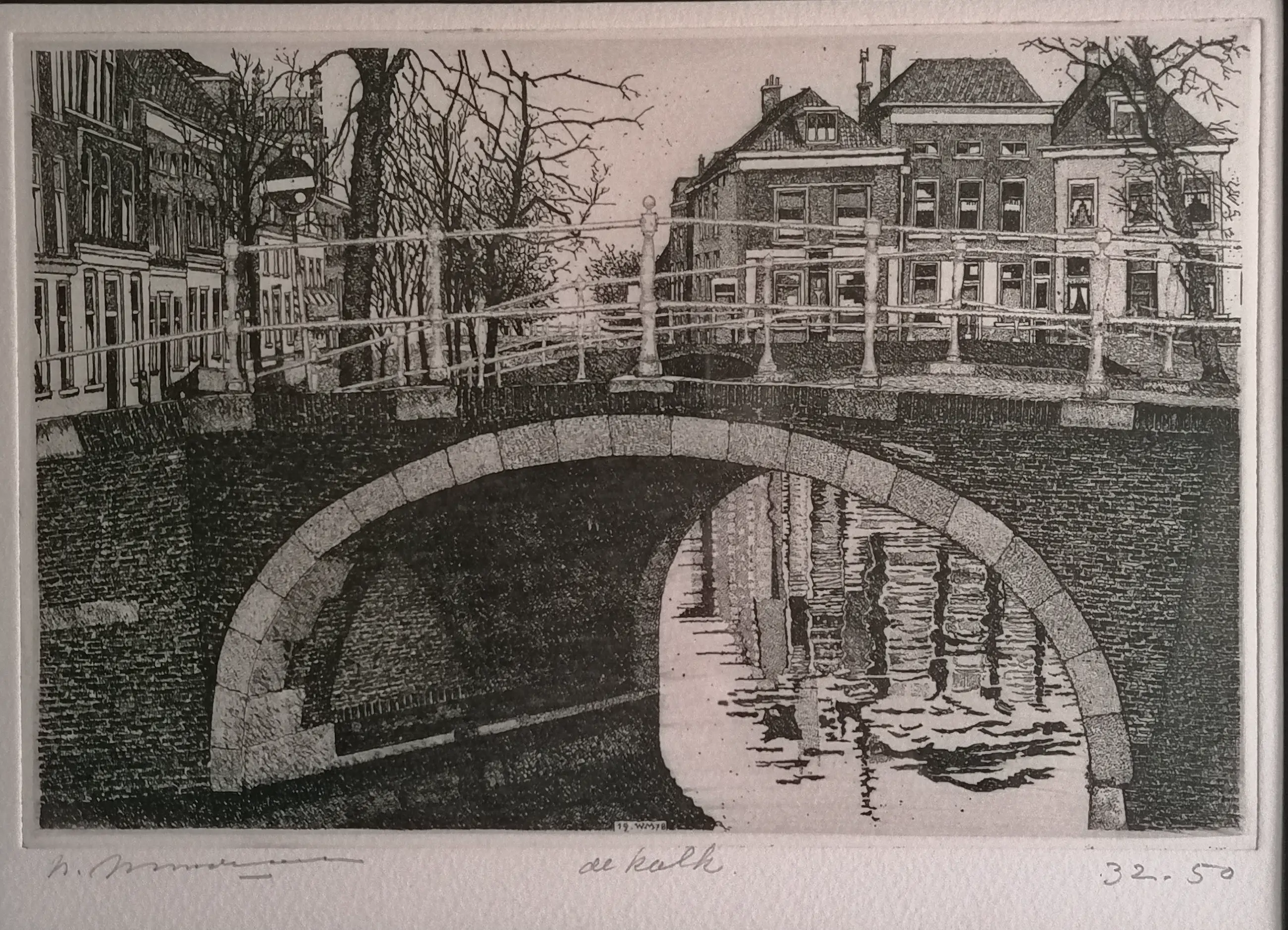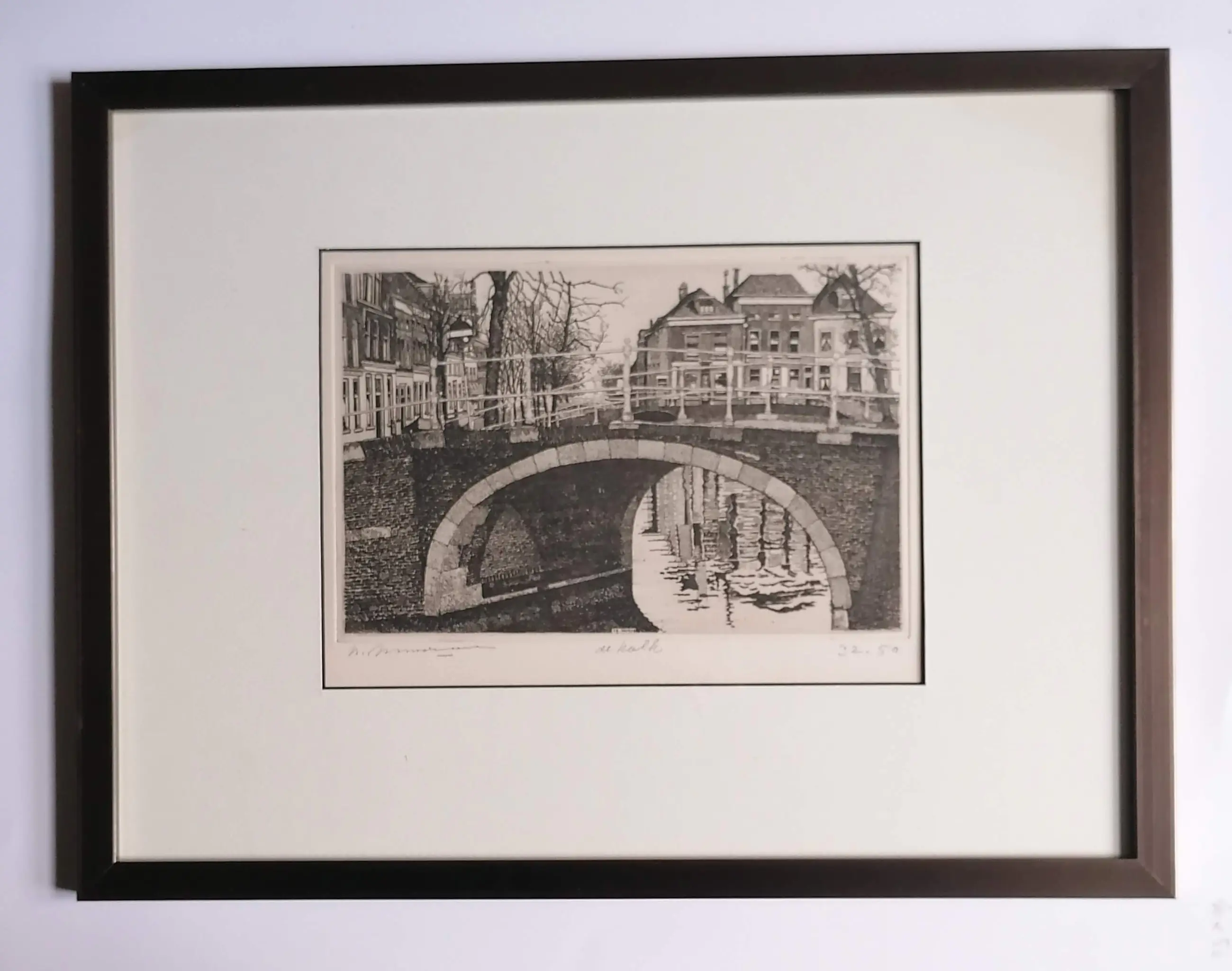 Brug met huizen op de achtergrond. Welke stad mij onbekend. mooi diep geetst.