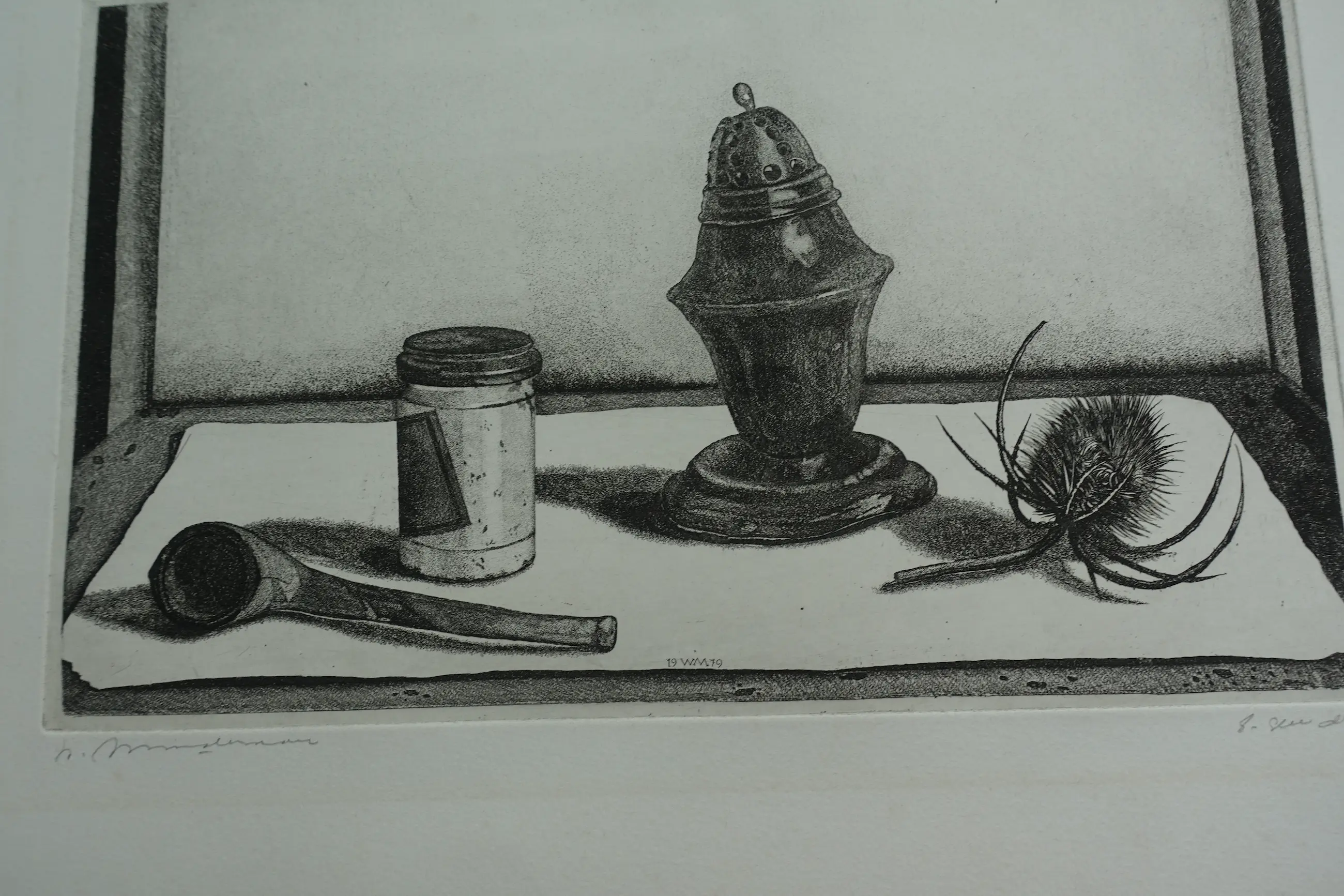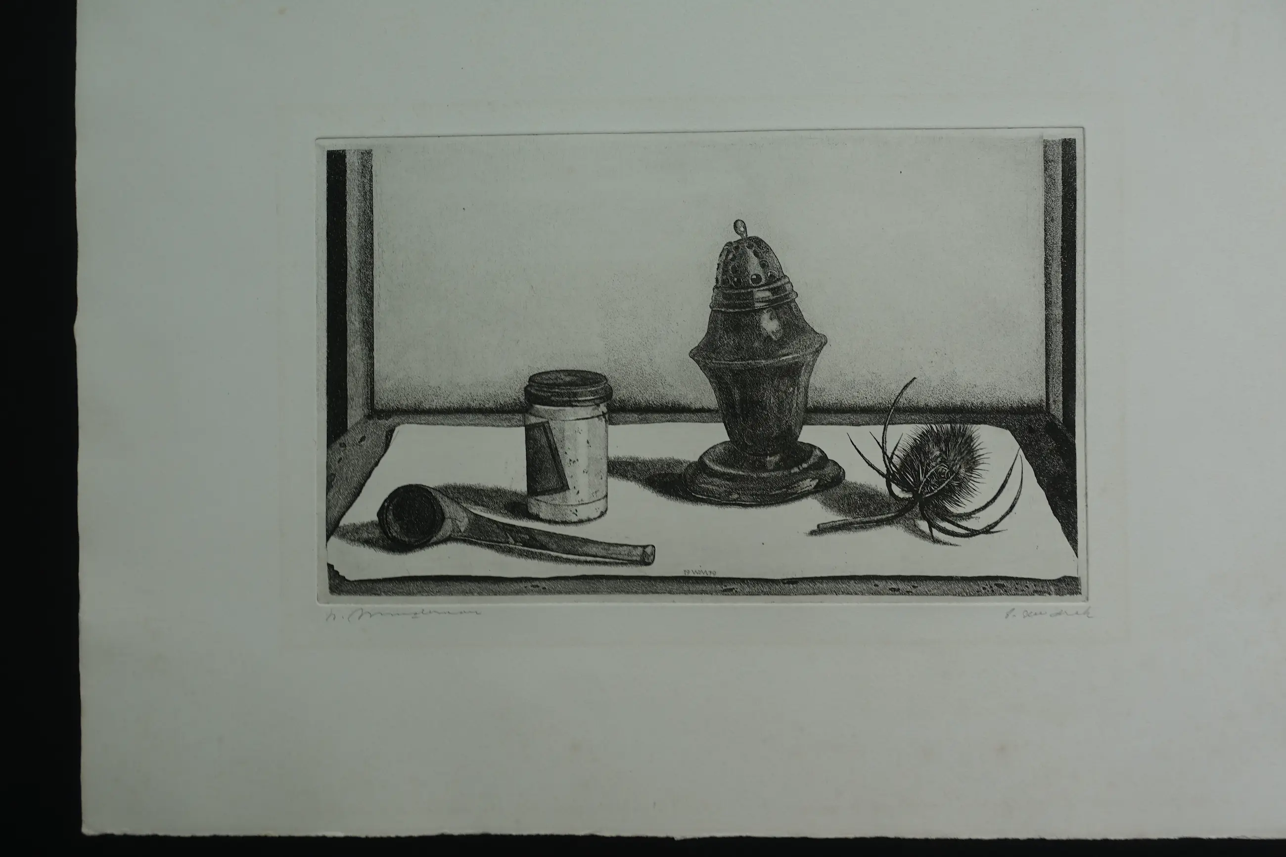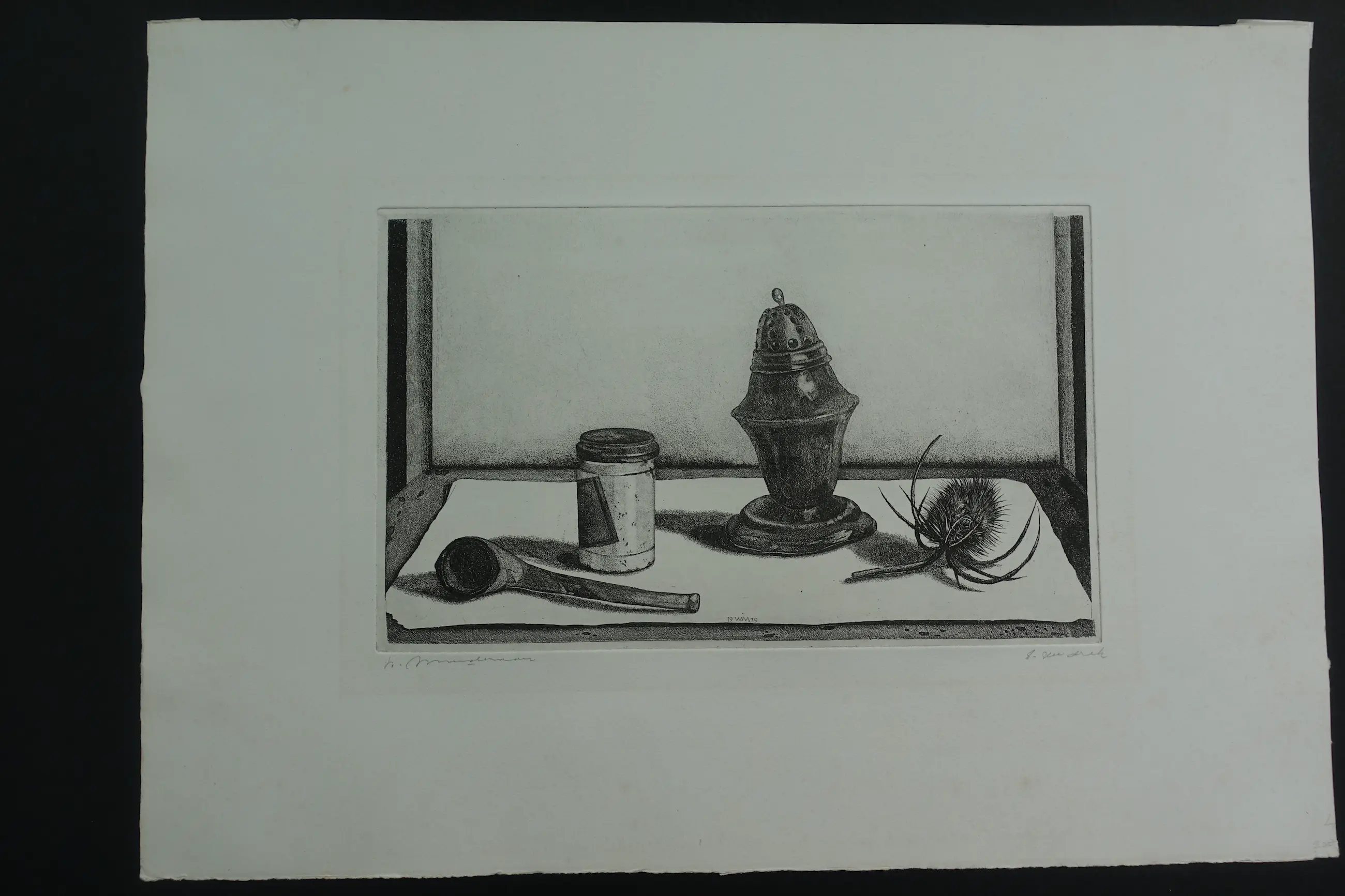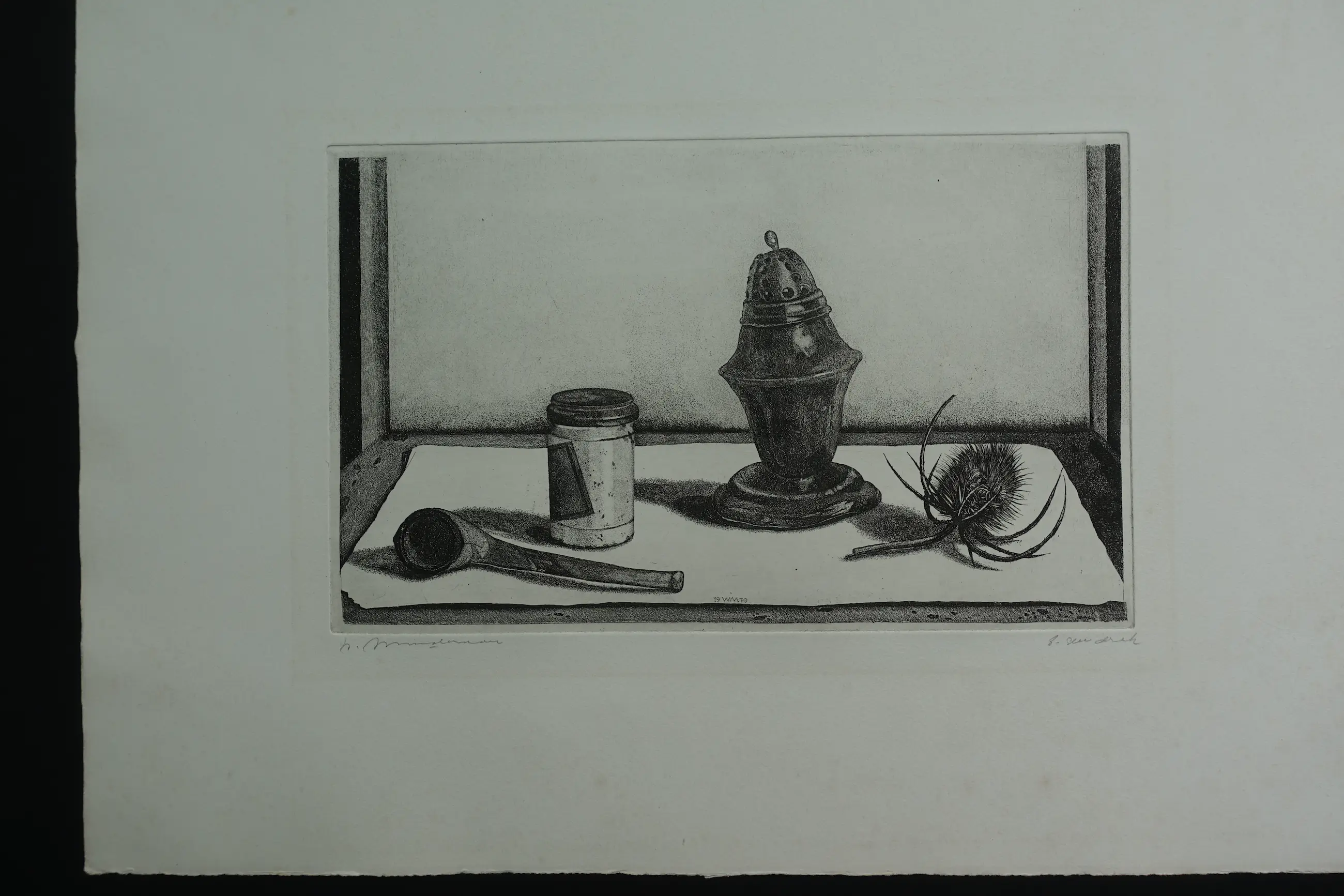Gedetailleerd stilleven van Willem Minderman. Afgedrukt op geschept papier in zeer goede conditie. M.o. in de plaat monogram en datering. Gesigneerd met potlood en eigen druk.