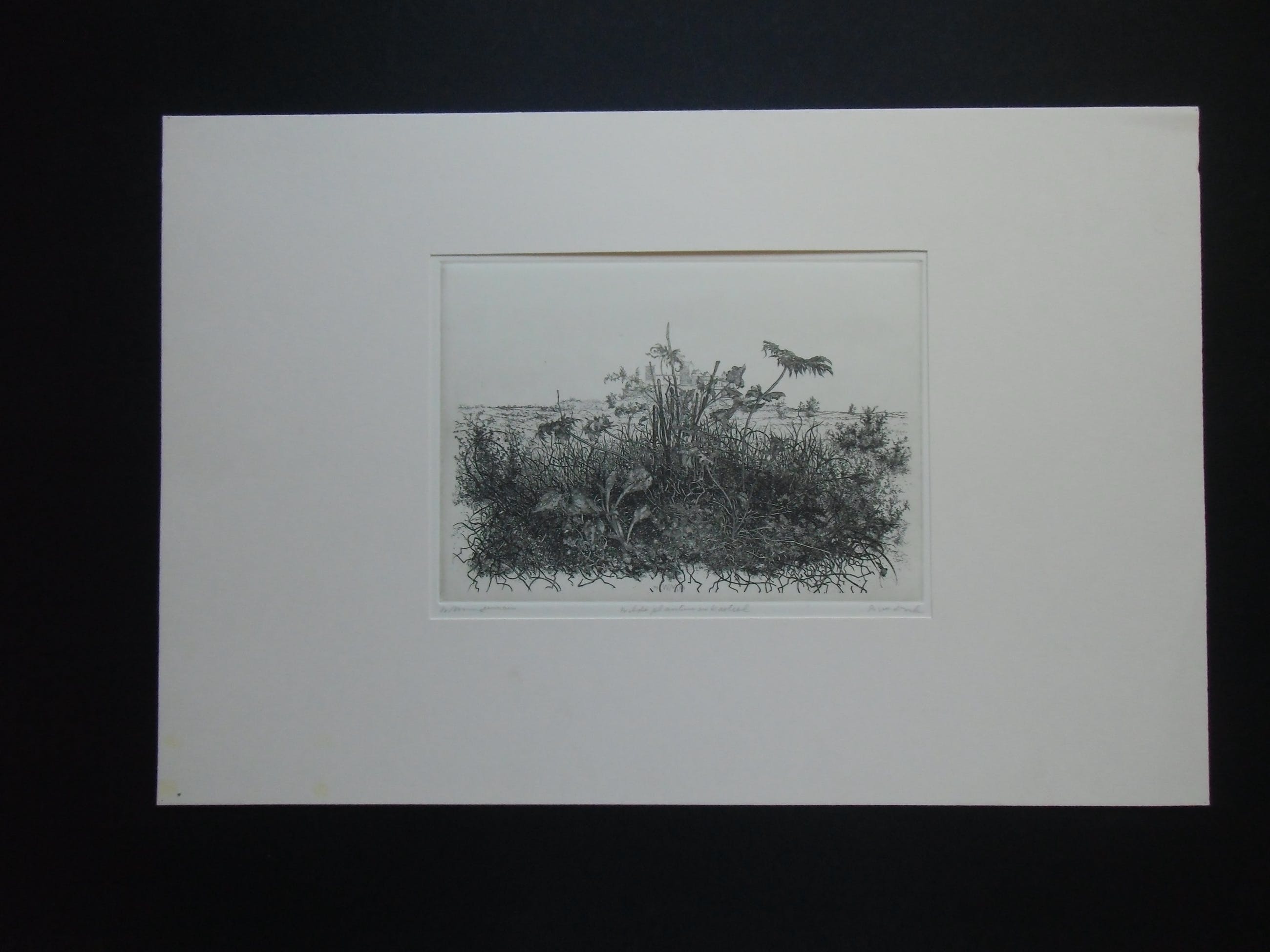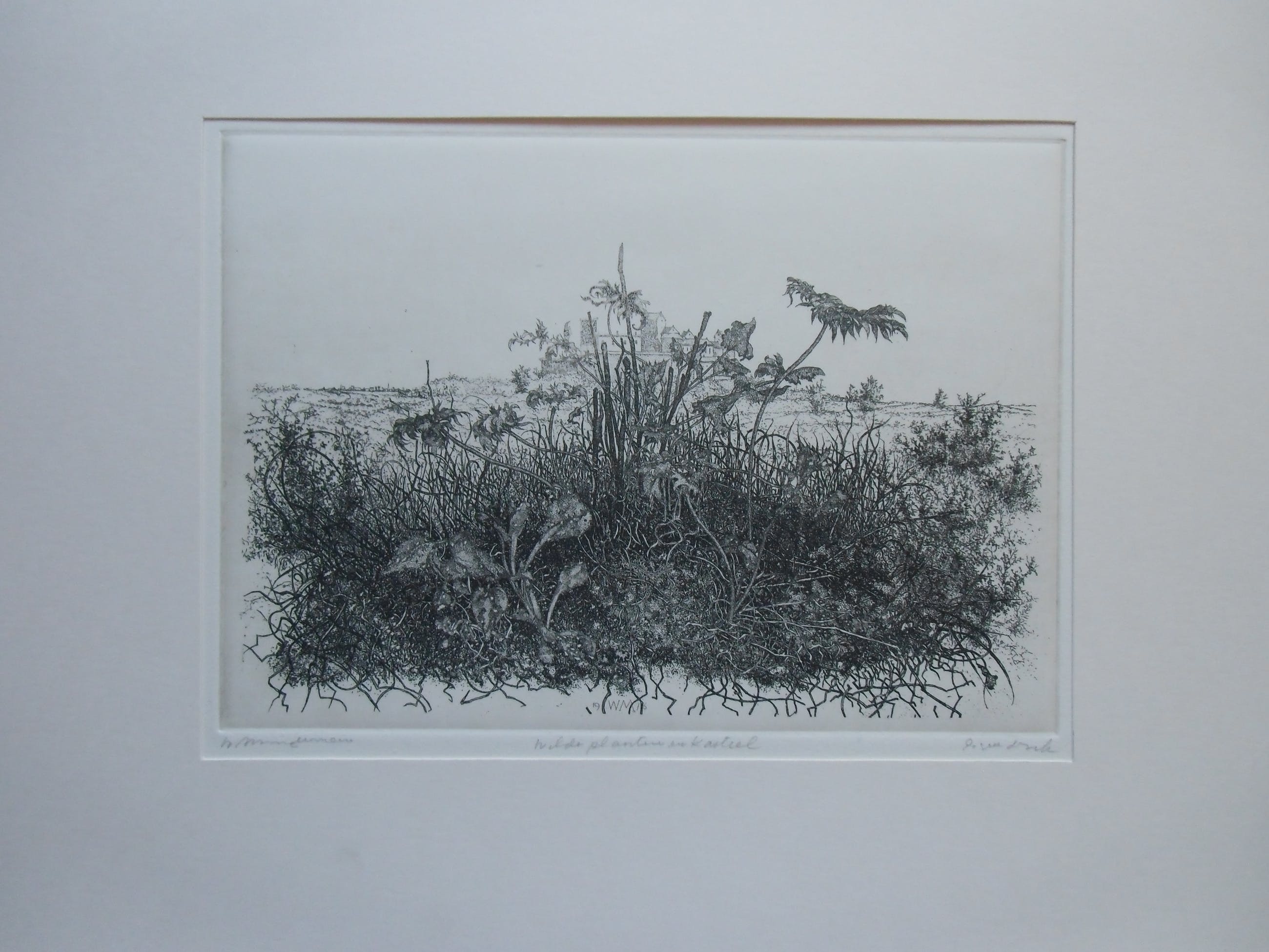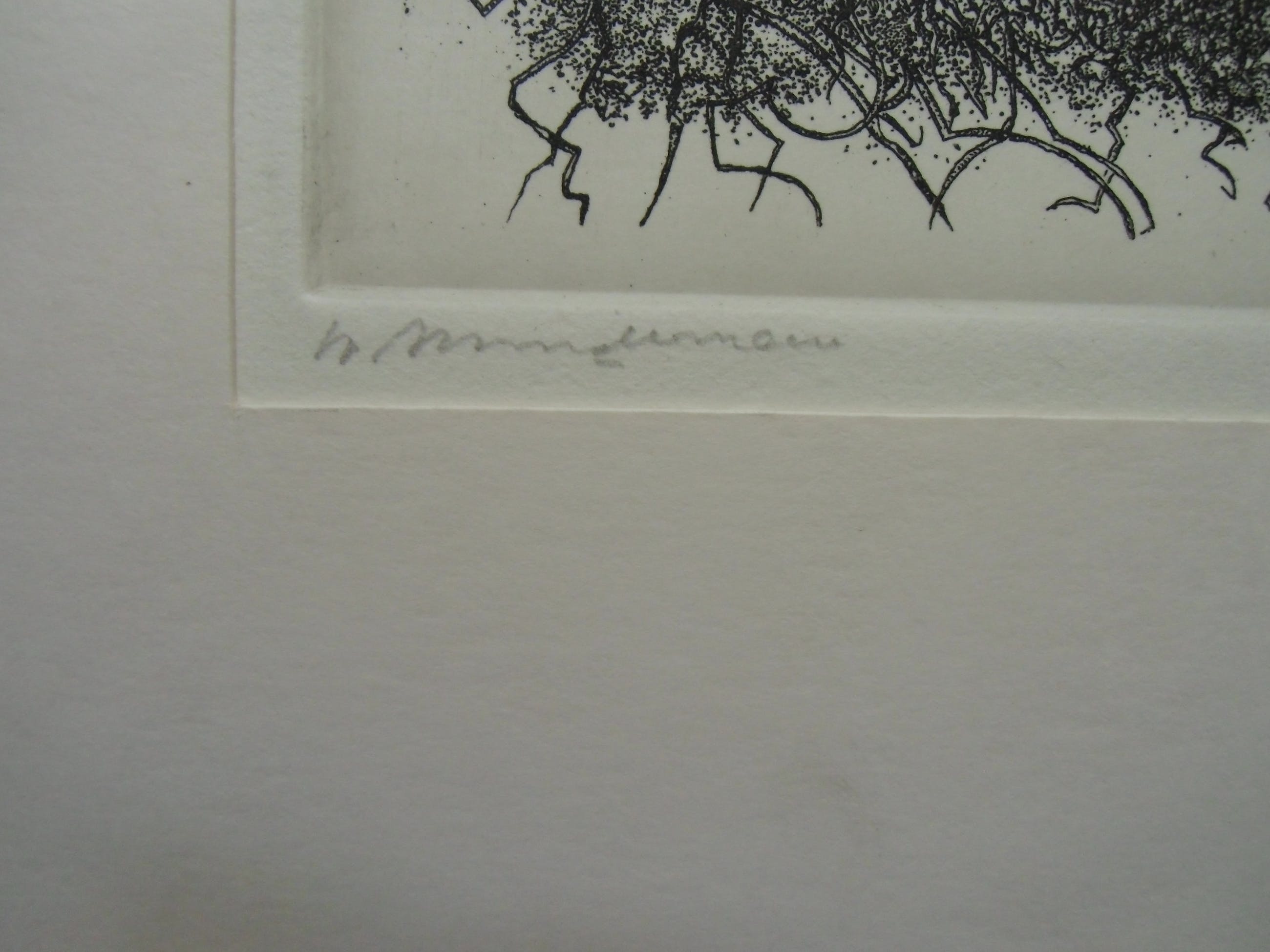 Karakteristieke prent van Willem Mindferman. Gesigneerd , betiteld en eigen druk met potlood. Monogram en datering (1976) in de plaat. Los in passepartout met achtervel. Uit de voorraad van Borzo Kunsthandel.
