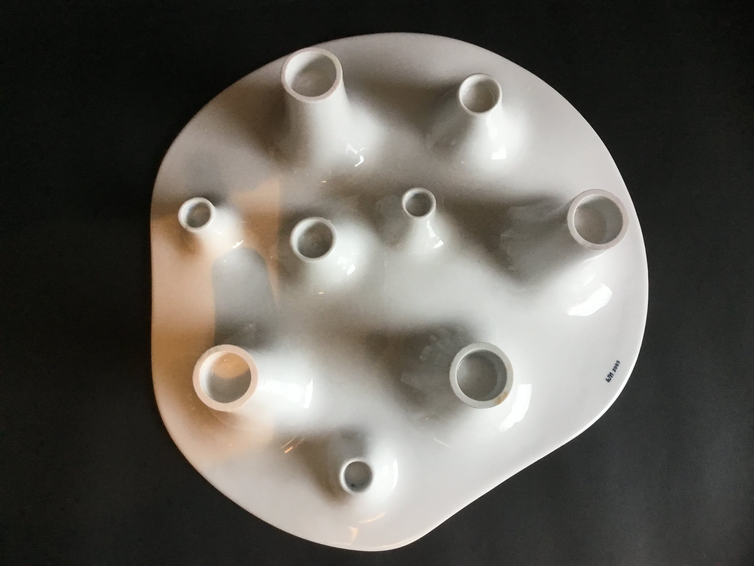 Mooi tijdloos ontwerp van Willem Noyons, zowel te gebruiken als fruitschaal en als kaarsenhouder. De beide objecten zij in een mooie staat, een kaarsenhouder kant is licht verkleurd door het branden van kaarsen.