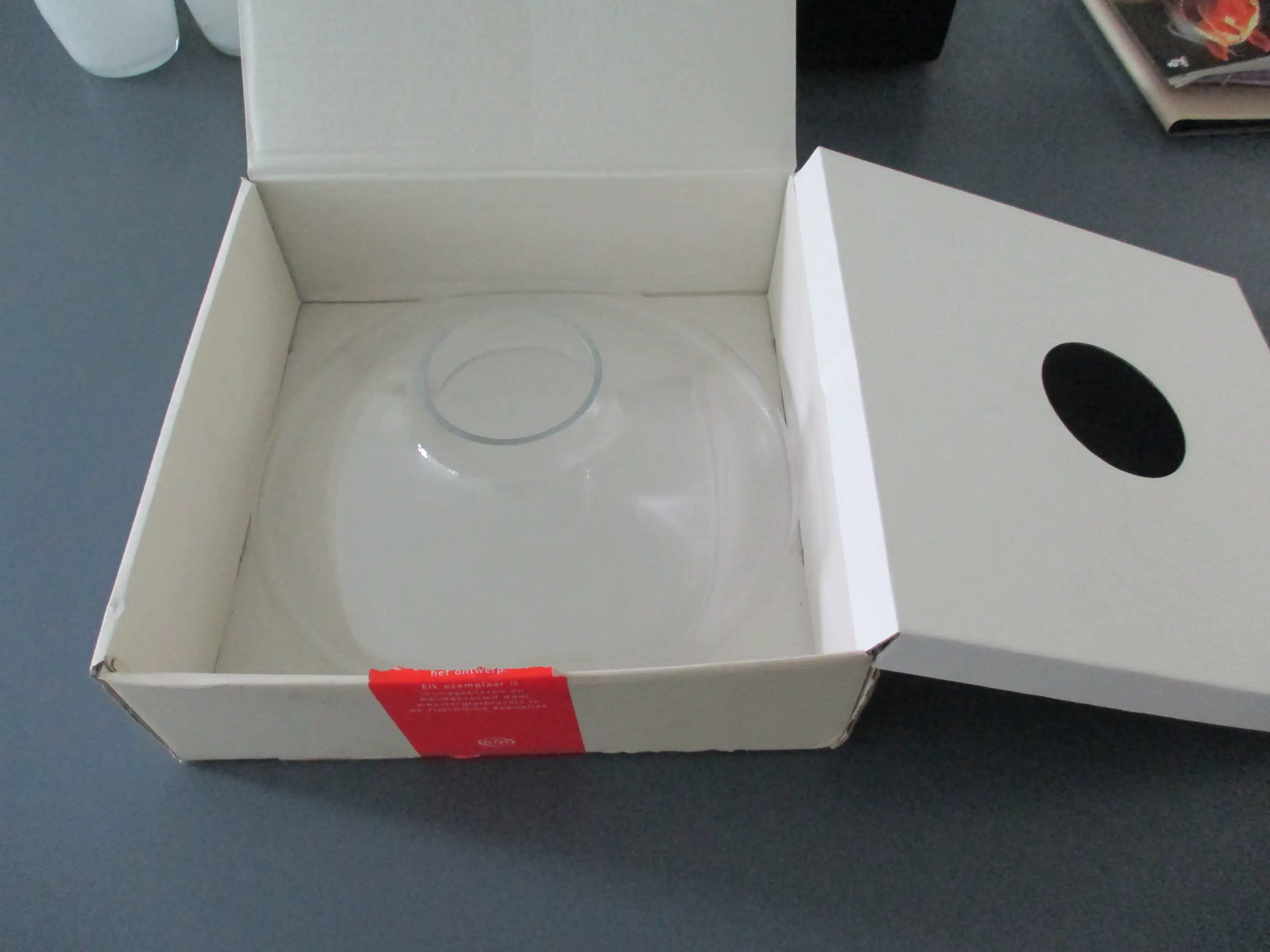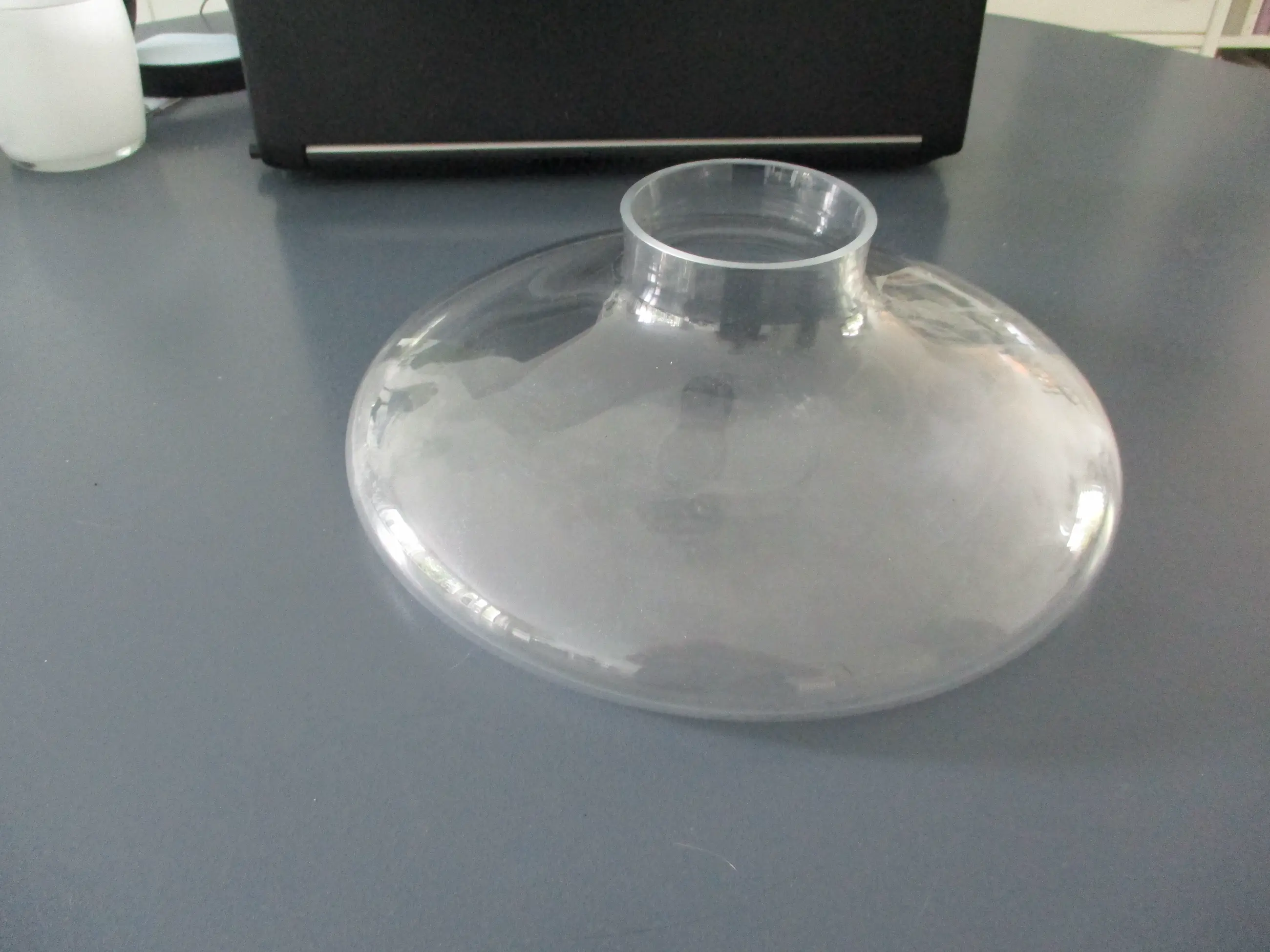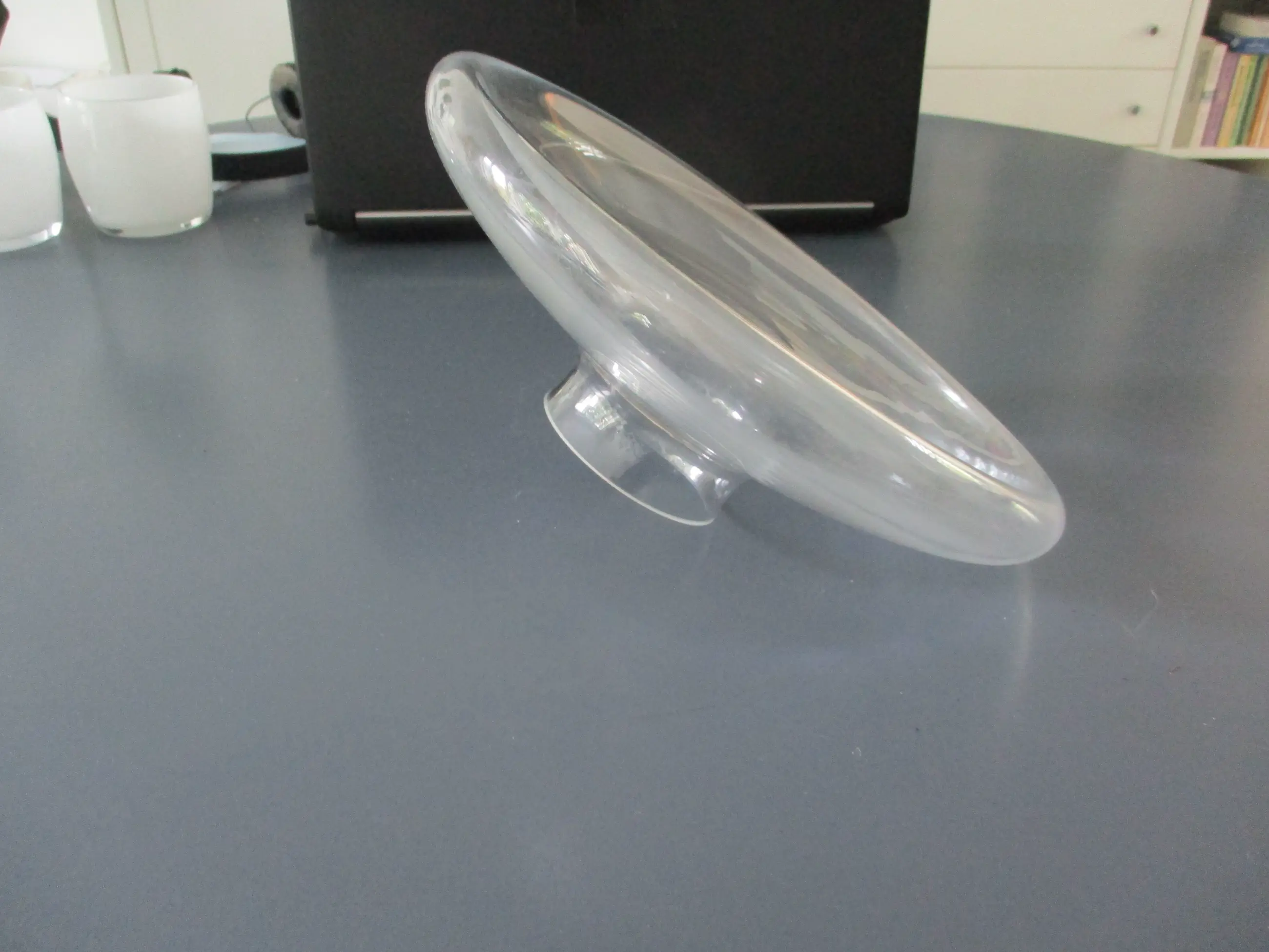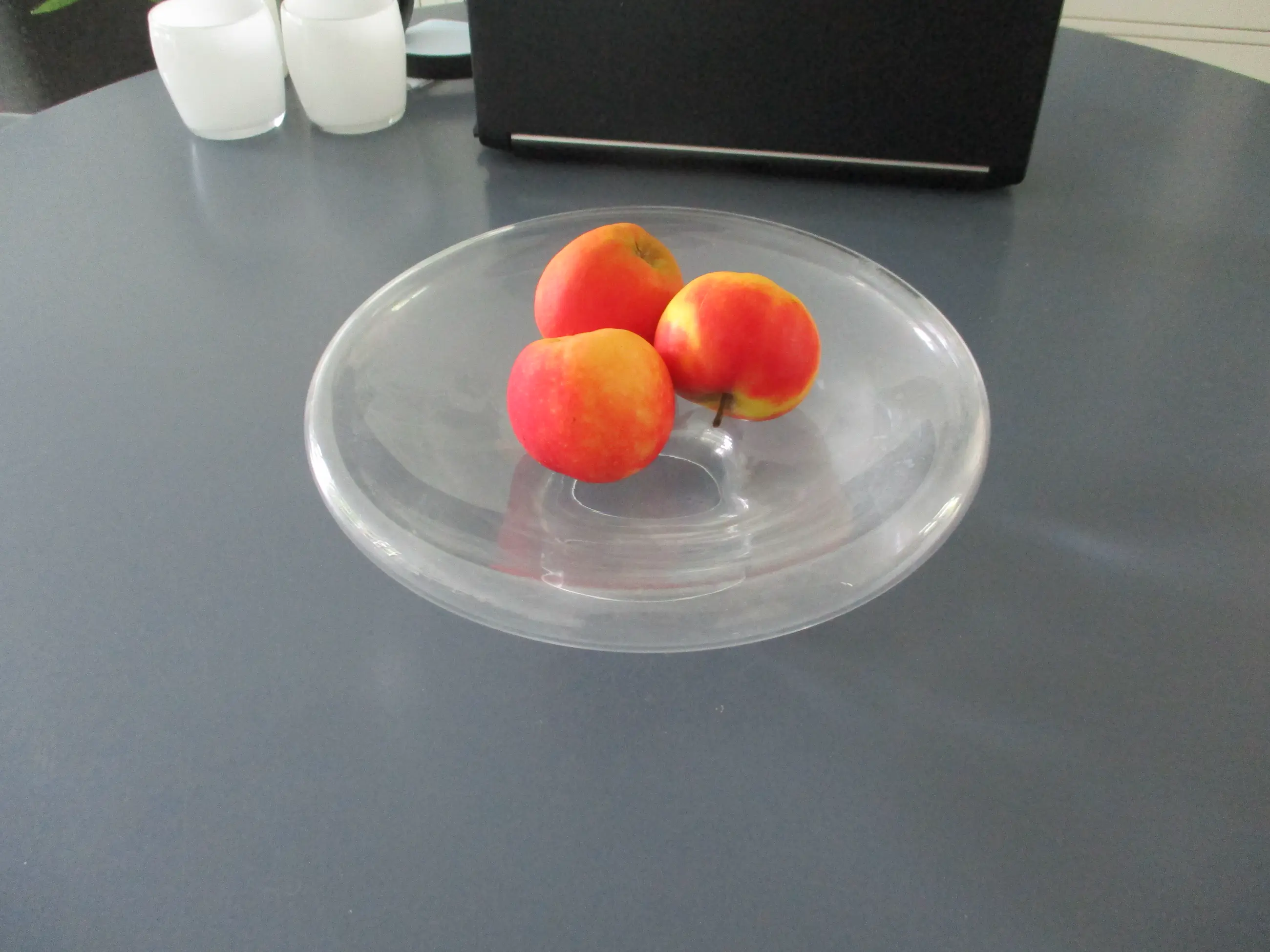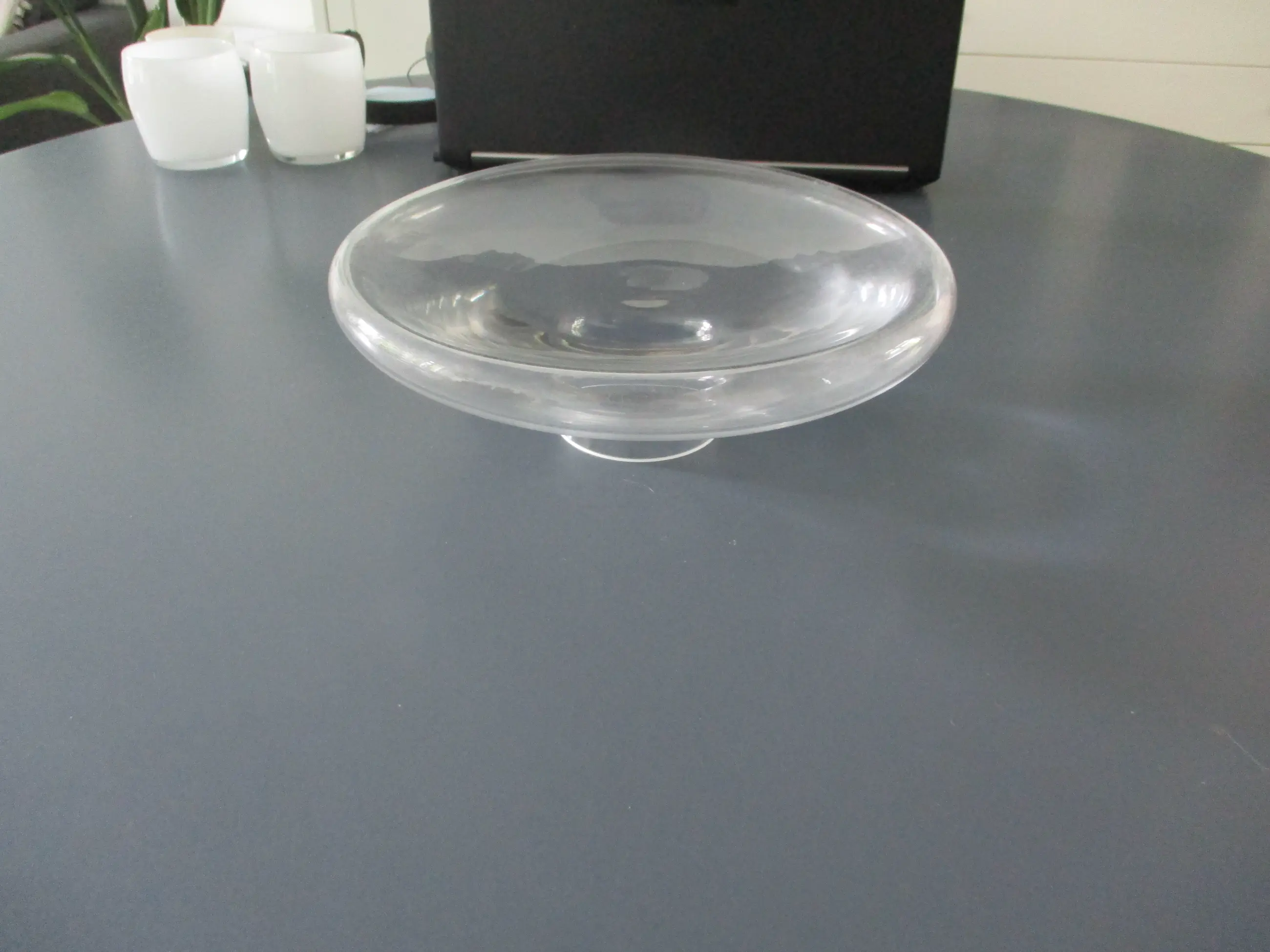 Helder en dik glas ( 5 mm) met een geslepen rand. Diameter is 30 cm, hoogte is 10 cm.
