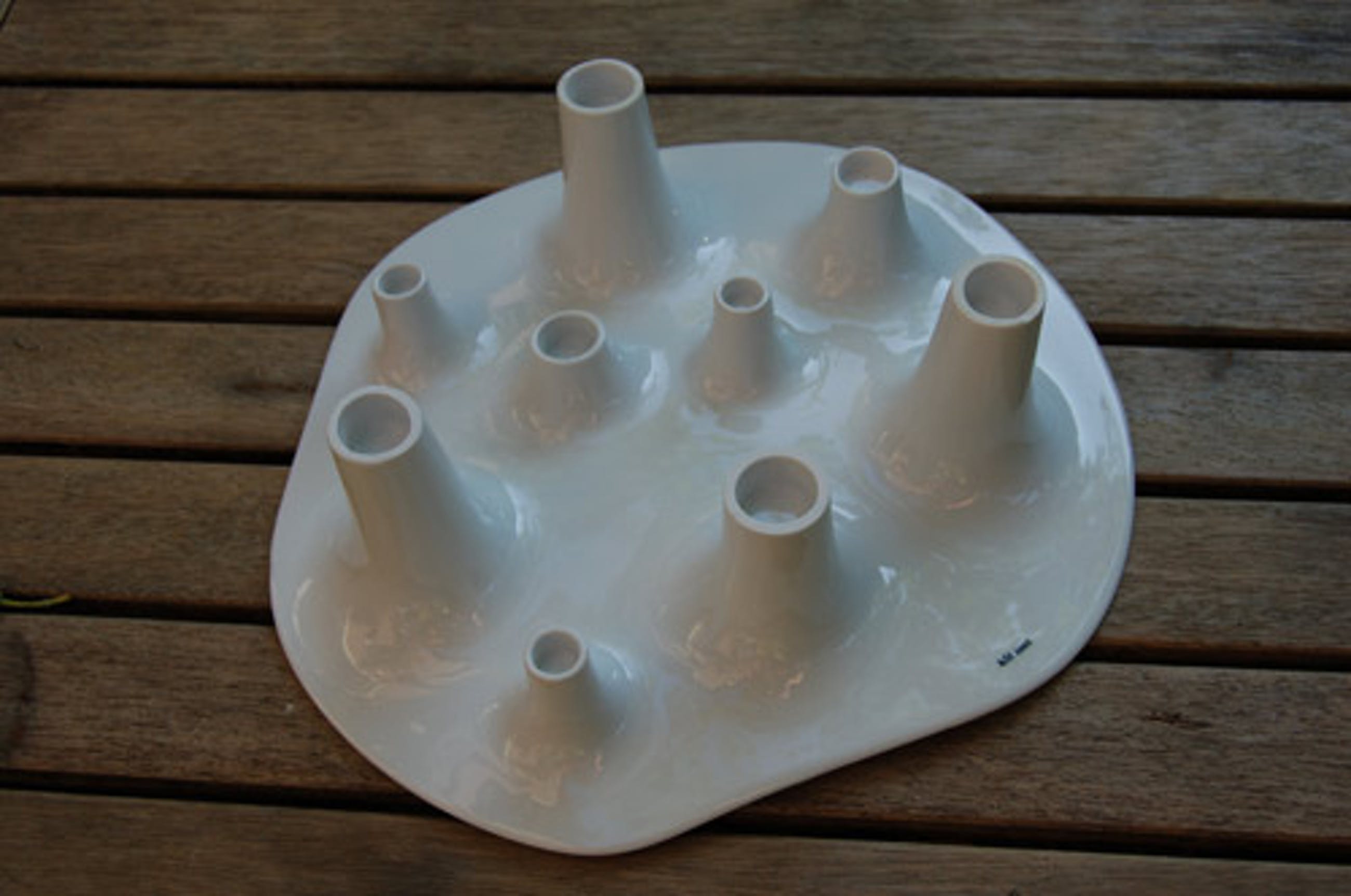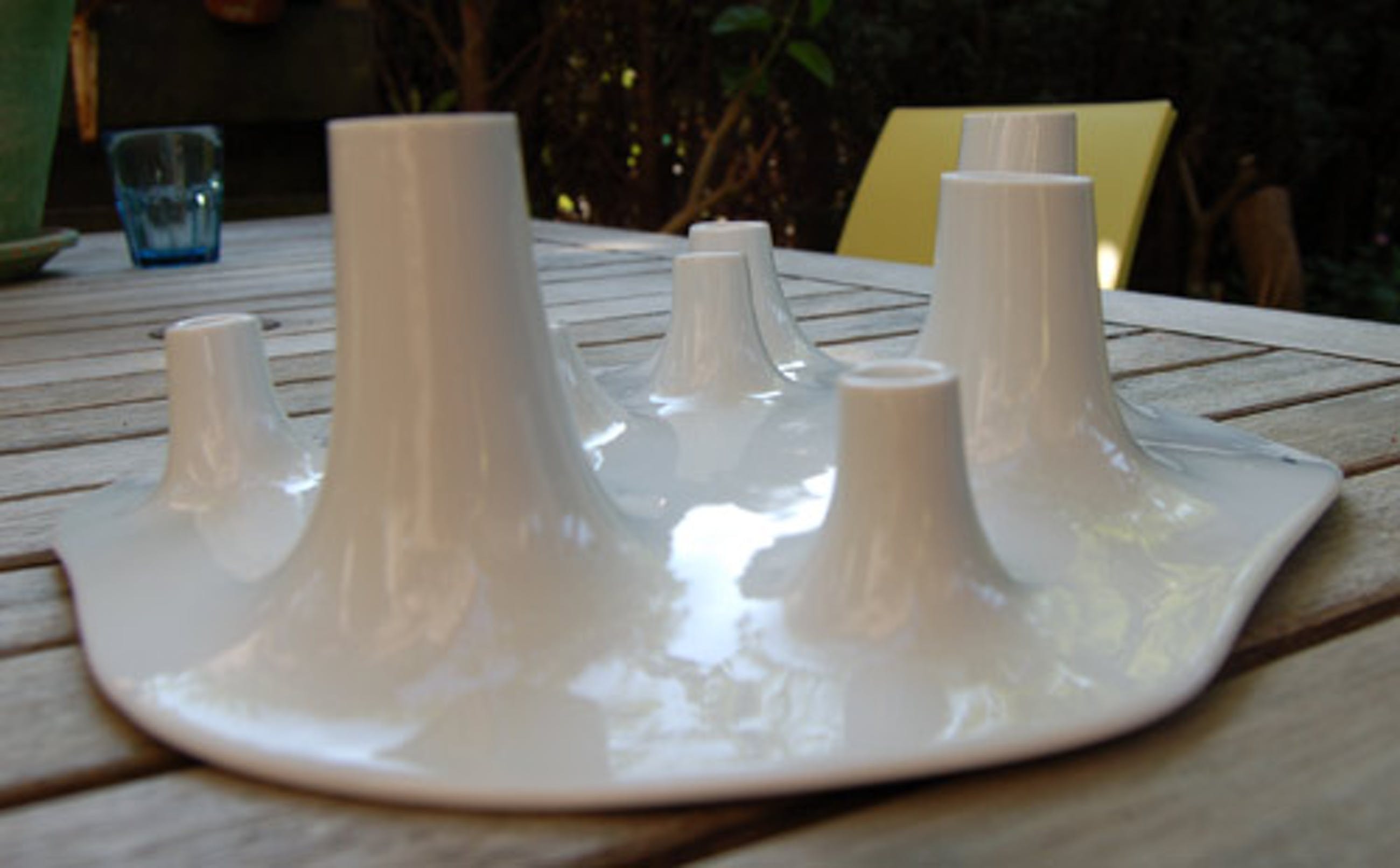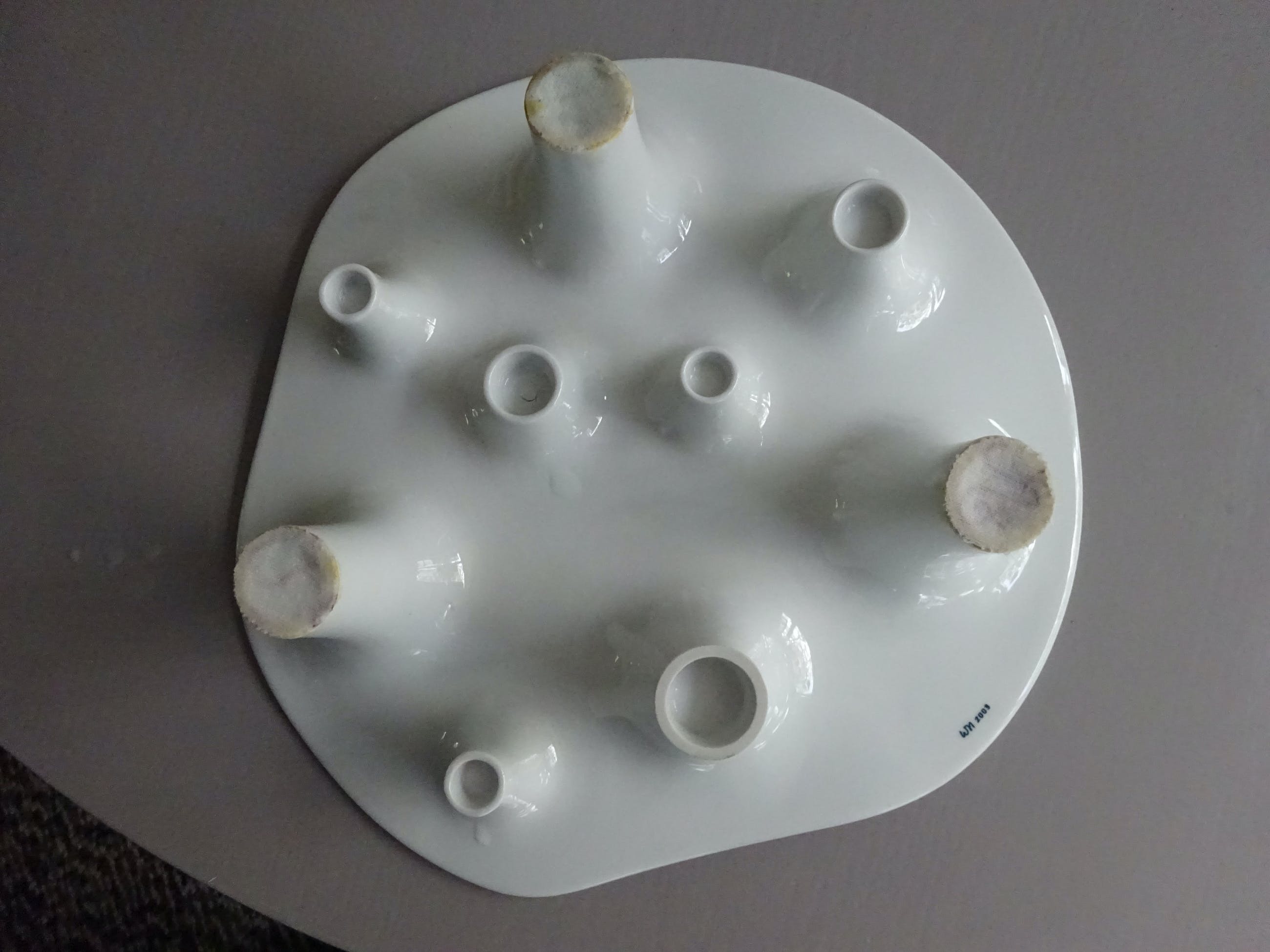 Kandelaar en fruitschaal Materiaal: wit porselein Ontwerp: Willem Noyons Utrecht Diameter 45 cm Jaar: 2003