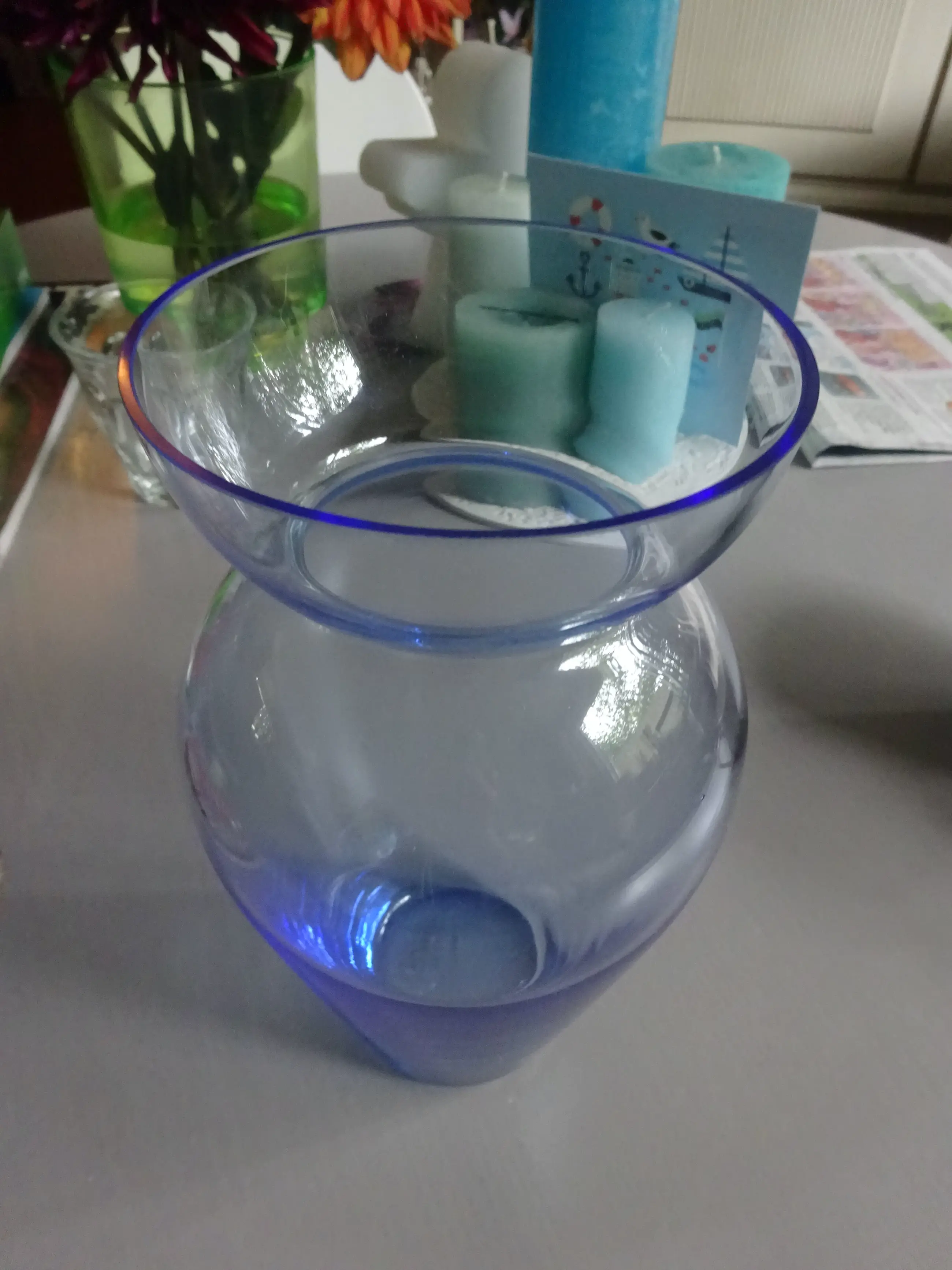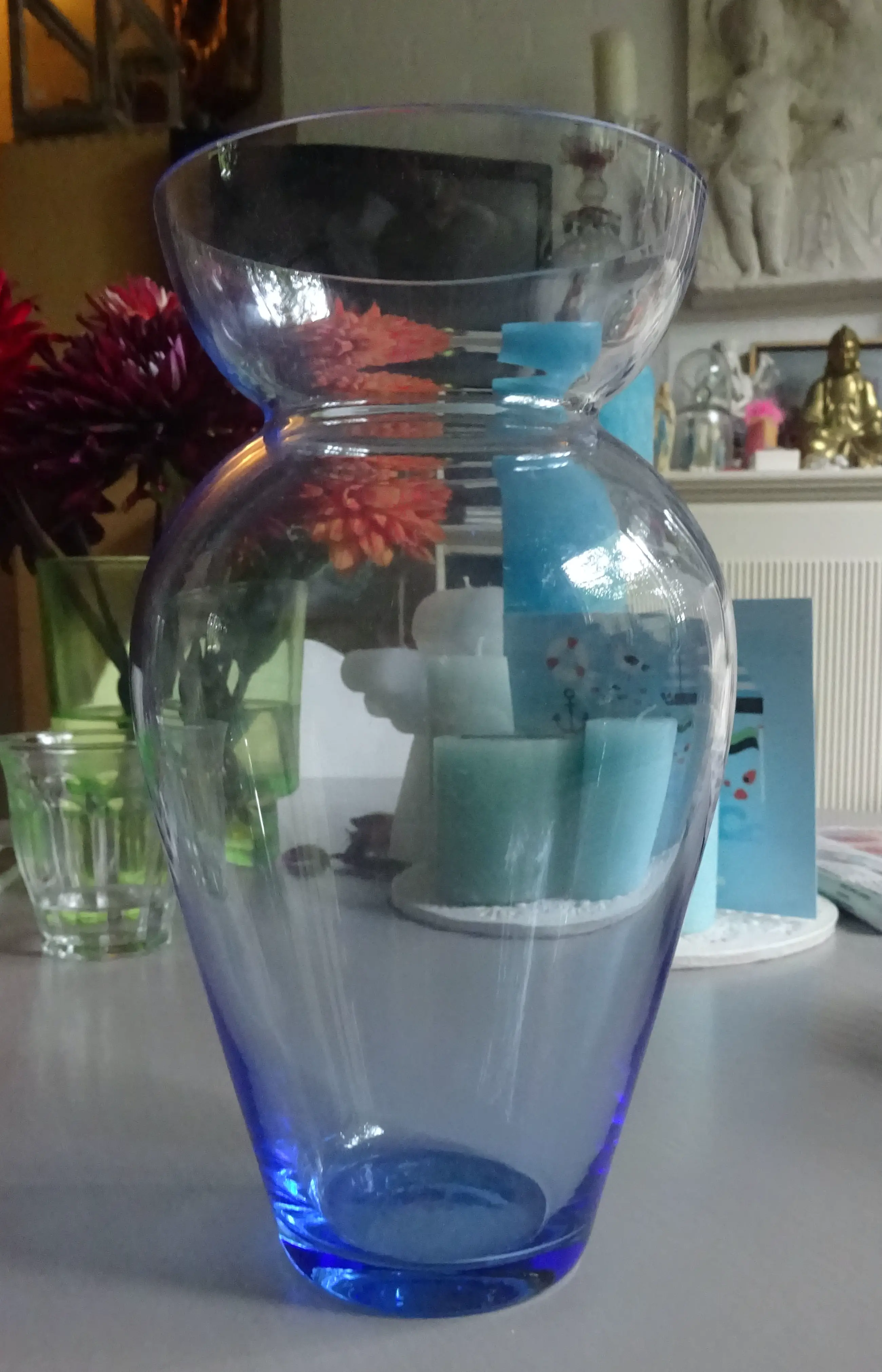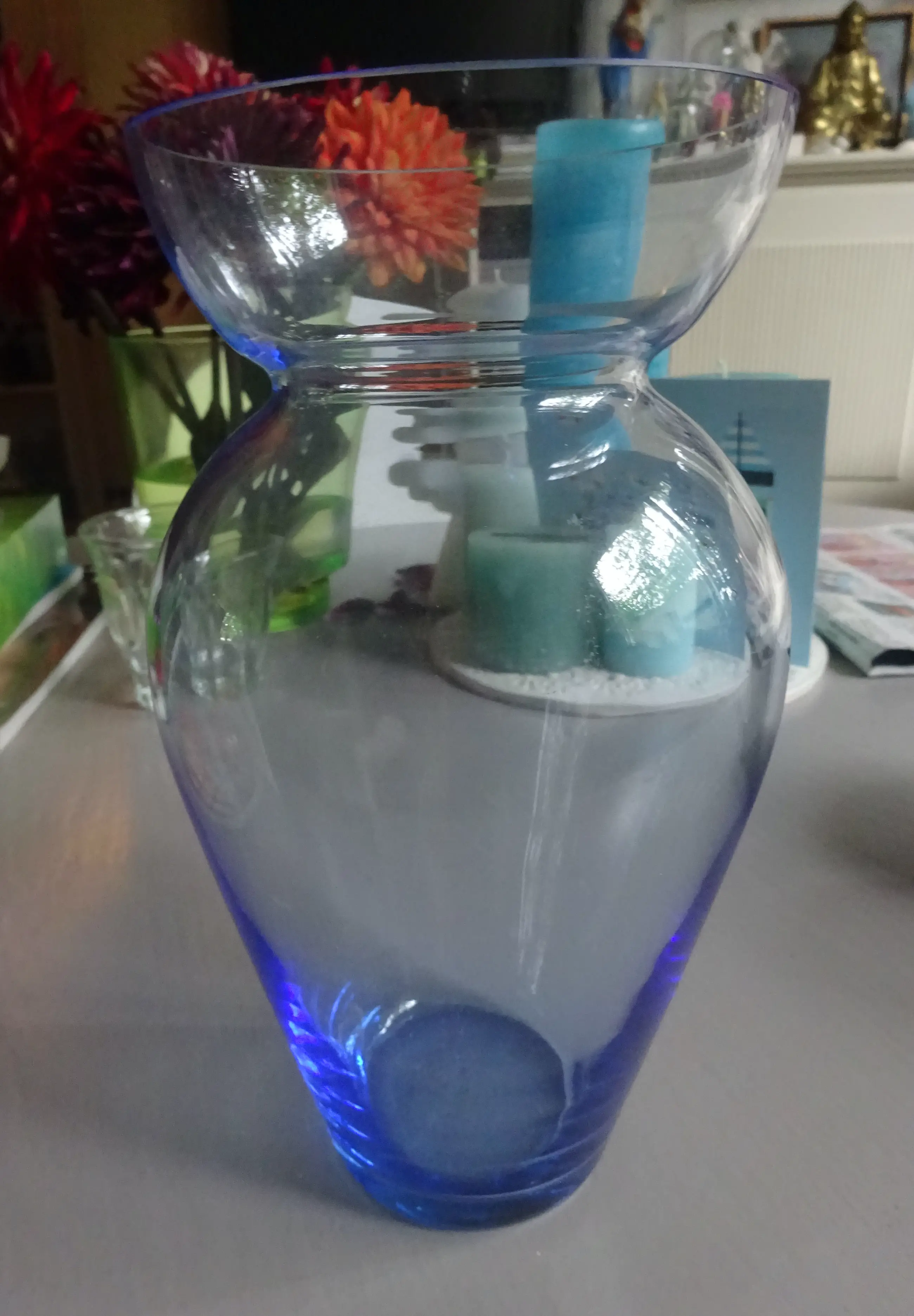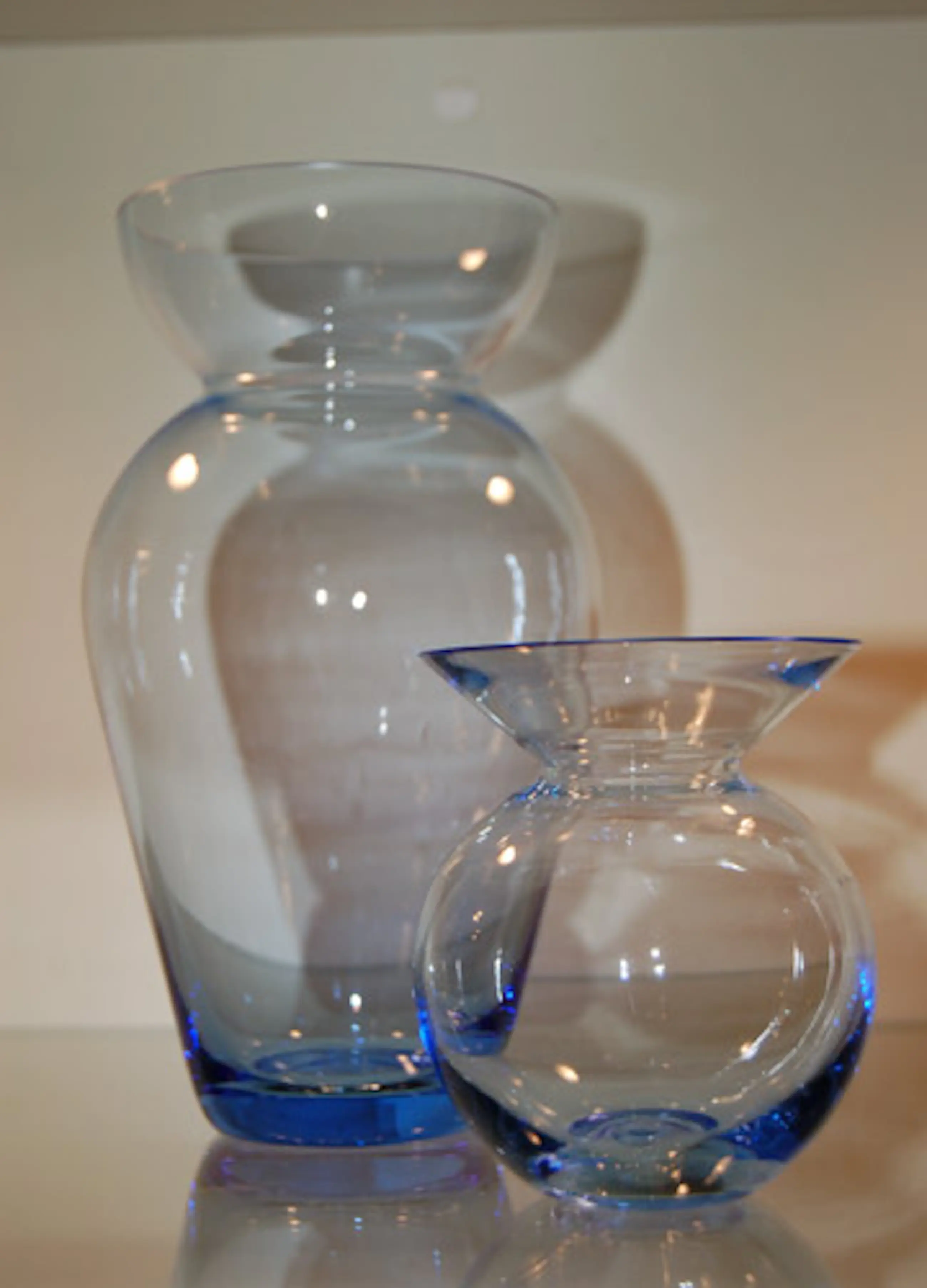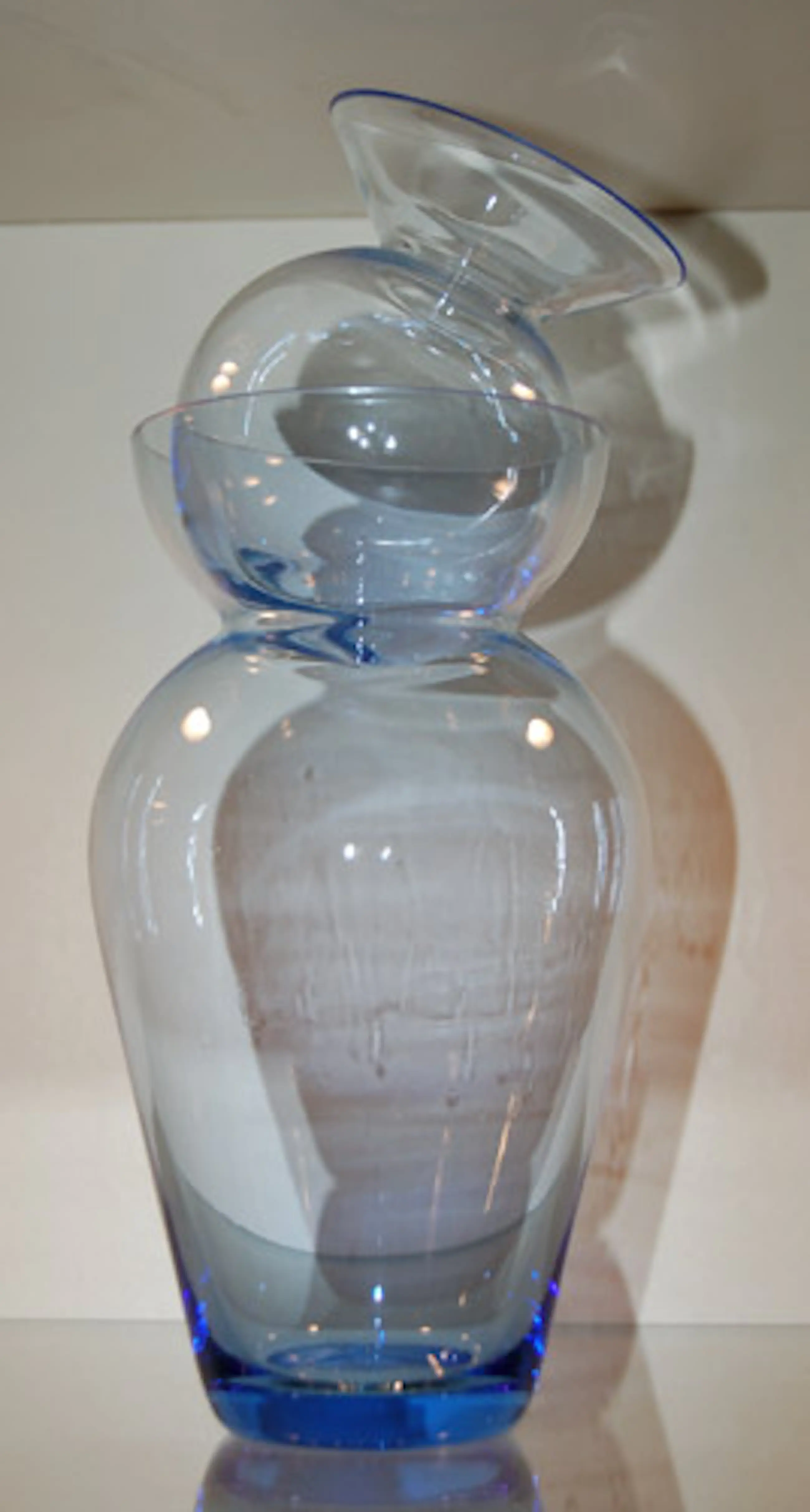 Dubbelvaas gemaakt door de Utrechtse glaskunstenaar Willem Noyons als eindejaarsgeschenk voor het UMC, Utrechts Medisch Centrum Jaar: 2000 Kleur: helder koningsblauw Gesigneerd: aan onderzijde- WN. Hoogte grote vaas: 20 cm Kleine vaas: 11 cm Serie: gladde uitvoering Conditie: gaaf