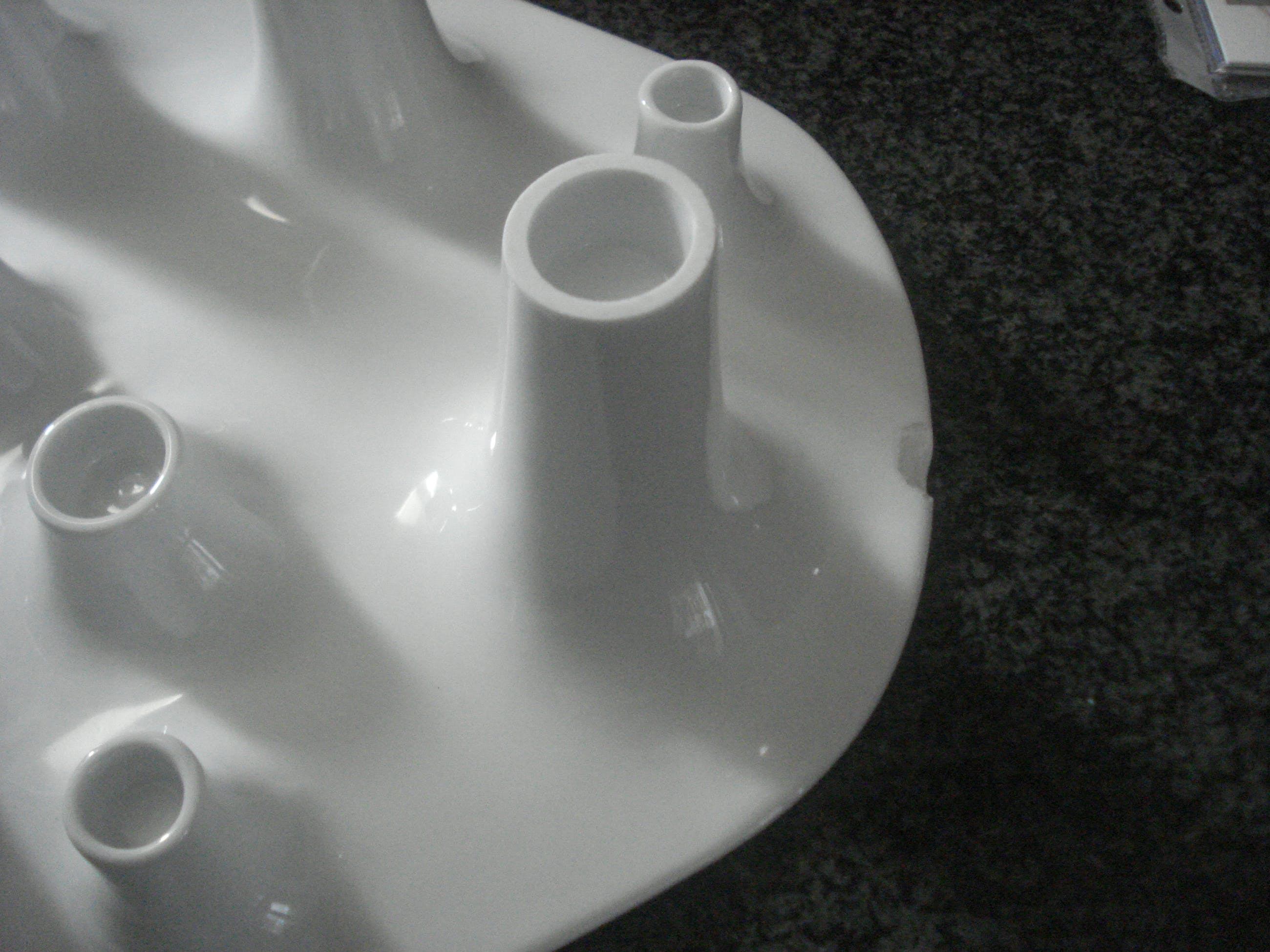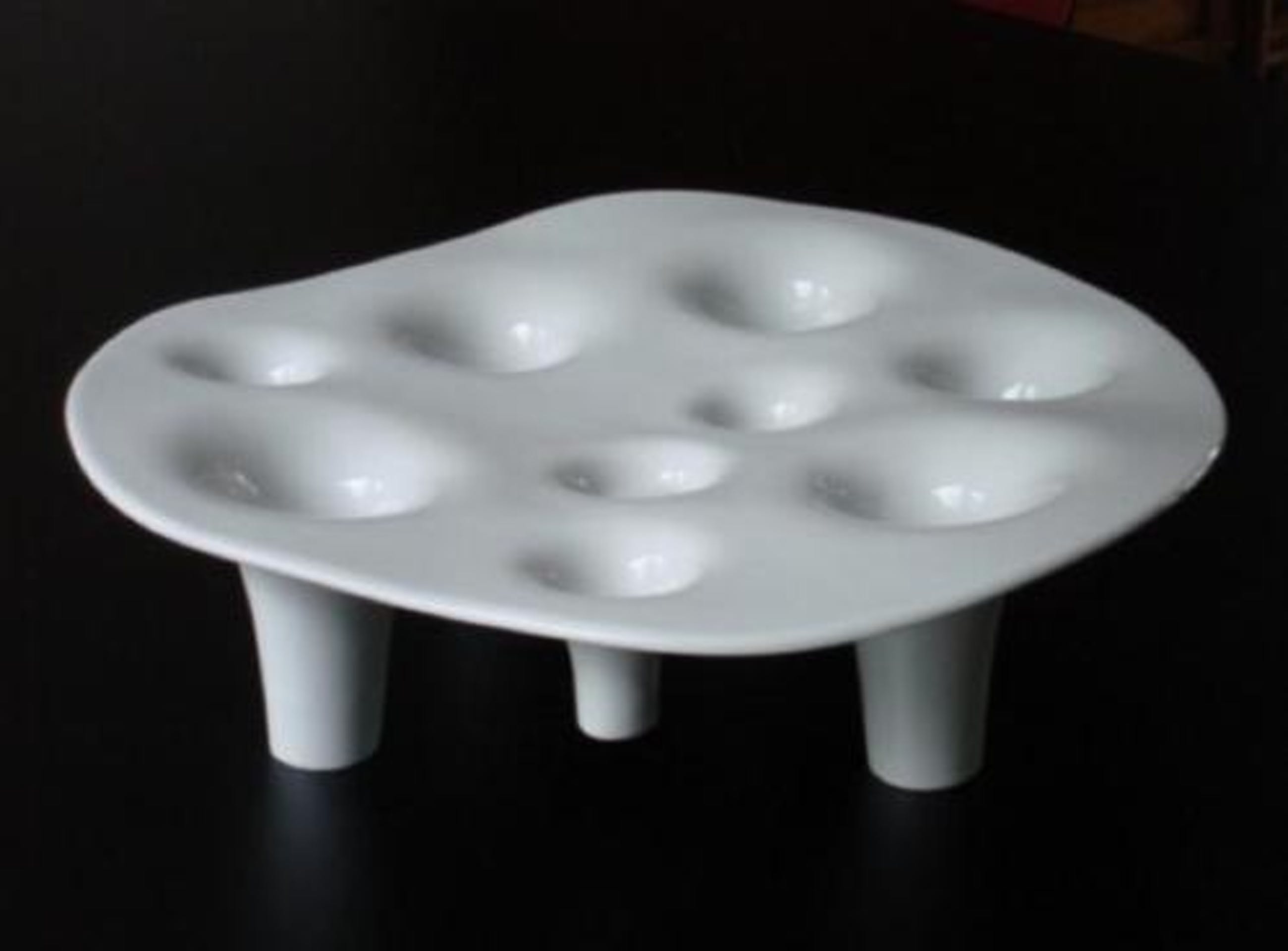 Uitstekend vormgegeven fruitschaal en kandelaar door kunstenaar en designer Willem Noyons Aan de ene kant een fruitschaal en aan de andere kant een kandelaar, met plaats voor maar liefst 9 kaarsen in verschillende maten. Dit ontwerp is van porselein en gesigneerd WN2003. Diameter ca 31 cm. Hoogte 9 cm. Chip aan rand onderkant, verder in orde