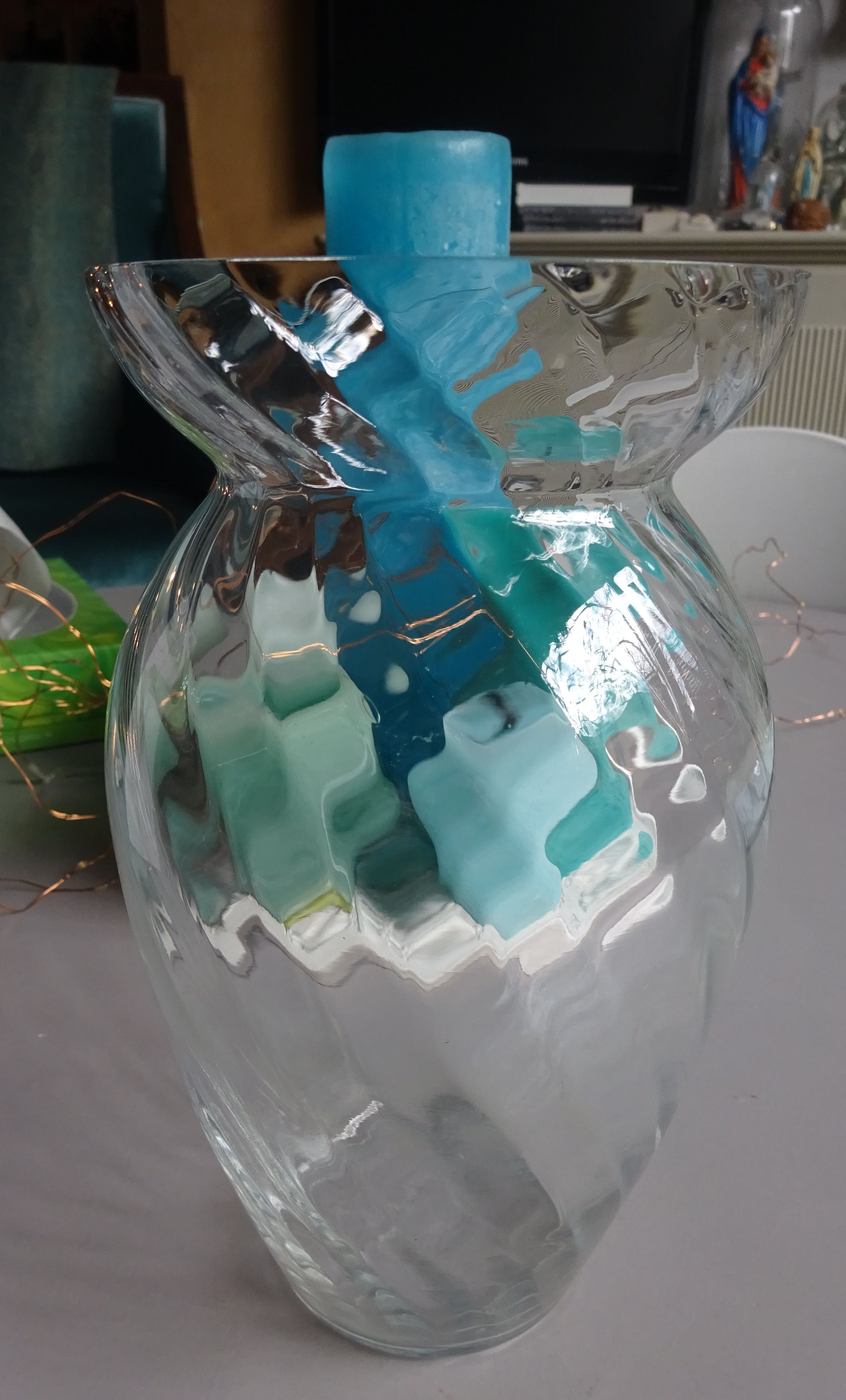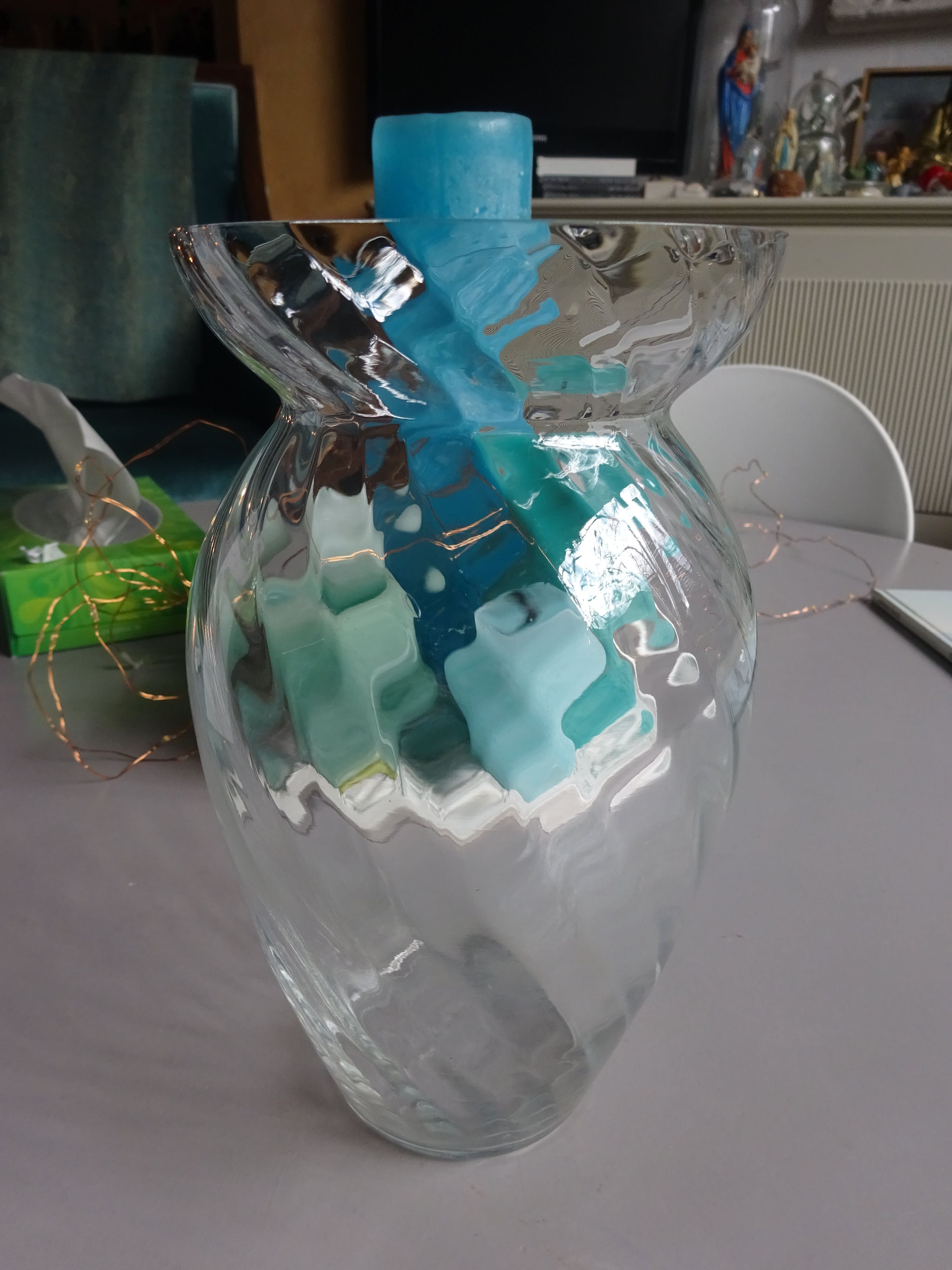 Dubbelvaas gemaakt door de Utrechtse glaskunstenaar Willem Noyons als eindejaarsgeschenk voor het UMC, Utrechts Medisch Centrum Jaar: 2000 Kleur: helder glas met ribbel Hoogte vaas: 20 cm Conditie: gaaf