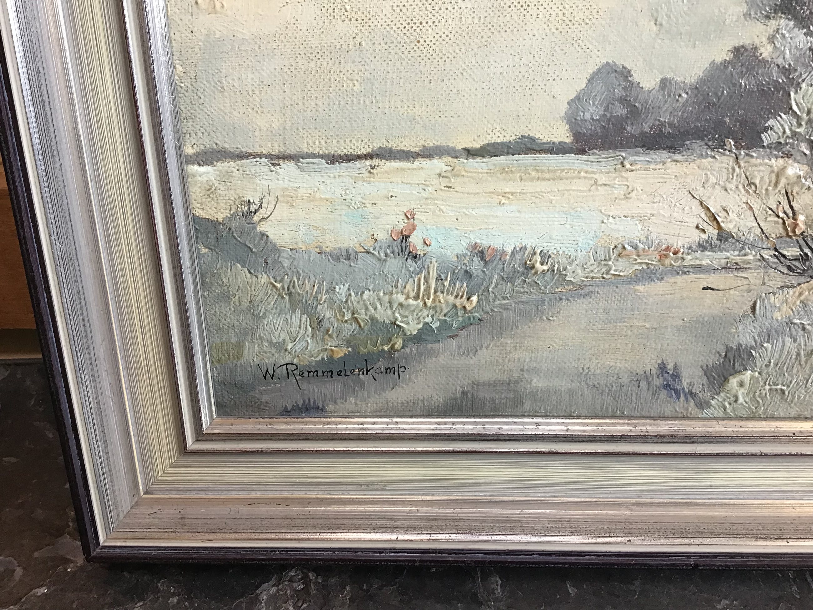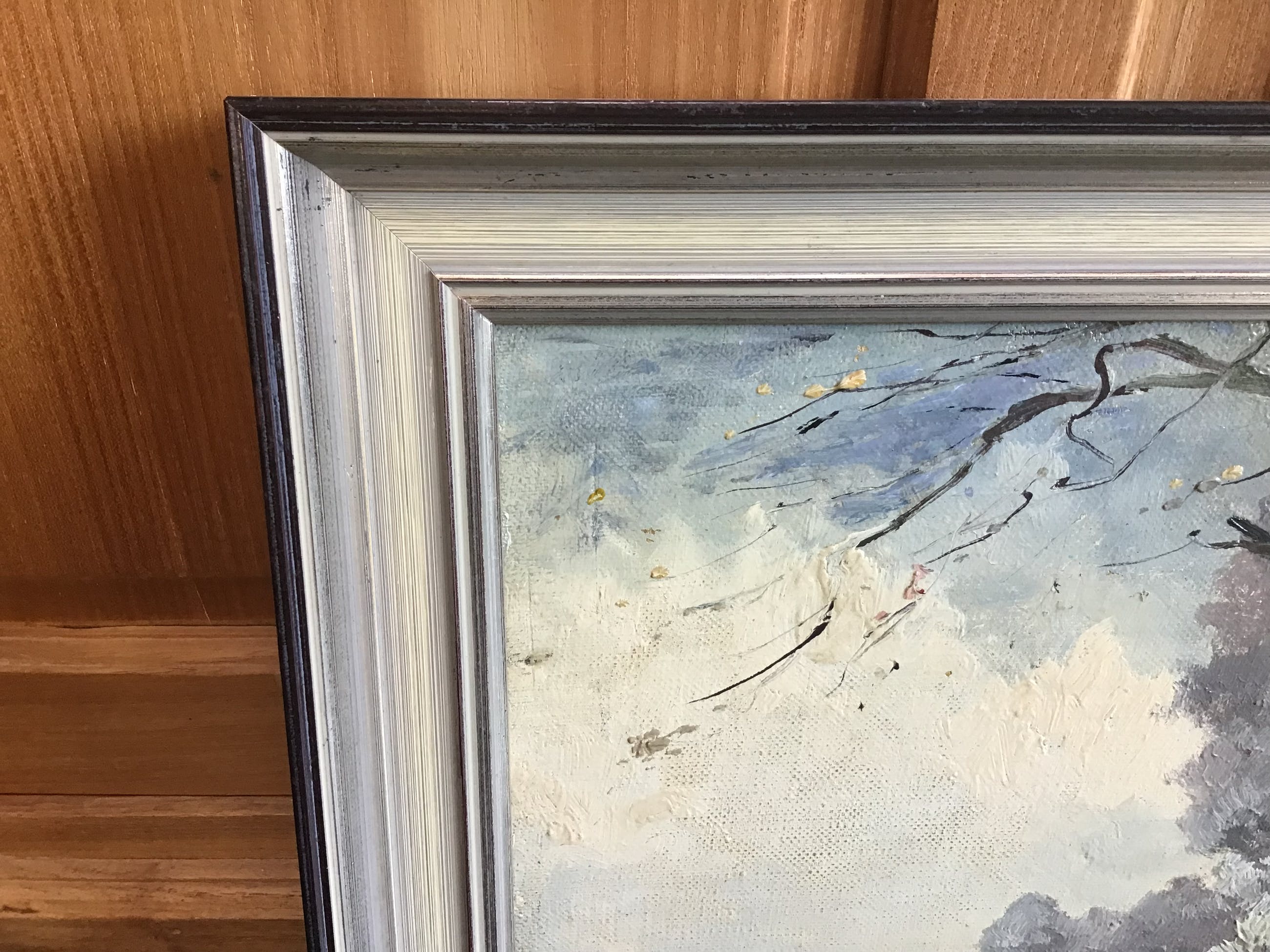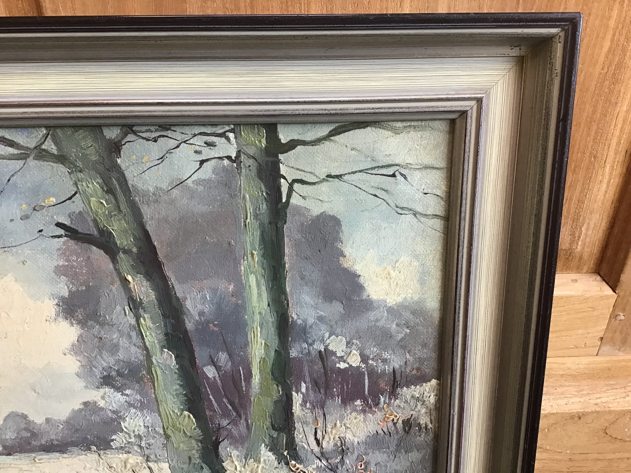 Geen zichtbare beschadigingen aan het doek. Lijst is keurig maar er zijn een paar hoekpuntjes bijgekleurd.