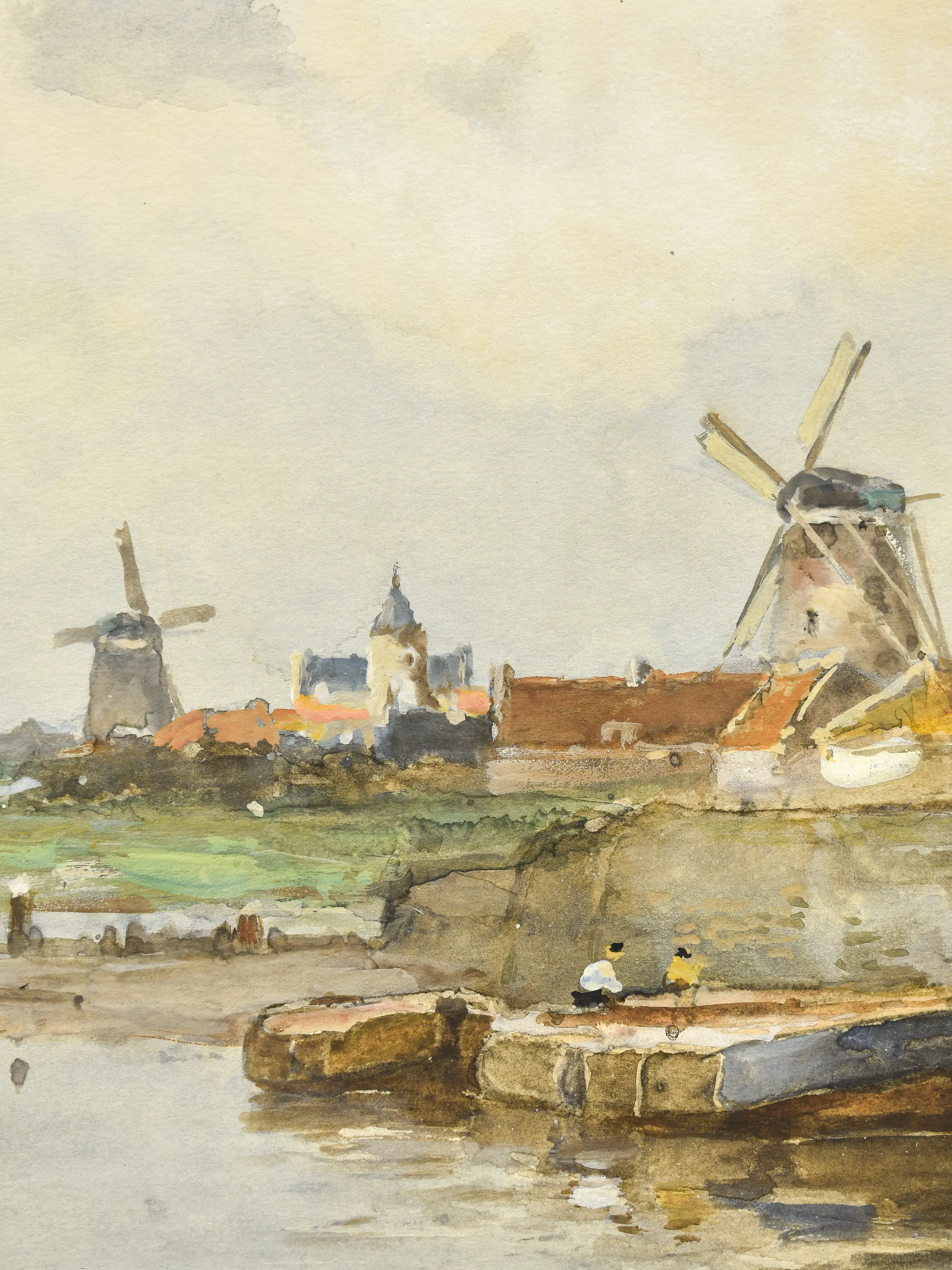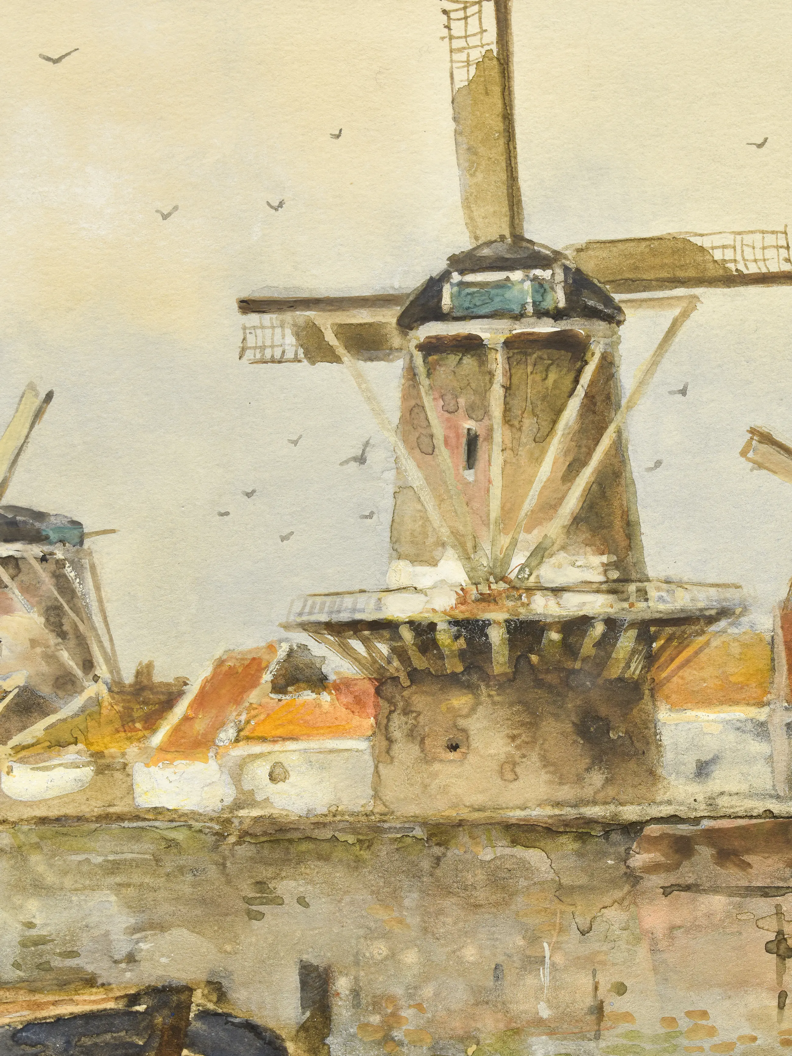 Het aangeboden werk laat een fraai dorpsgezicht met molens aan de Oude Maas in Noord-Brabant zien, in prachtige kleuren en compositie. Een juweel voor het oog!