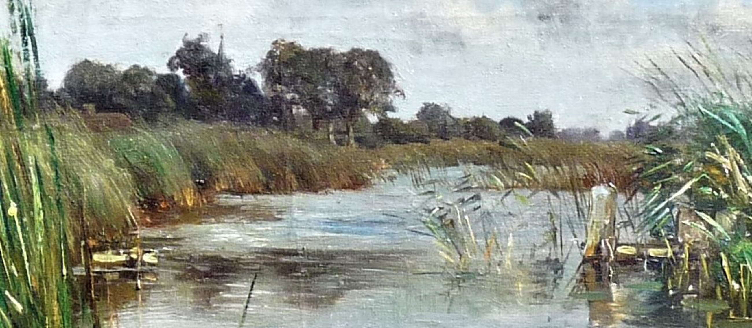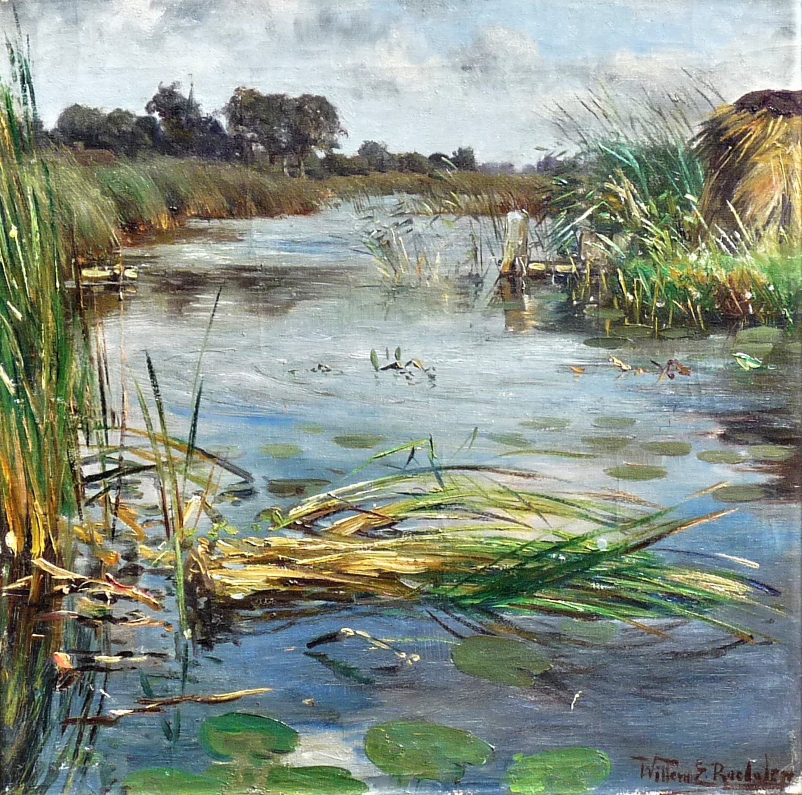 Fraai werk van bekend Nederlands kunstenaar Willem Roelofs jr. , met een zeer herkenbare voorstelling uit zijn oeuvre van gezicht op water met riet e.d. Zeer vaardig en vlot geschilderd.