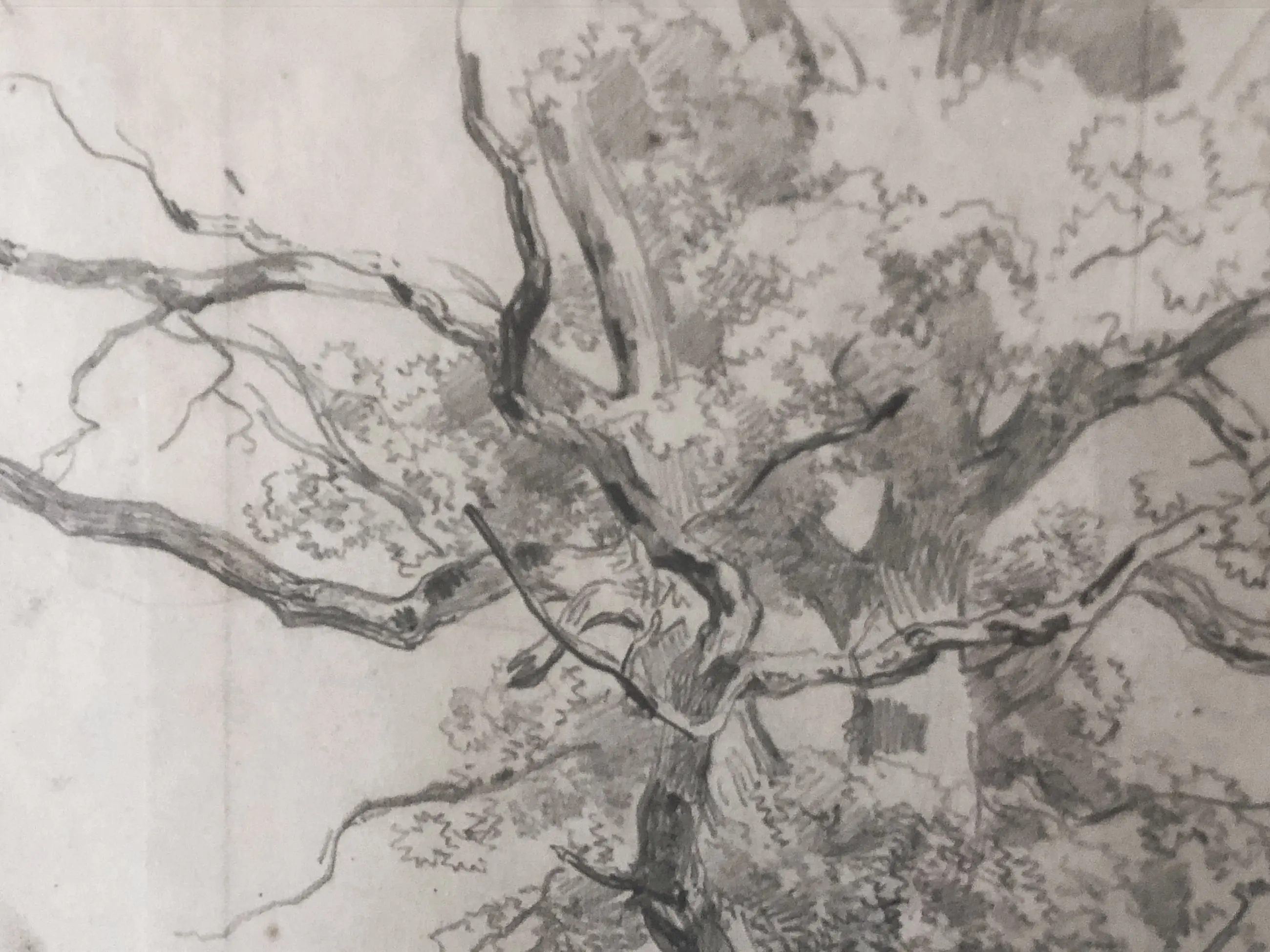 Potlood op papier 33 x 45,5 cm, recent zeer fraai gelijst met zuurvrij passe-partout. De lijst meet 47x50x2,5 cm. Herkomst veiling Sotheby’s Amsterdam 19-11-2002 The Roelofs Collection. Uit de nalatenschap van zoon Albert Roelofs zijn op die veiling vele werken van Willem Roelofs en ook enige werken van Albert Roelofs geveild. Alle toeschrijvingen zijn gedaan in overleg met de erven Roelofs en de Rijksdienst voor Kunsthistorische Documentatie. Deze studie is voor Sotheby’s met zekerheid toegeschreven aan Willem Roelofs door de erven Roelofs en door de RKD. Tijdens zijn studiereis naar Frankrijk in 1848 maakte Roelofs vooral studies van bomen en boomgroepen in potlood, zwart krijt en zwarte/grijze inkt, slechts een enkele olieverfschets. Deze tekening is gedateerd “Cresles october 1848”. De tekening is in perfecte staat, papier op sommige plekken wat vlekkerig.