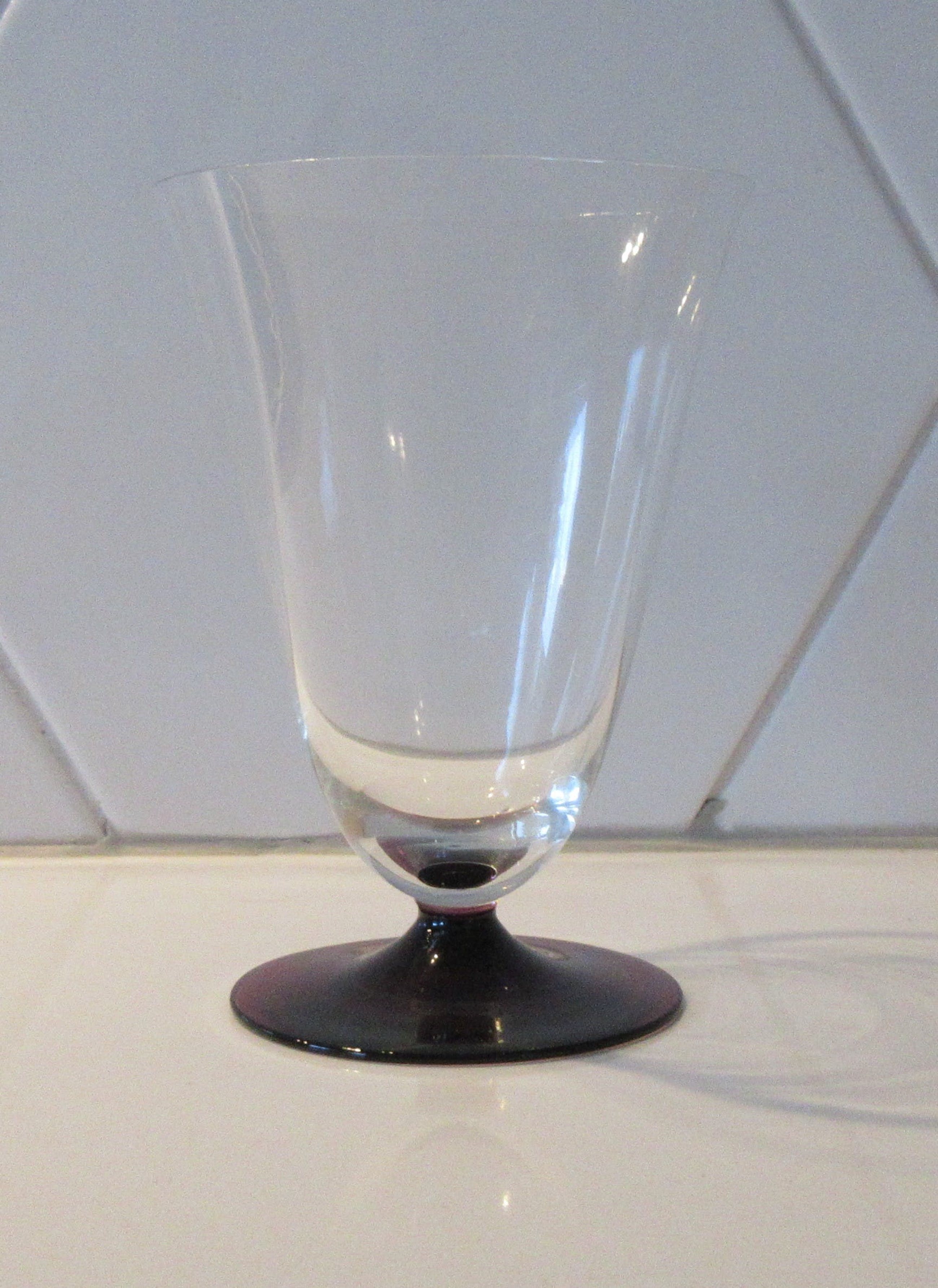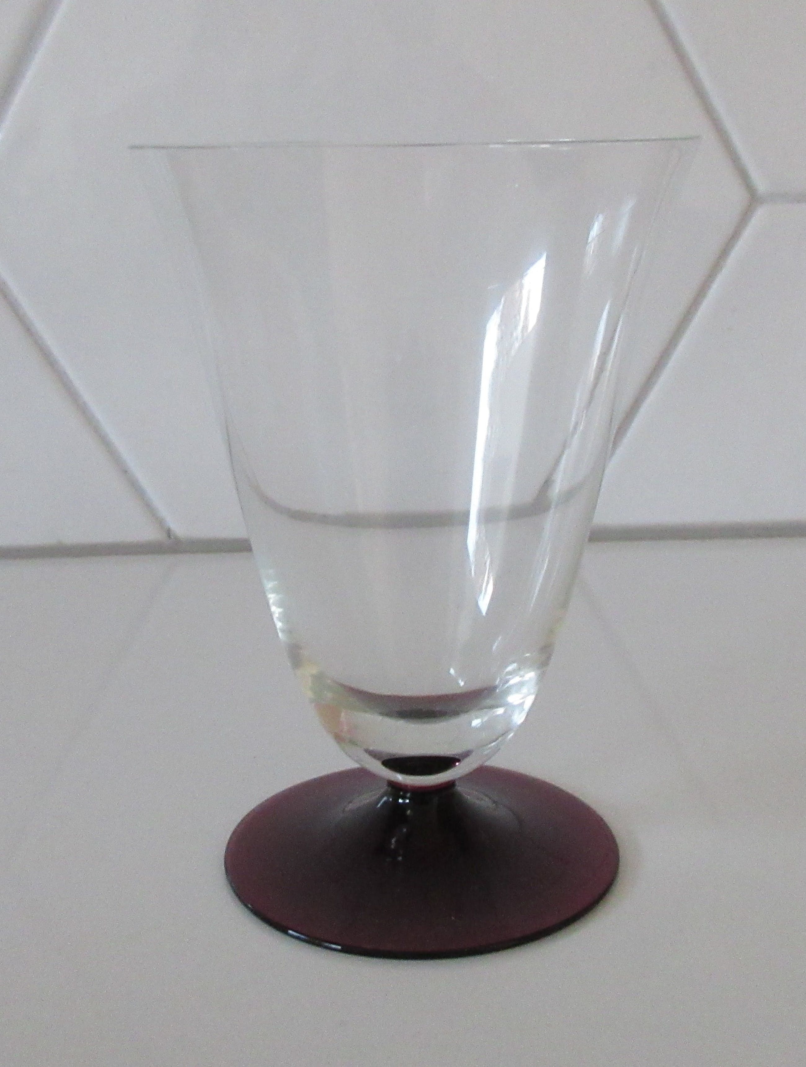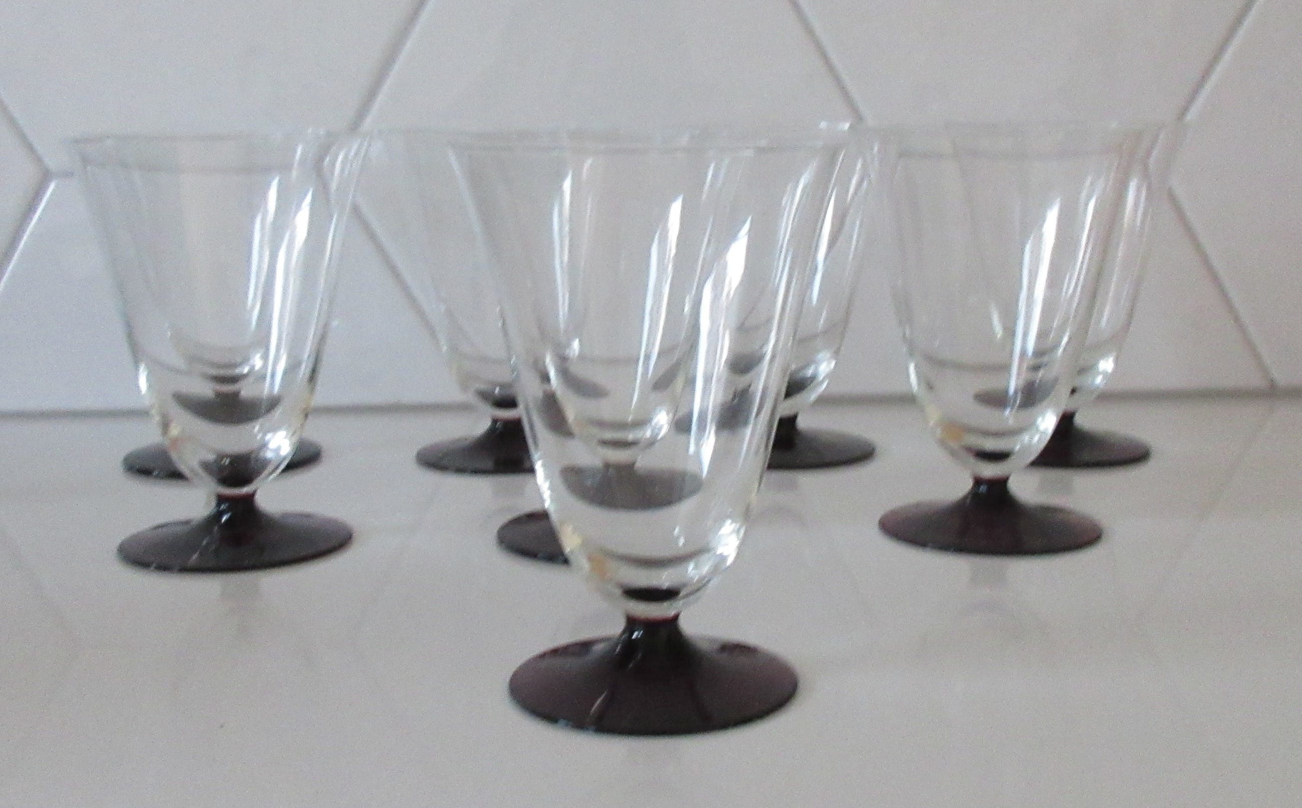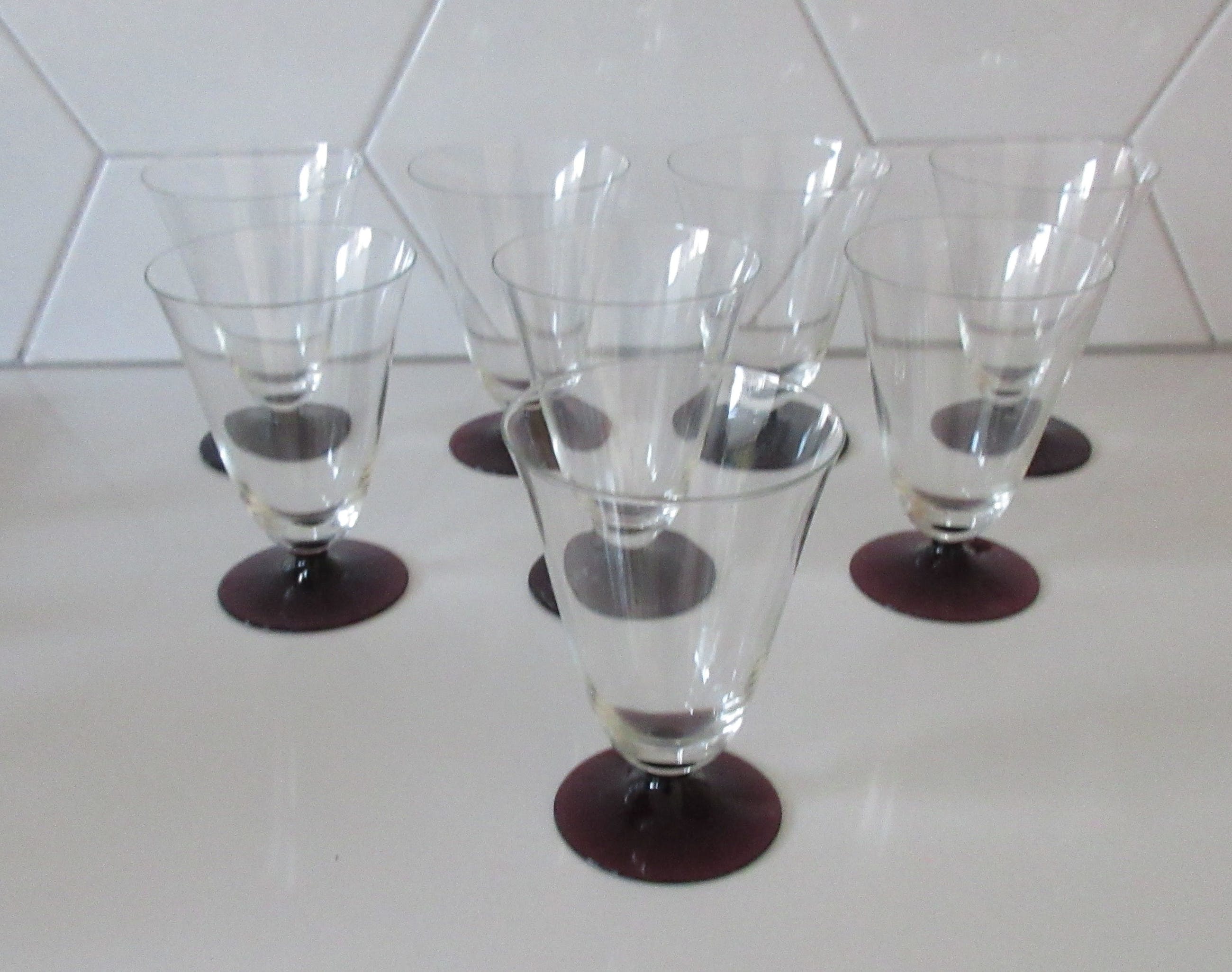 Acht bekers of kelken (klein model) servies Ajax met paarse voet. In prima conditie, een glas heeft een flinter op de bovenrand. Niet gemerkt.