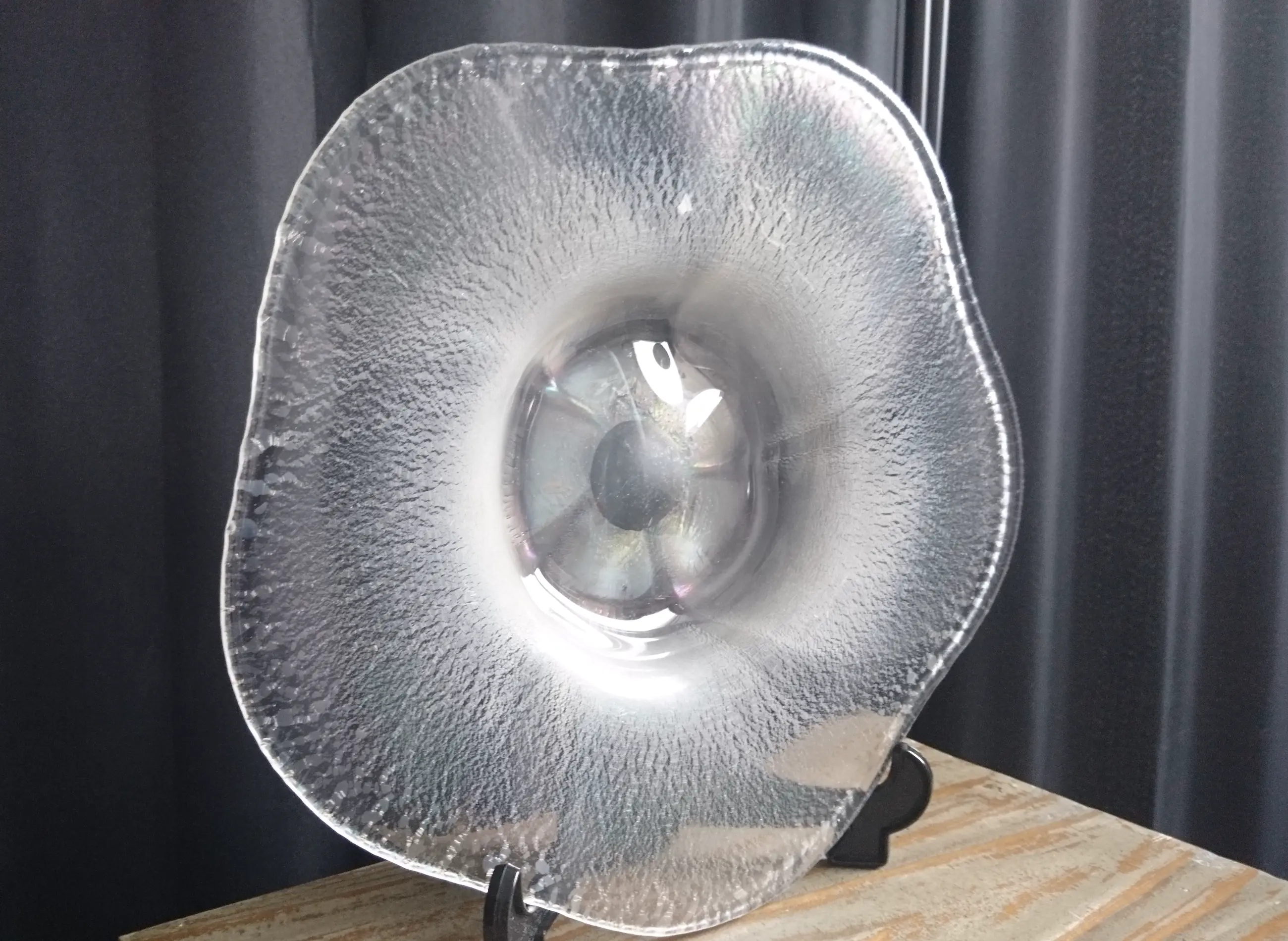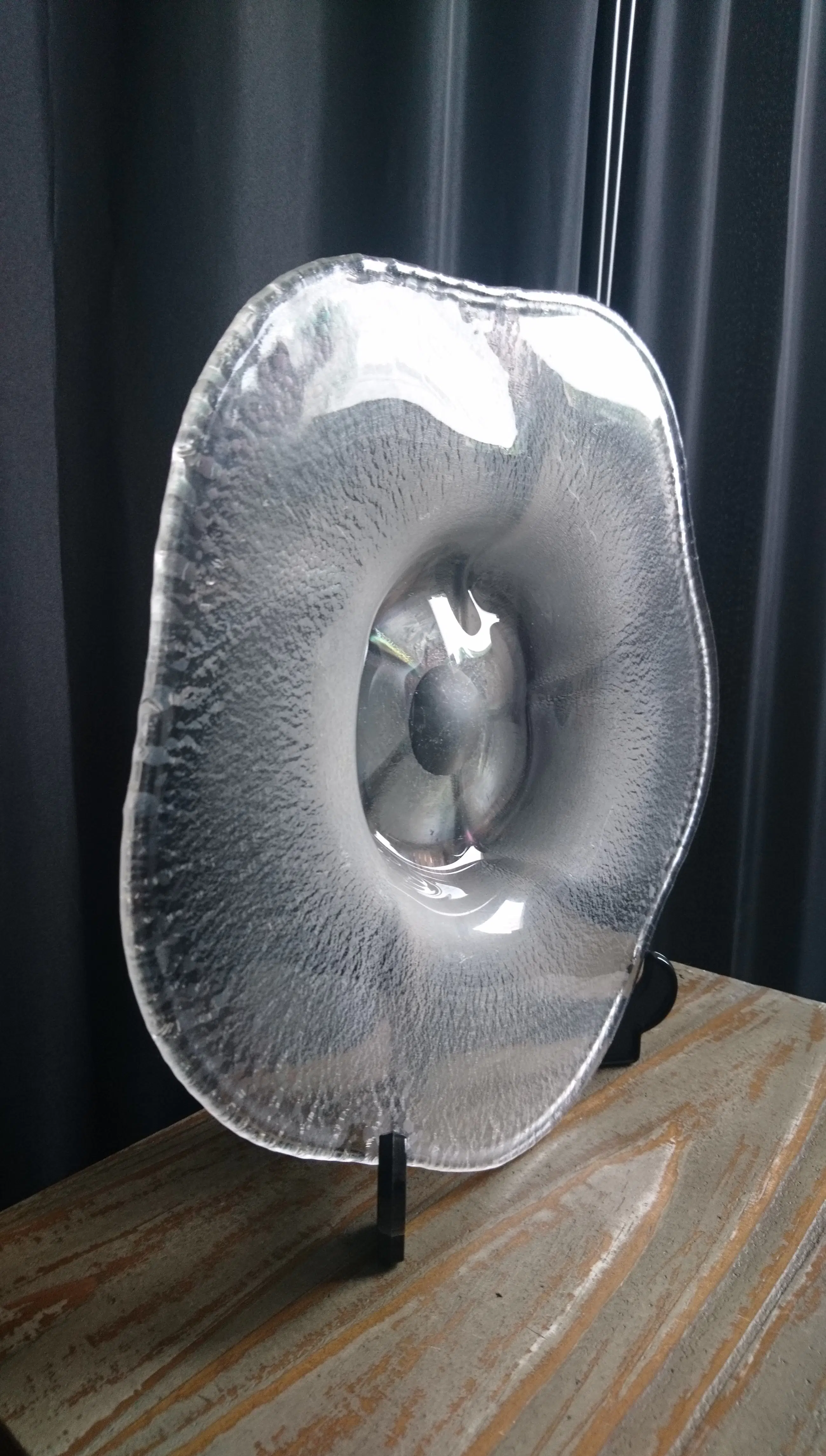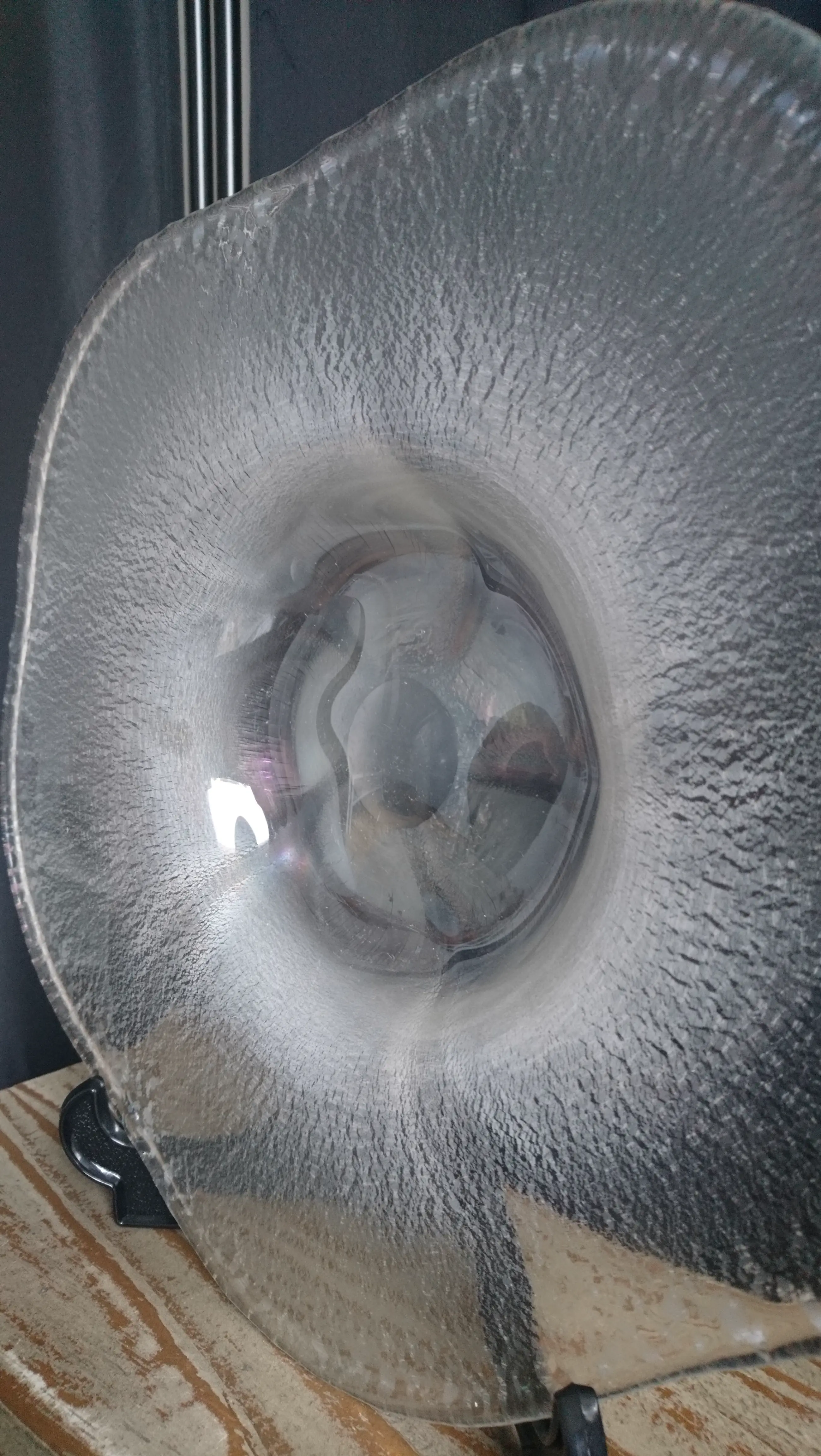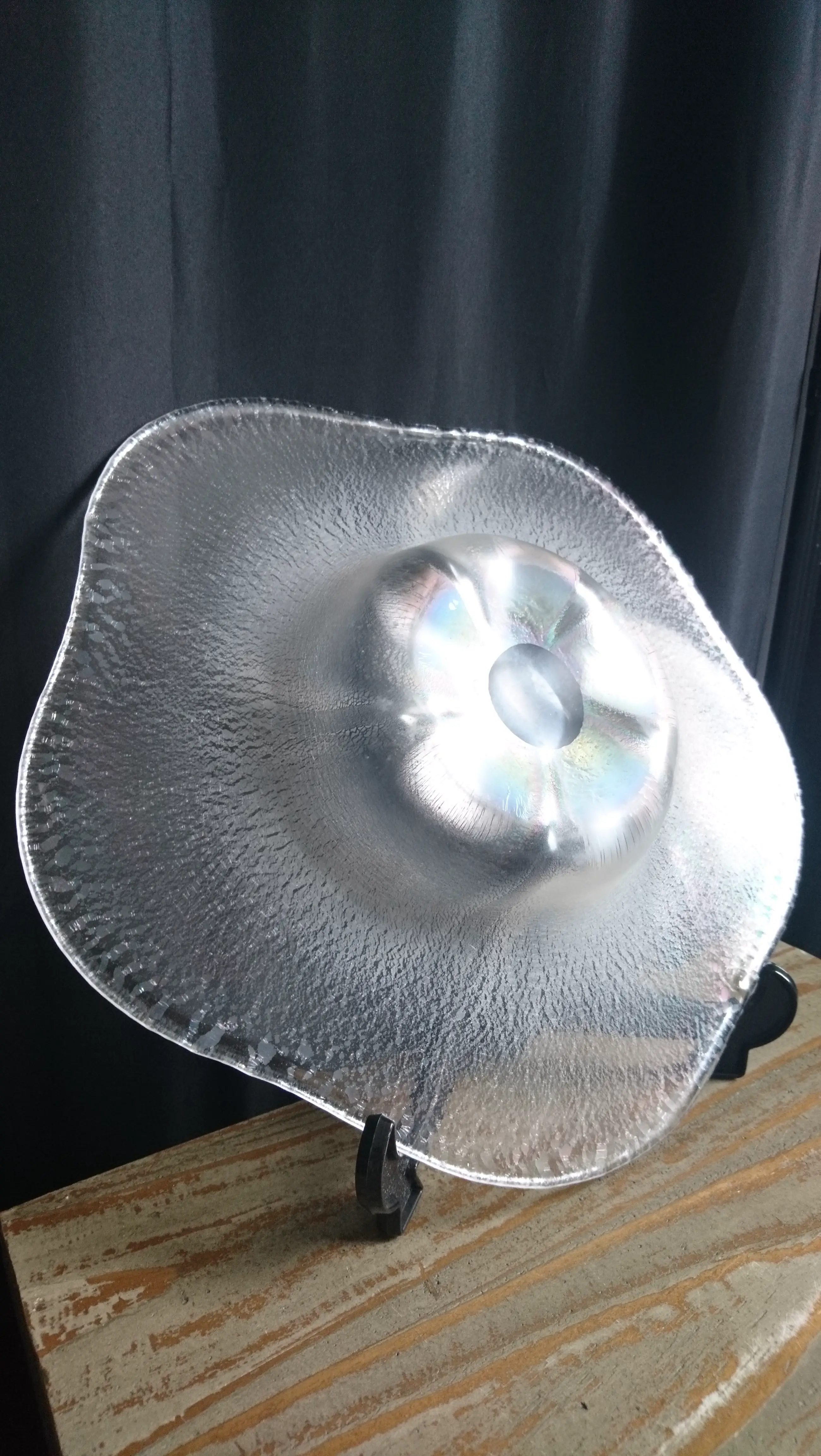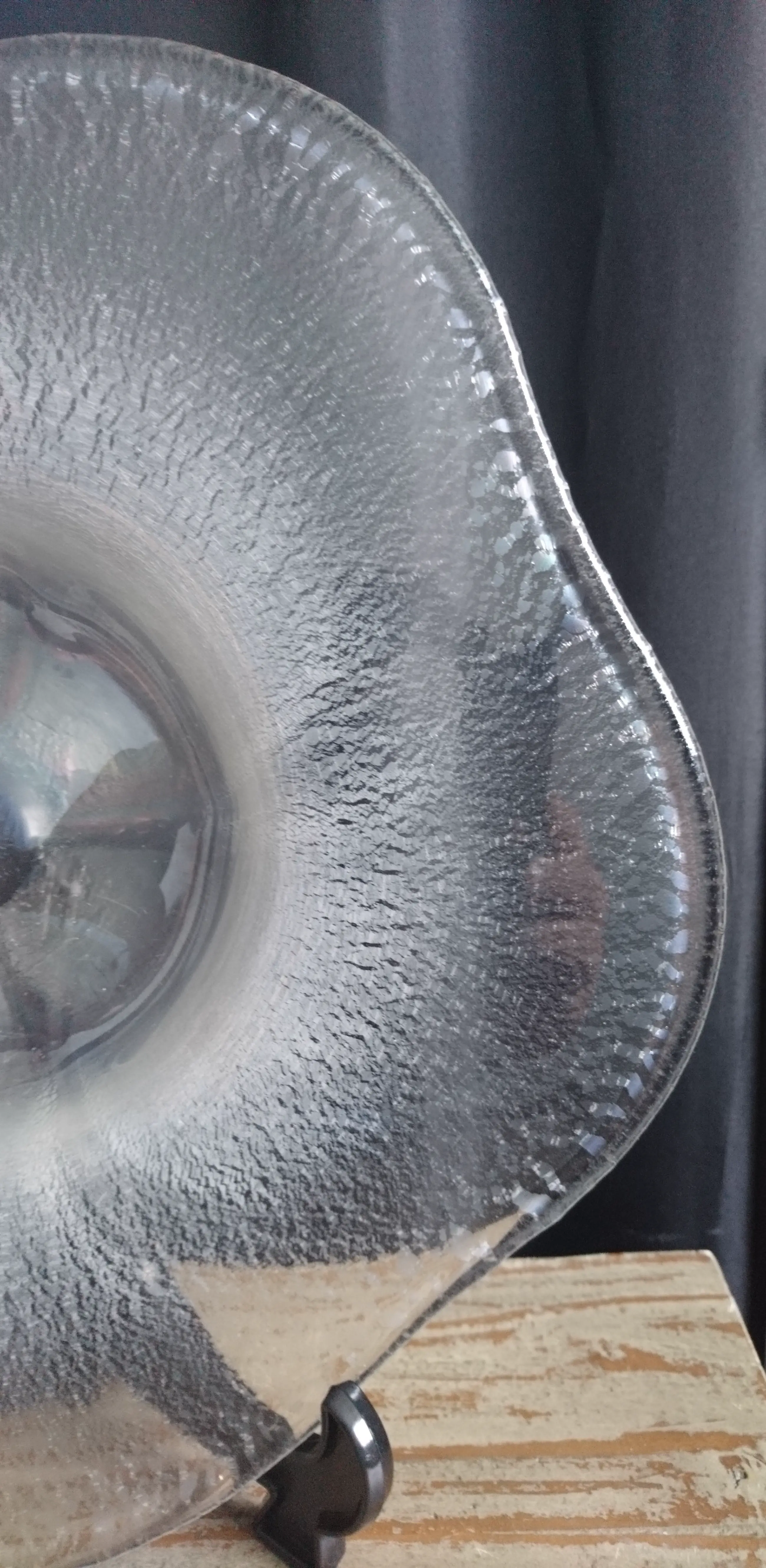 Helderglazen schaal met tincraquelé en luster "Coquille", ontwerp W.J.Rozendaal 1937, uitvoering Kristalunie Maastricht. Gezien de leeftijd in goede staat. Geen chips of breuk.