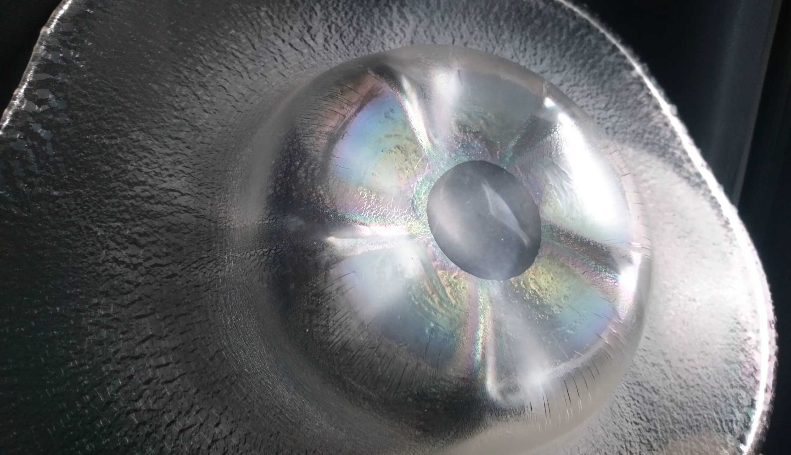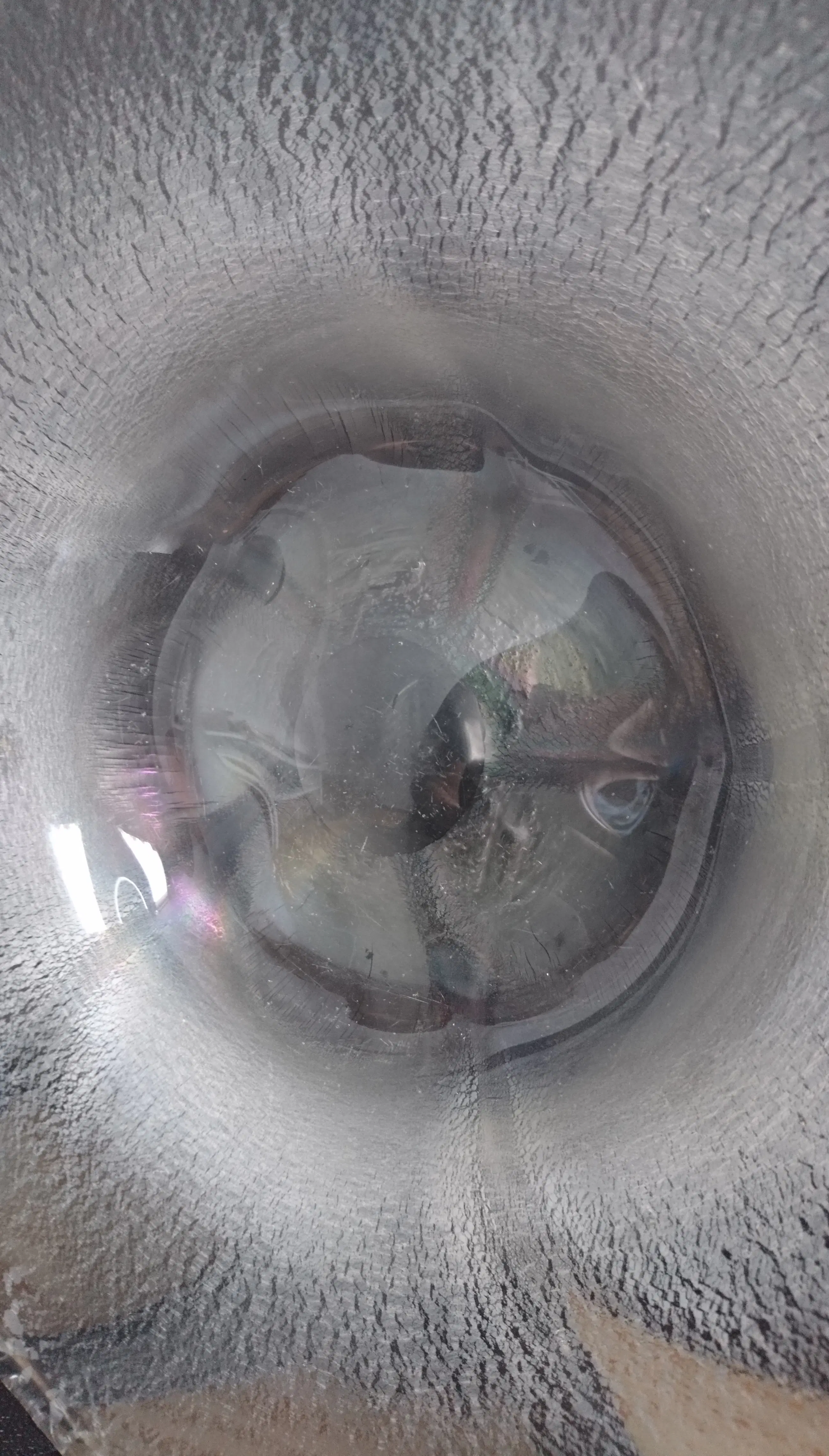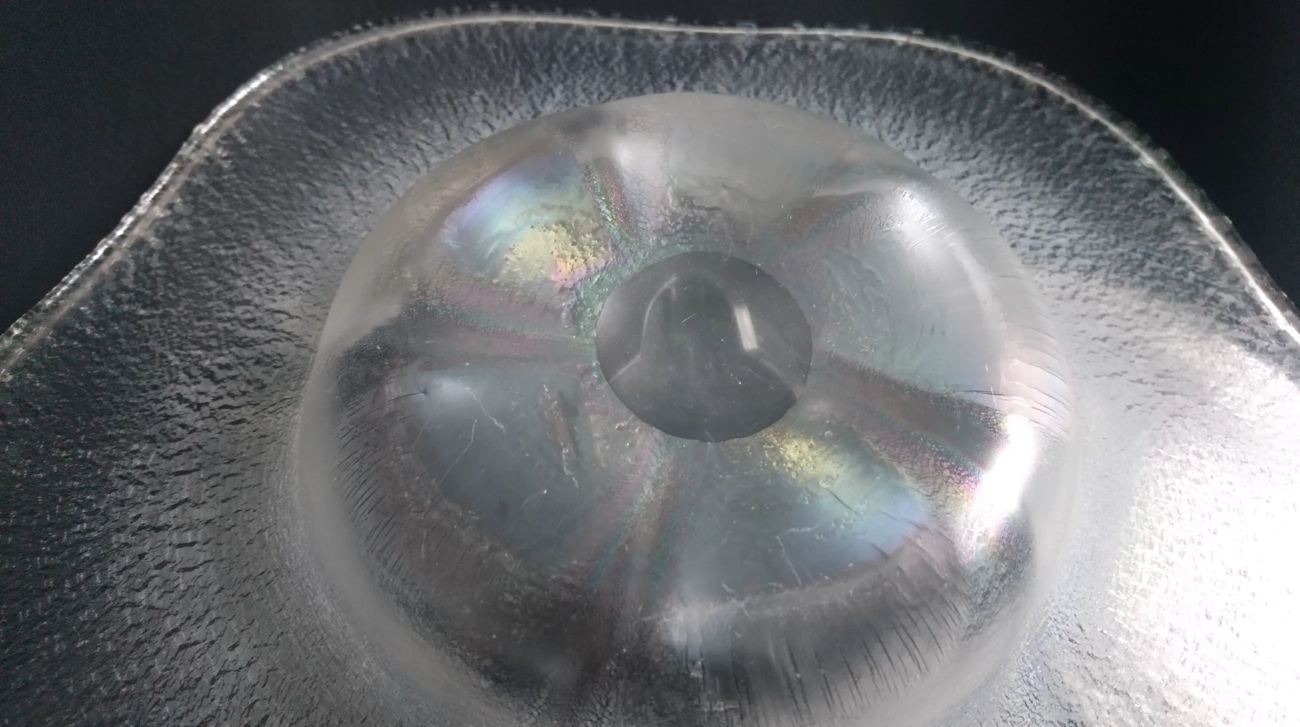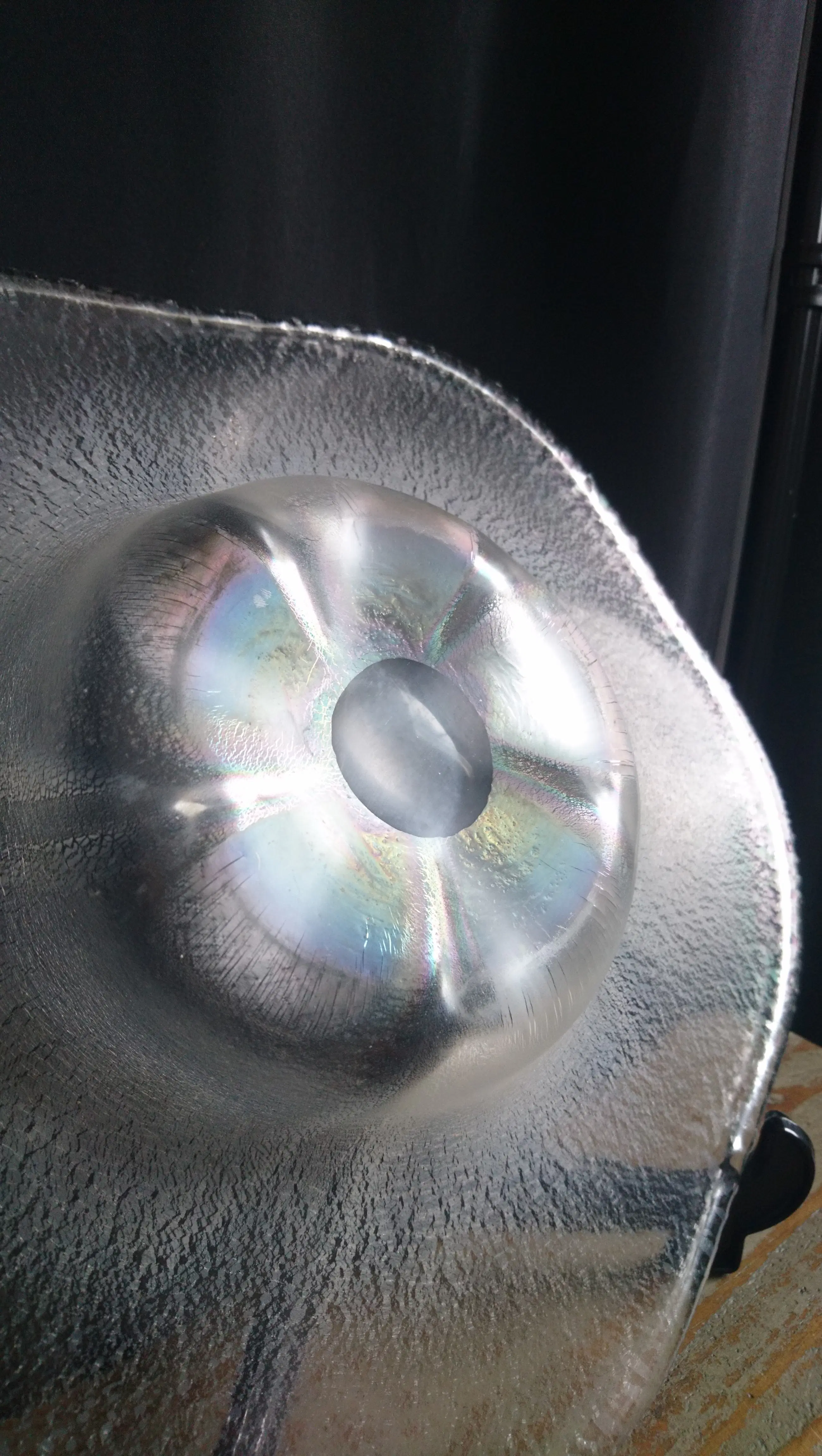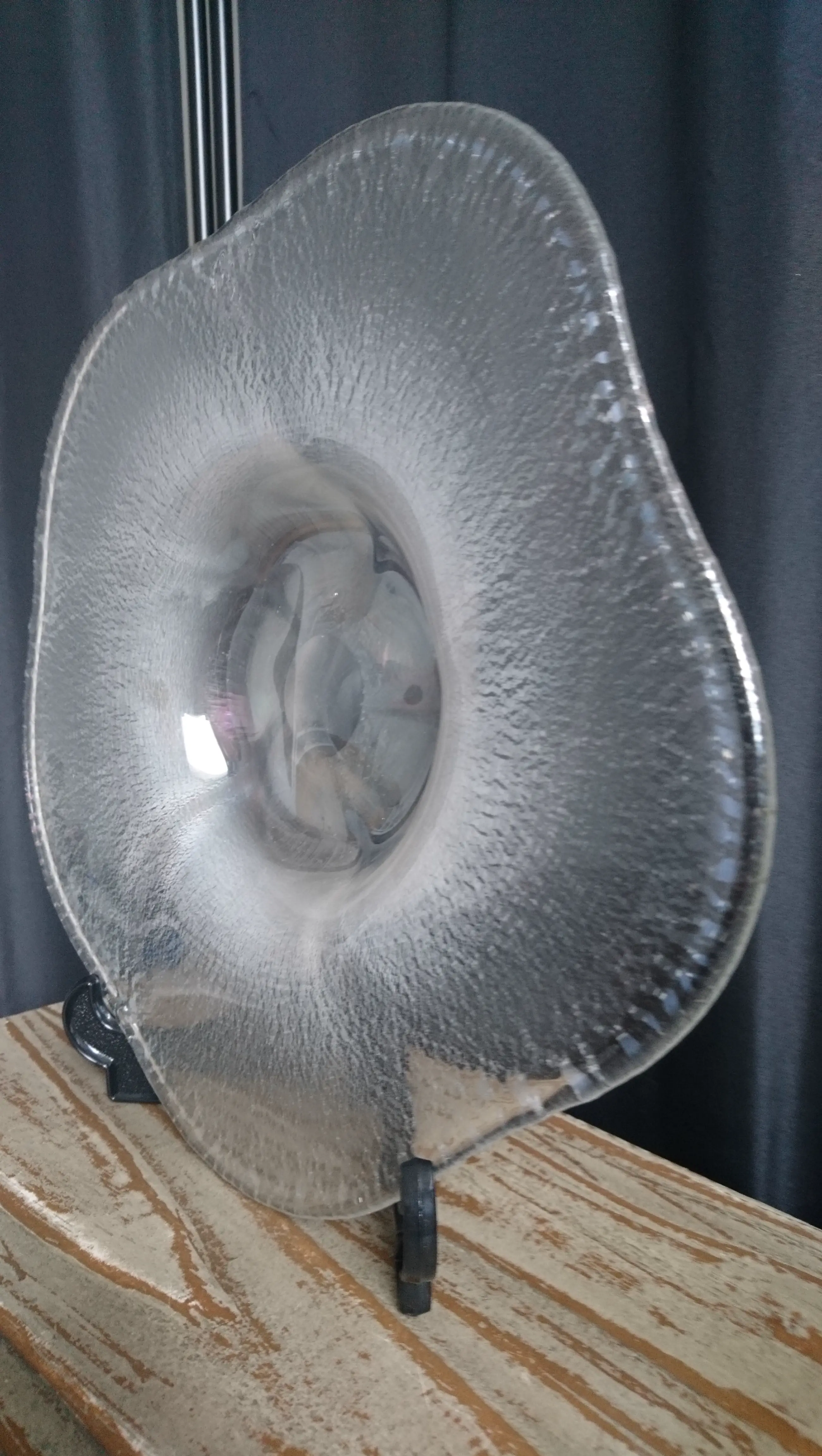 Helderglazen schaal met tincraquelé en luster "Coquille", ontwerp W.J.Rozendaal 1937, uitvoering Kristalunie Maastricht. Gezien de leeftijd in goede staat. Geen chips of breuk.