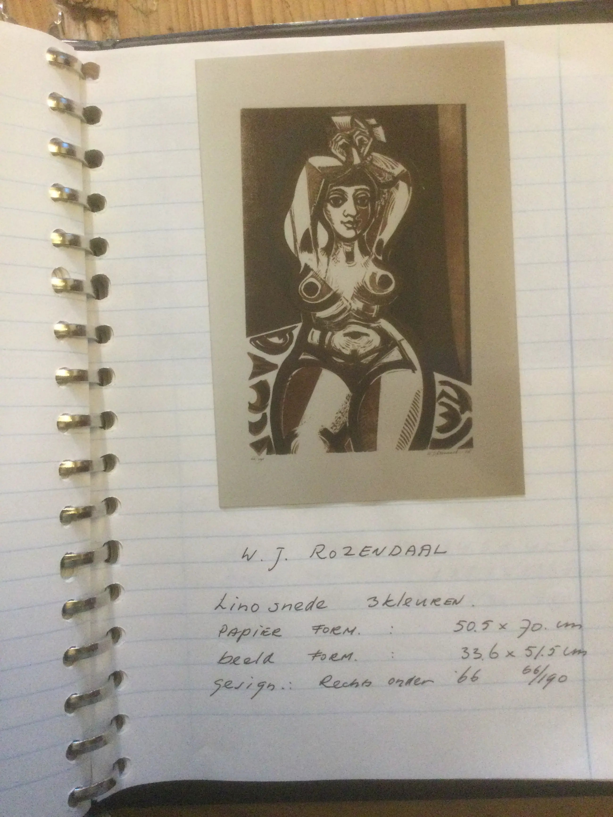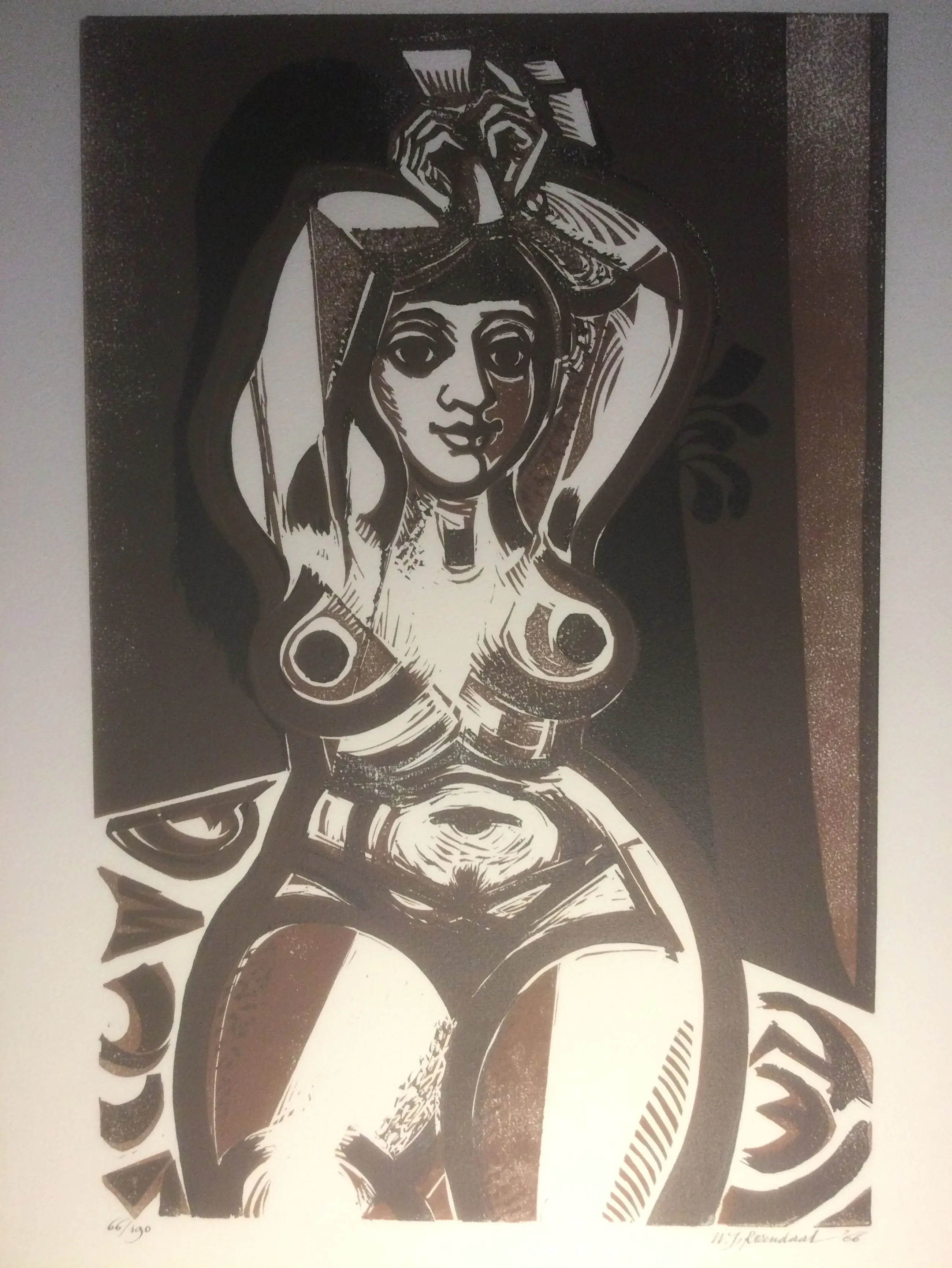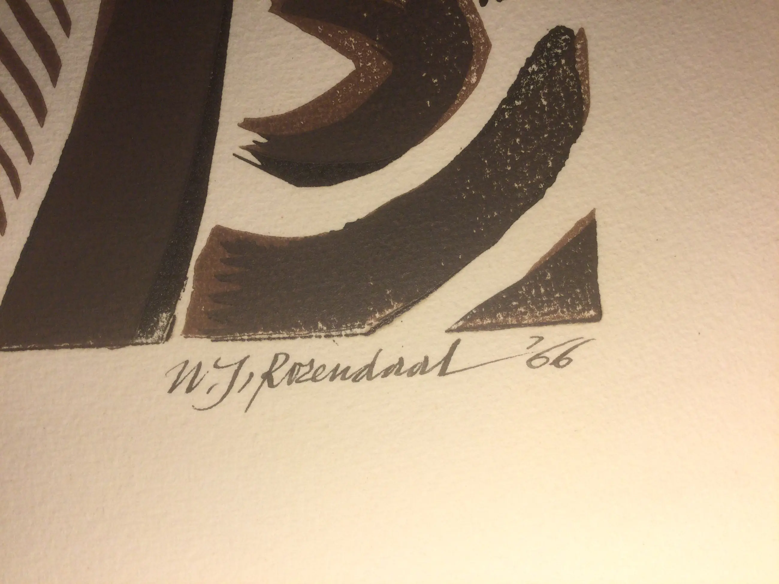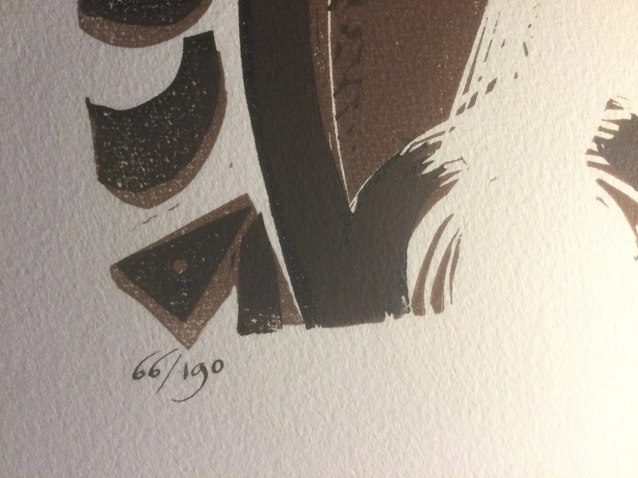 Betreft lino snede 3 kleuren. 66/190. Rechtsonder gesigneerd 1966. Beeld formaat 52 cm hoog 34 cm breed.
