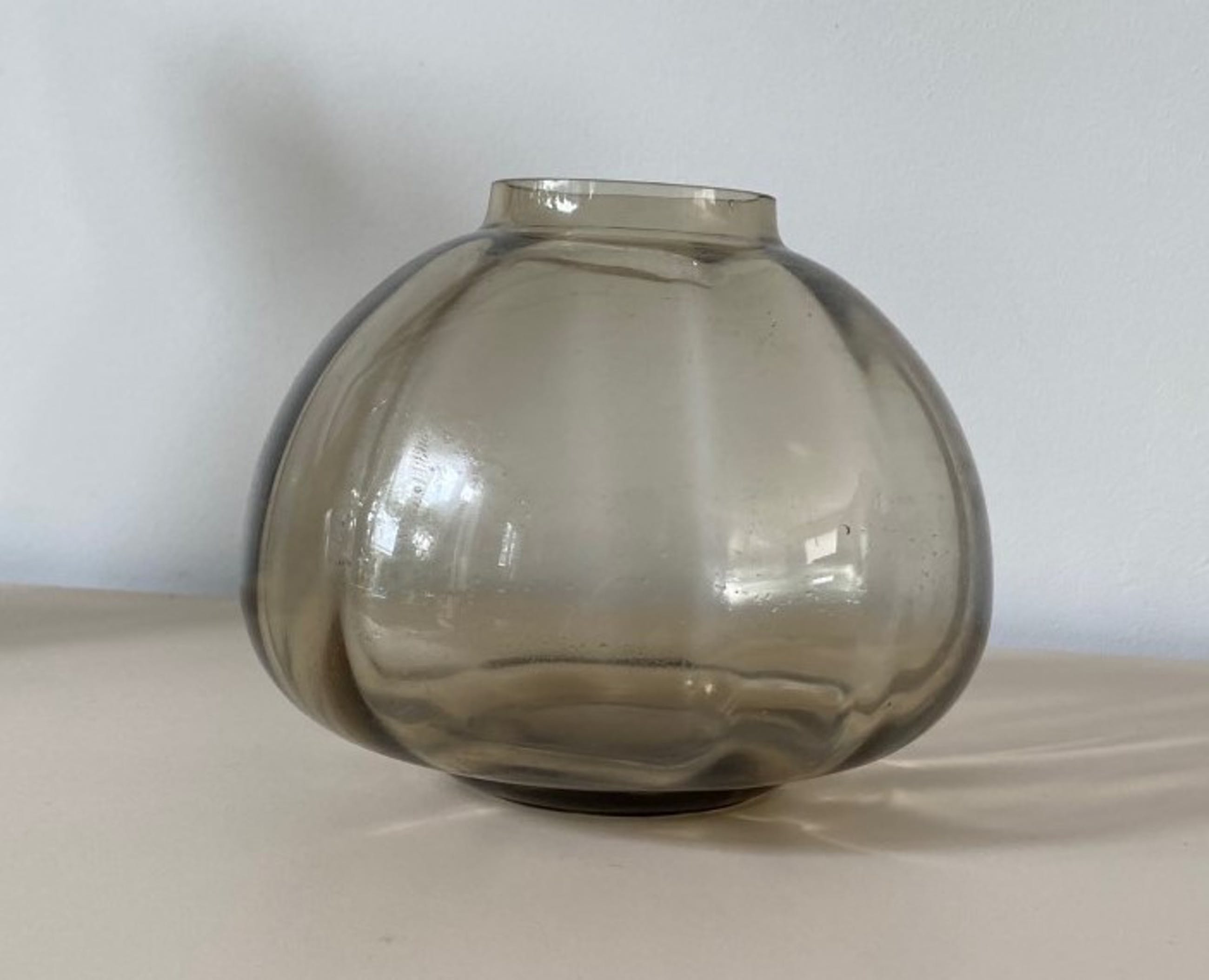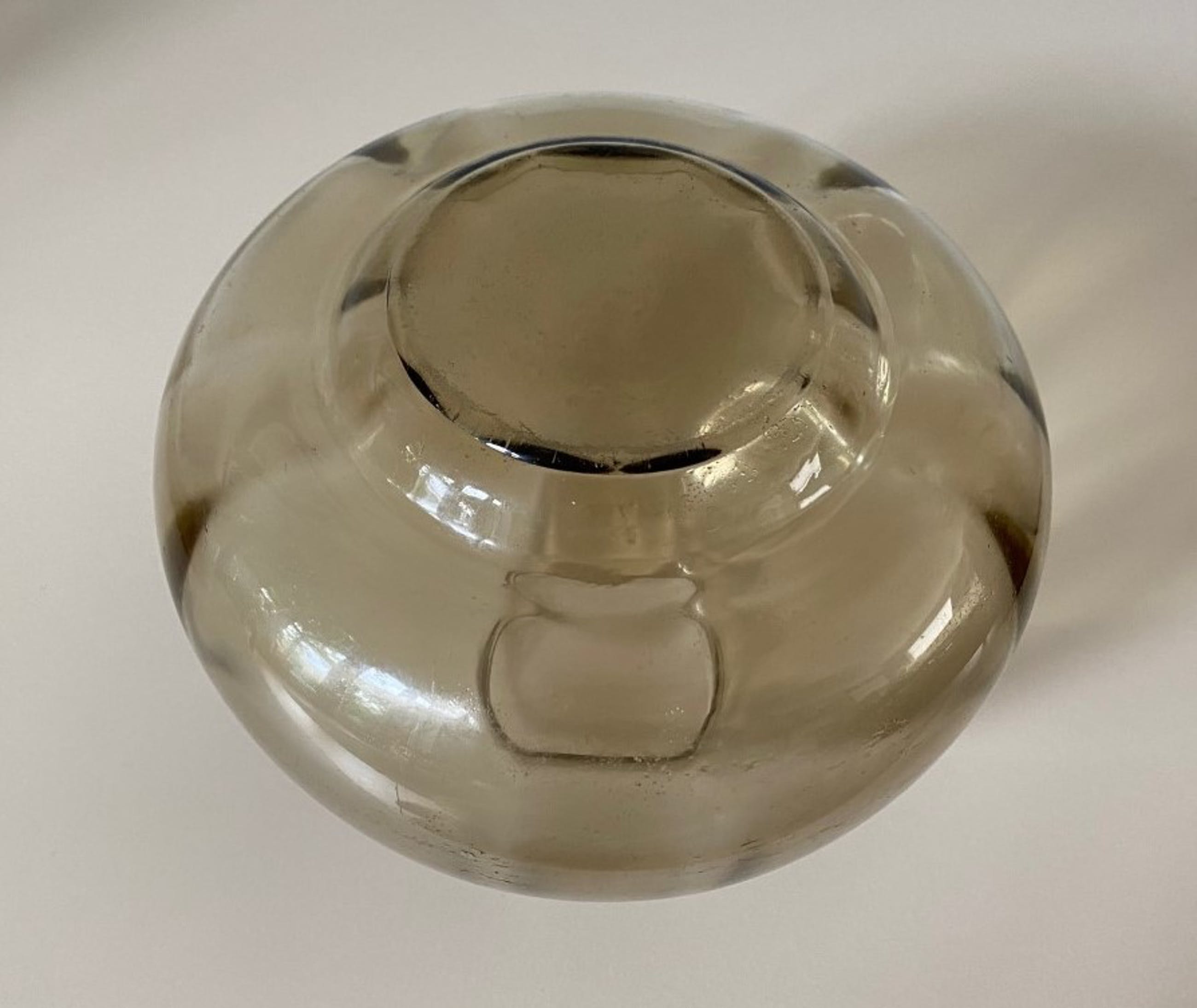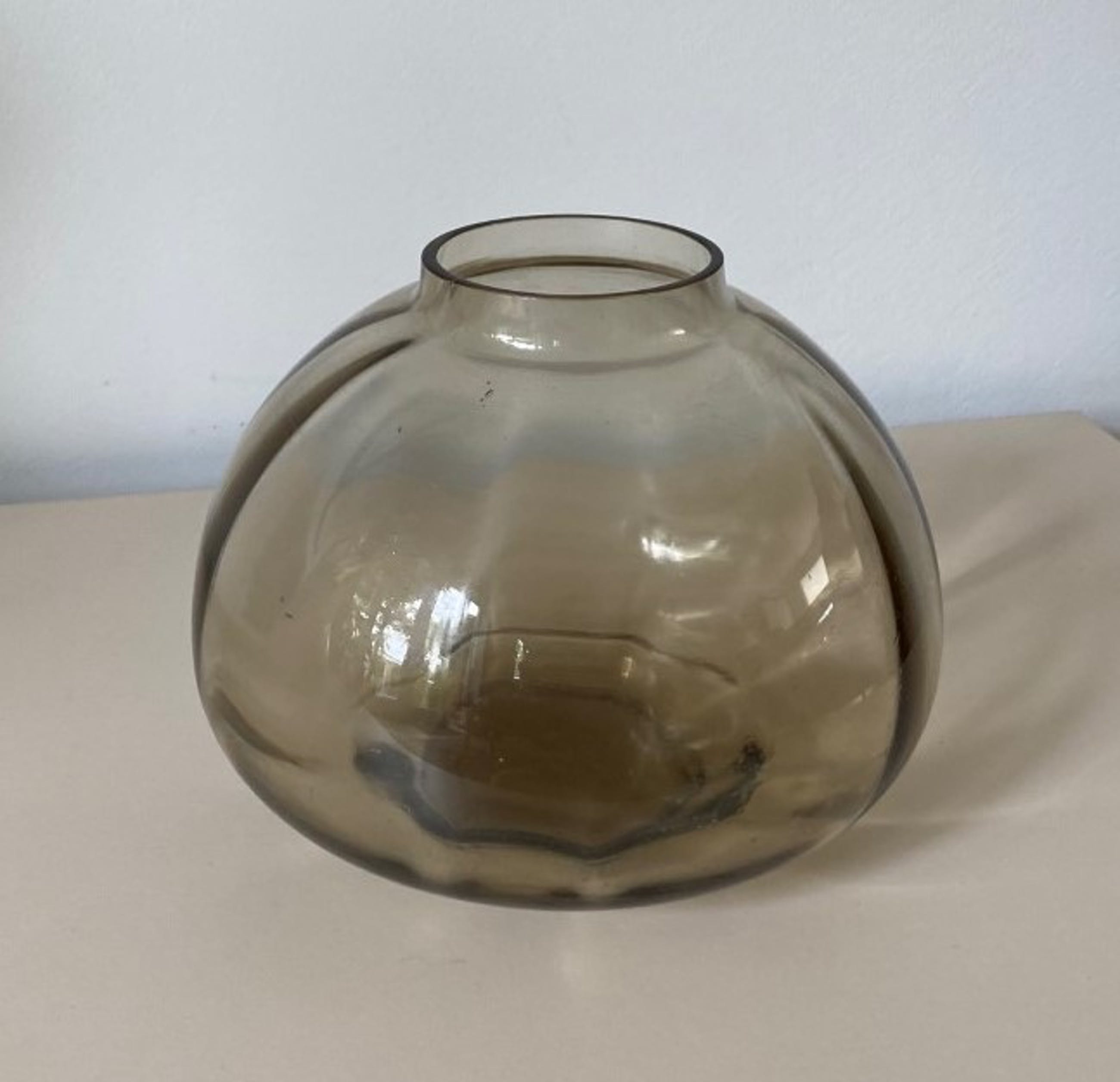 Hoogte: 13,5 cm. Ø 16 cm. Deze vaas is ontworpen door W.J. Rozendaal in 1931. Deze vaas werd in 5 maten geproduceerd. Dit is het middelste model. De laatste foto toont de modellen in een oude Kristalunie catalogus van 1931. Herkomst: Maastricht, 1931. Materiaal: rookglas (fumi).