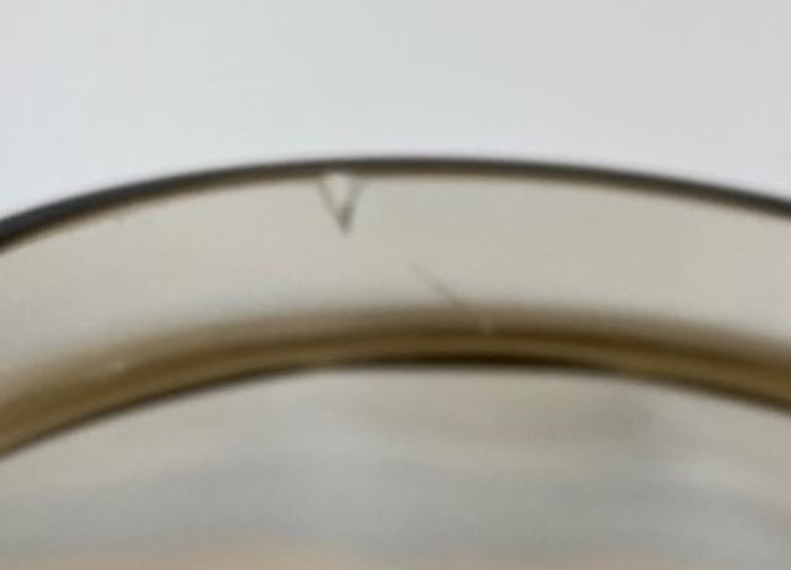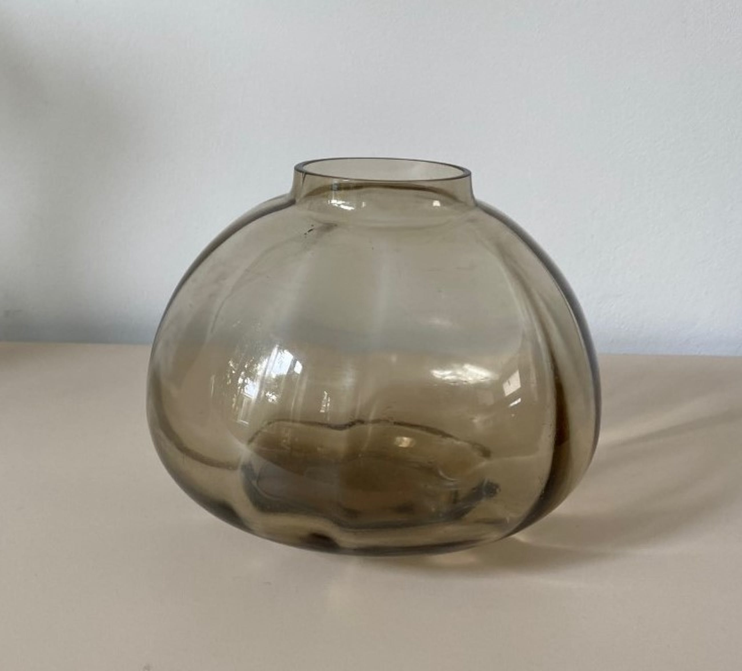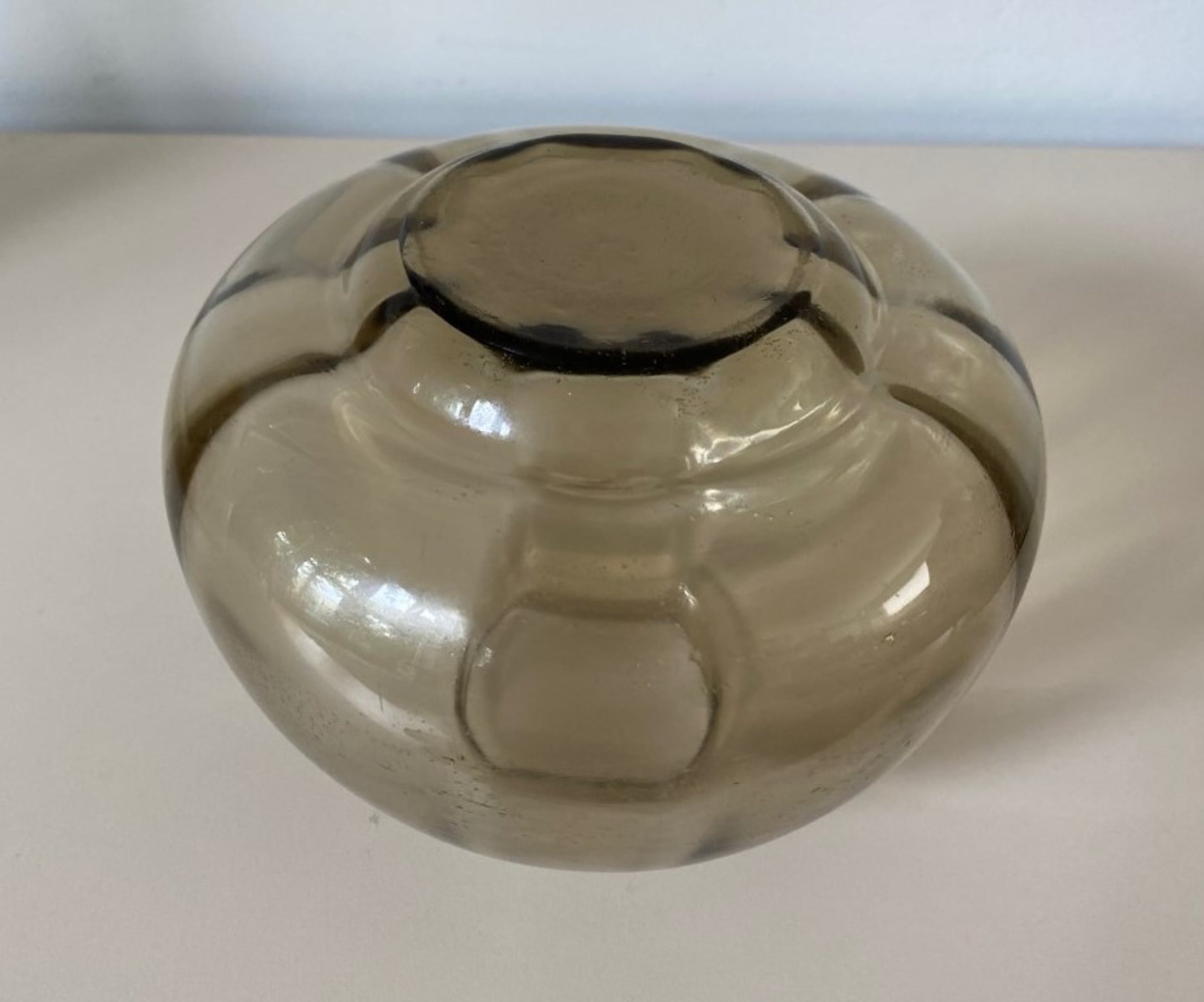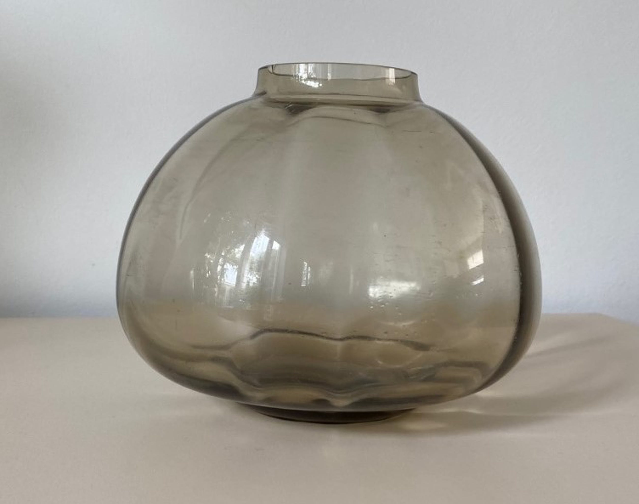 Hoogte: 13,5 cm. Ø 16 cm. Deze vaas is ontworpen door W.J. Rozendaal in 1931. Deze vaas werd in 5 maten geproduceerd. Dit is het middelste model. De laatste foto toont de modellen in een oude Kristalunie catalogus van 1931. Herkomst: Maastricht, 1931. Materiaal: rookglas (fumi).