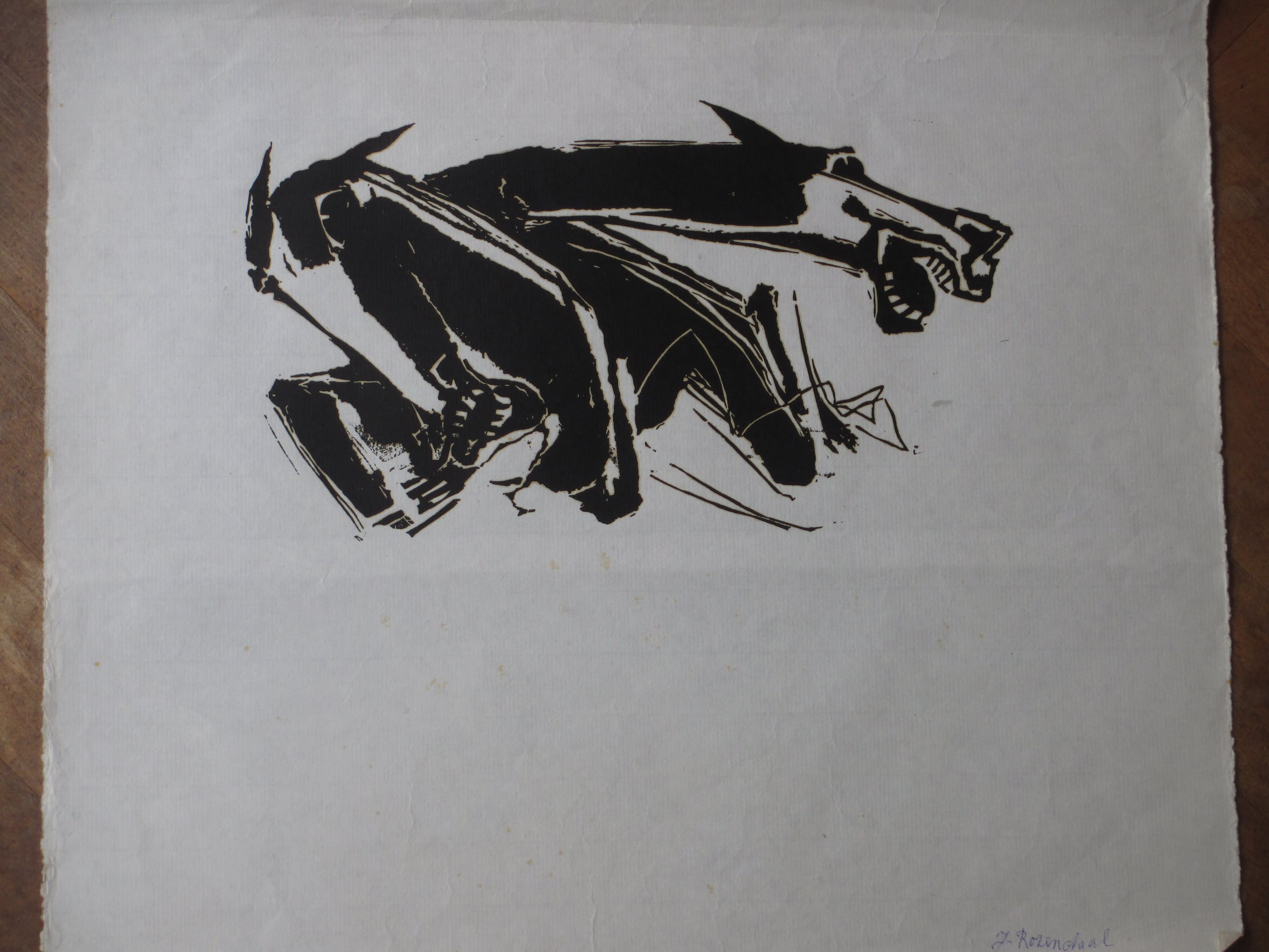 Linosnede door Willem J. RozendaalVoorstelling van twee paardenhoofdenLosbladig, beeldmaat 19x33, bladmaat 44x50Gesigneerd in pen r.o. : J. RozendaalAuthenticiteit volledig gegarandeerd