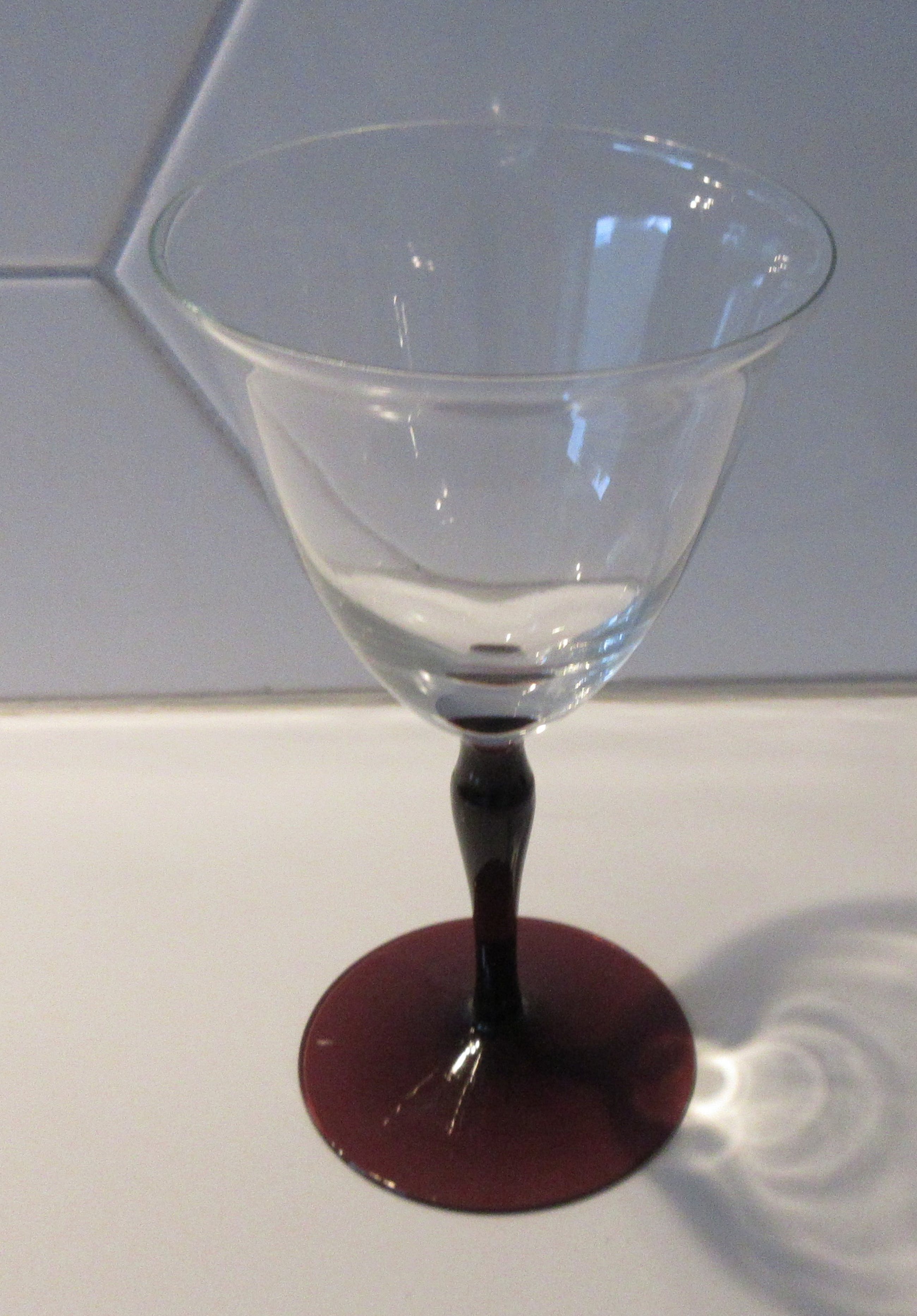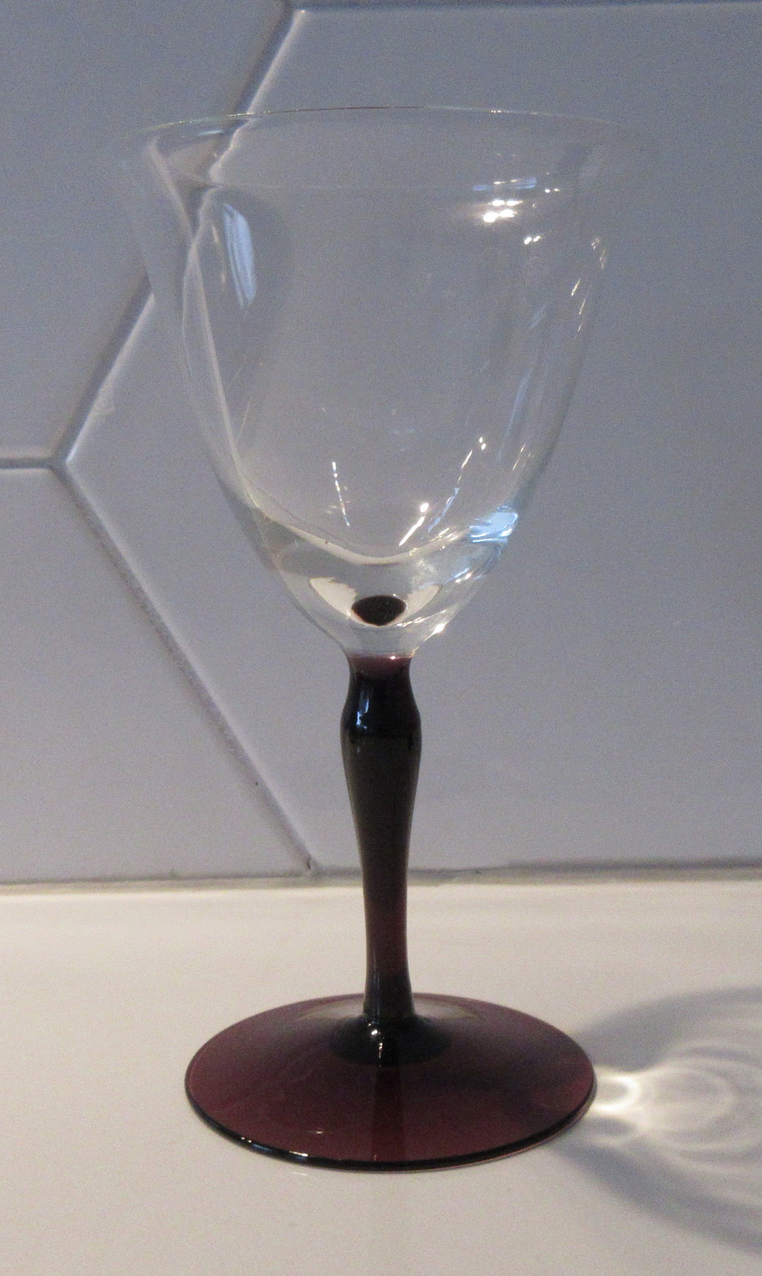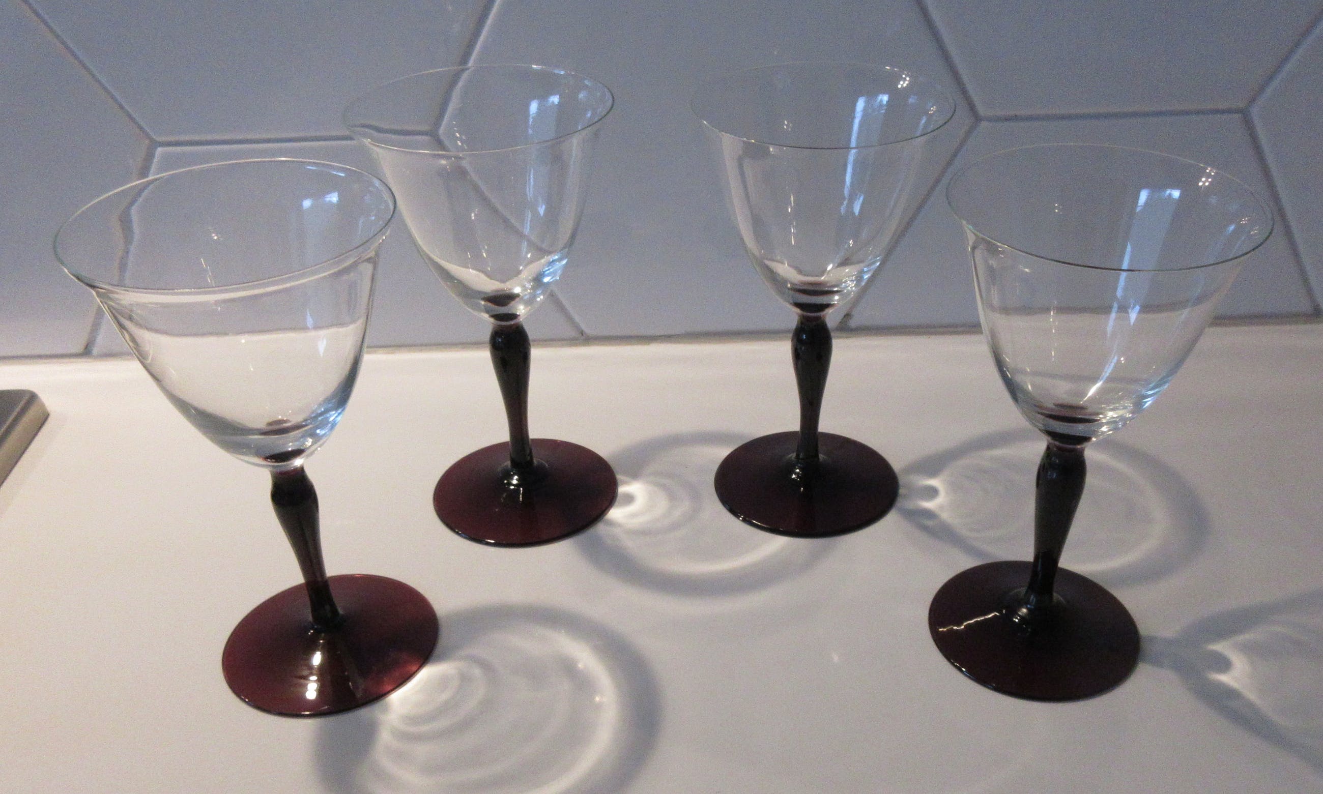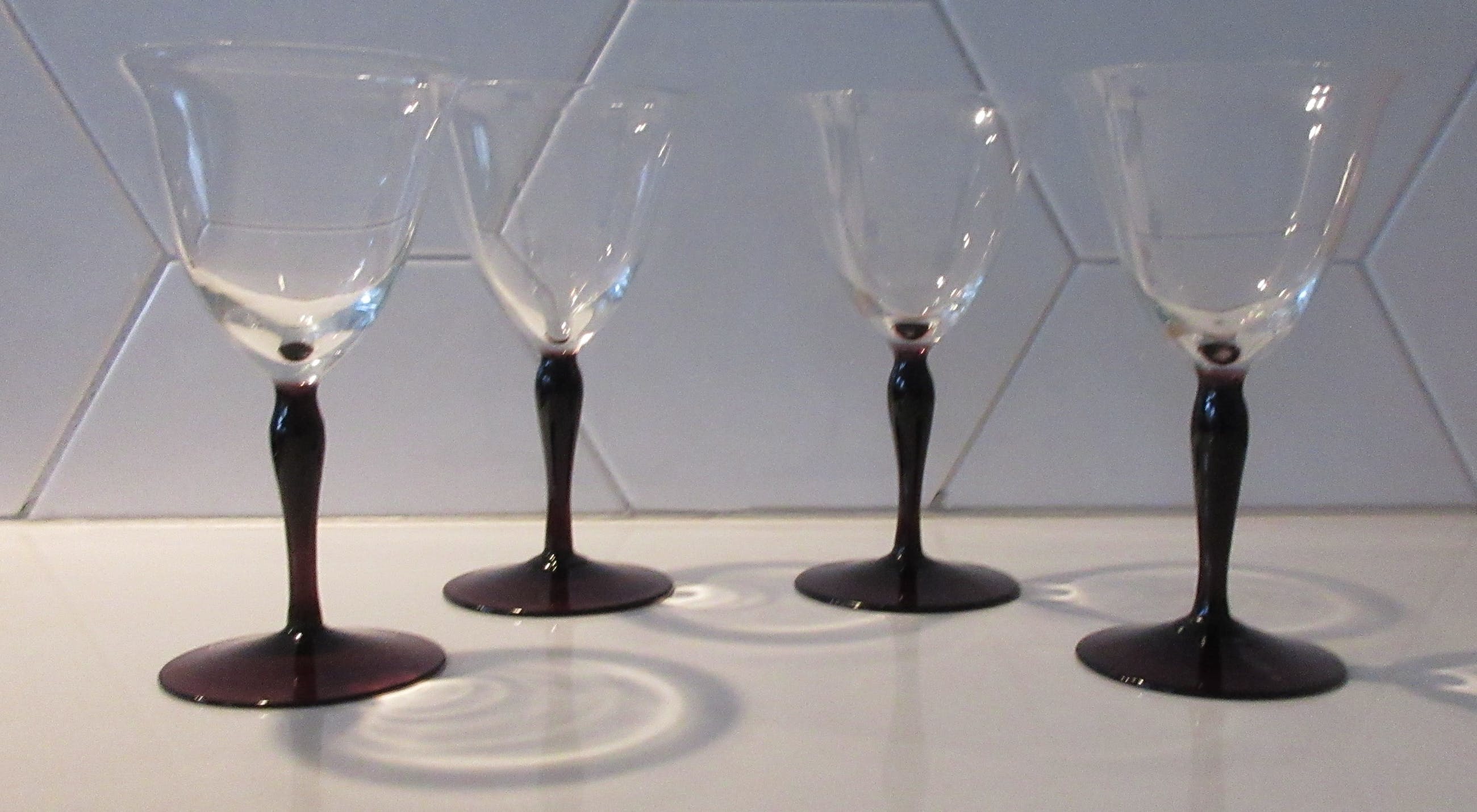 Vier rode wijnglazen servies Ajax met paarse voet en steel. Ontwerp Willem Rozendaal voor de Kristalunie Maastricht. In prima conditie, een glas heeft een flinter op de bovenzijde. Niet gemerkt.
