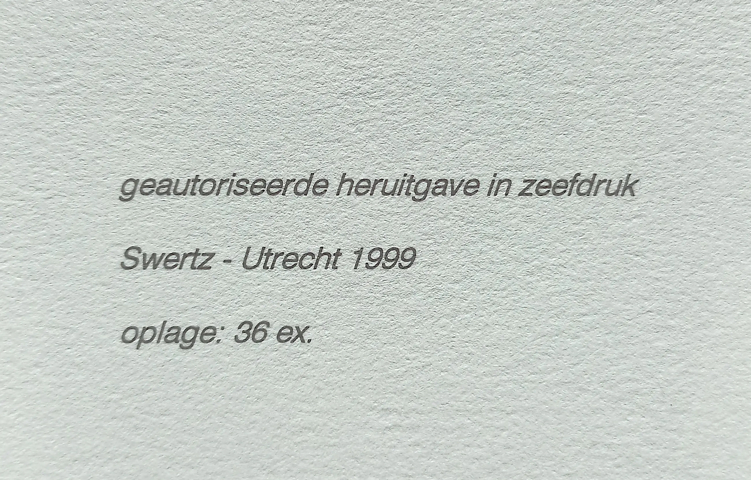 Zeefdruk op Fontenay geschept papier, in de druk gesigneerd, achterop een verantwoording van antiquariaat Swertz in Utrecht. In mint conditie.