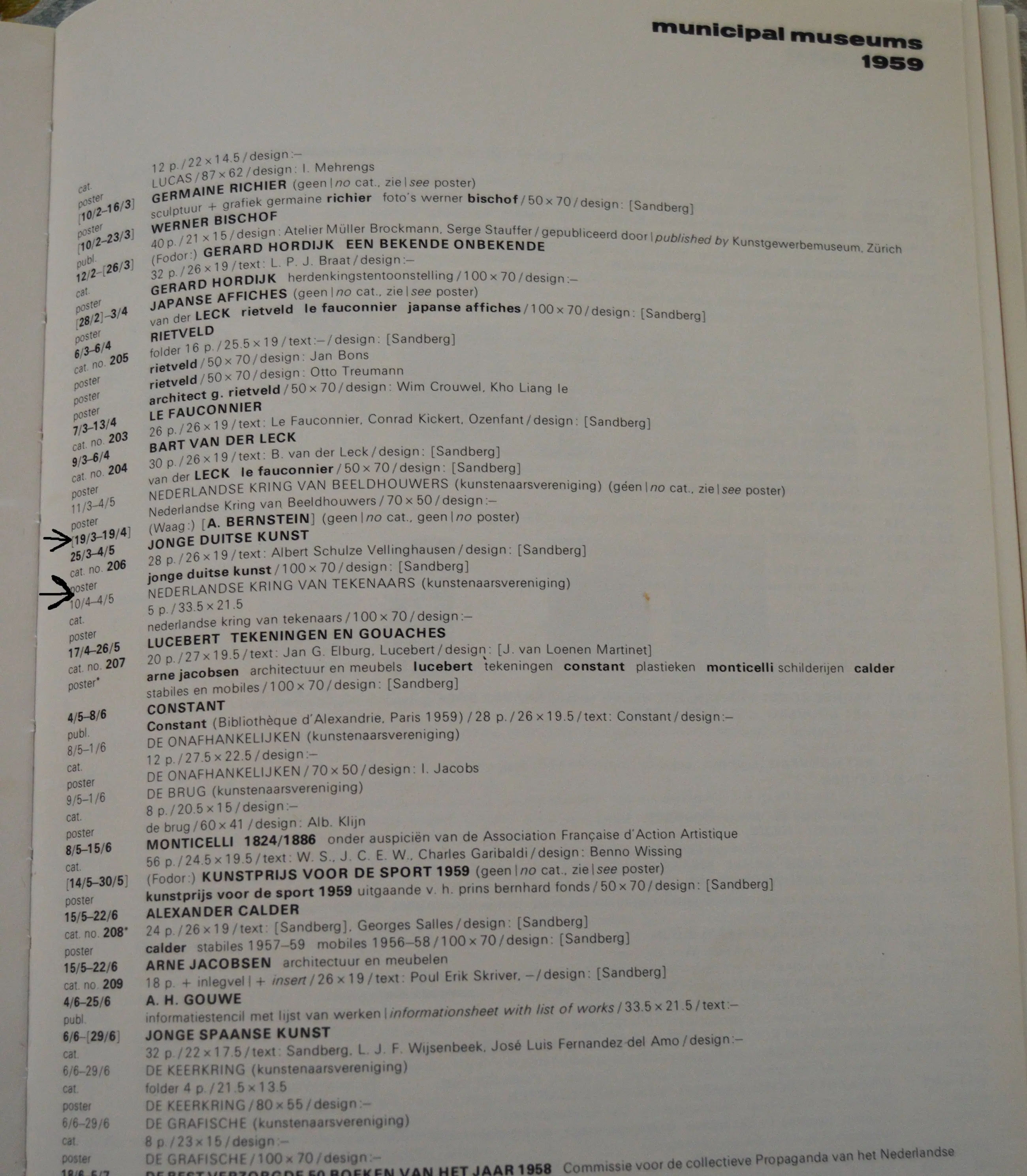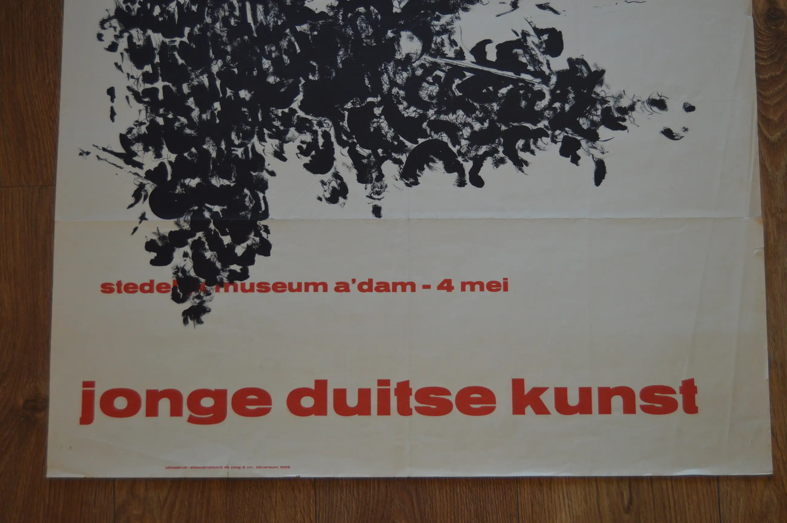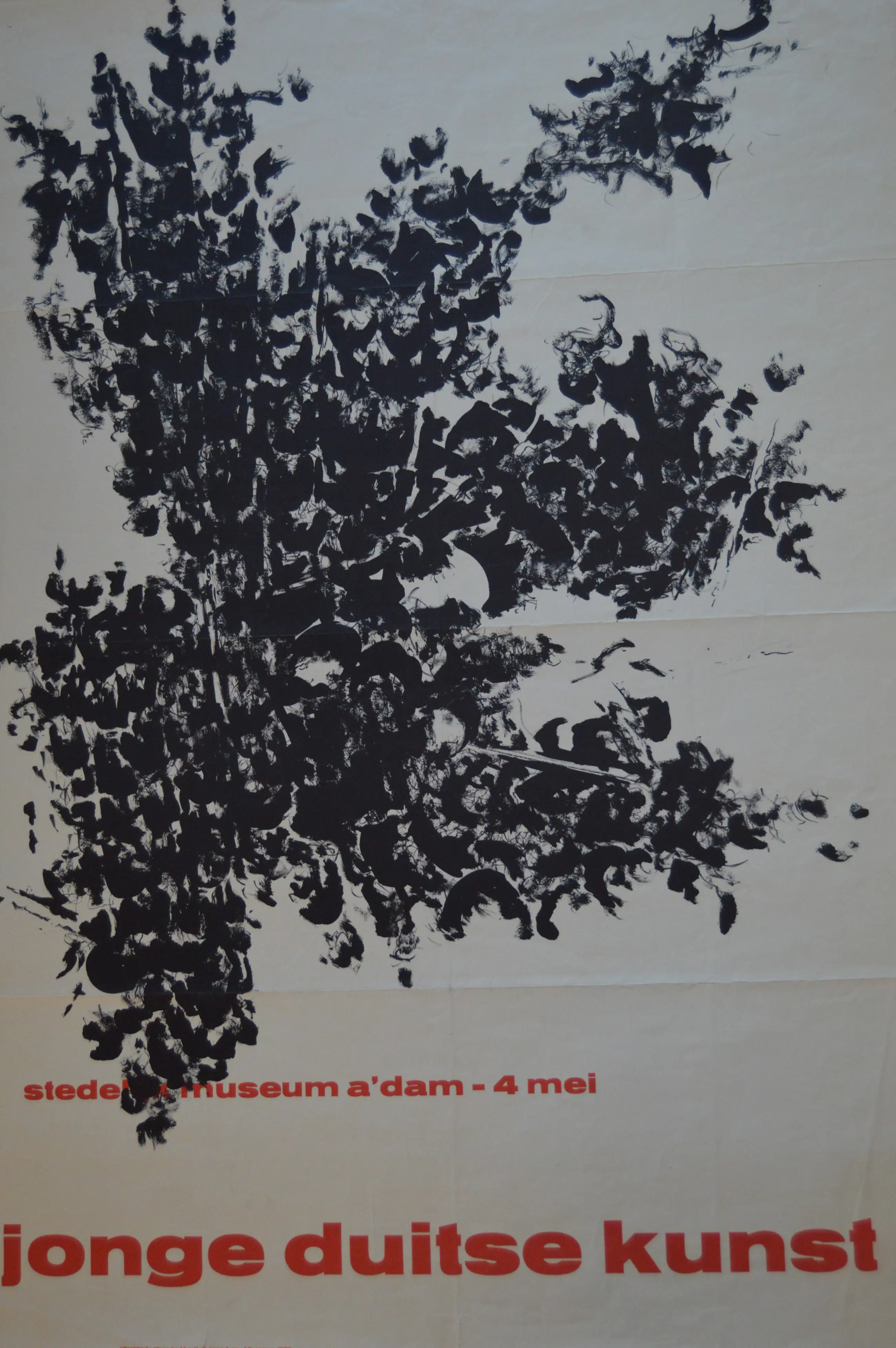 Affiche met ankondiging voor de tentoonstelling; "Jonge Duitse kunst" In het Stedelijk museum te Amsterdam. 4 mei 1959. Ontwerp van Willem Sandberg. Druk; de Jong & Co, Hilversum 1959. Vermeld in; Sandberg, een documentaire. Pagina 181.