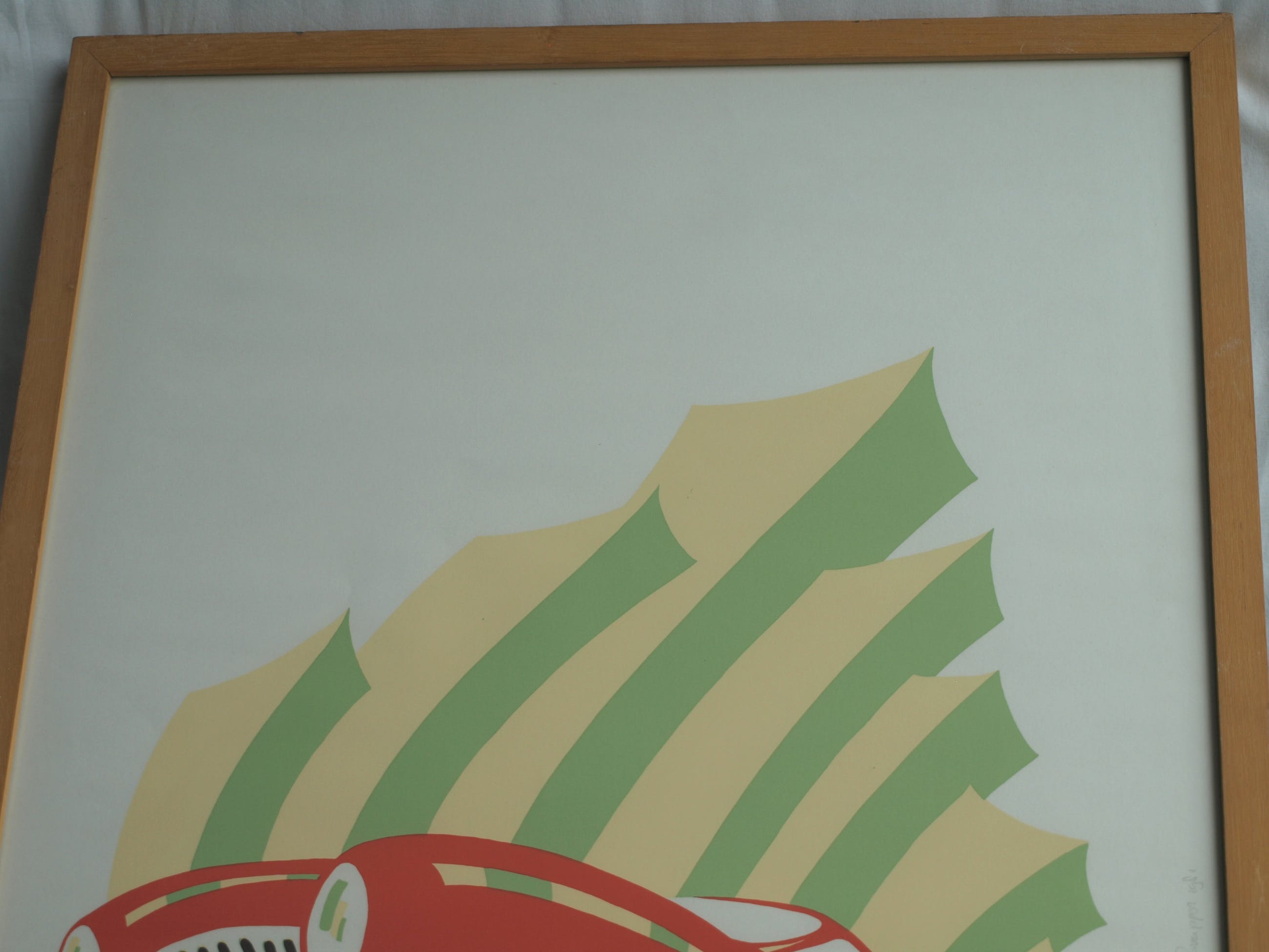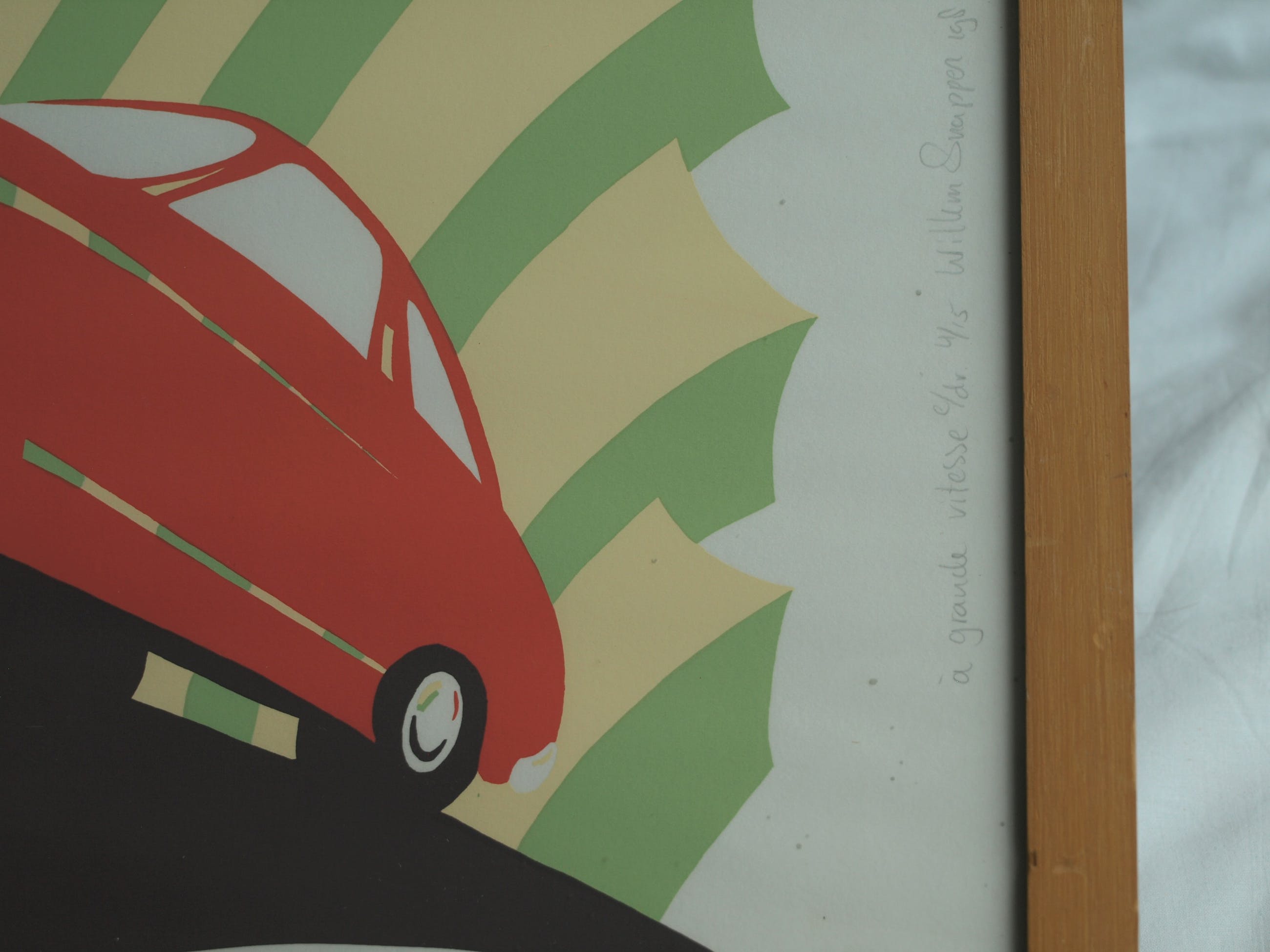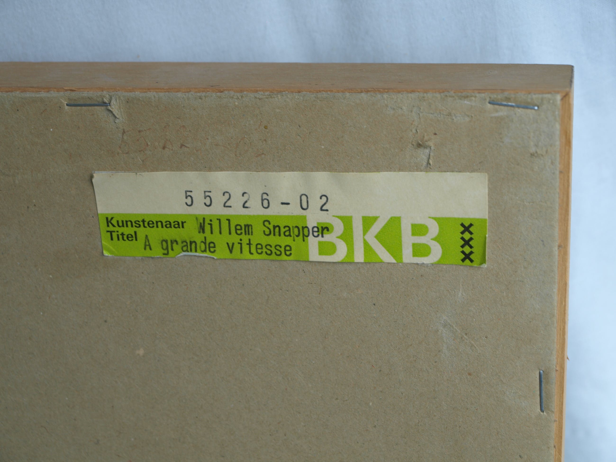 -Handgesigneerd, -getiteld, -genummerd en -gedateerd met potlood en ingelijst in een houten baklijst met glasplaat. Ook op de achterkant staat de titel vermeld: “À grande vitesse”.