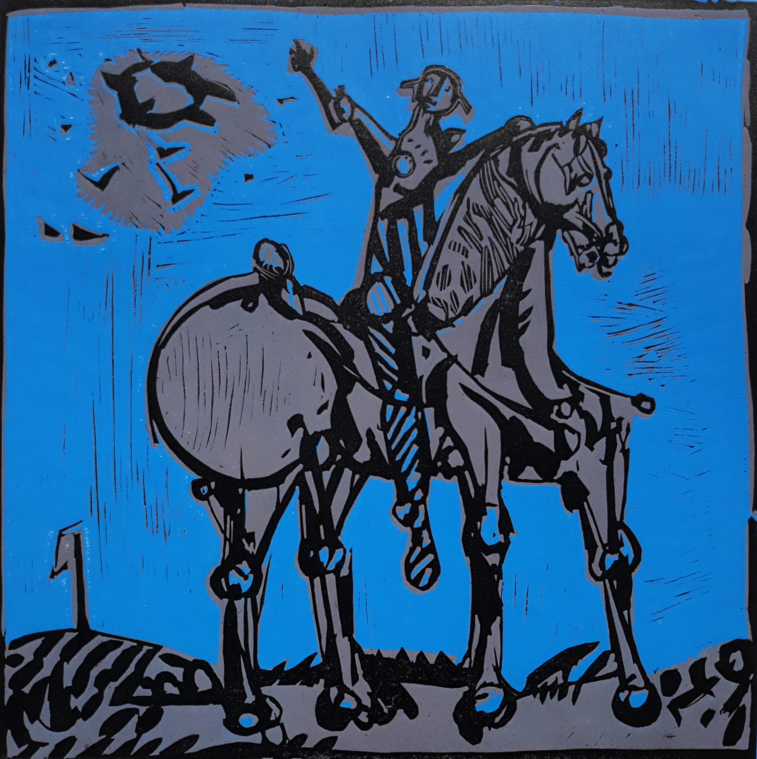 Krachtige voorstelling van Willem Snitker, in mijn beleving een Don Quichot te paard. Linosnede op papier, met potlood gesigneerd, gedateerd (‘74) en genummerd (1/6). In zeer goede conditie; de uiterste randen van de zéér ruime marge zijn verkleurd en daar zitten ook wat vochtvlekken maar ingelijst met passe-partout is het werk uitstekend.