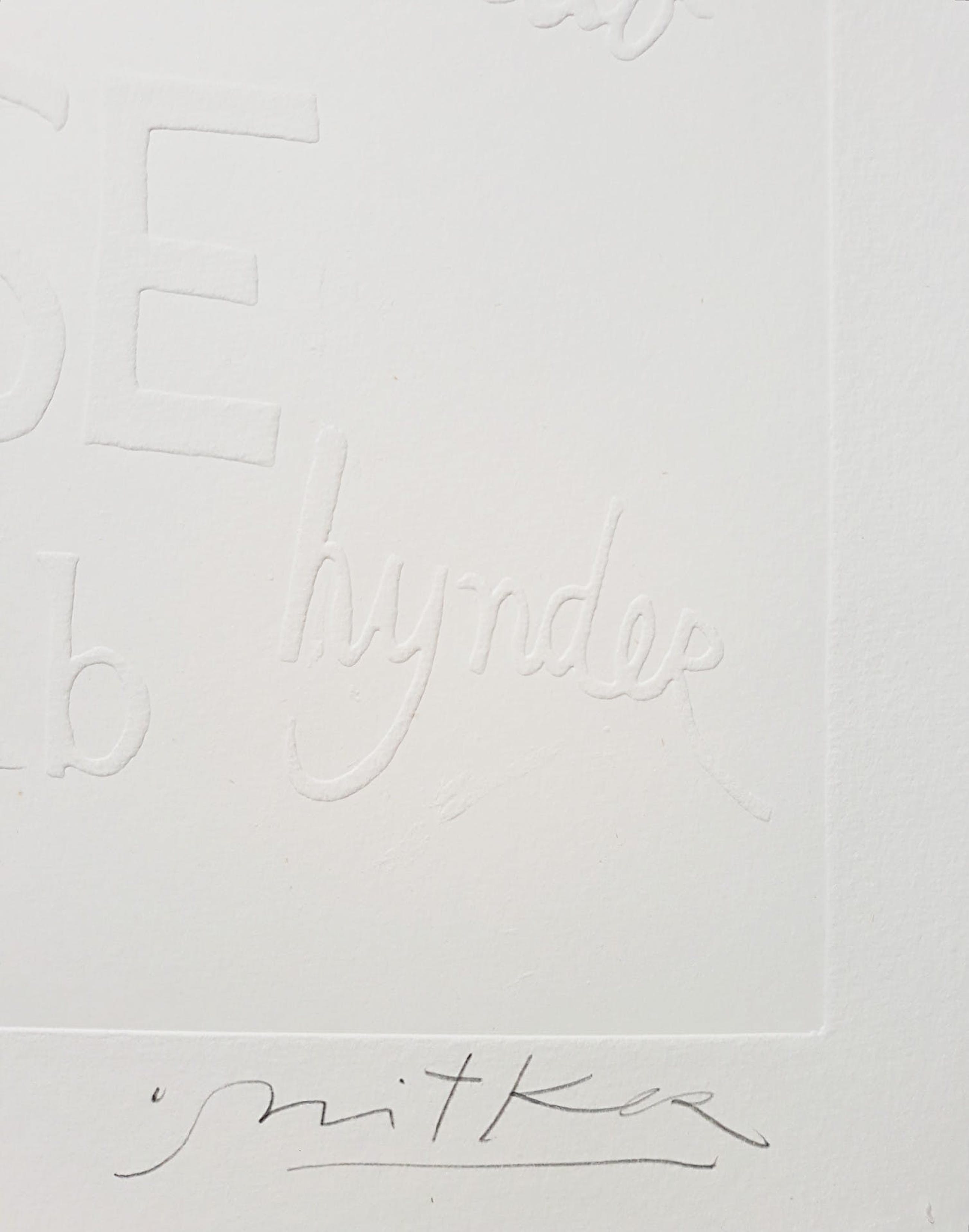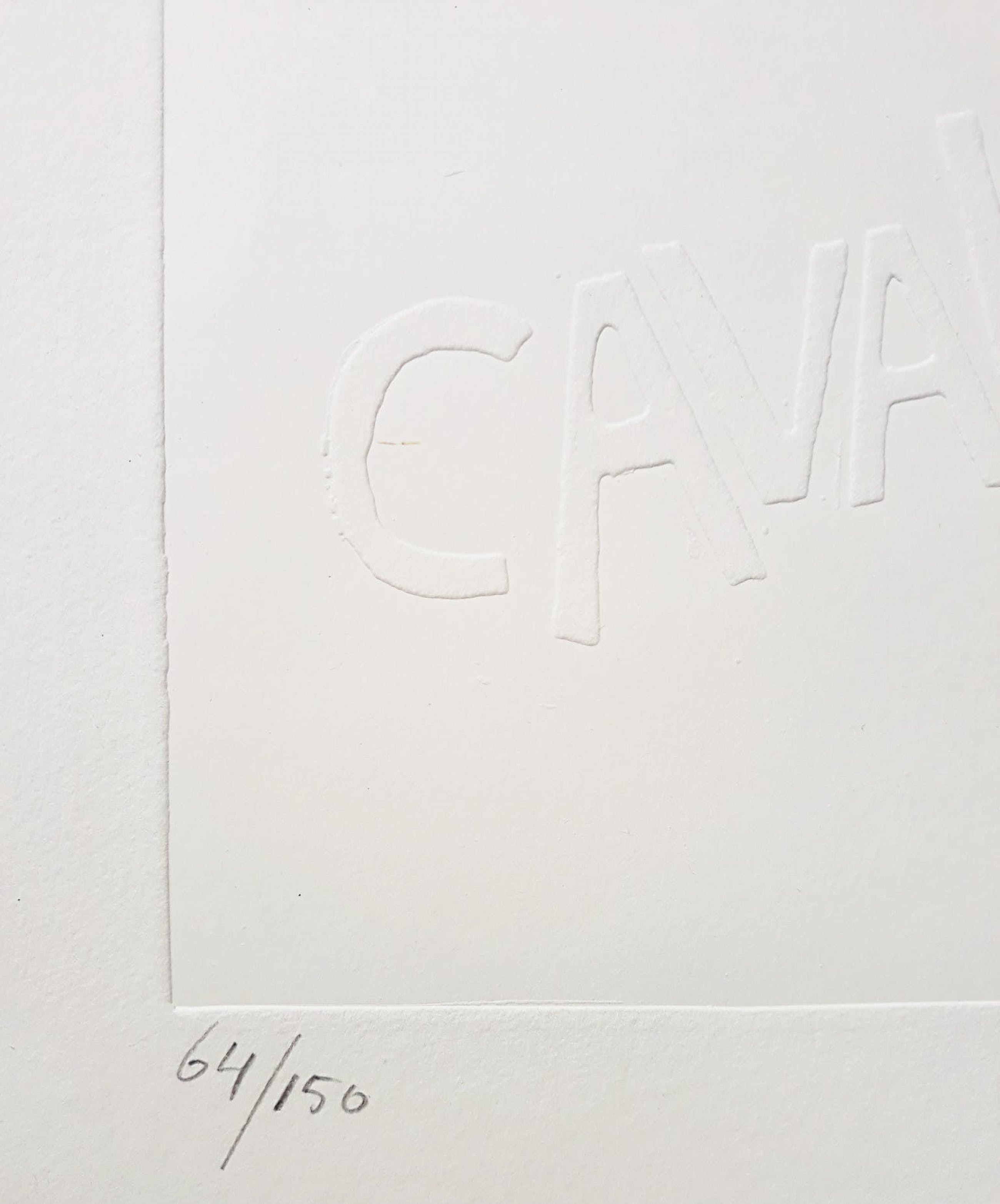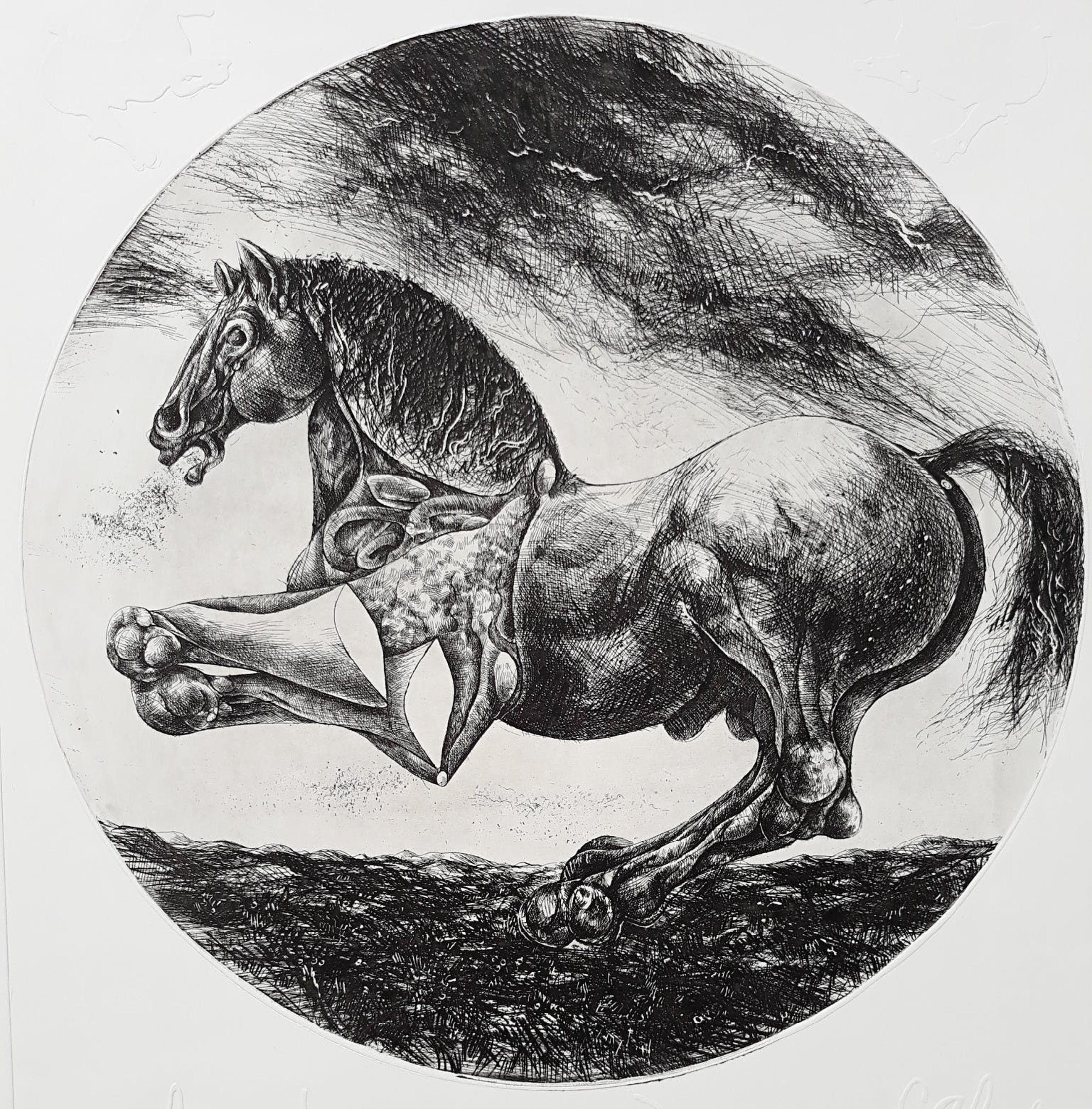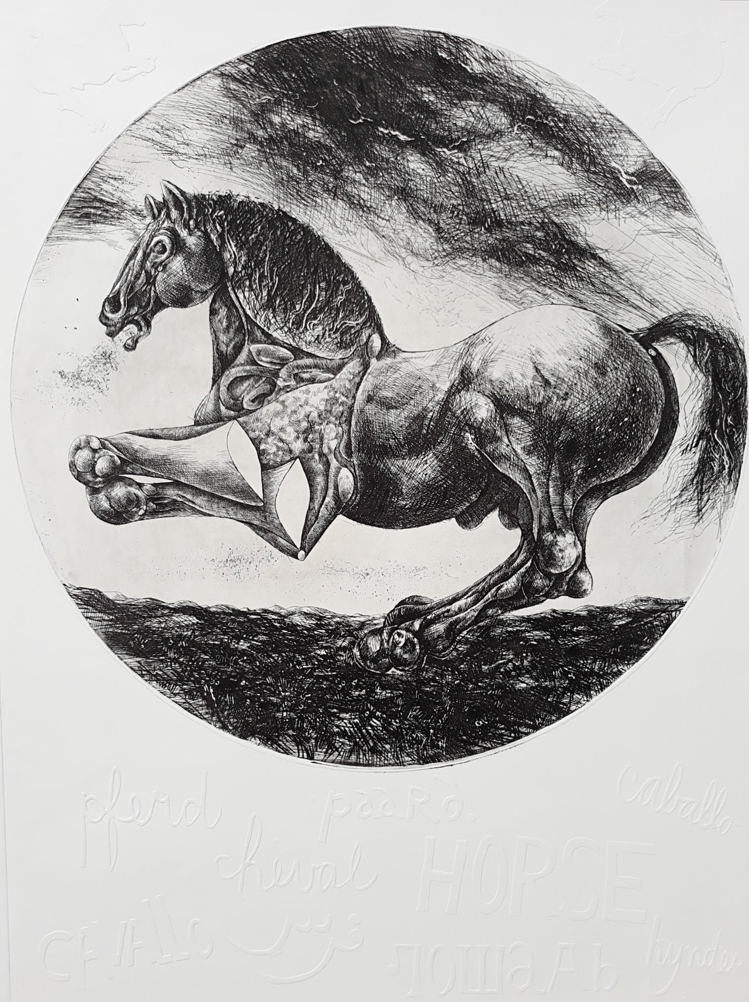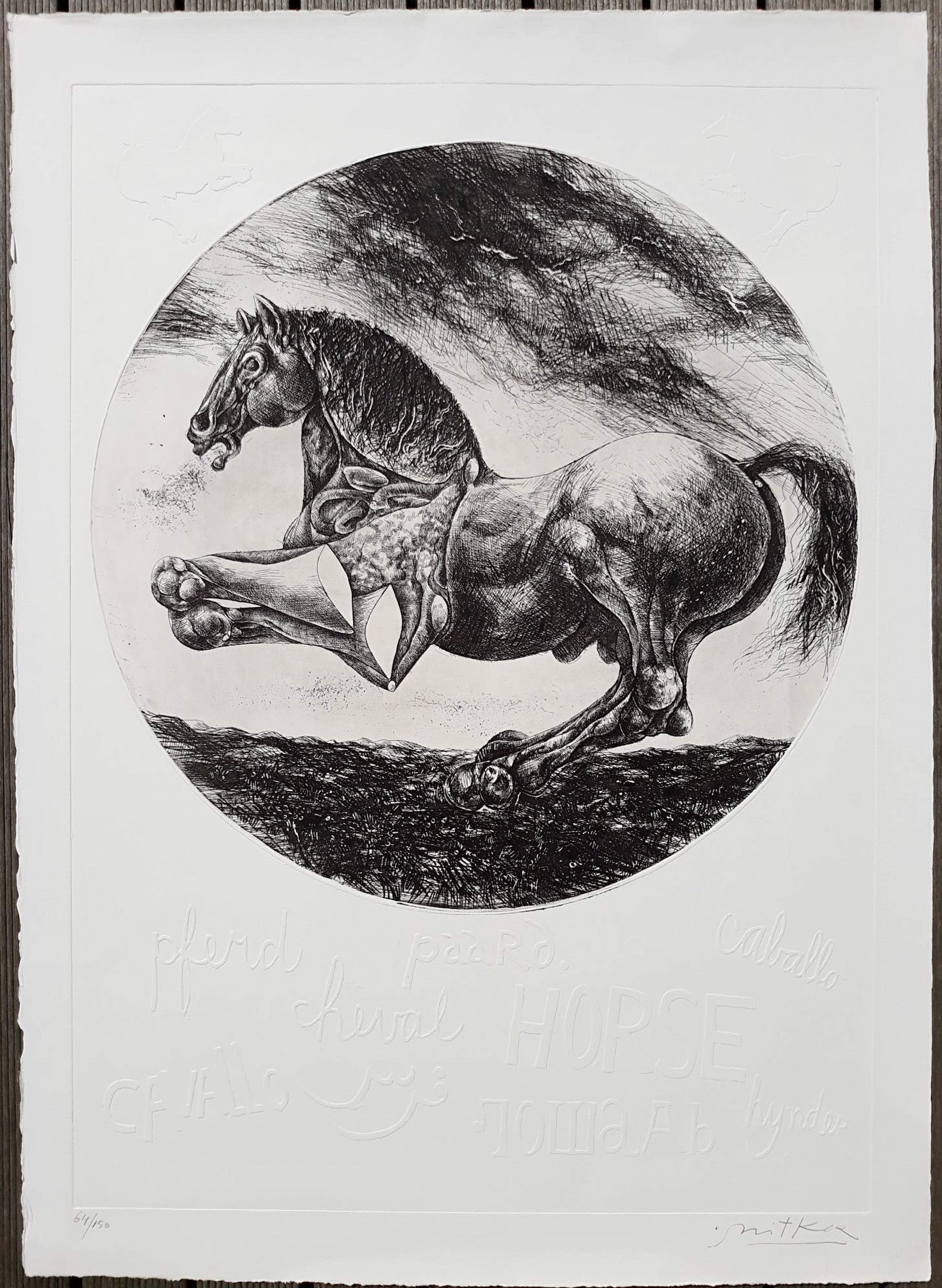 Bijzonder, groot werk van Willem Snitker. Ets met reliëfdruk op geschept papier, met potlood gesigneerd en genummerd (64/150). Links- en rechtsboven de ets springen twee paarden in blinddruk en onder de ets staat het woord paard in negen talen/schriften in blinddruk. In zeer goede conditie.