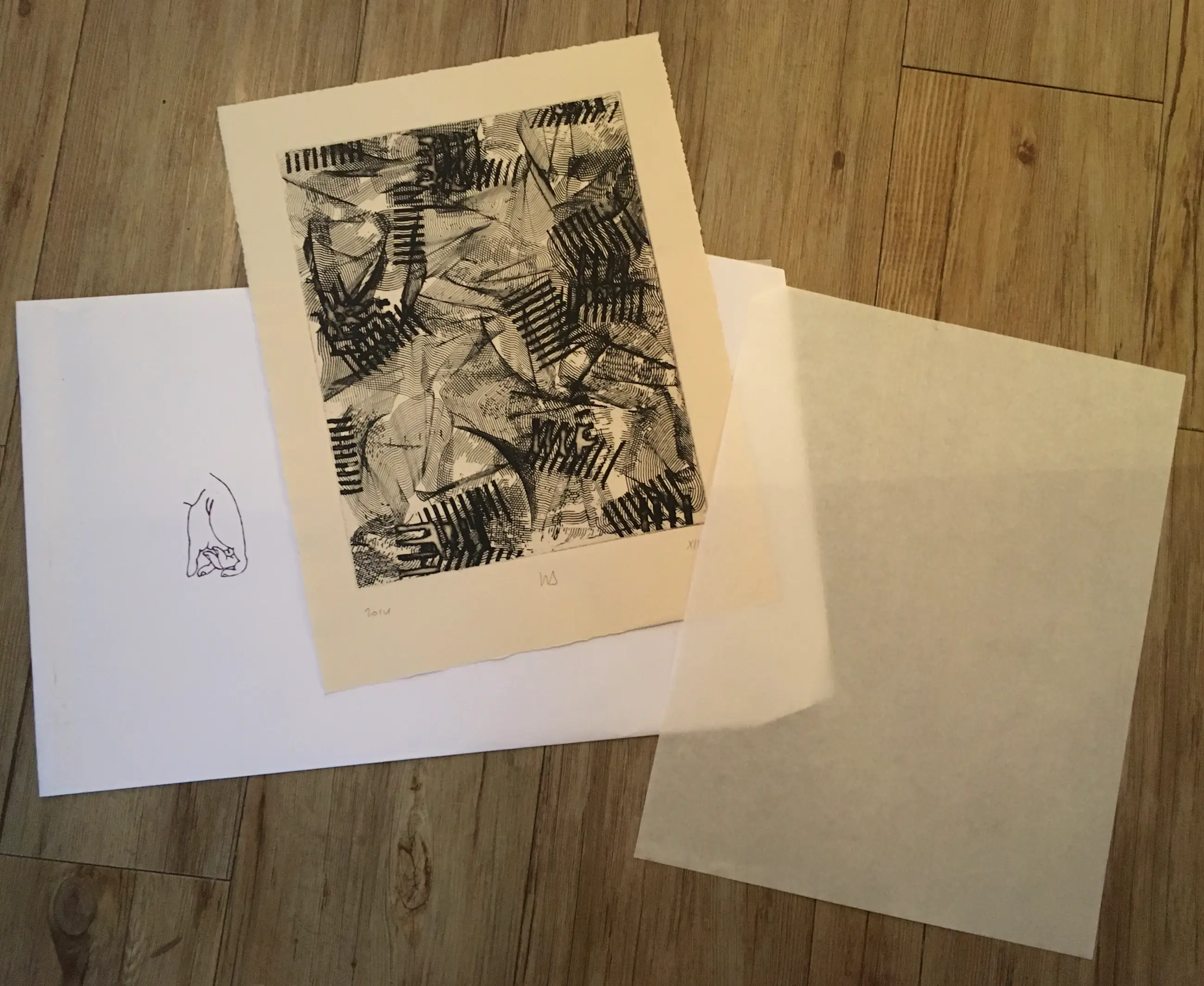 Uit een-na-laatste levensjaar van kunstenaar Willem Snitker (1938-2015) - mooie abstracte ets. Inclusief originele vloeipapier en originele envelop met afbeelding van hand.