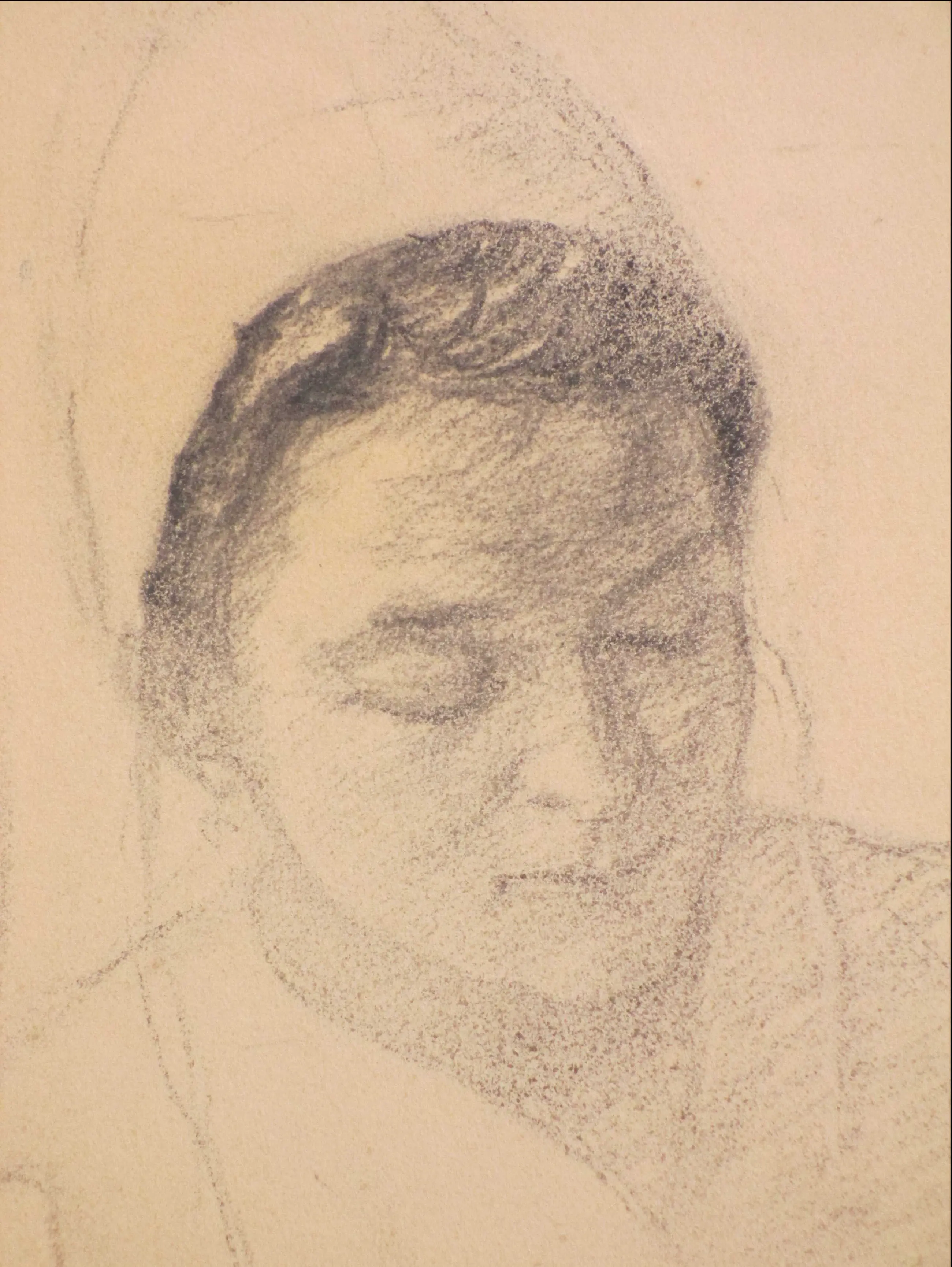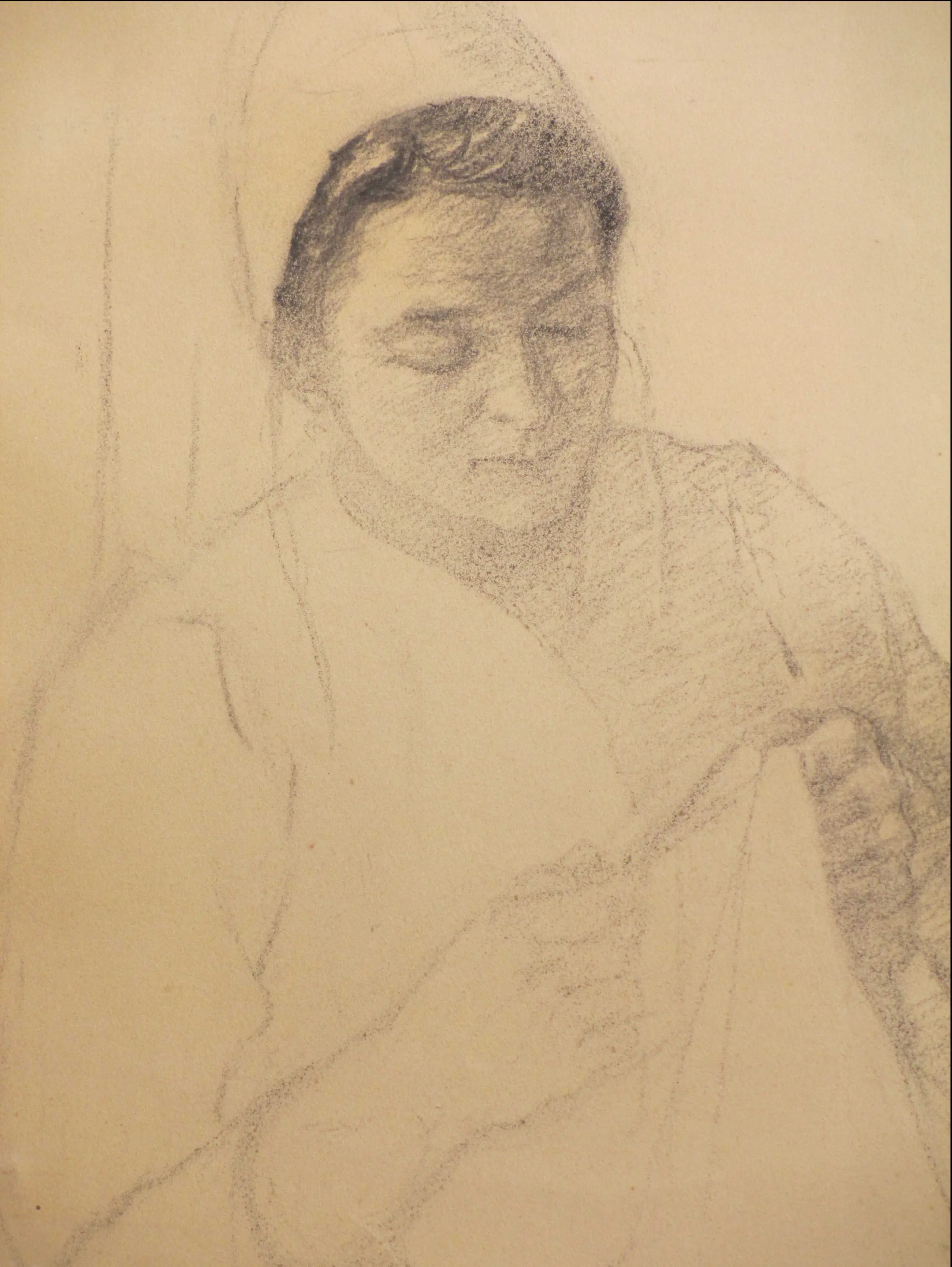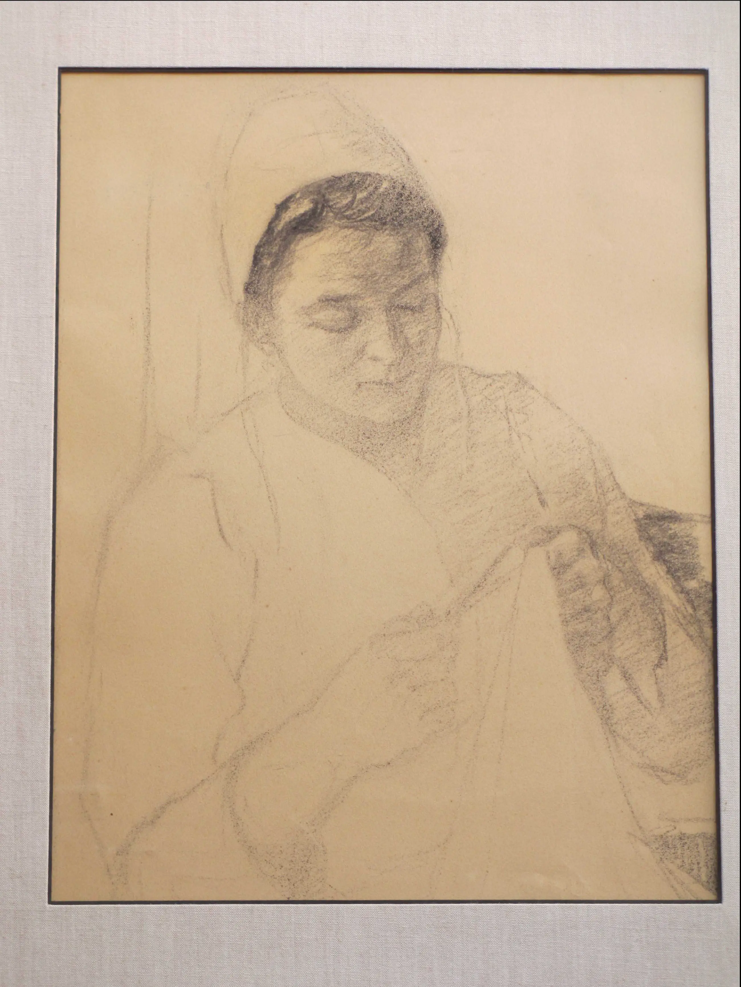 Tekening door Willem Vaarzon Morel sr Voorstelling van een vrouw met kap aan het herstelwerk Vlot en luchtig opgetekend Tekening in passepartout, beeldmaat 37x29. p.p.maat 52x42 Niet gesigneerd herkomst: collectie tekeningen Vaarzon Morel Authenticiteit volledig gegarandeerd