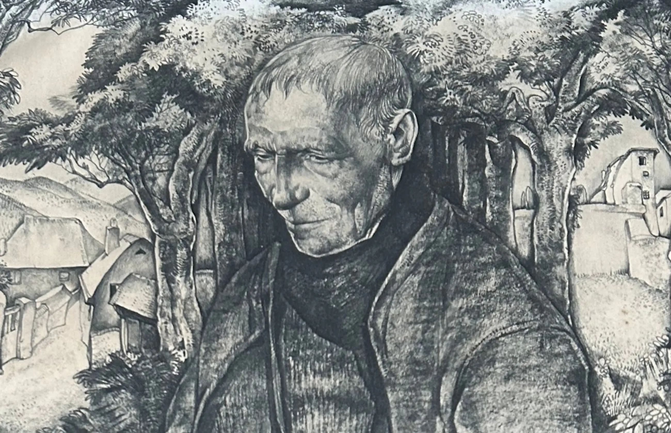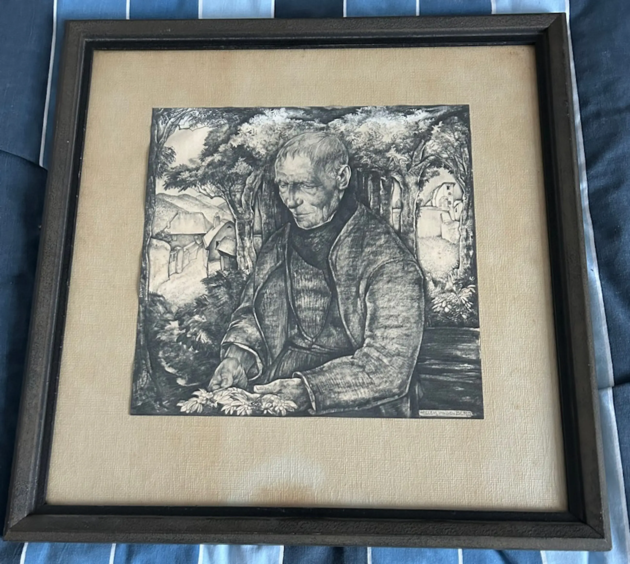 Achter glas ingelijste litho, rechtsonder in de plaat gesigneerd. Een paar vlekjes op het passe-partout.