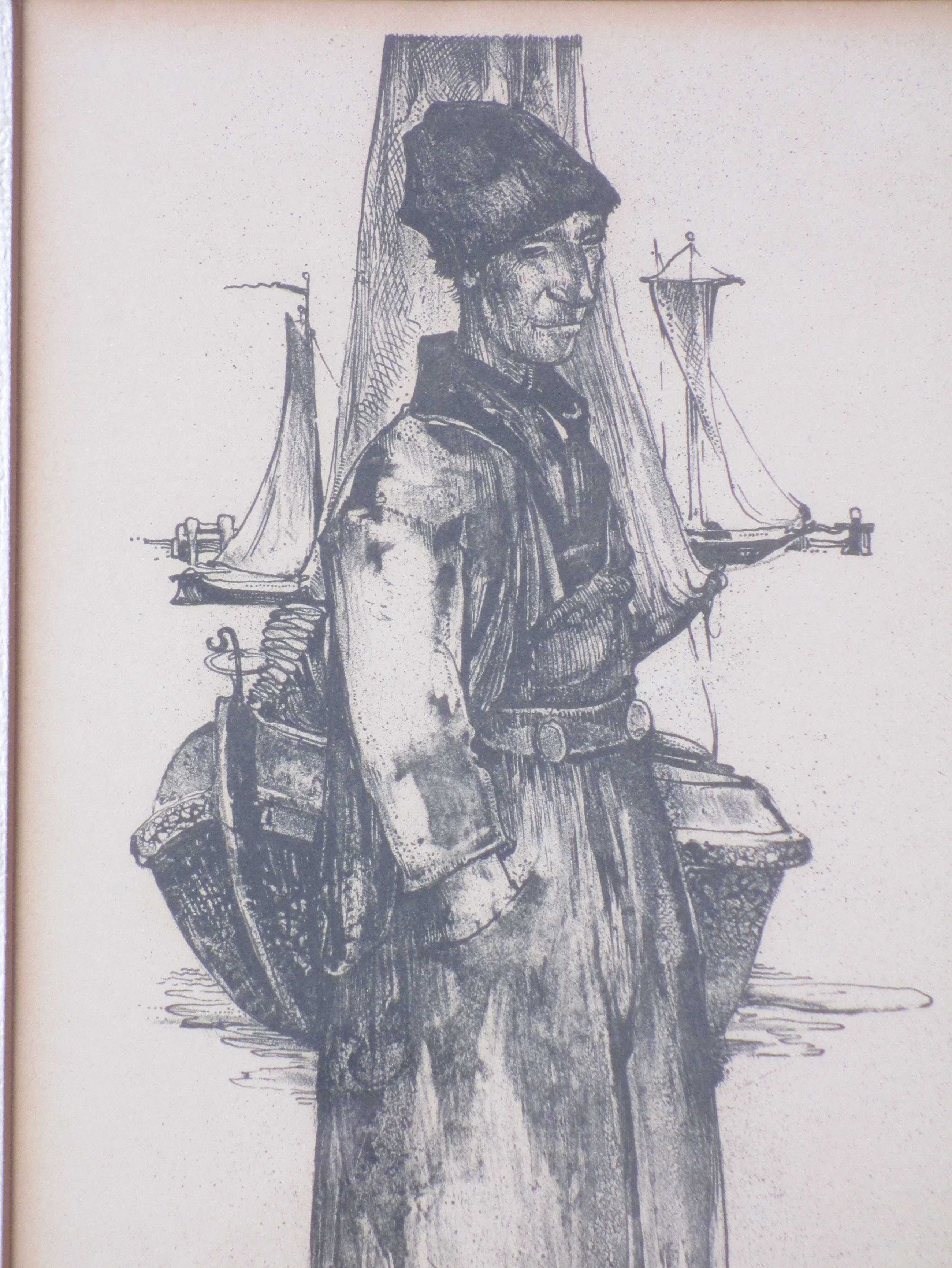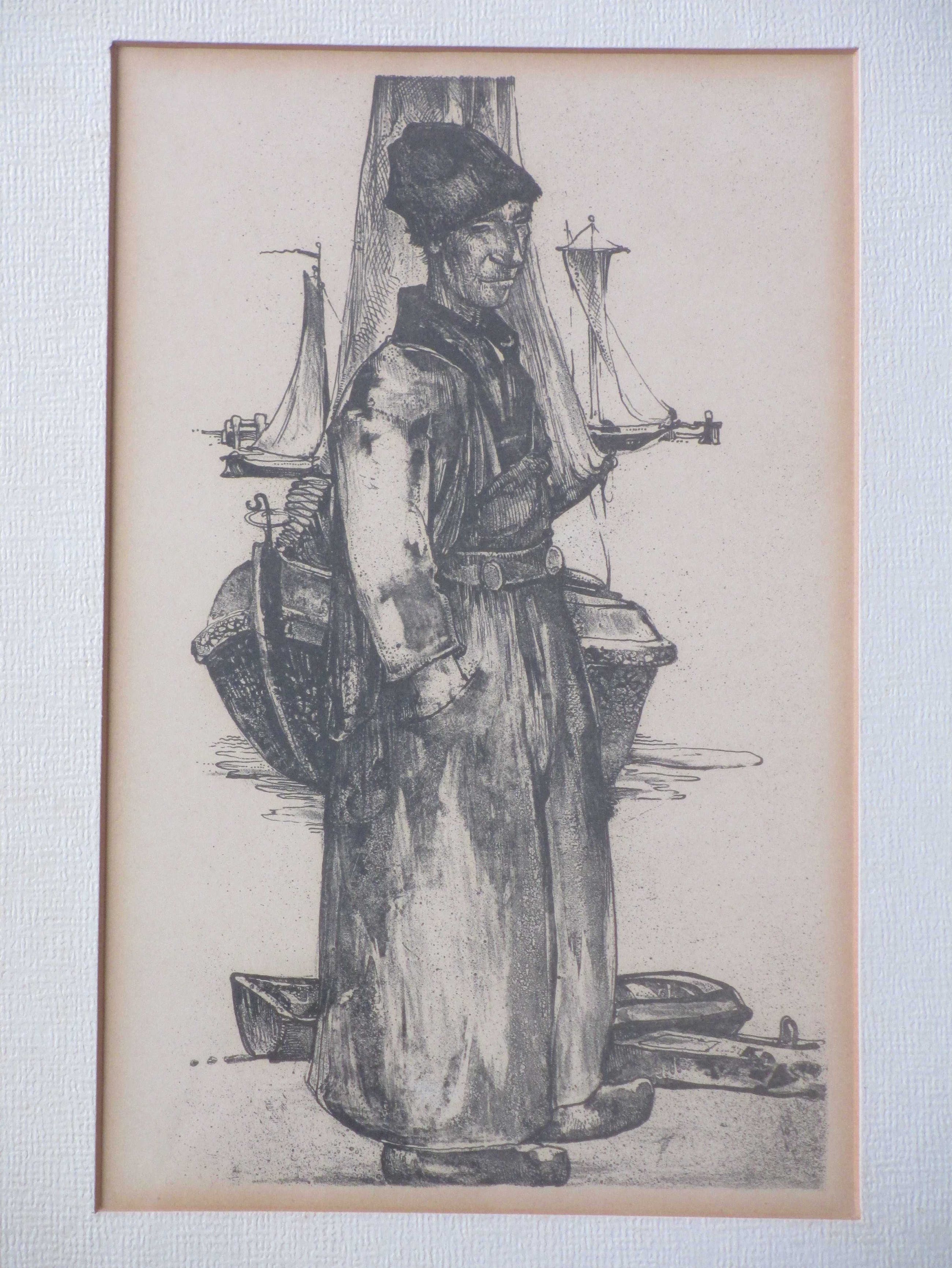 Litho door Willem van den Berg. Voorstelling van een Volendammer visser. Gelijst, beeldmaat 26x16, lijstmaat 42x31 Niet gesigneerd, mogelijk onder het passepartout Authenticiteit volledig gegarandeerd