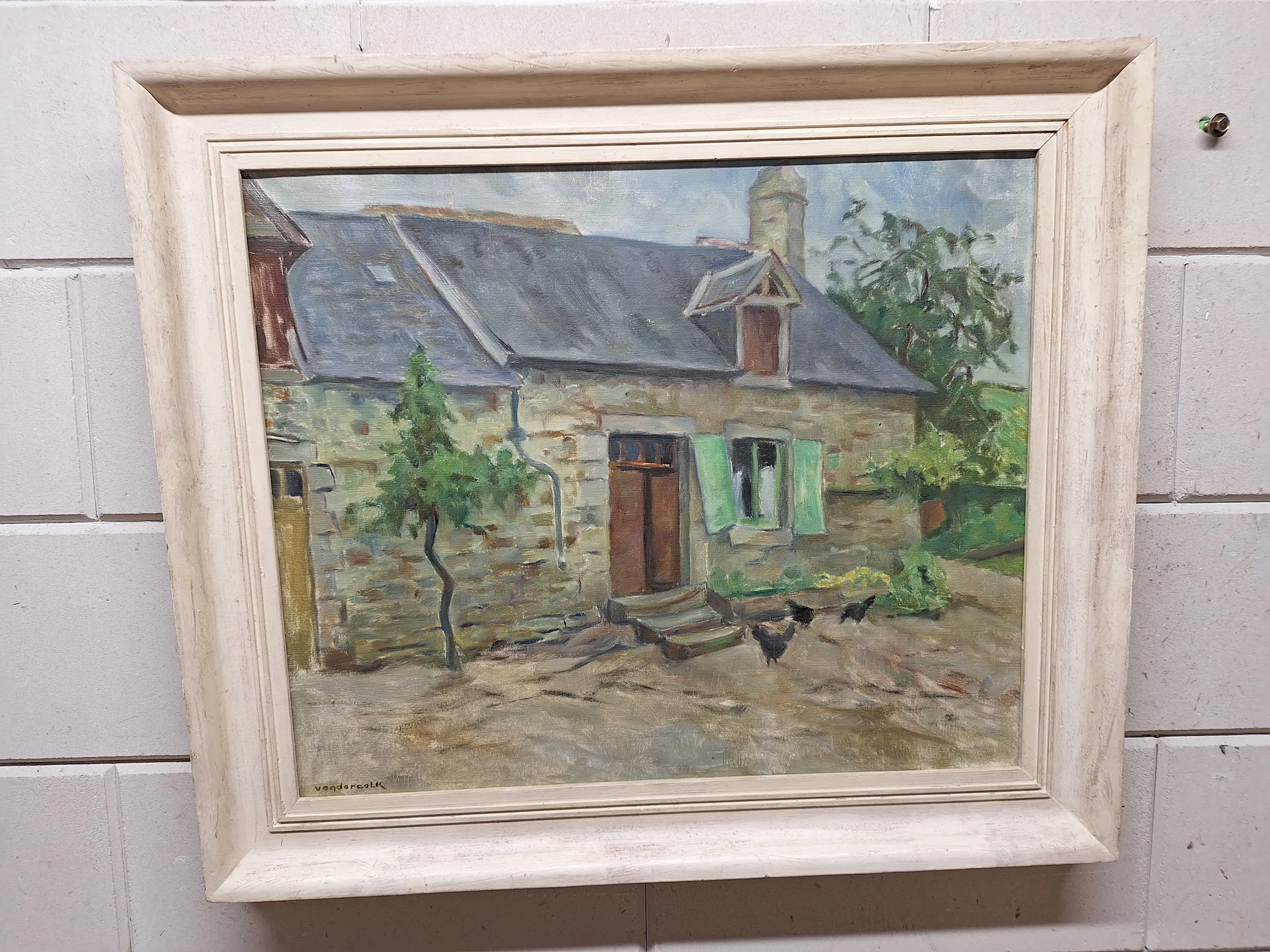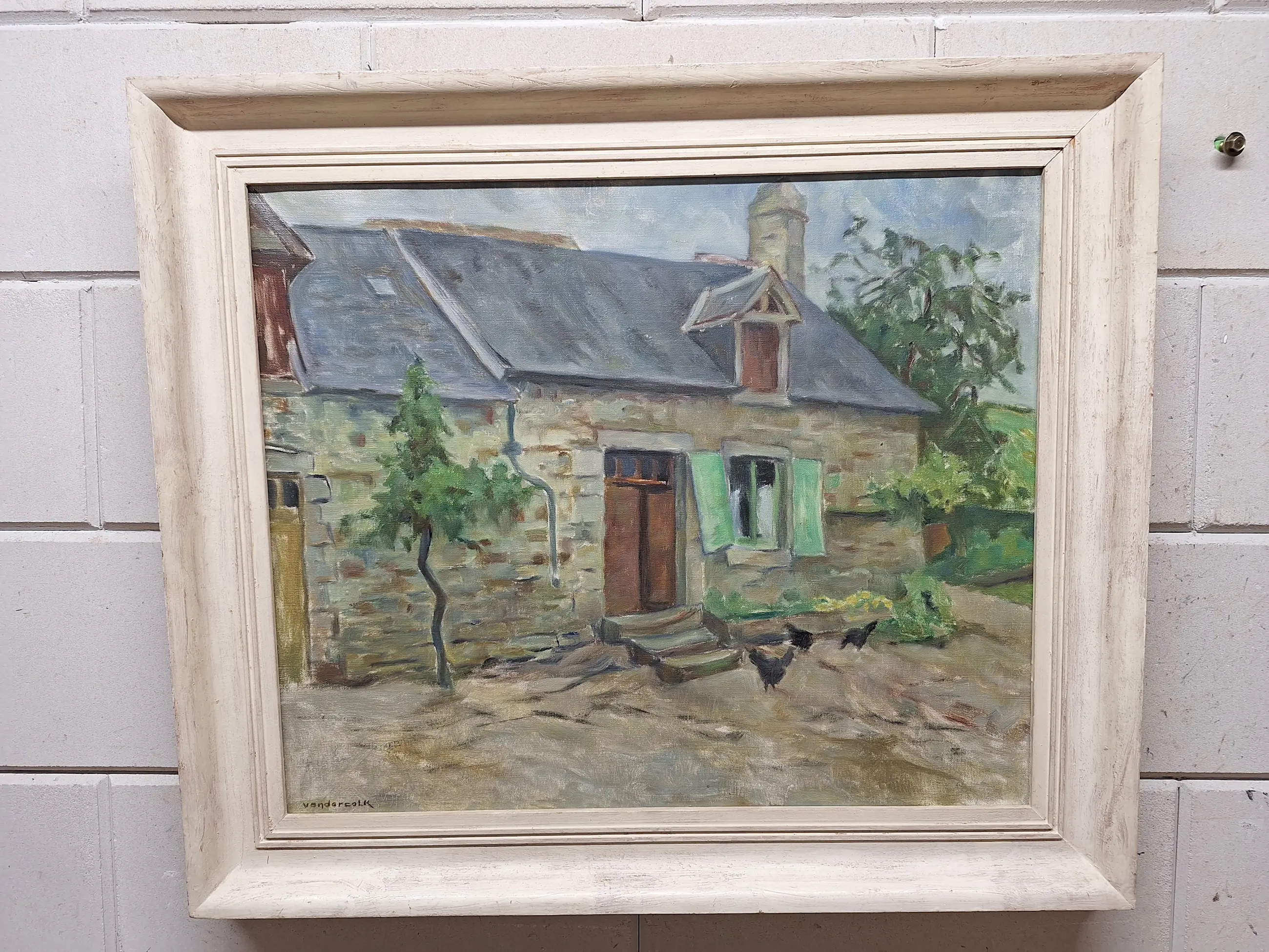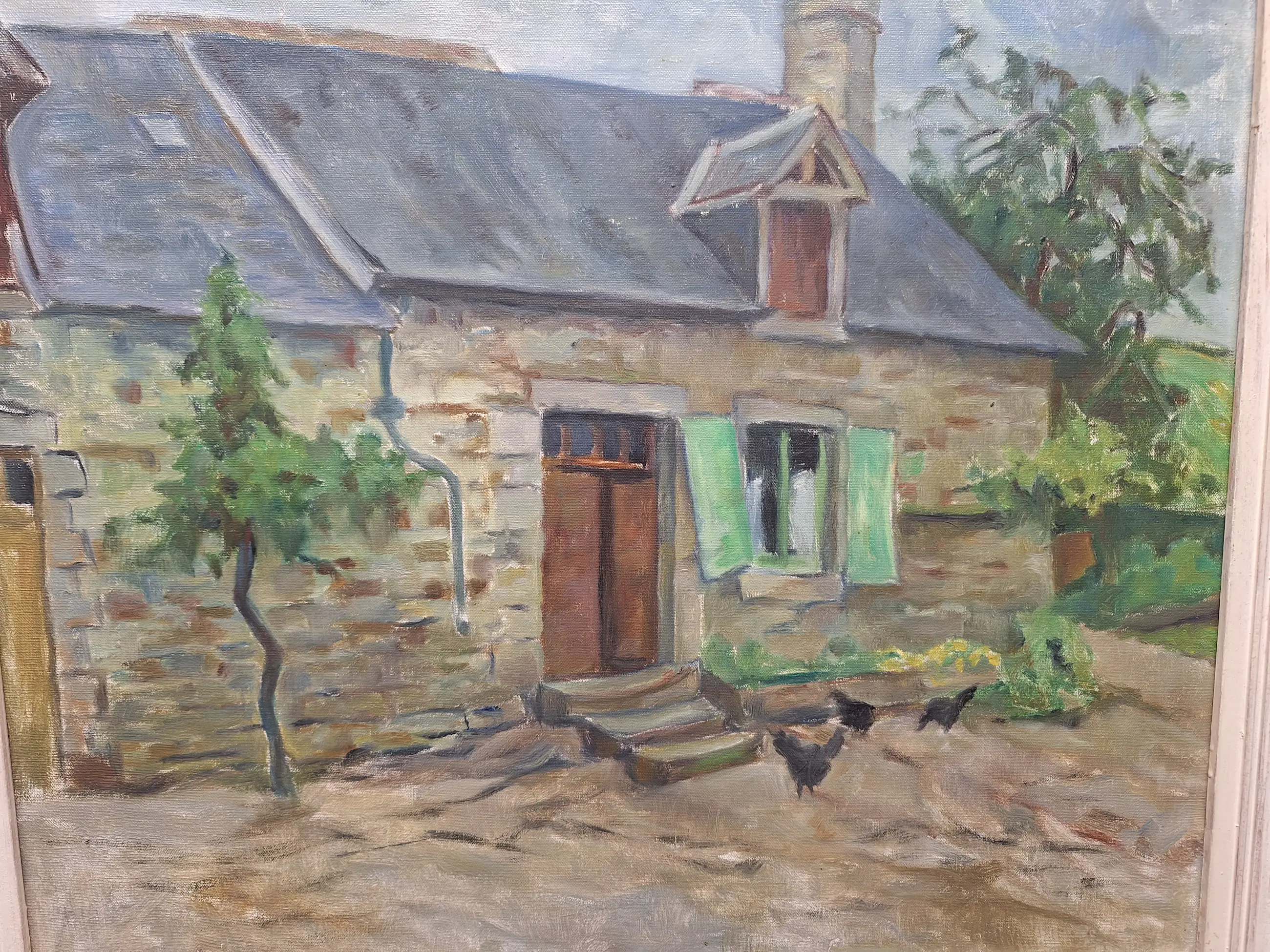 Een mooi schilderij met een boerderij met een paar kippen ervoor