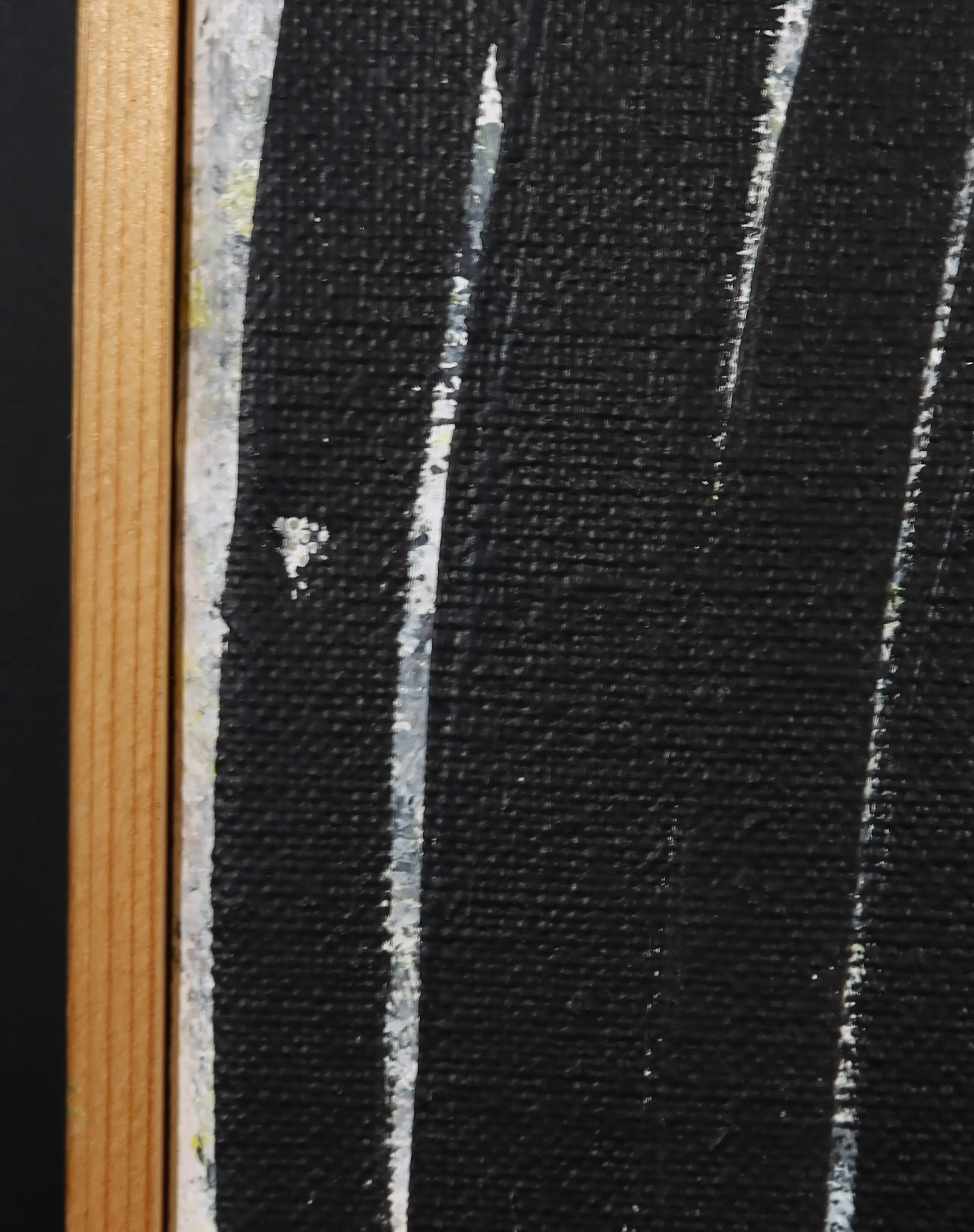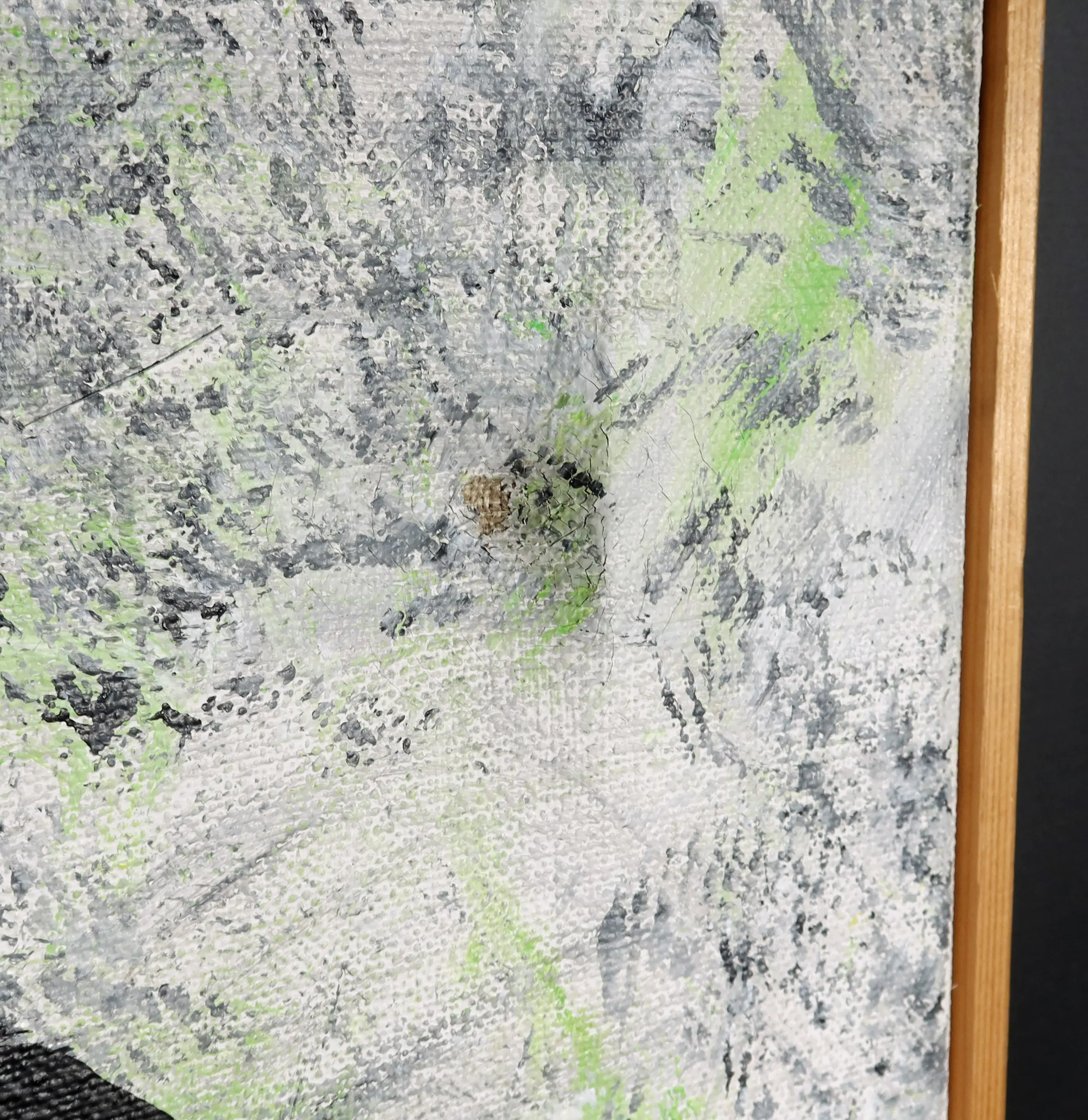 Twee flinken doordrukplekken te zien in zowel de linker- als rechterbovenhoek. Rechts is daarbij ook een gat in het doek ontstaan. | |