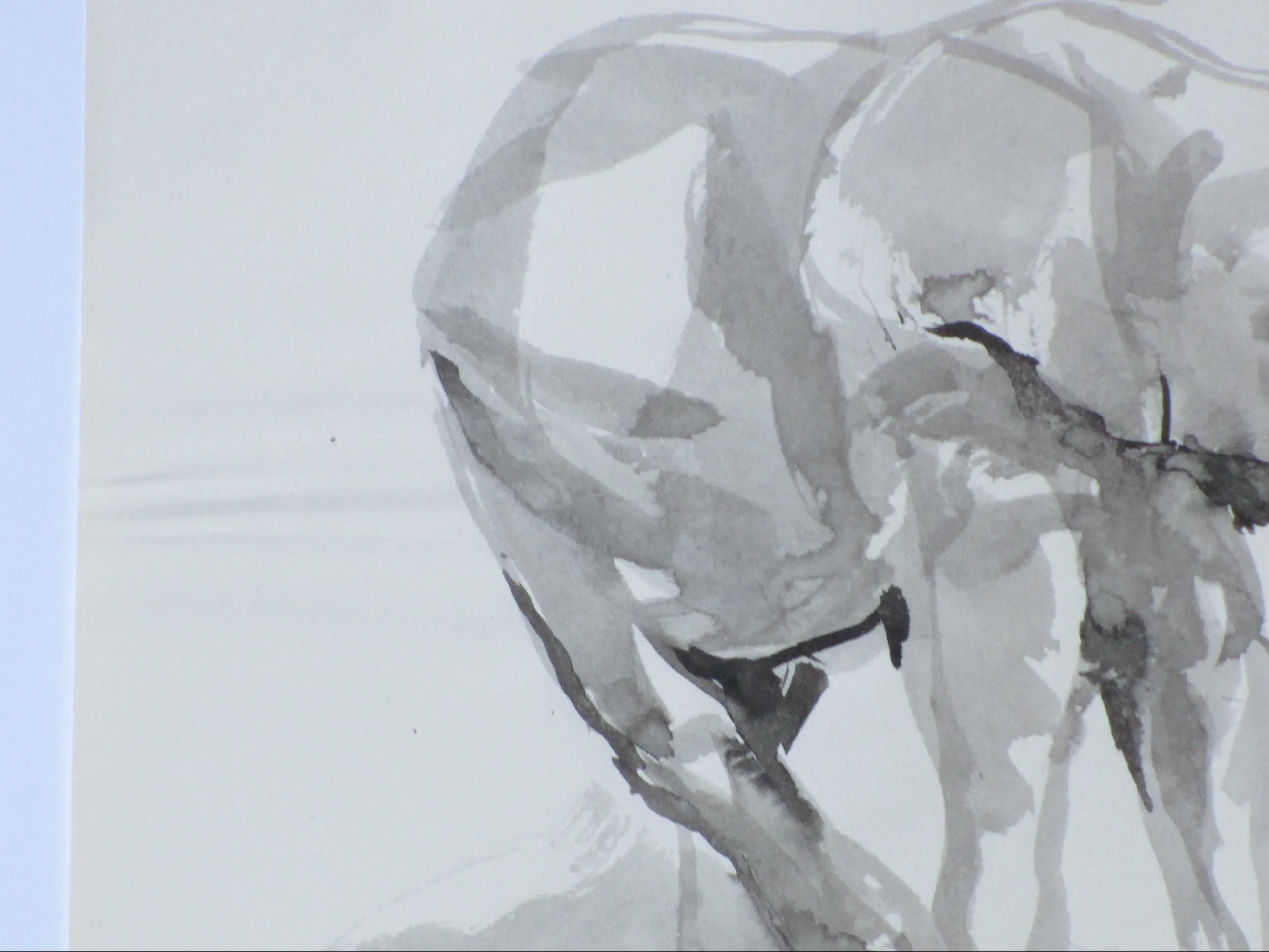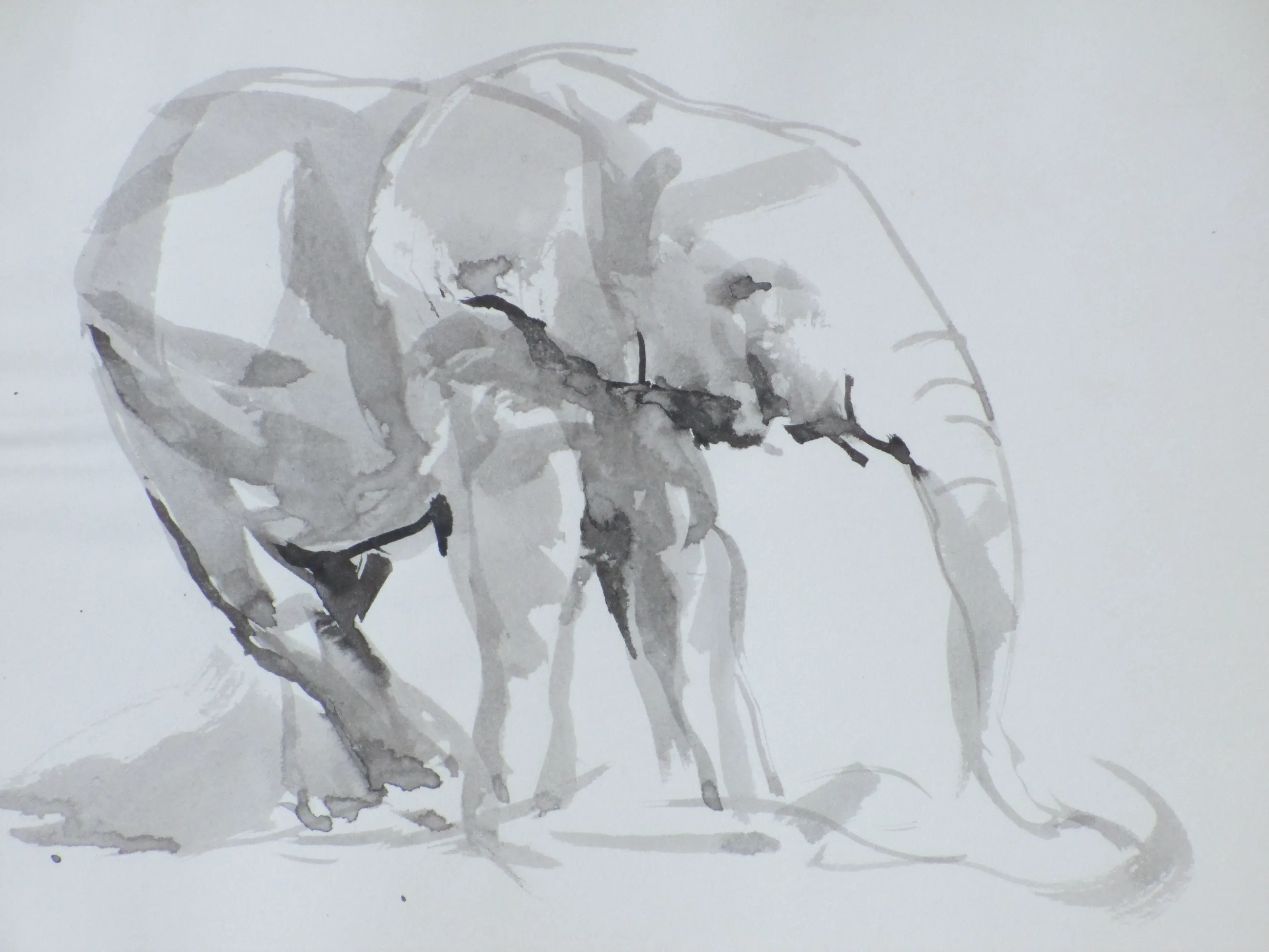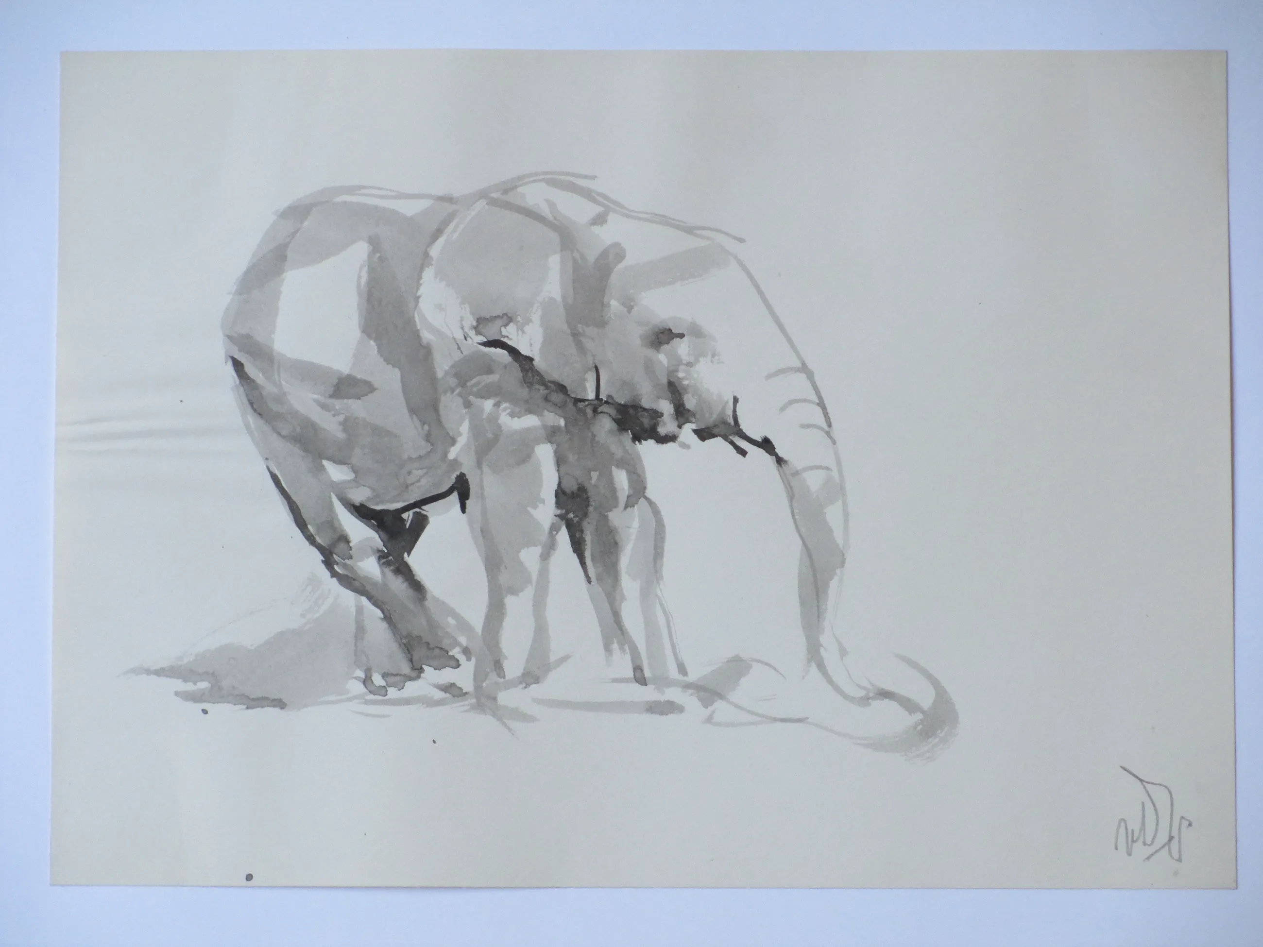 Gewassen inkttekening door Willem van Dort jr Voorstelling van een olifant Tekening in de hoeken geplakt op onderblad, beeldmaat 17x23, bladmaat 23x32 Onderbladmaat 25x35 Gesigneerd r.o.: 'WvD jr' Authenticiteit volledig gegarandeerd