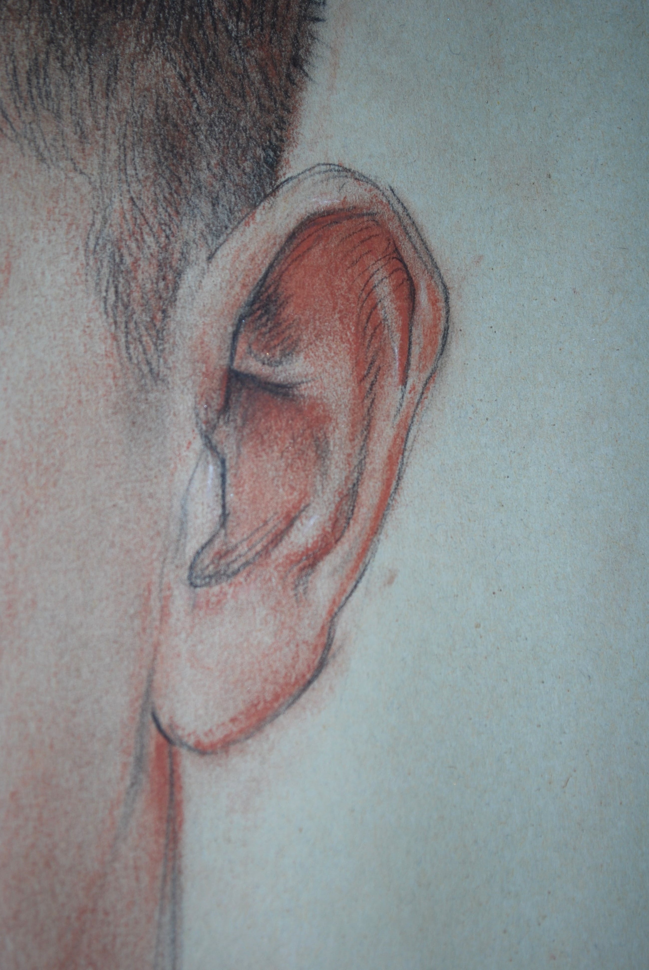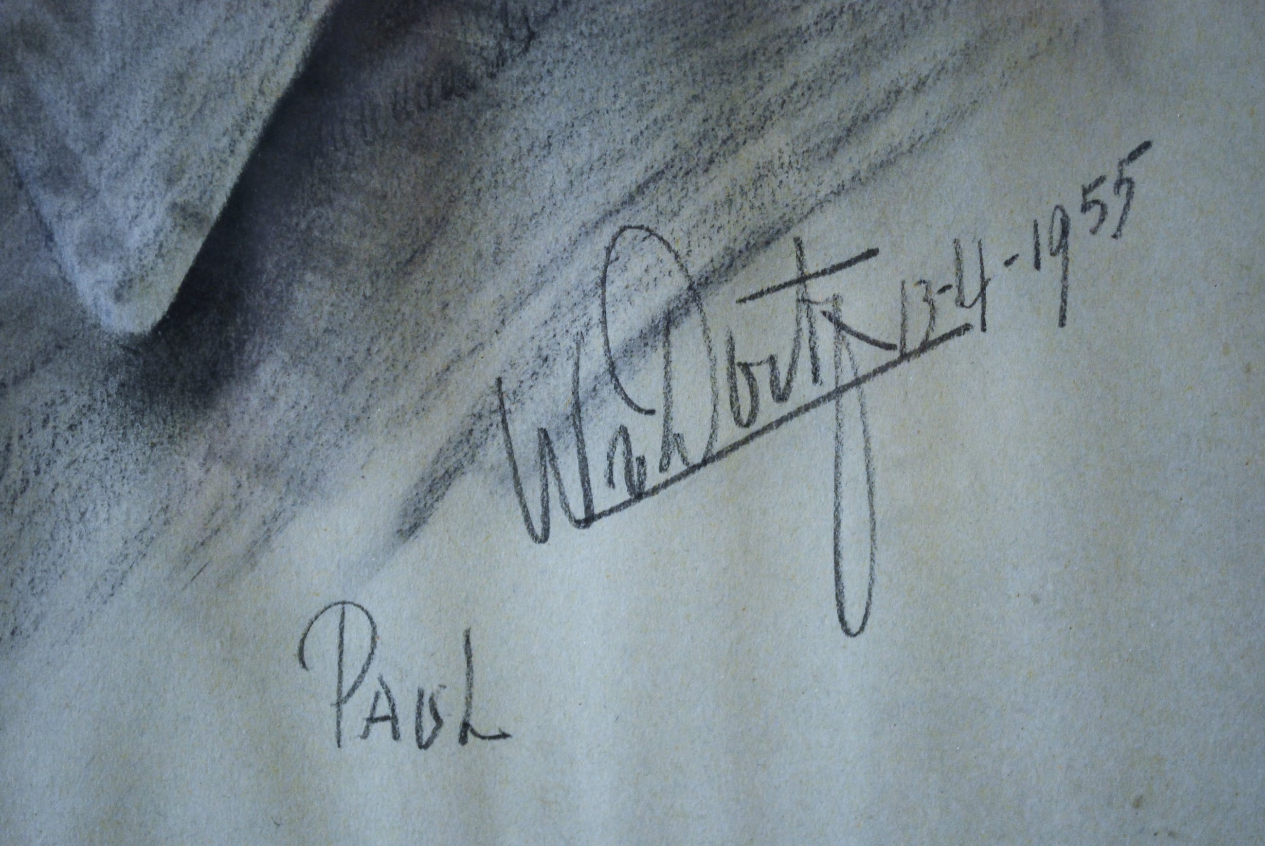 Knappe tekening in een licht beschadigde hardhouten lijst met linnen binnendeel. Achter glas.