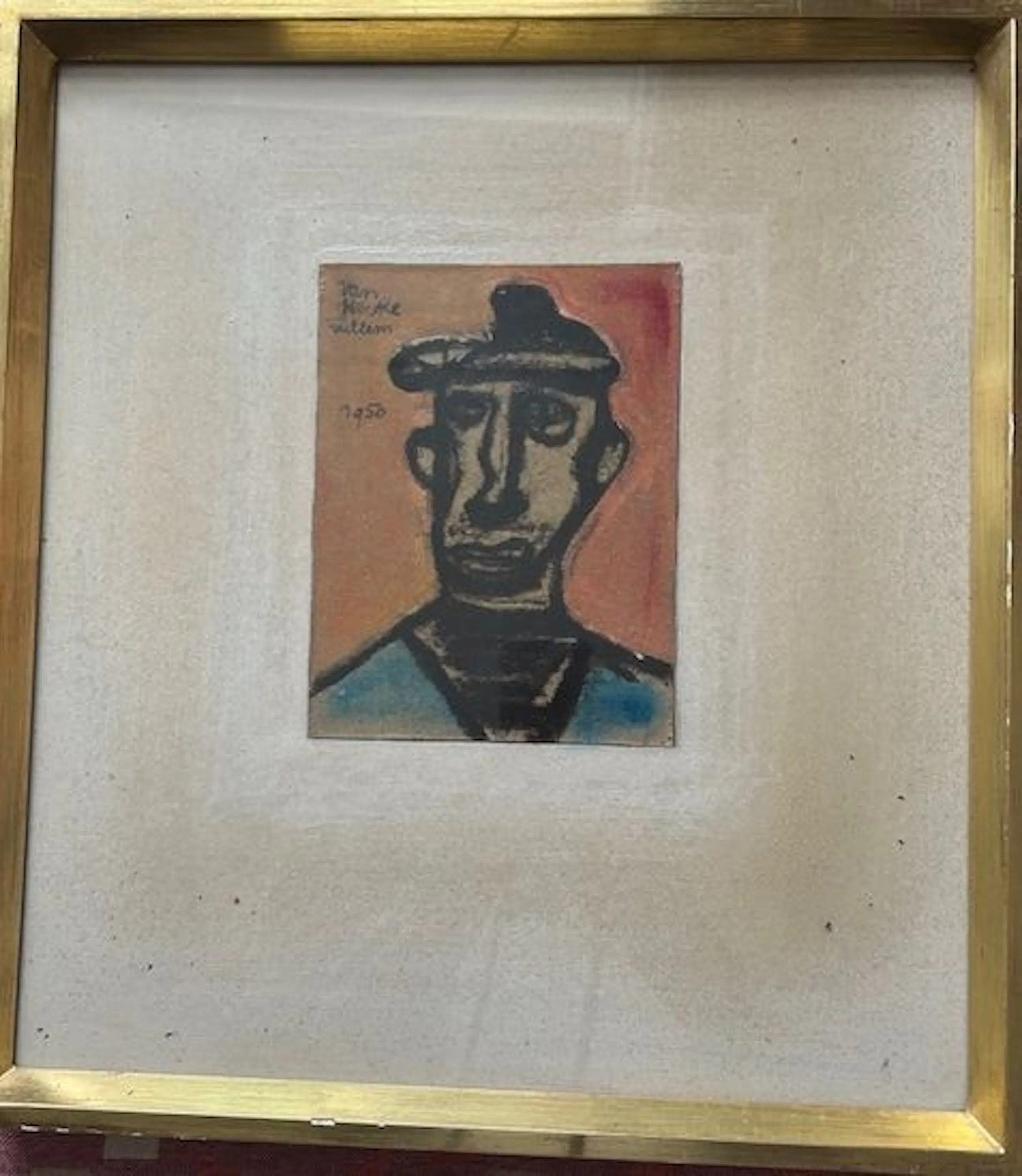 In een mooie goudkleurige omlijsting een typisch werk van Willem van Hecke. Een tragisch figuur, een doorleefd gezicht, titel van het werk is De Visser.