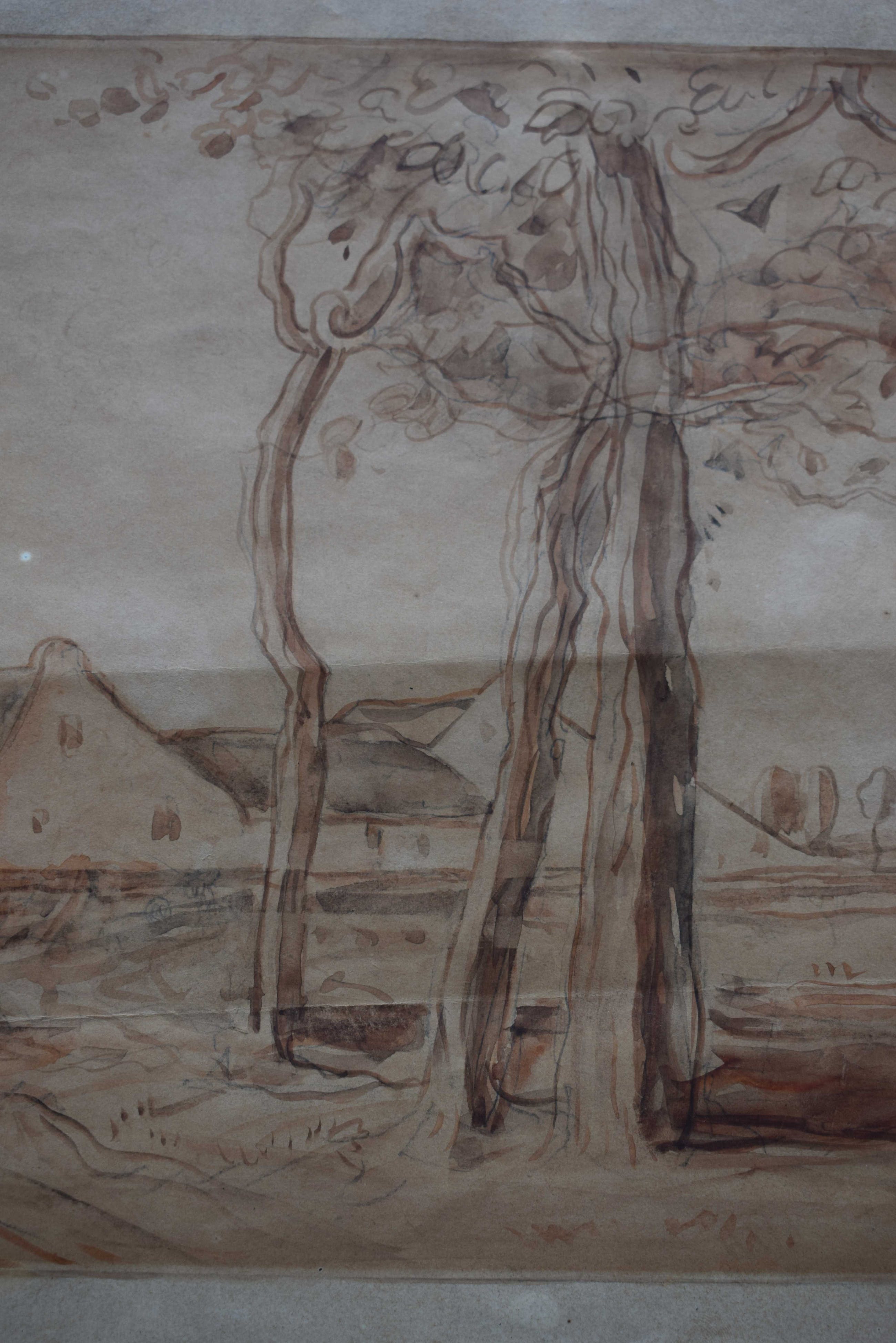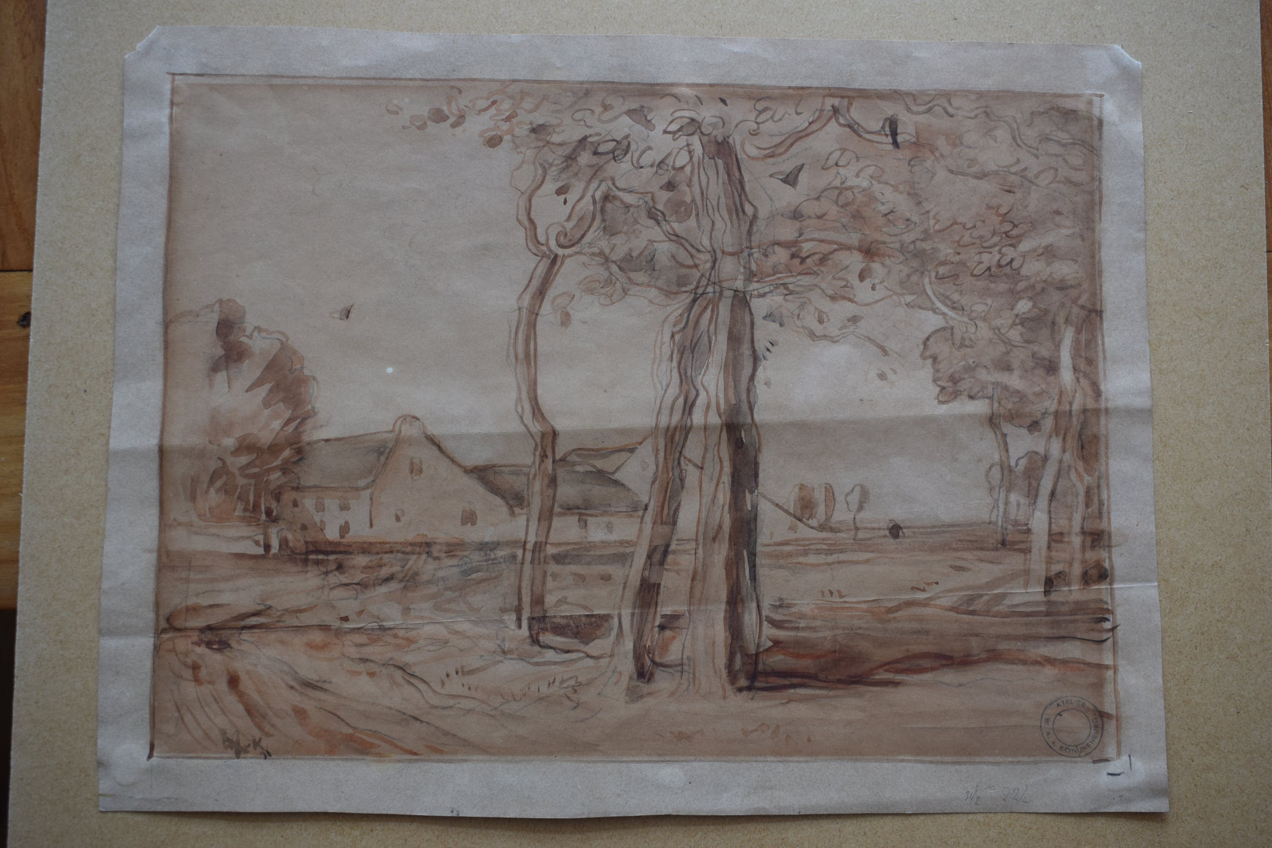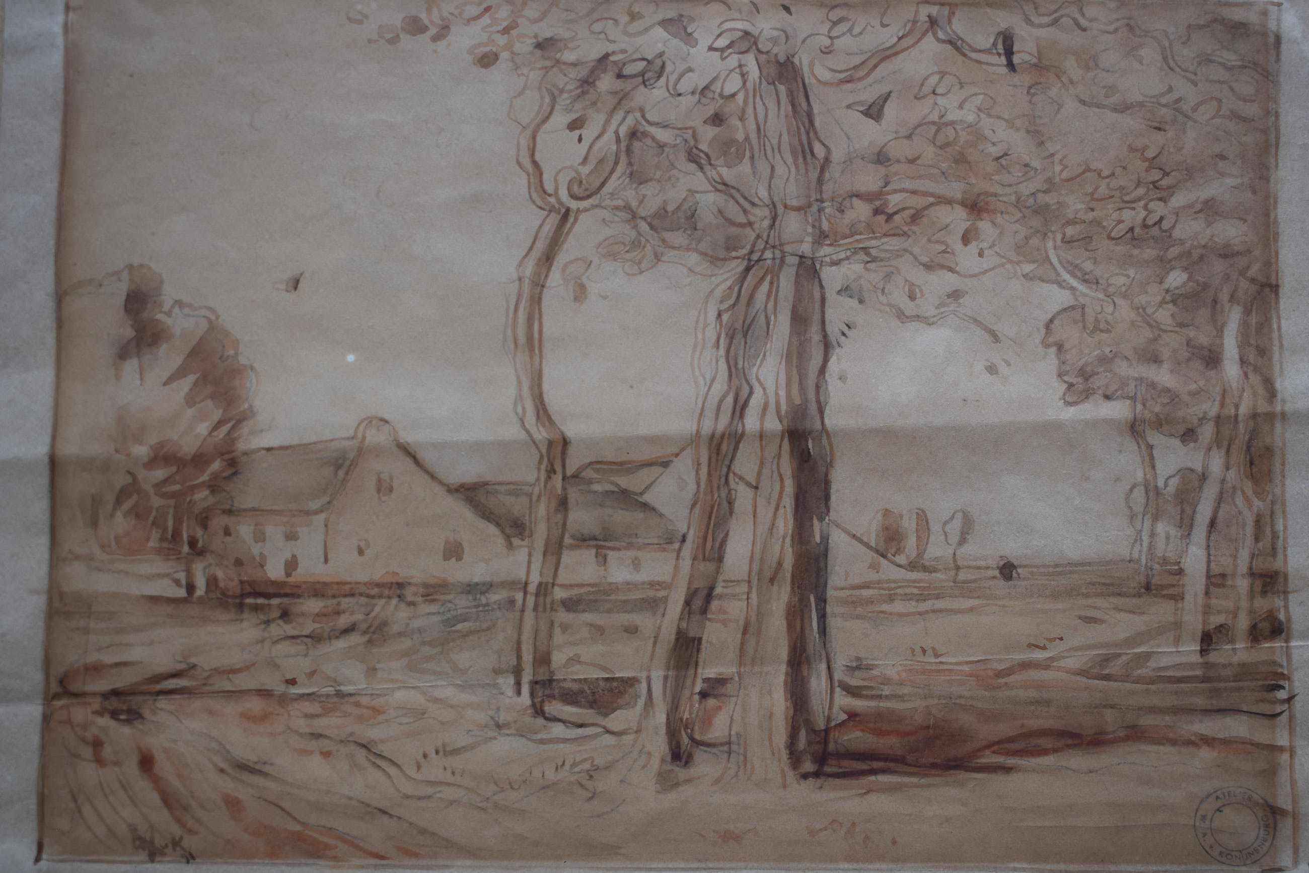 Op de afbeelding is een vlak Hollandslandschap te zien met een grote boerderij.