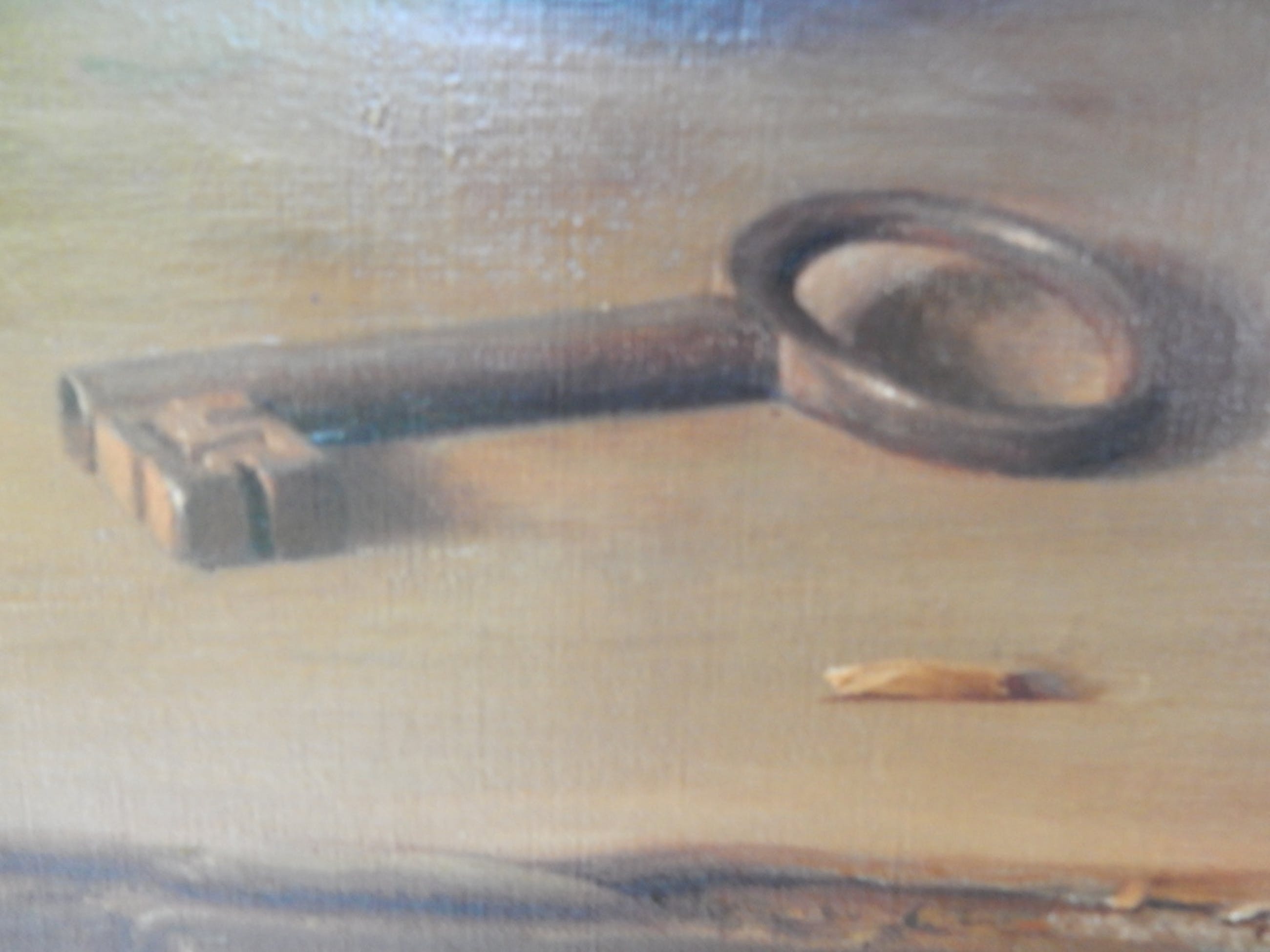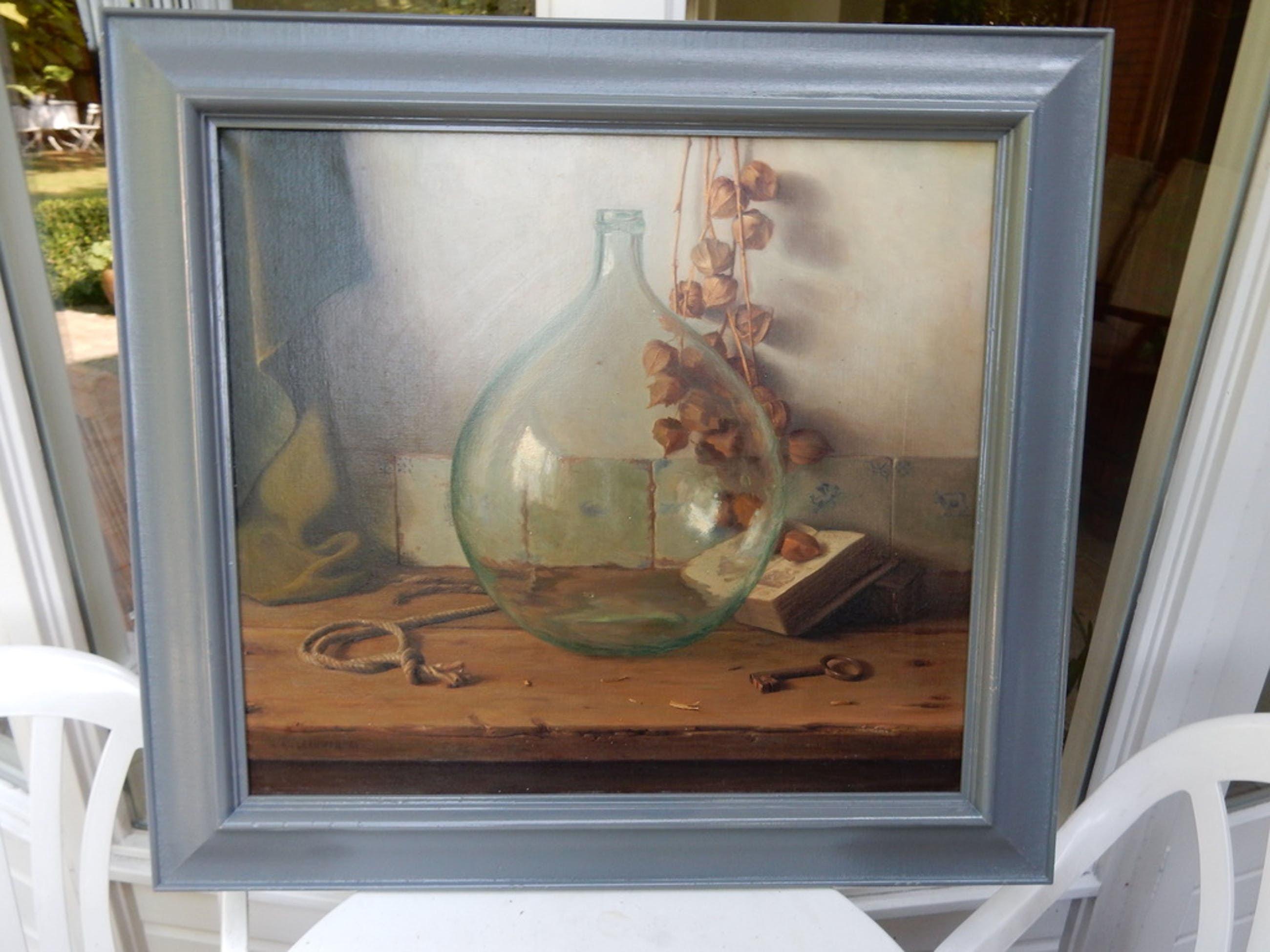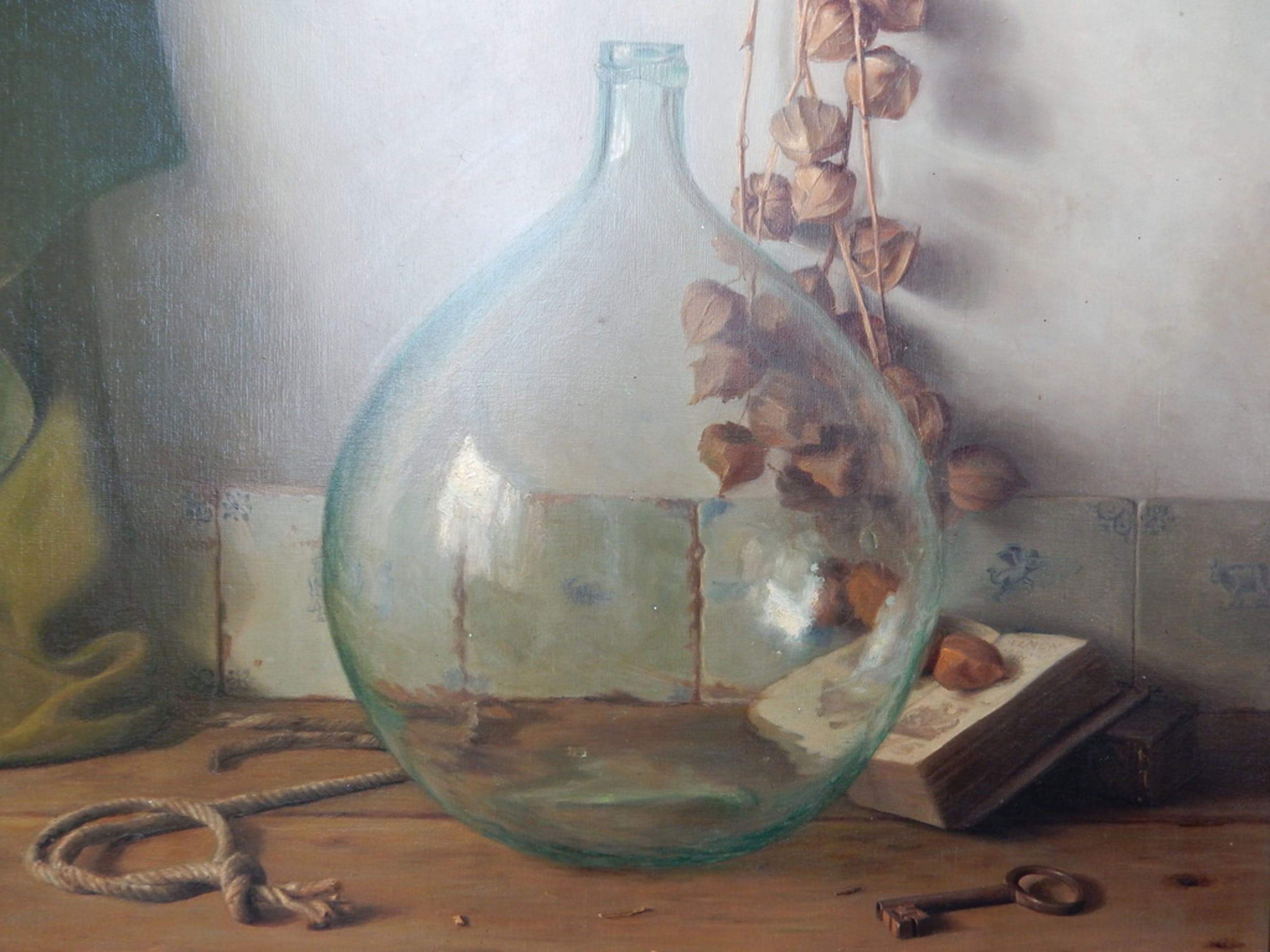 Stilleven met glazen fles, touw, sleutel, boek, en lampionnen.