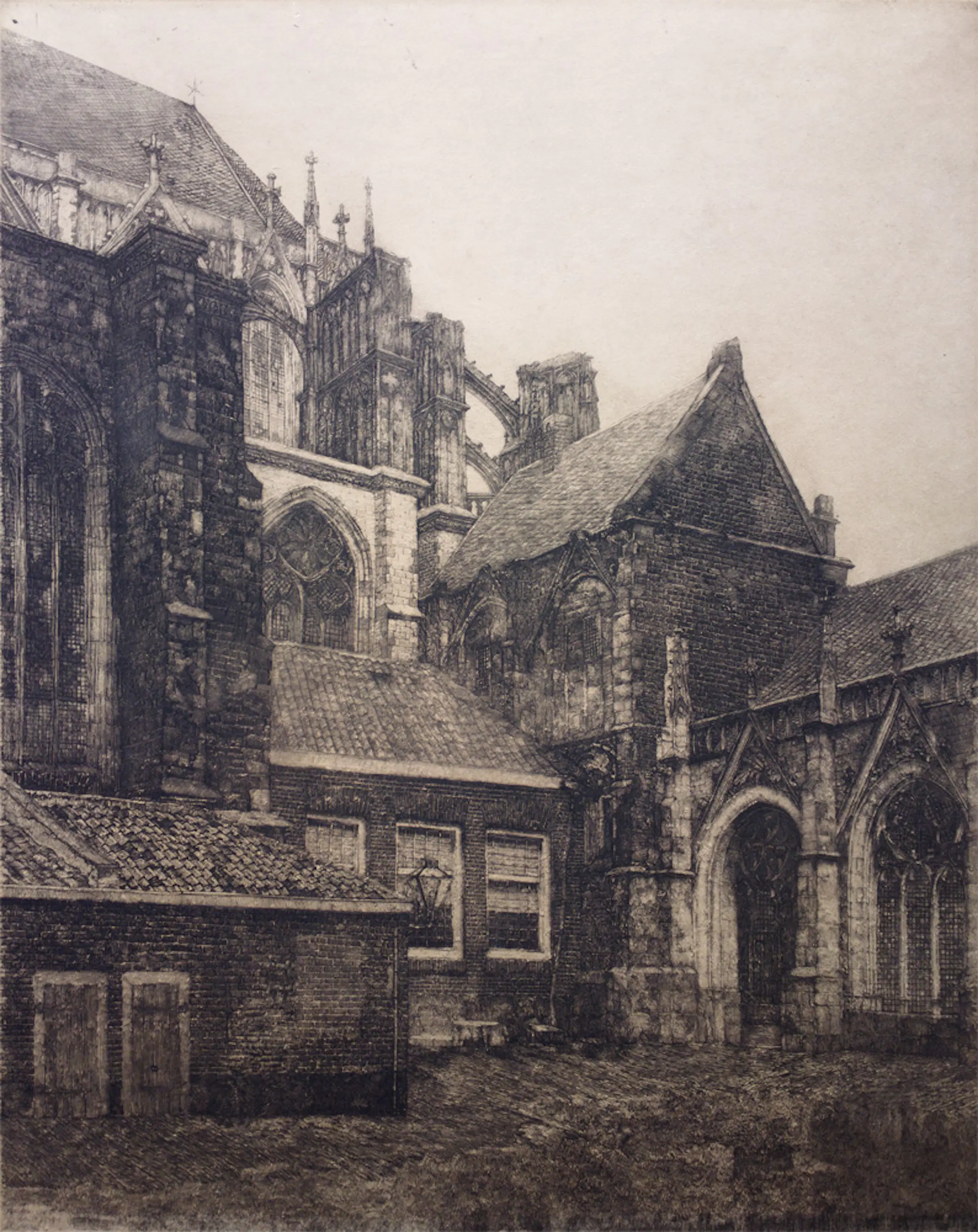 Over het werk: Ets van Willem van Leusden. Afgebeeld is een aanzicht van de Dom in Utrecht. Het werk is rechtsonder gesigneerd in potlood.