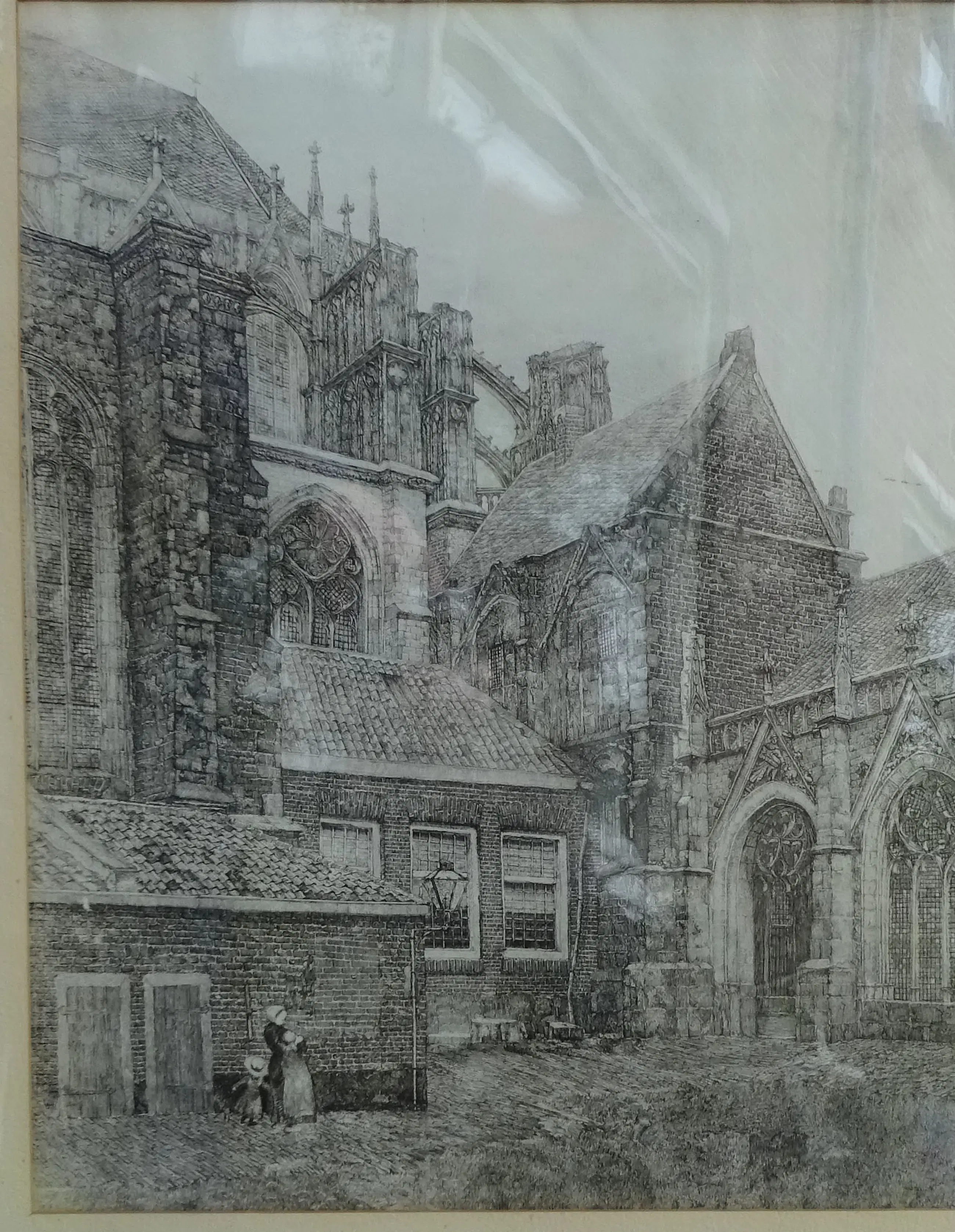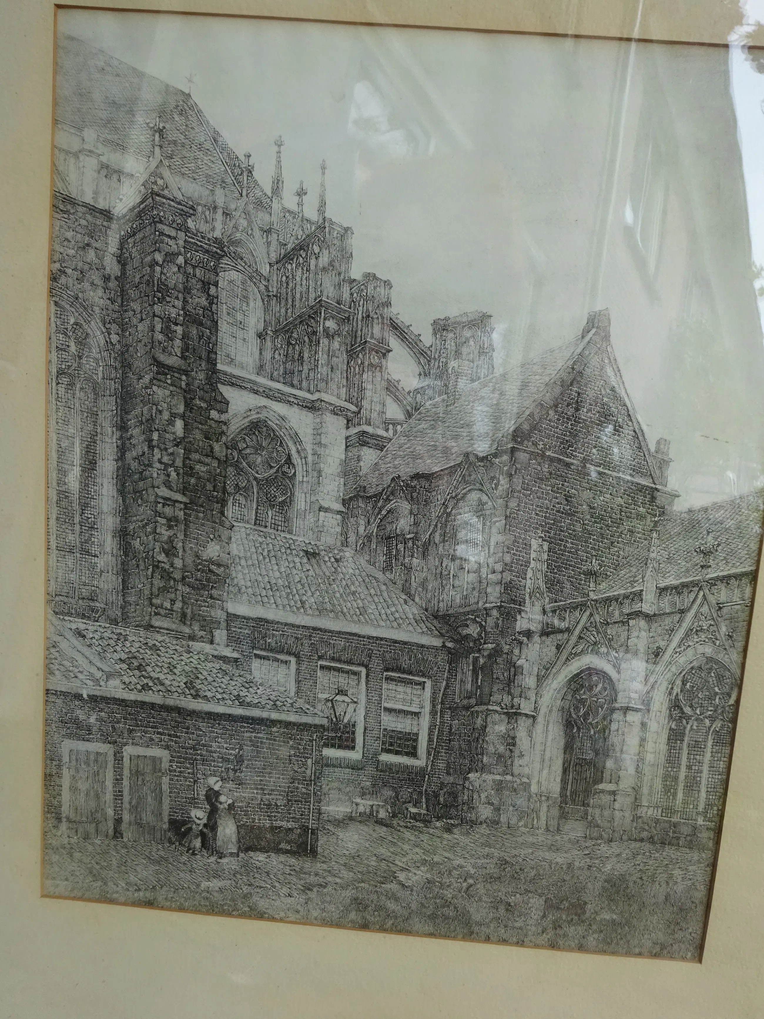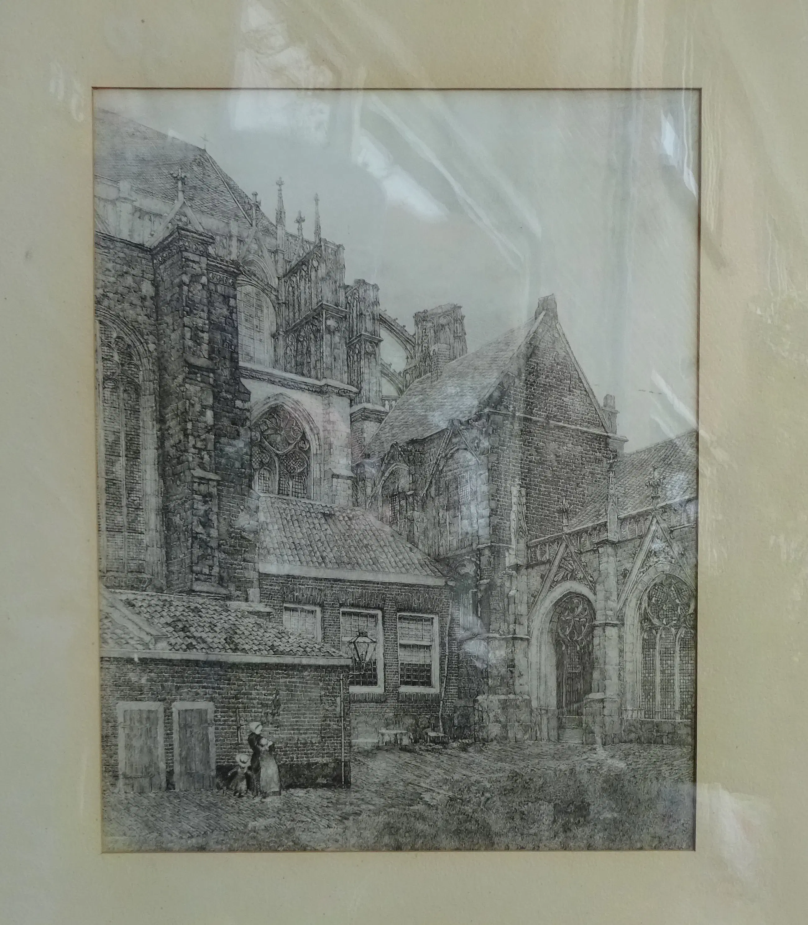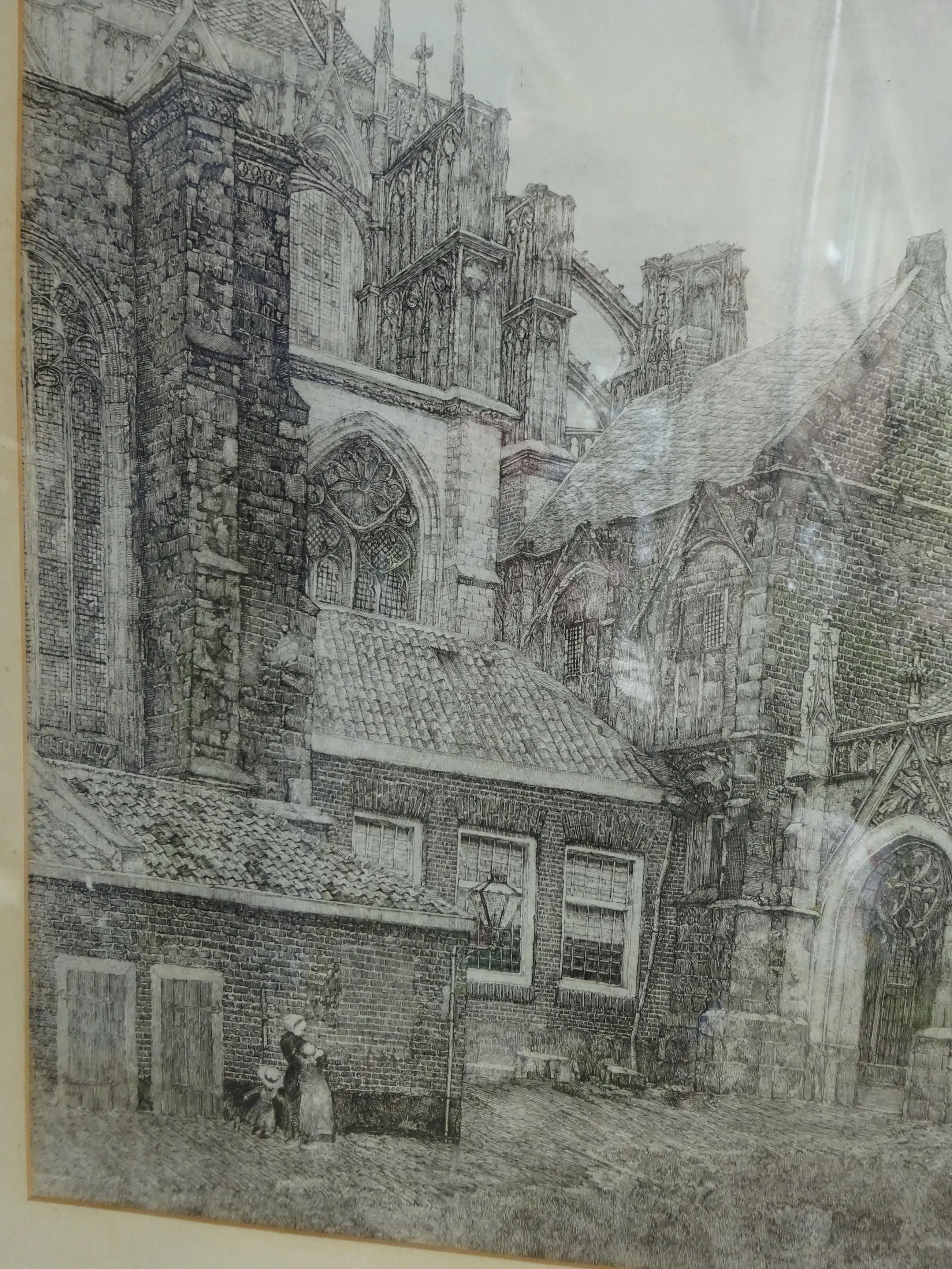 Grote afbeelding van De Dom van Utrecht met Kloostergang en imposante gotische architectuur. De prent is rond 1920 gemaakt en toont een historische, rustige stadsgezicht met figuren Het kunstwerk toont een gedetailleerd zicht op de kloostergang van Domkerk in Utrecht, specifiek de oostzijde met het koor en de kapellen. Techniek: Ets Drager: Papier Ingelijst: Ingelijst met passe-partout in mooie brede eikenhouten lijst Afmetingen: 49 x 39 cm (h x b) Incl. lijst: 86 x 74 cm (h x b)
