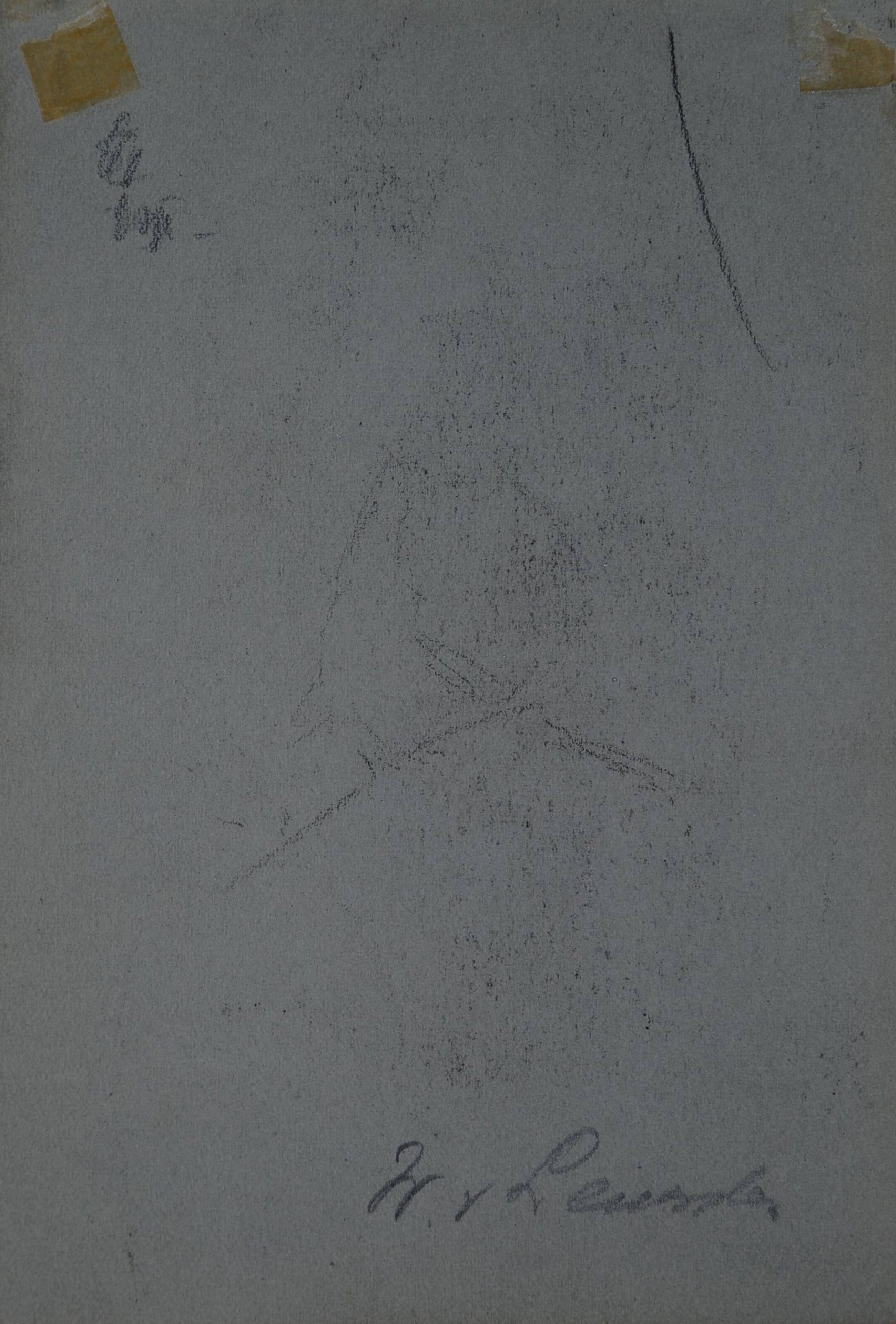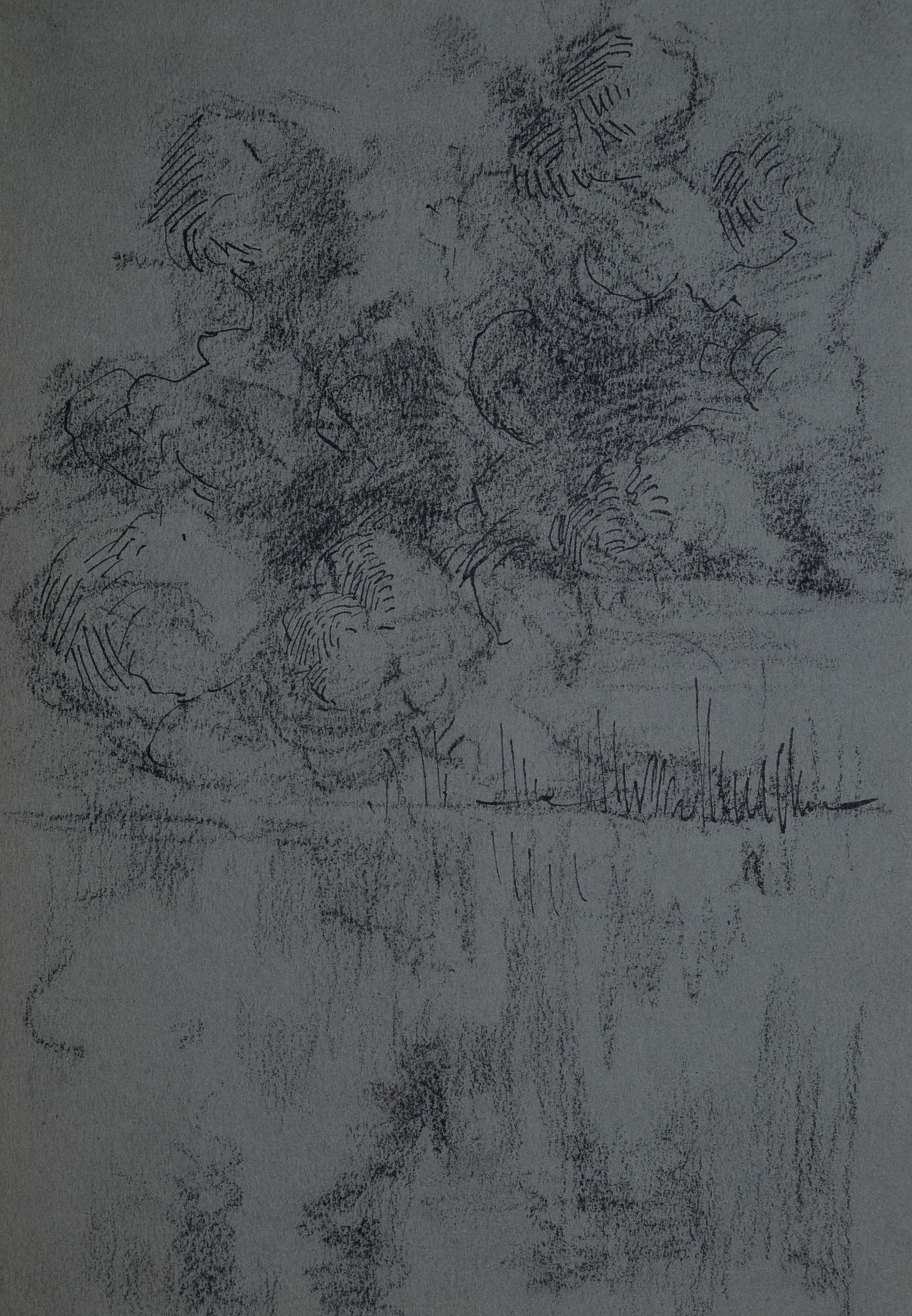 Schetsmatige tekening van een landschapje, op de achterzijde gesigneerd.