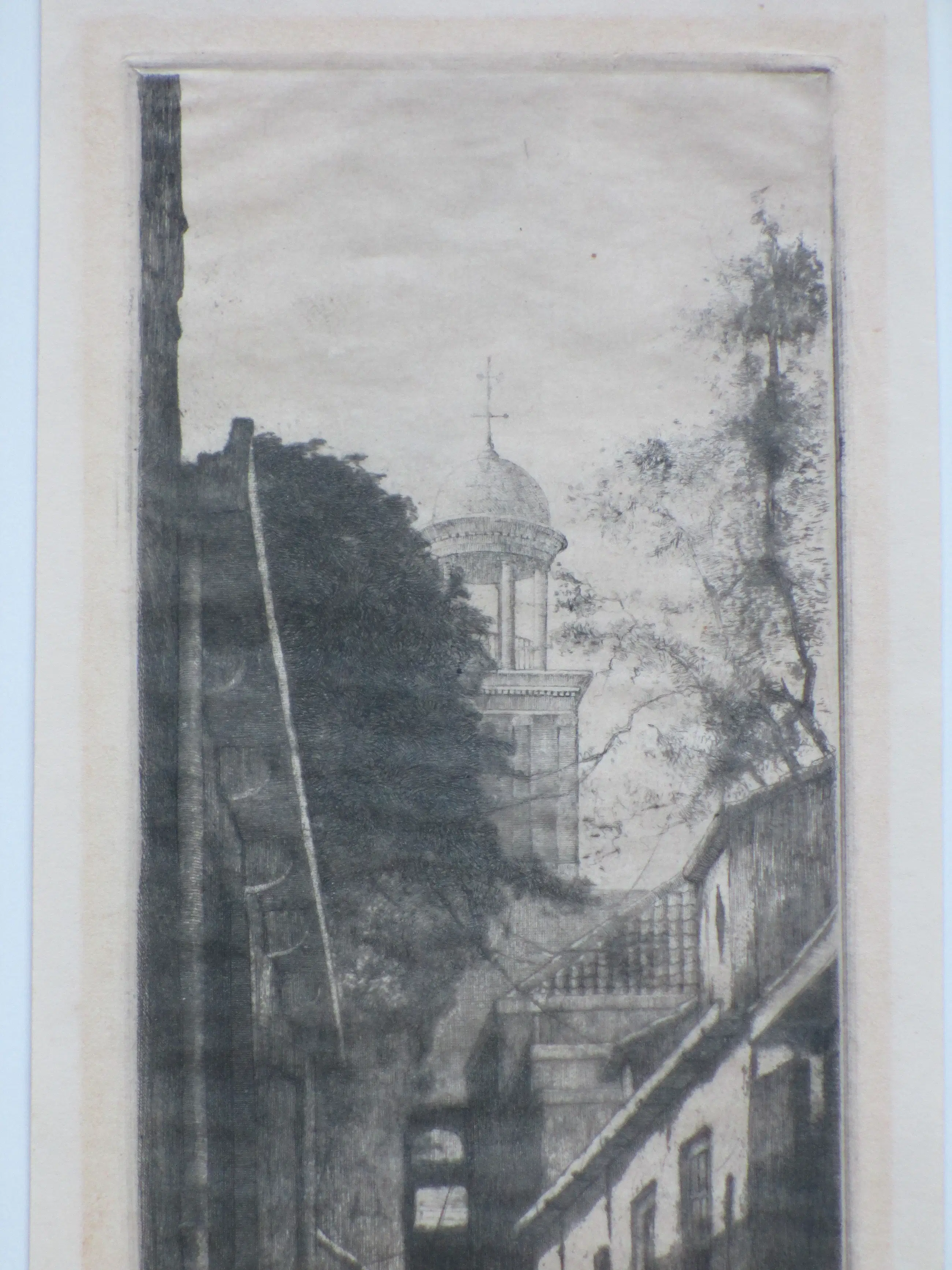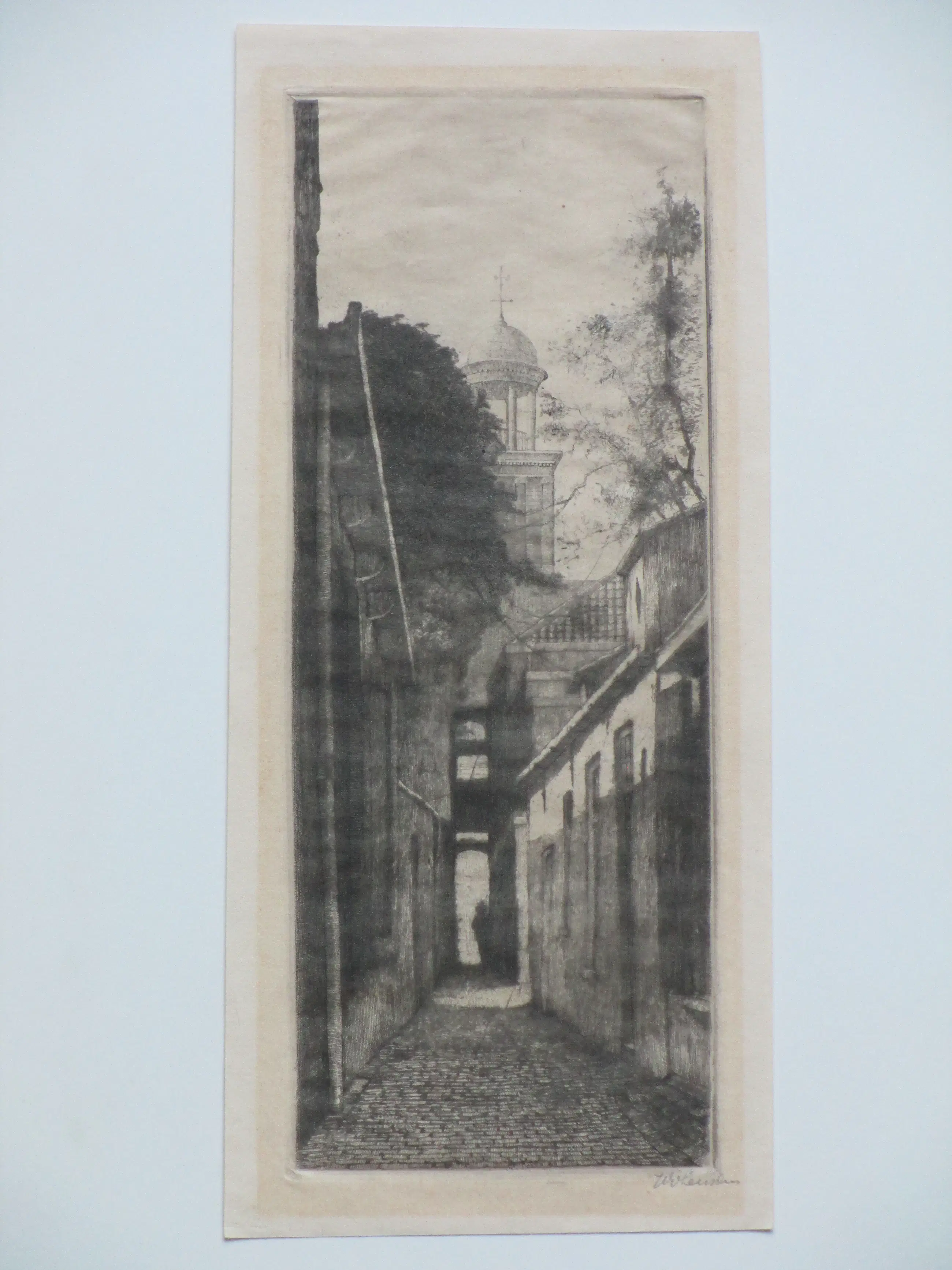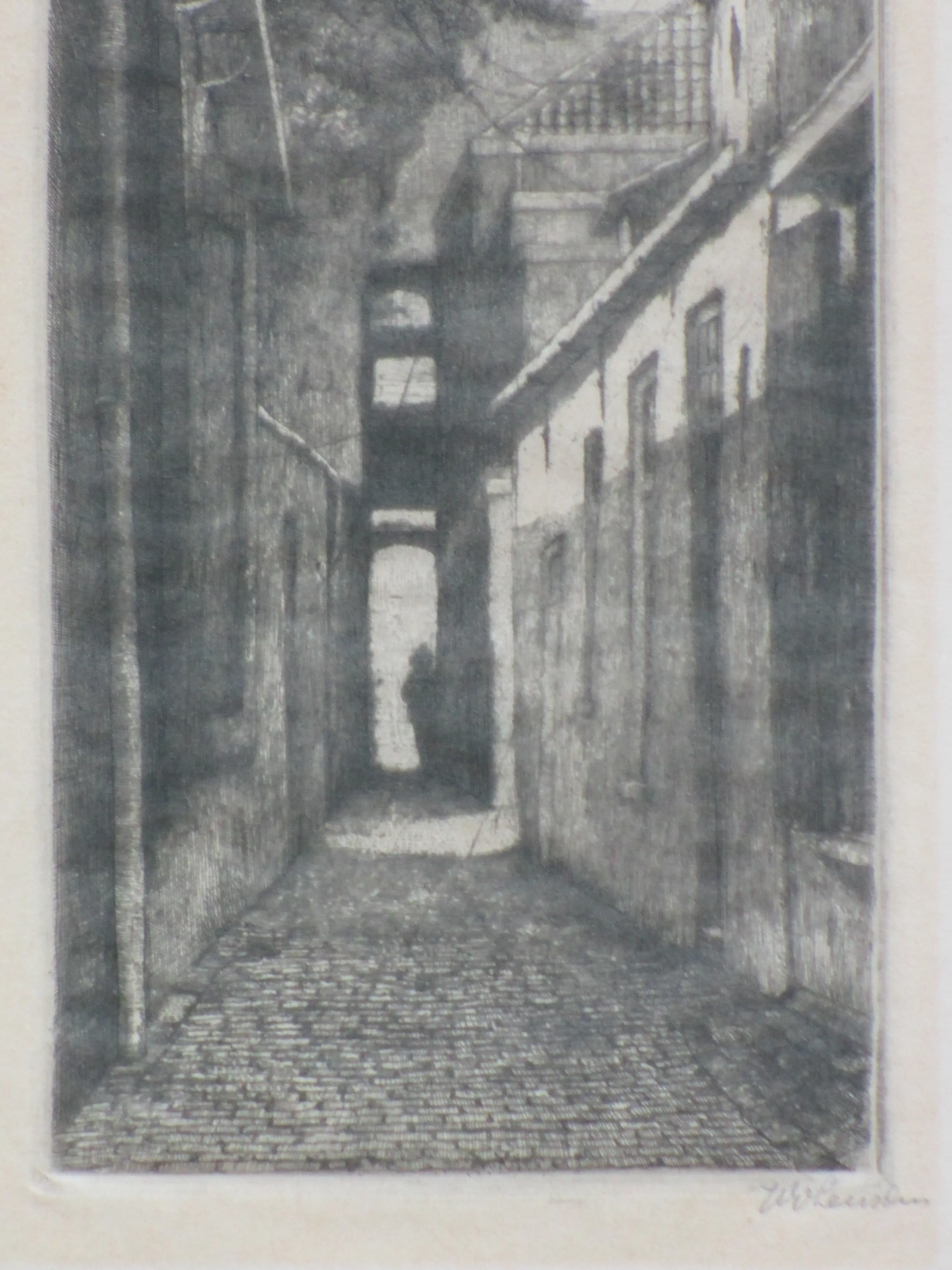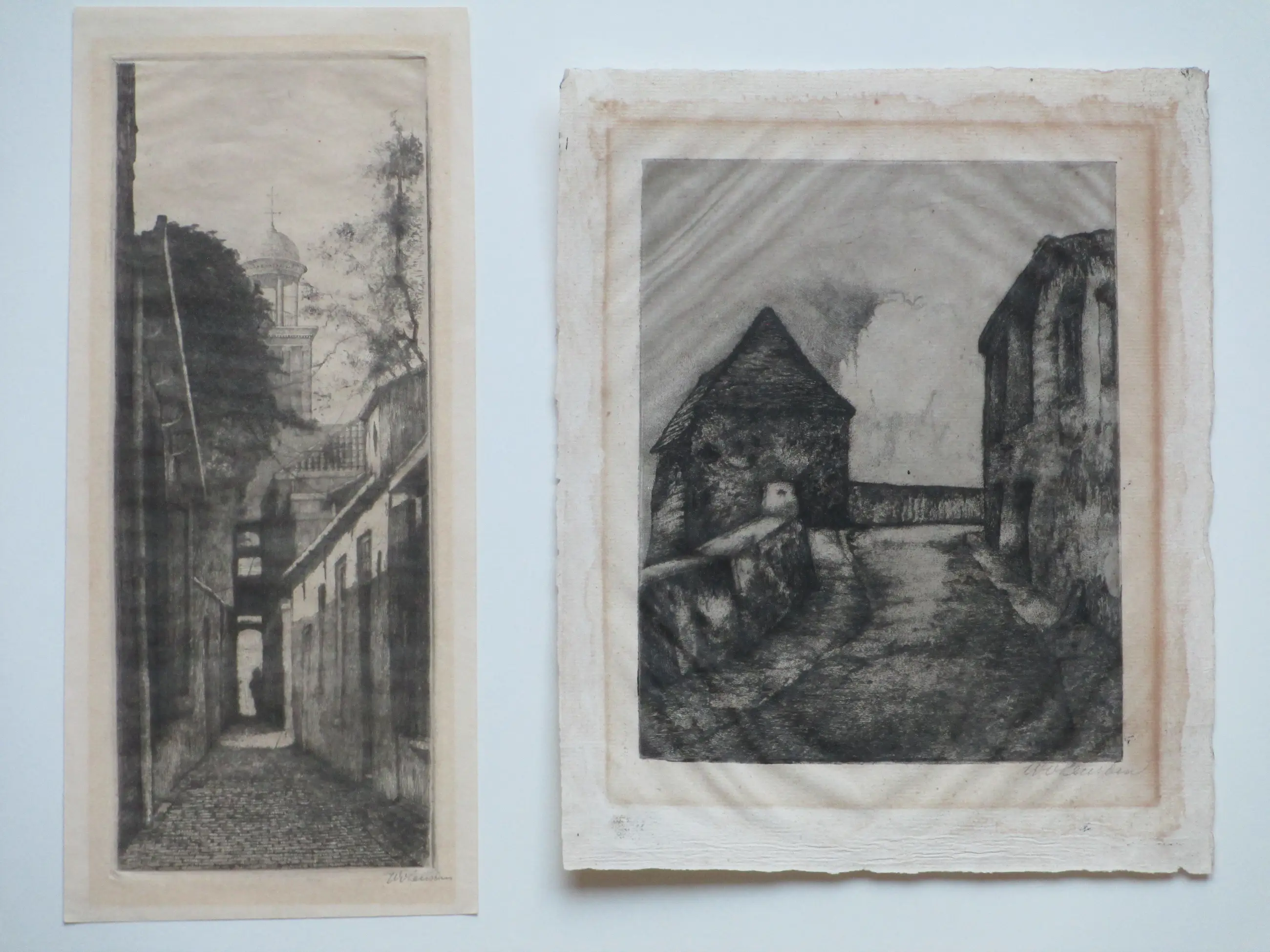Twee etsen door Willem van Leusden Voorstelling van een stadssteeg met toren op de achtergrond en een buitenlandse stadsstraat Beiden losbladig, beeldmaten 25x10 en 18x14.5, bladmaten 27x12 en 24x20 Beiden potloodgesigneerd r.o.: 'W. vLeusden'