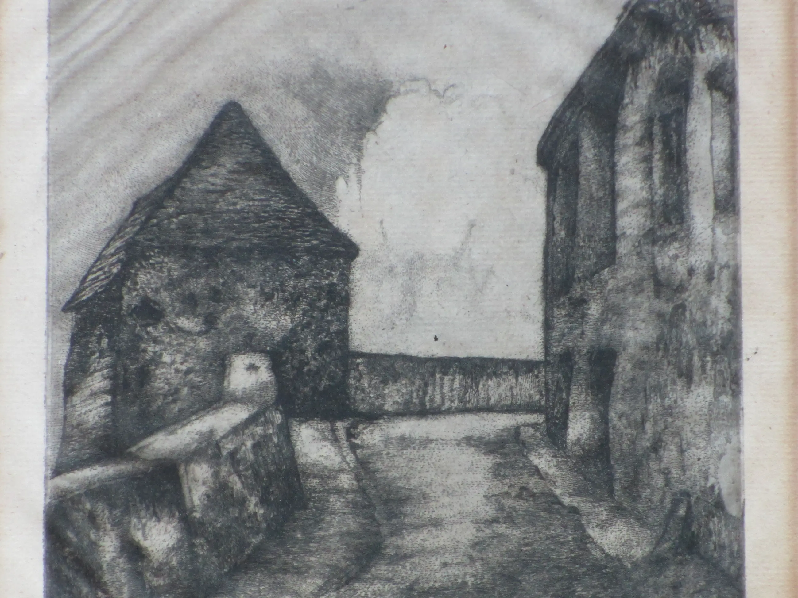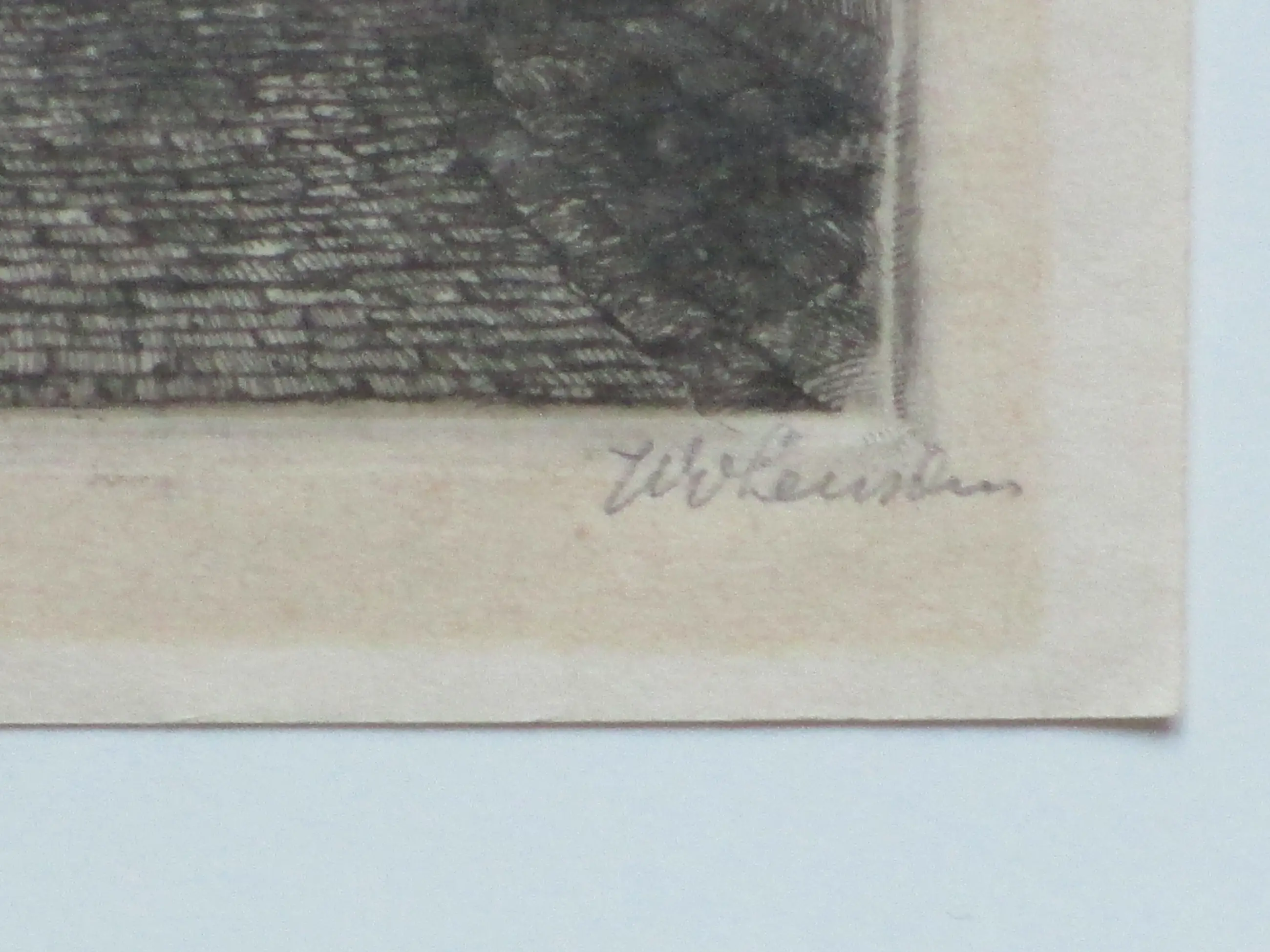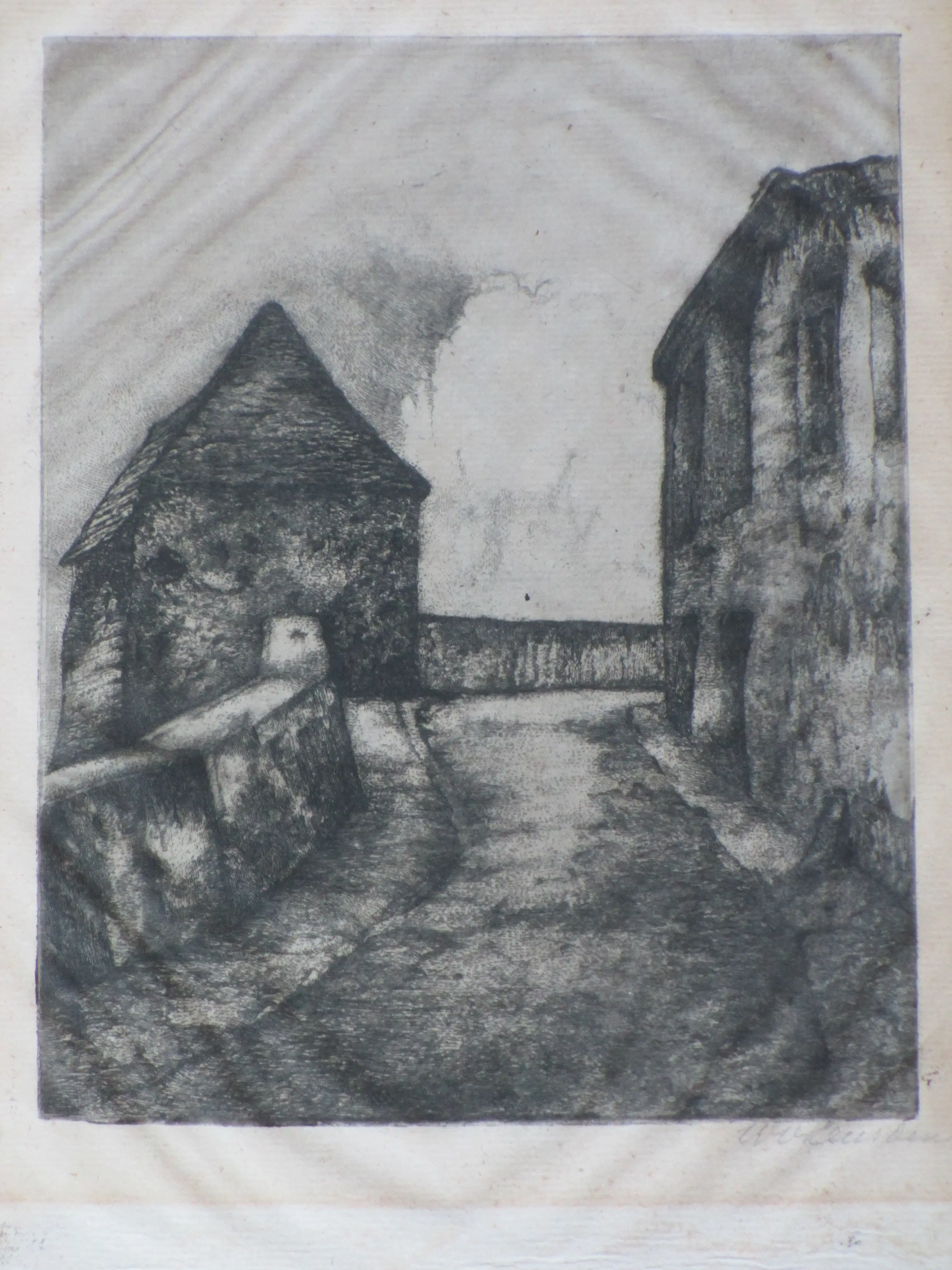 Rechter-ets heeft lichte golflijnen in het papier door eerdere inlijsting en is licht verkleurd.