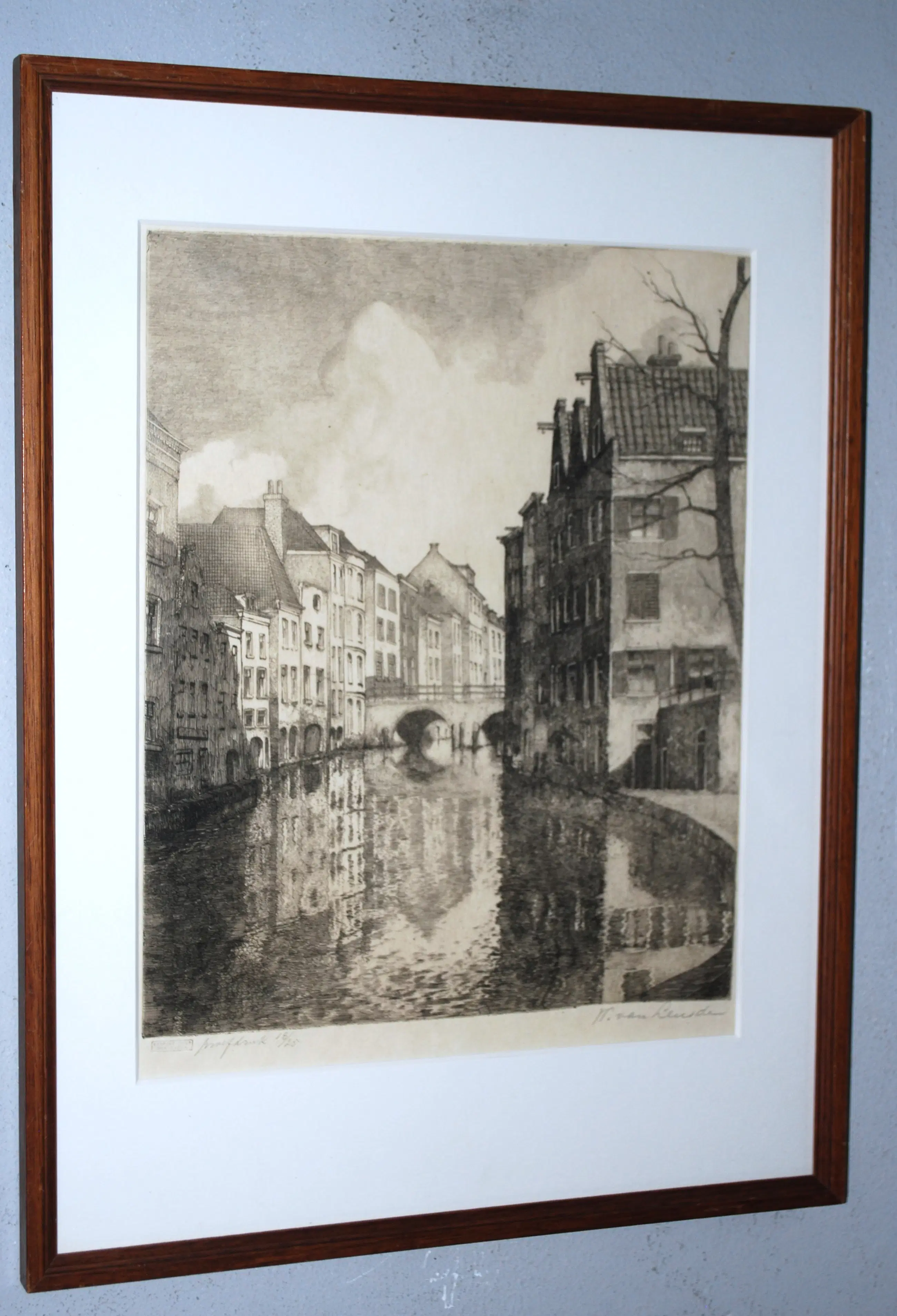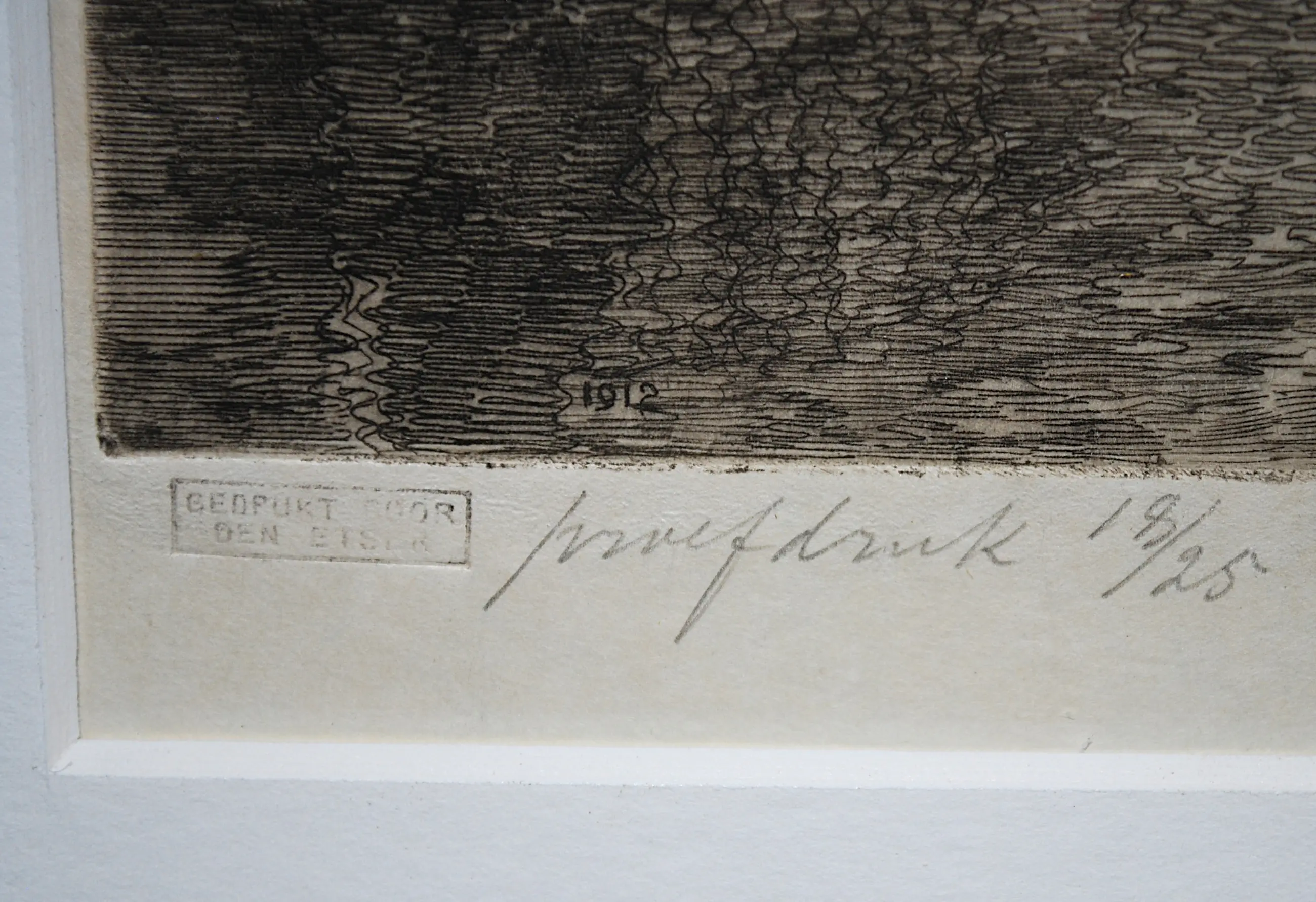 Dit betreft een genummerde proefdruk: 25 stuks waarvan dit nr. 18 is. Buiten deze proefdrukken waren er naar mijn weten nog 100 reguliere afdrukken. De hier aangeboden ets is verkocht door de beroemde kunsthandel Caramelli &Tessaro (v/h Frans Buffa). Bladmaat 35x30 cm, in nette schone staat. Minimaal bevestigd aan de bovenrand achter een nieuw passepartout. Gesteund door een zuurvrij karton. Achter glas, in een hardhouten lijst.