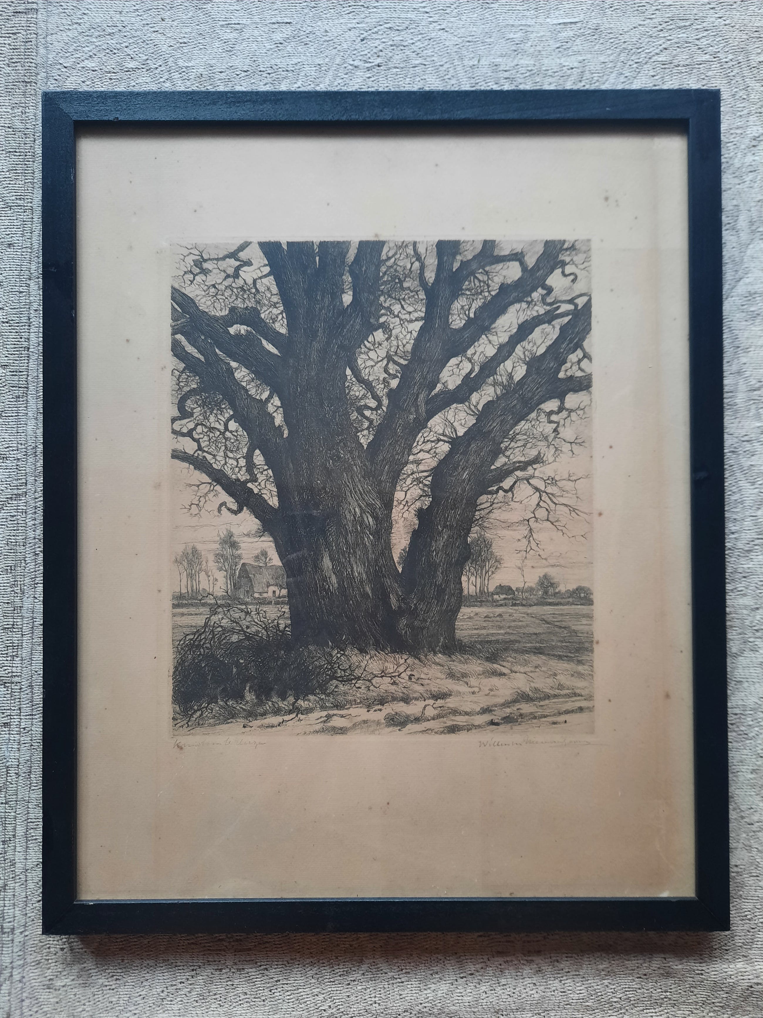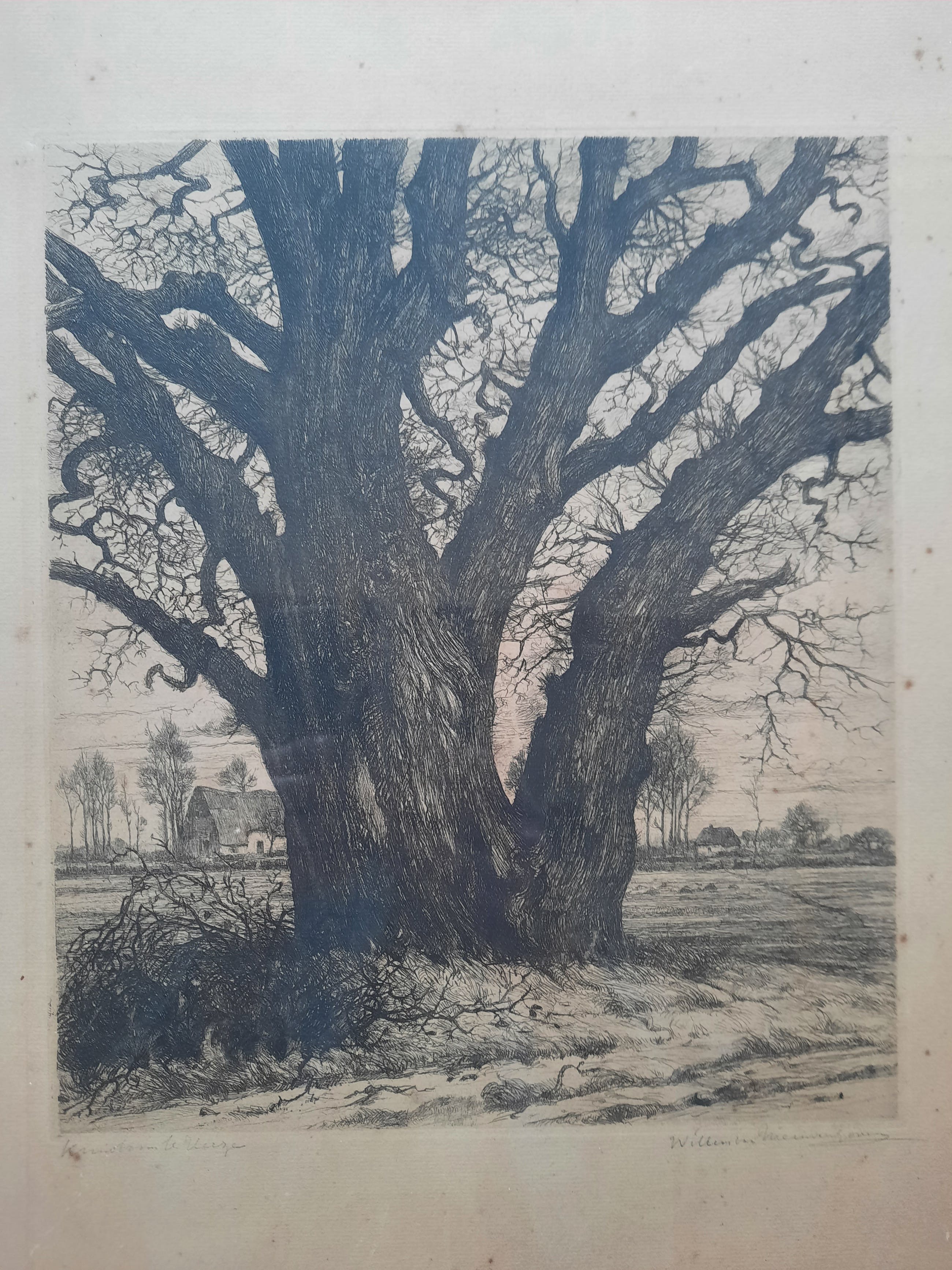 Fraaie ets van de kunstenaar Willem van Nieuwenhoven 1879-1973 Getiteld, Kruisboom te Heese. Prachtig gedetaileerd werk en beperkte oplage vervaardigd. In goede staat, enkel wat ouderdomsvlekjes op het papier, zie de foto s Zittende in een professionele lijst. Uniek item. Het werk wordt met zorg verpakt en verzekerd verstuurd.