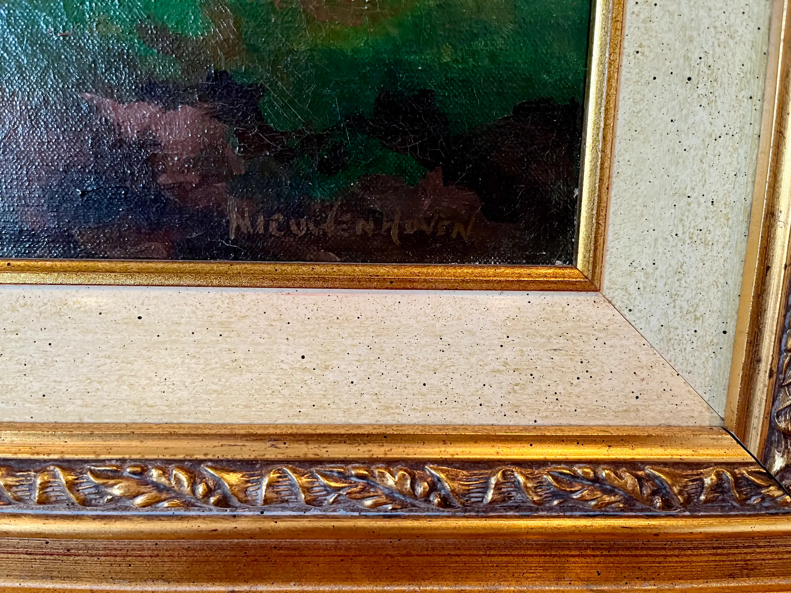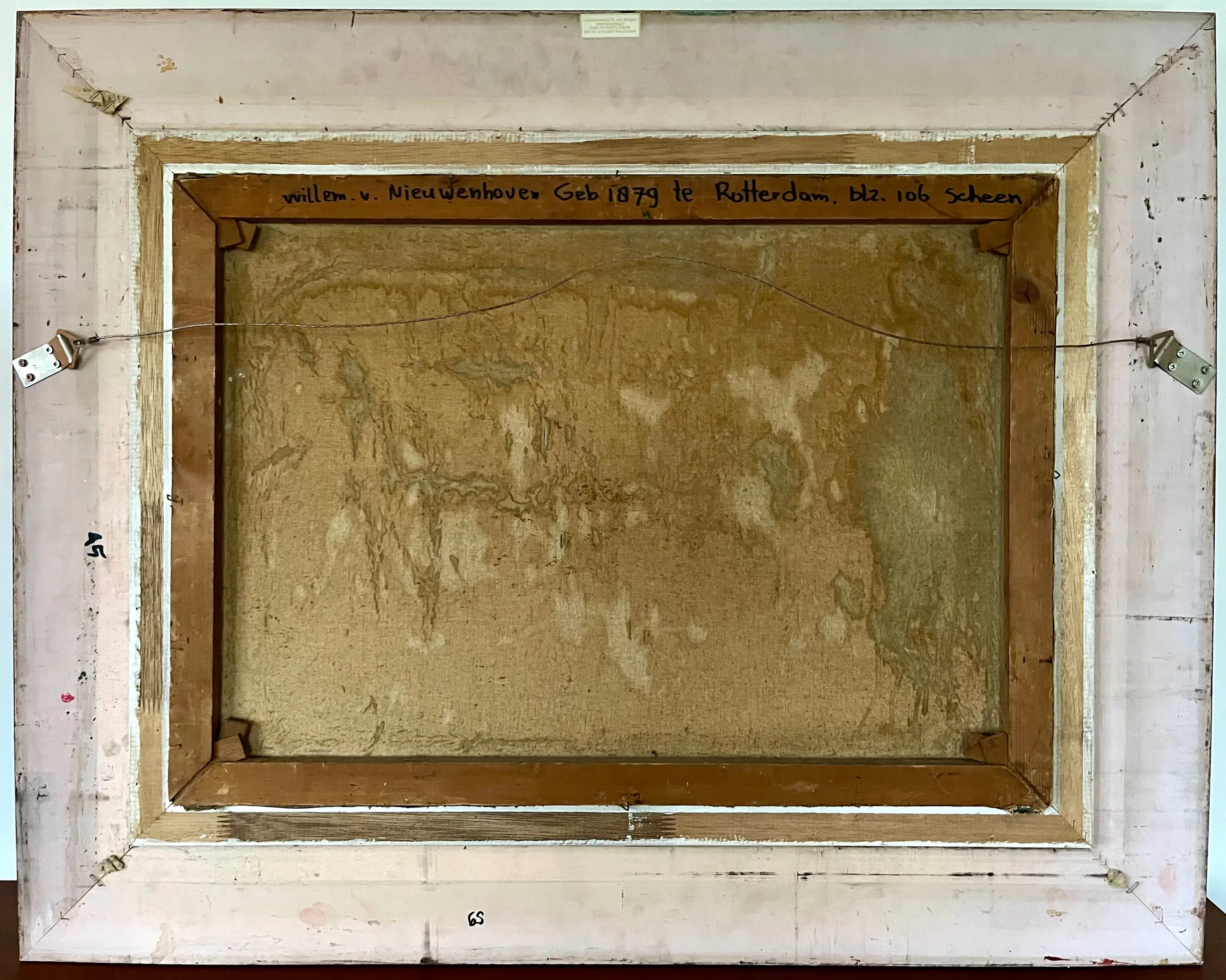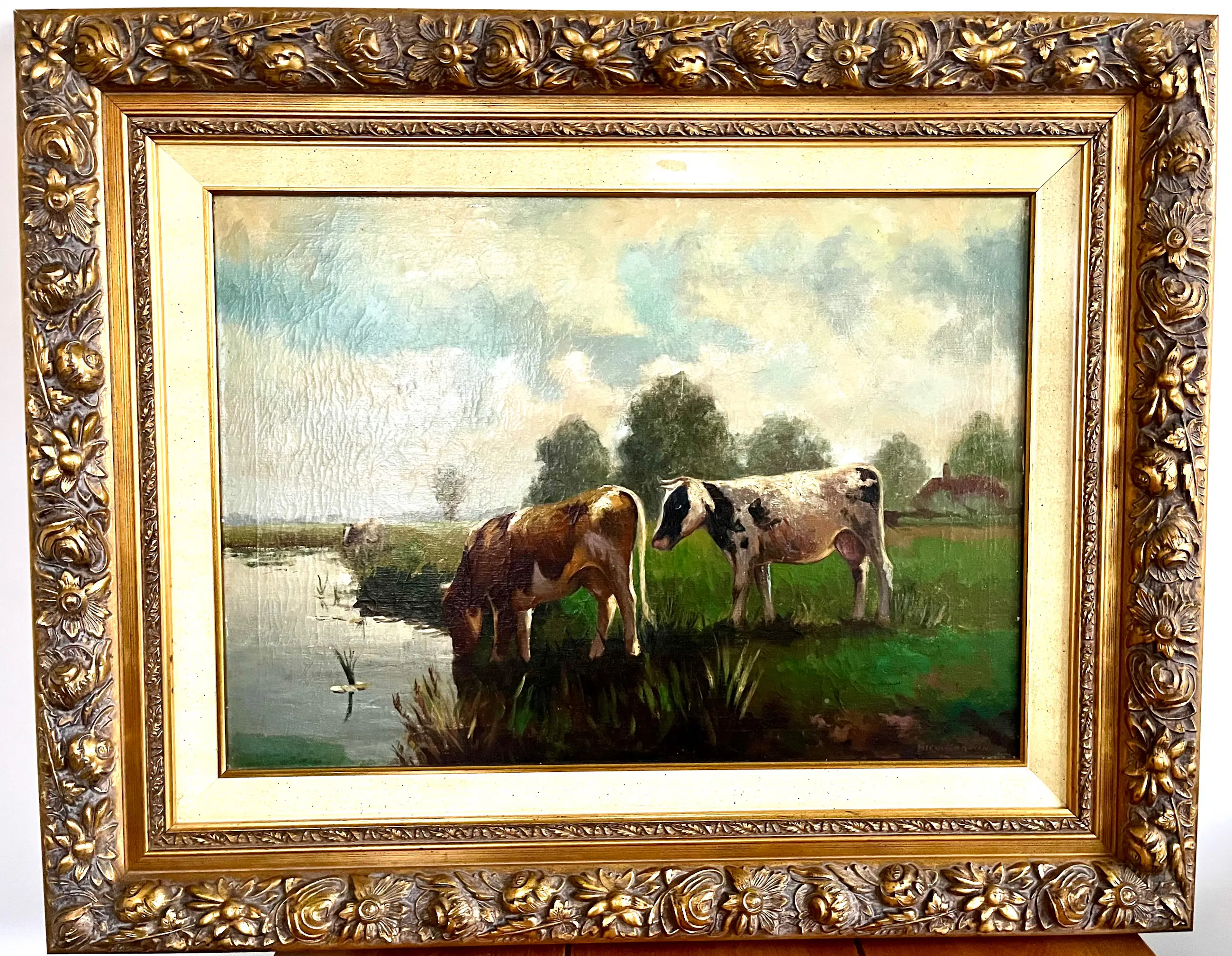 Dit sfeervolle olieverfschilderij van Willem van Nieuwenhoven (1879–1973) toont een klassiek Nederlands weidelandschap met drinkende koeien bij een slootkant [1, 8]. Het werk is kenmerkend voor zijn vroege periode, waarin hij in een impressionistische stijl scènes uit het boerenleven vastlegde [2]. Larens school De robuuste, rijk gedecoreerde goudkleurige lijst versterkt de klassieke uitstraling van het stuk